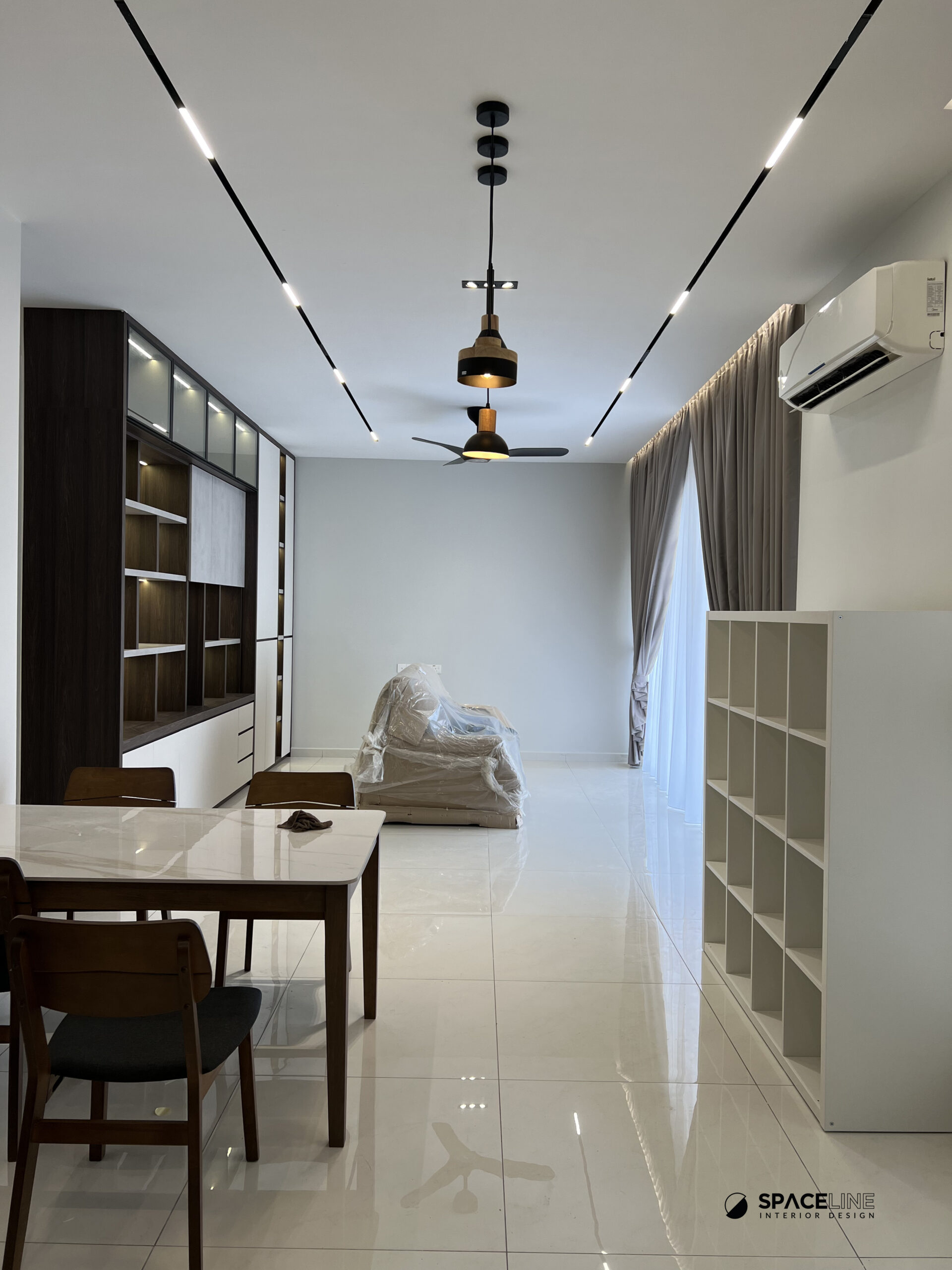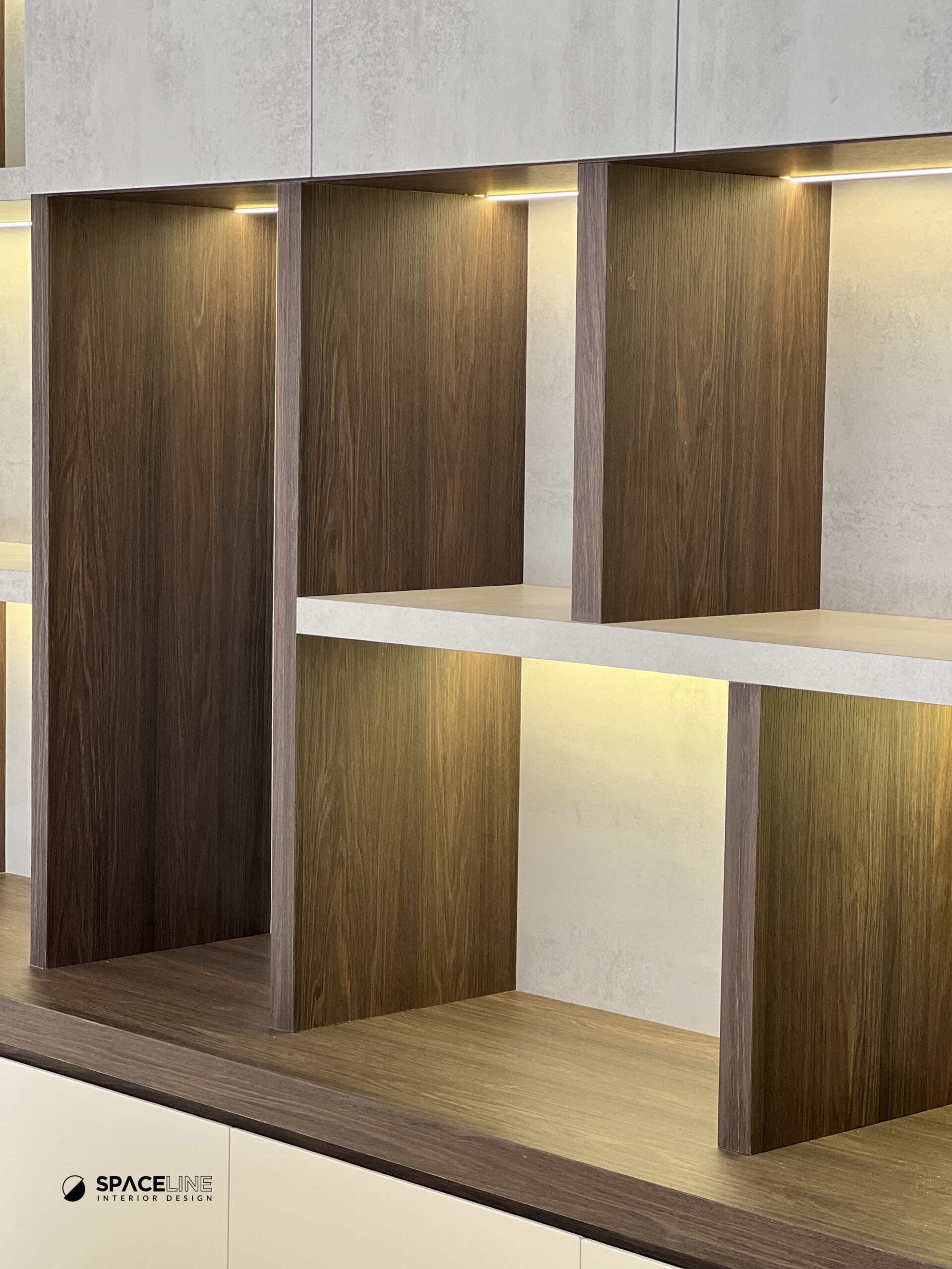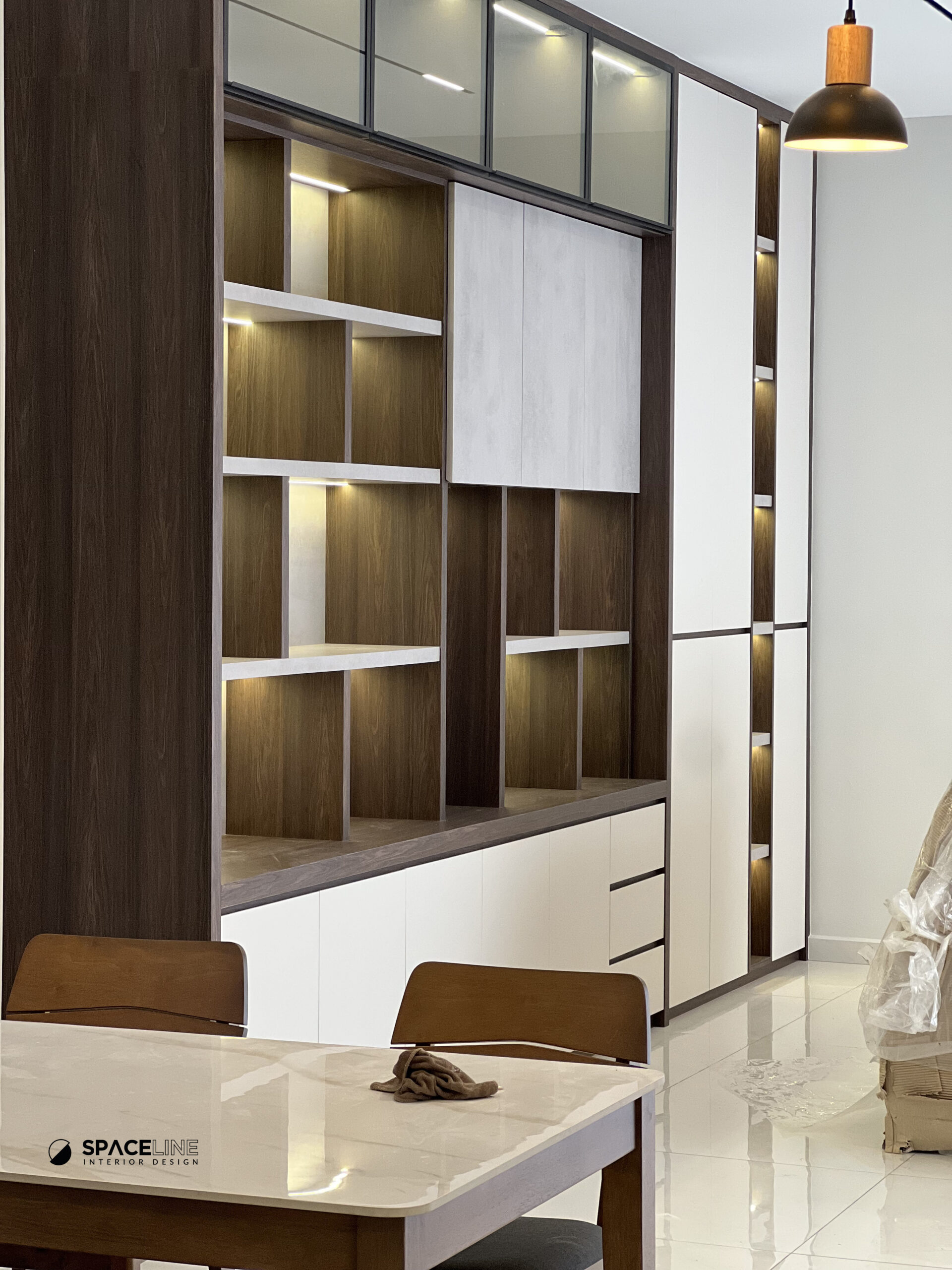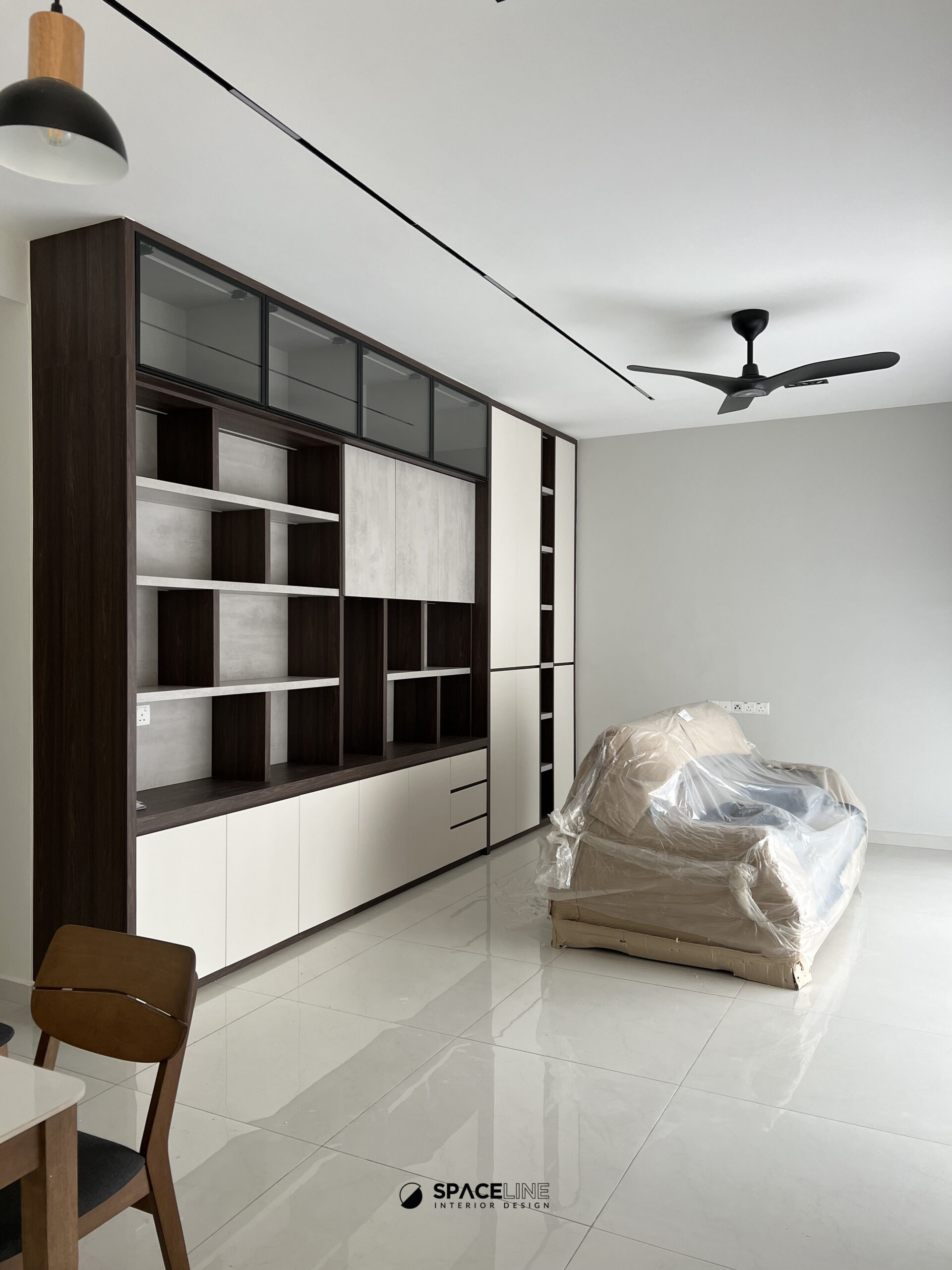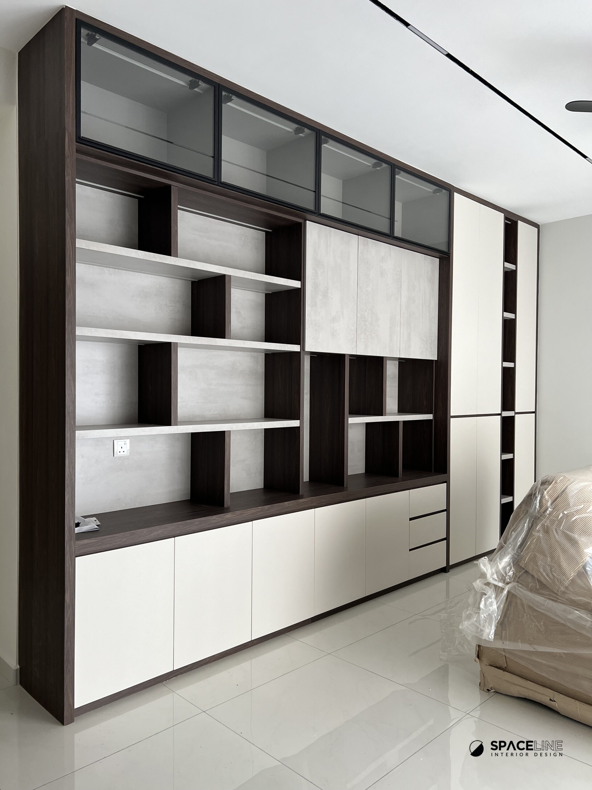 This condominium project at Country Garden is designed to maximize storage and create a serene, grounded living environment, primarily through the strategic use of dark wood tones and highly efficient, layered display systems.