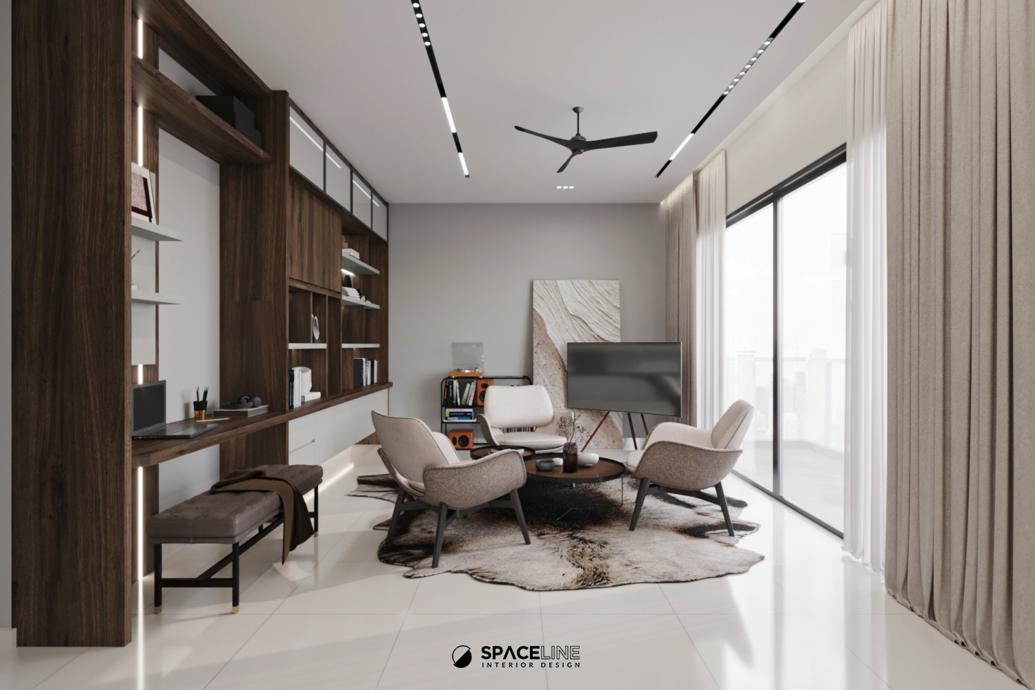 The main feature of the home is the full-height display storage cabinet, which serves as the focal piece of the living area. Proposed in a dark wood tone, the cabinet imparts a grounded and natural feeling. It is meticulously designed with a combination of shelves illuminated by LED strips, glass doors, and solid-color casement doors. This layering of different components creates significant spatial depth and maintains a clean, organized ambiance. The two full-height casement storage doors ensure visual tidiness. The living area is illuminated by a modern style track light system, which, combined with natural light from the existing window, enhances the nature-inspired, airy environment.