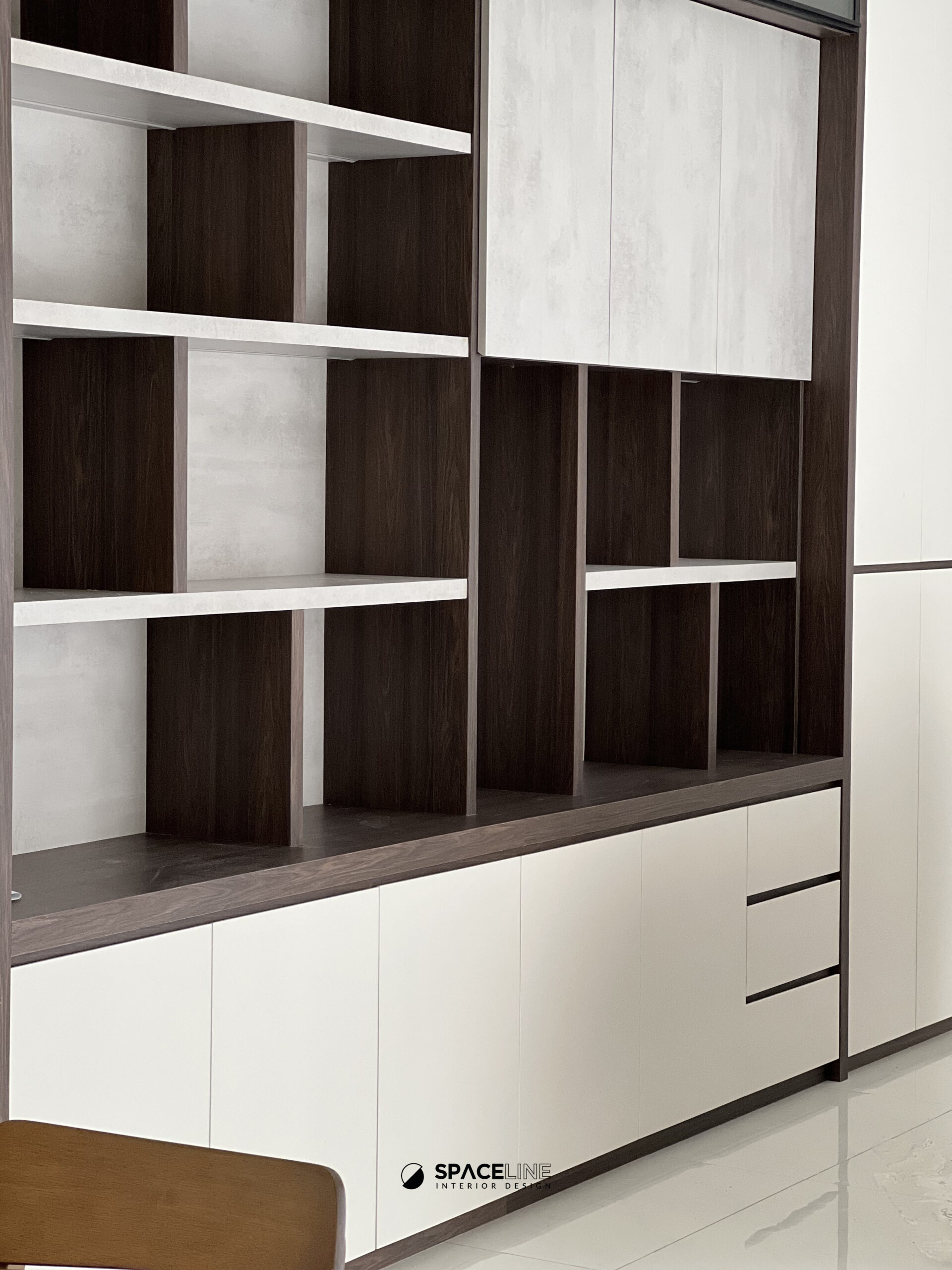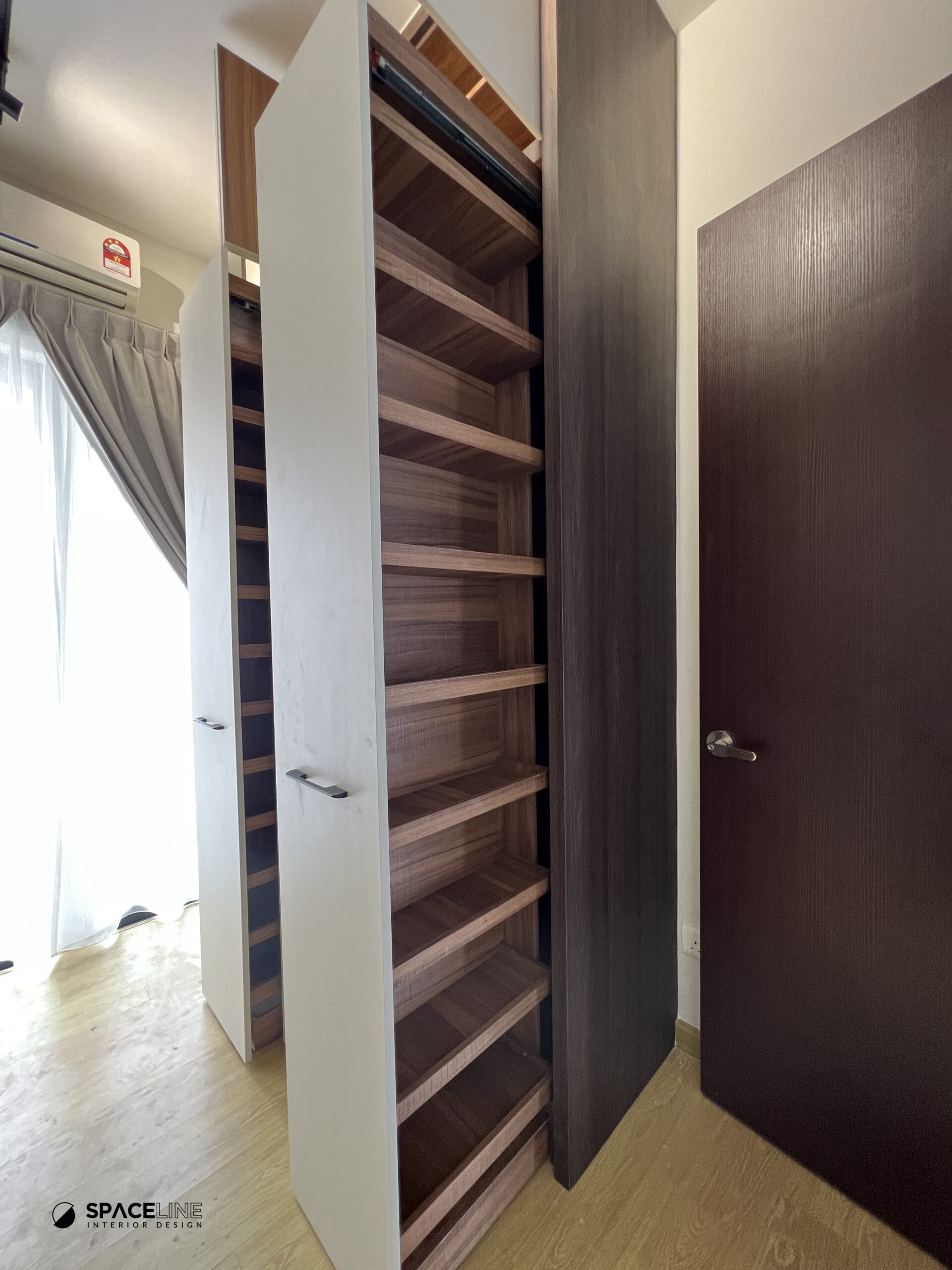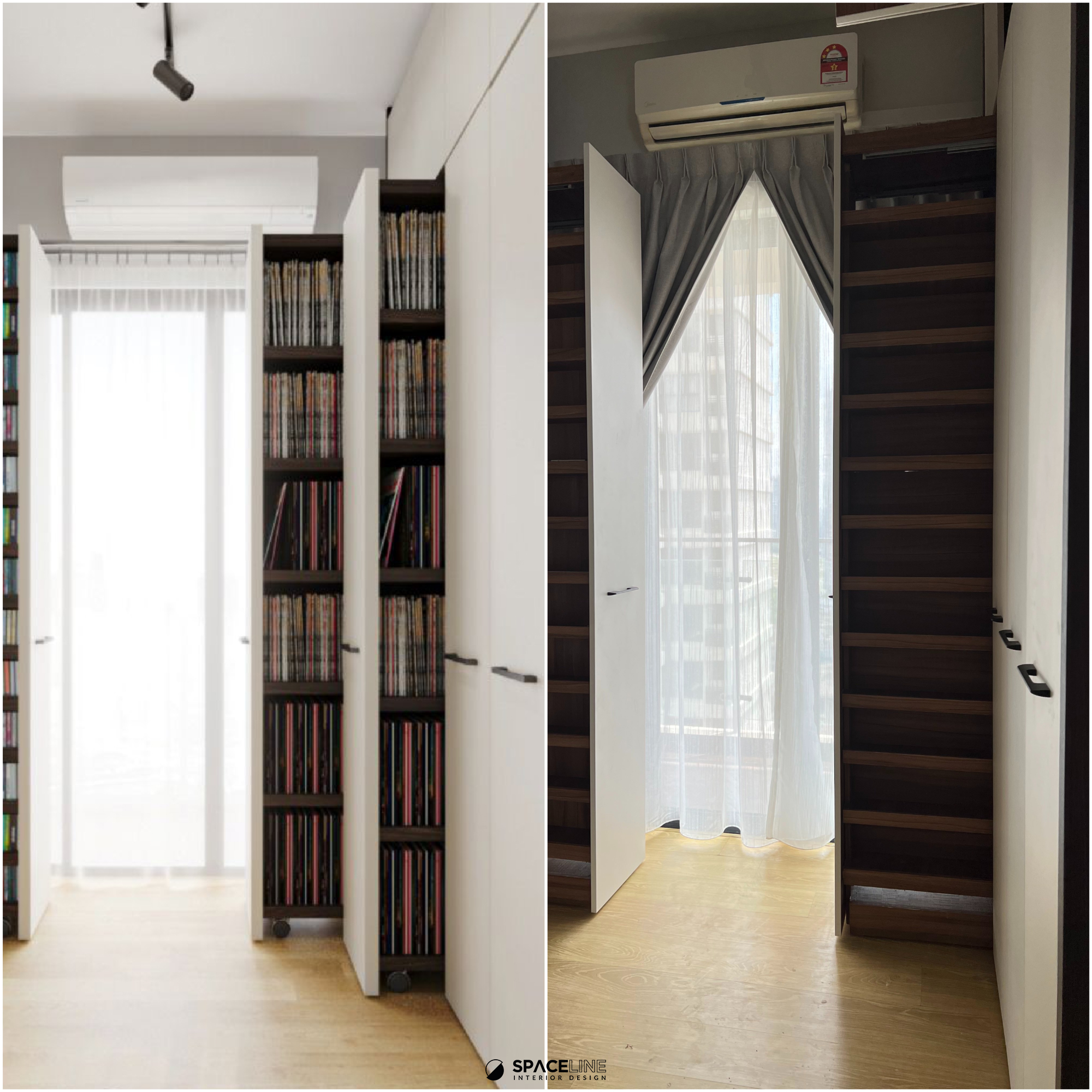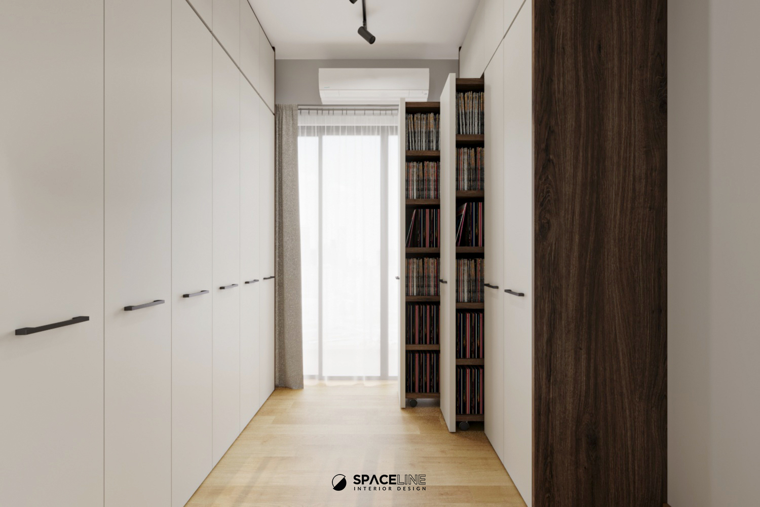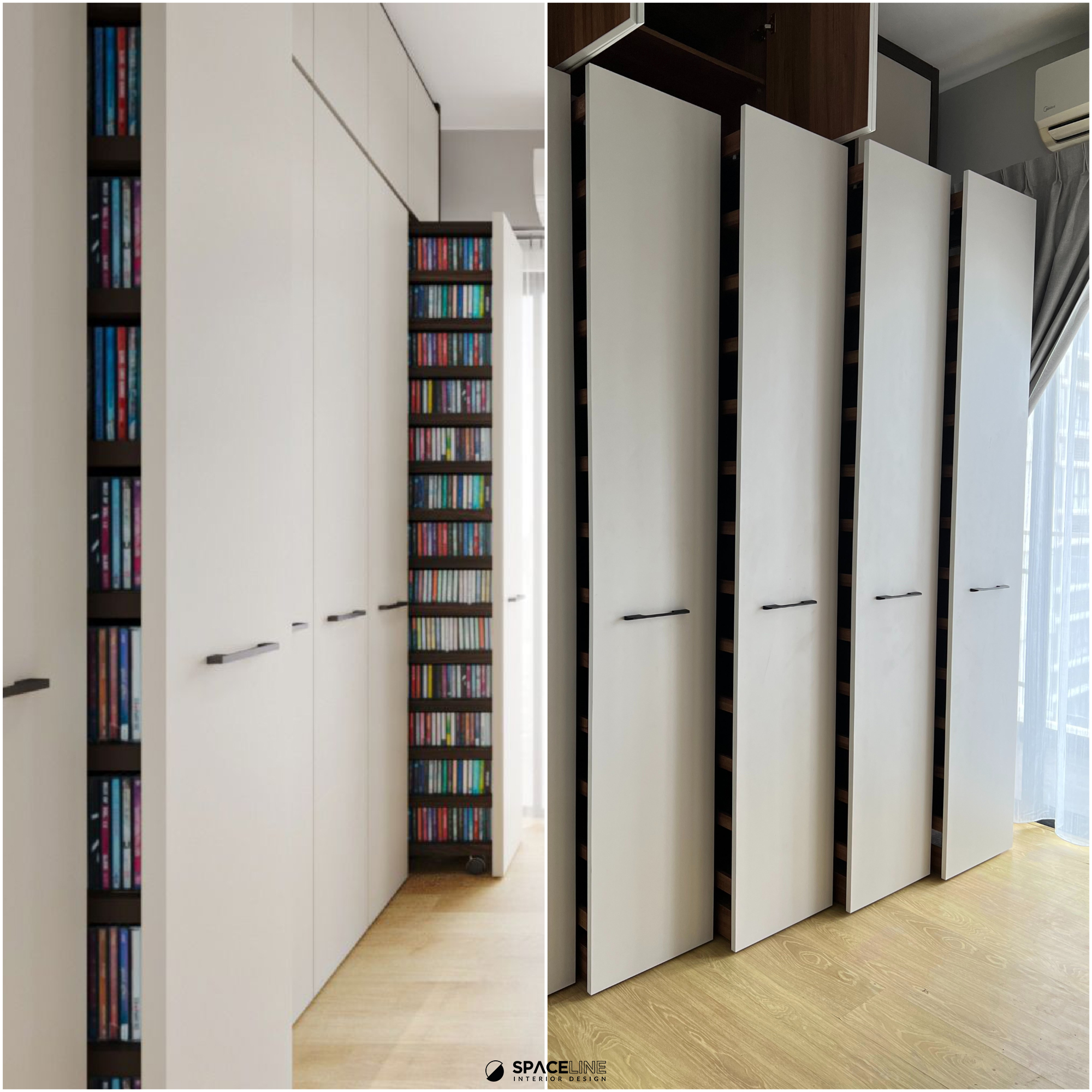 Inside one of the rooms, a practical yet elegant full-height book storage unit is installed. This unit features a soft-close sliding track pull-out mechanism, a brilliant space saver that eases everyday movement and maximizes the capacity to hold numerous books at once. The vertical storage offers subtle layering, contributing to visual calmness and aesthetic rhythm in the room.