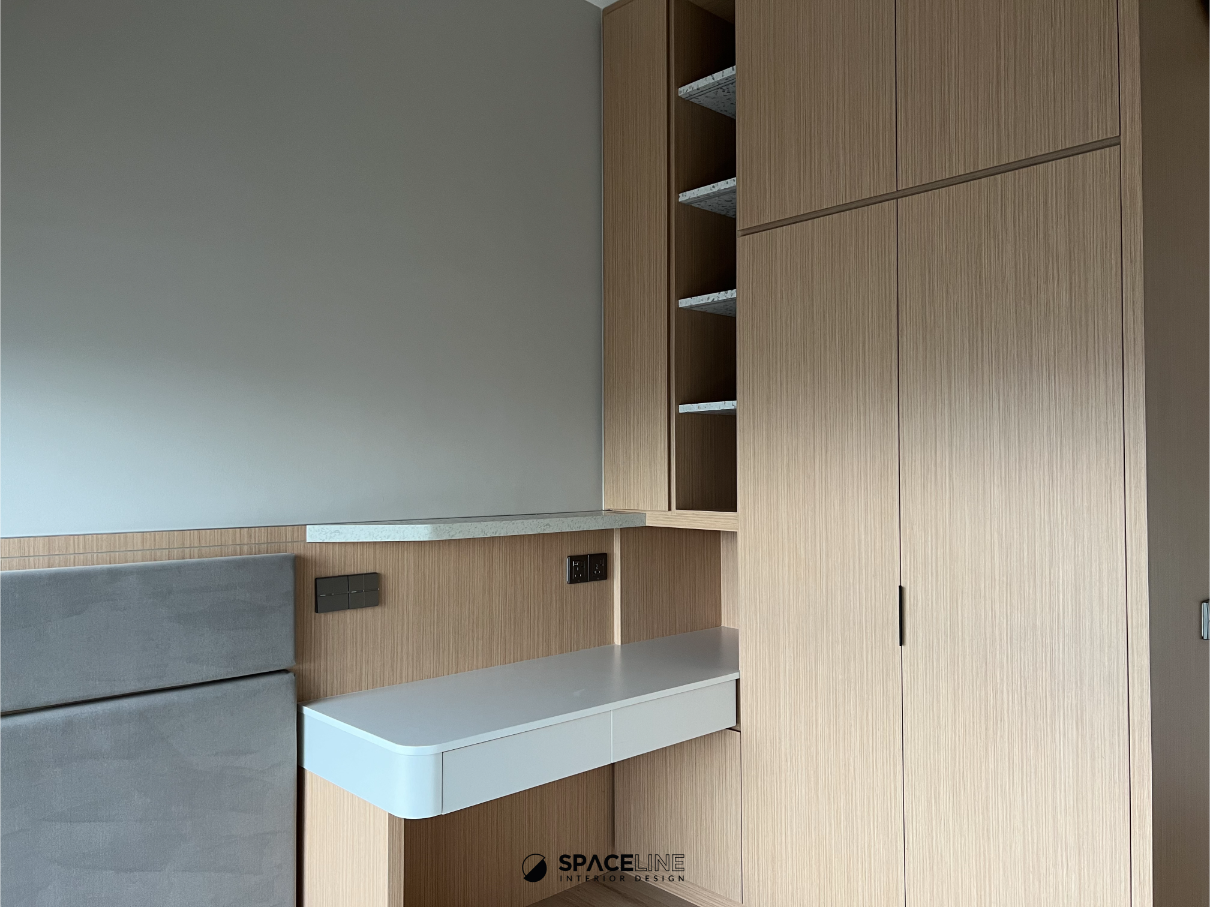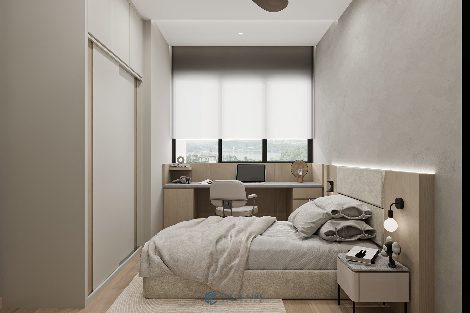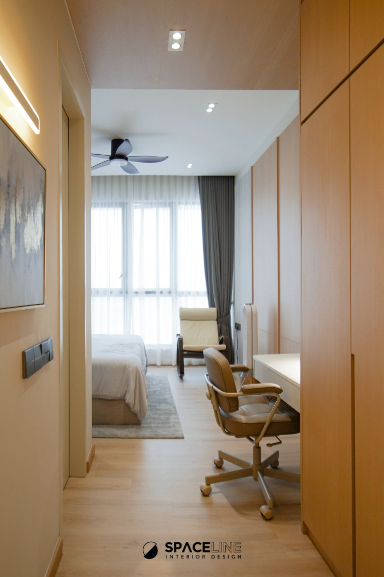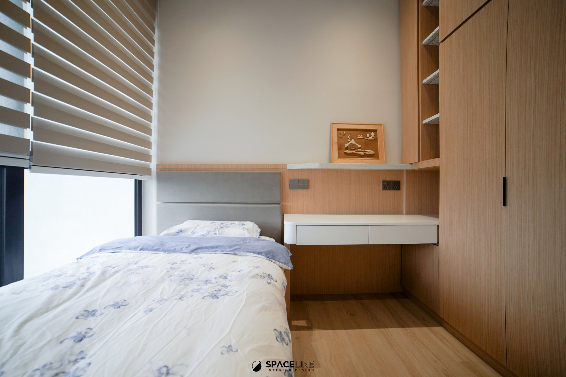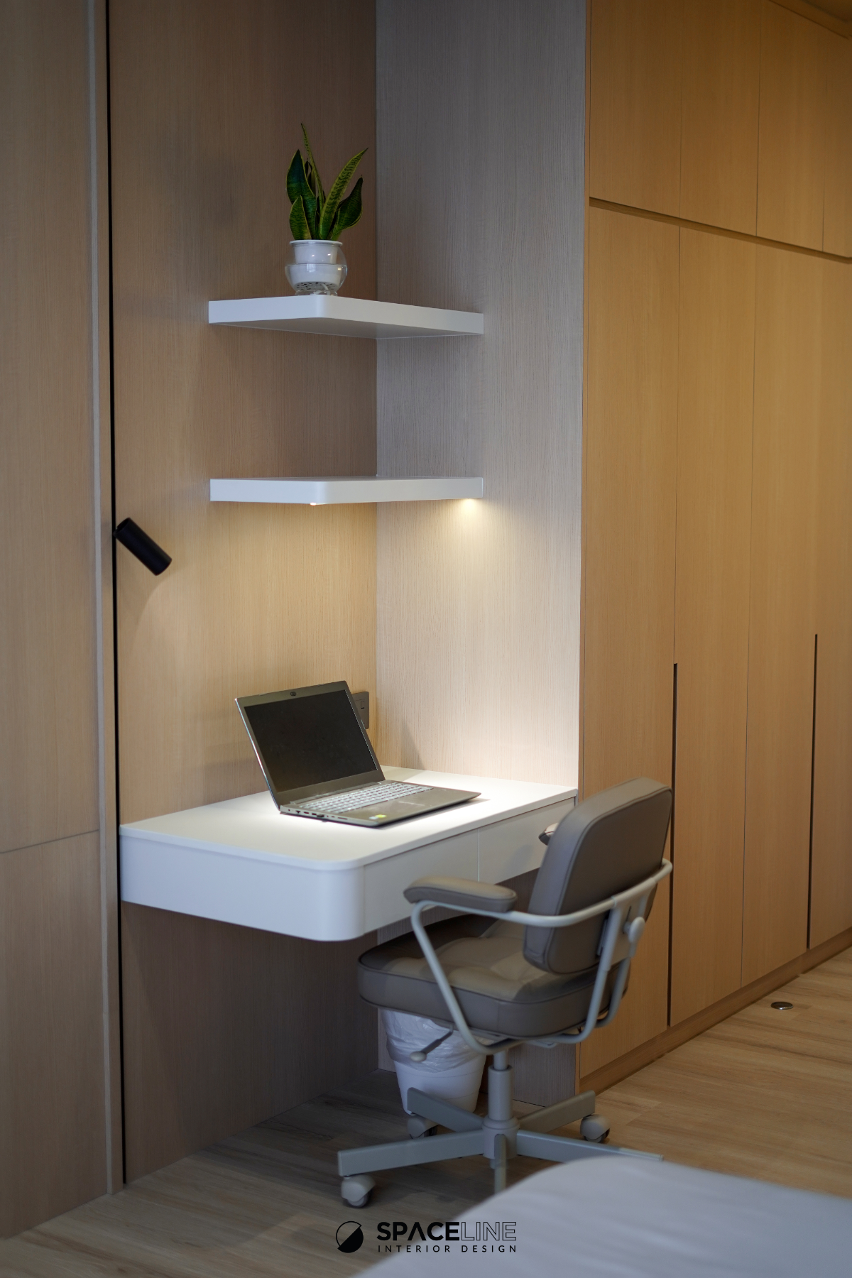 In the master bedroom, a see-through glass partition is a feature that allows natural light to effortlessly enlighten the bathroom. The full-height bedhead with an attached side table in natural wood adds coziness. A pocket space for a piano caters to the owner’s personality, creating an escape room. Study tables—essential in every room—feature wood and grey tabletops that promote mental clarity. Maximizing every corner is evident through integrated shelving and pocket storage, with layered lighting (spotlights and task lights) offering perfect illumination for specific activities.