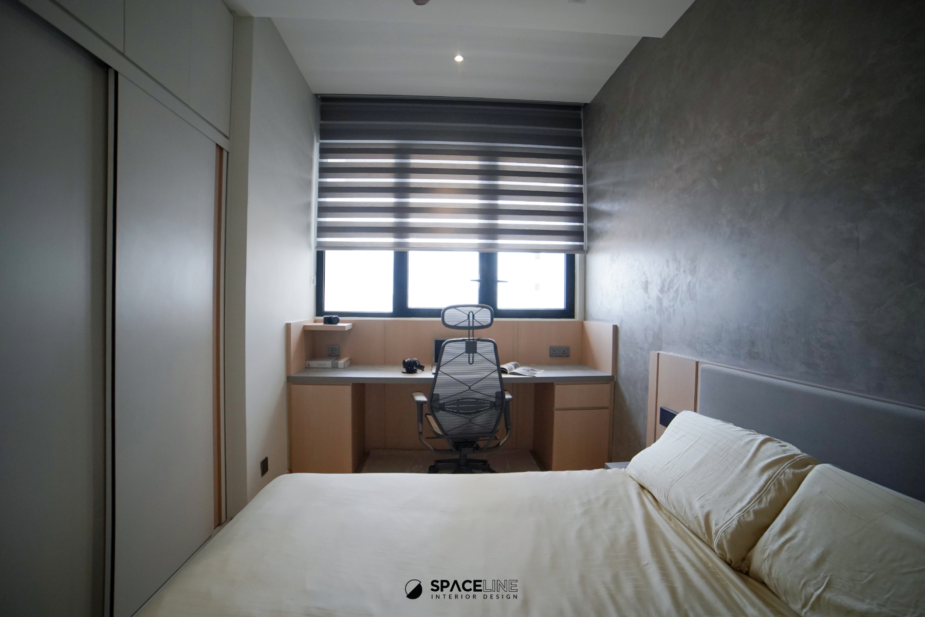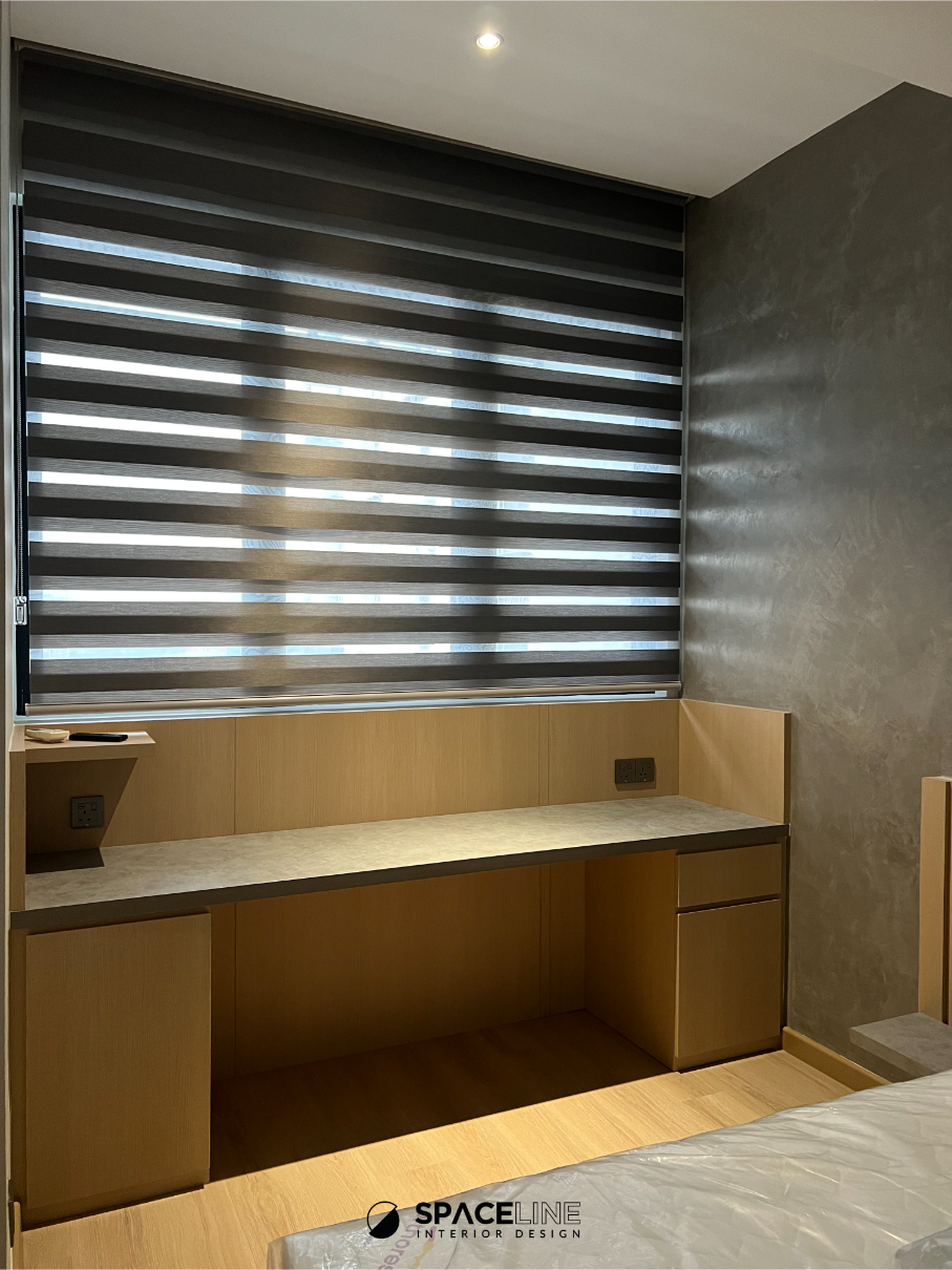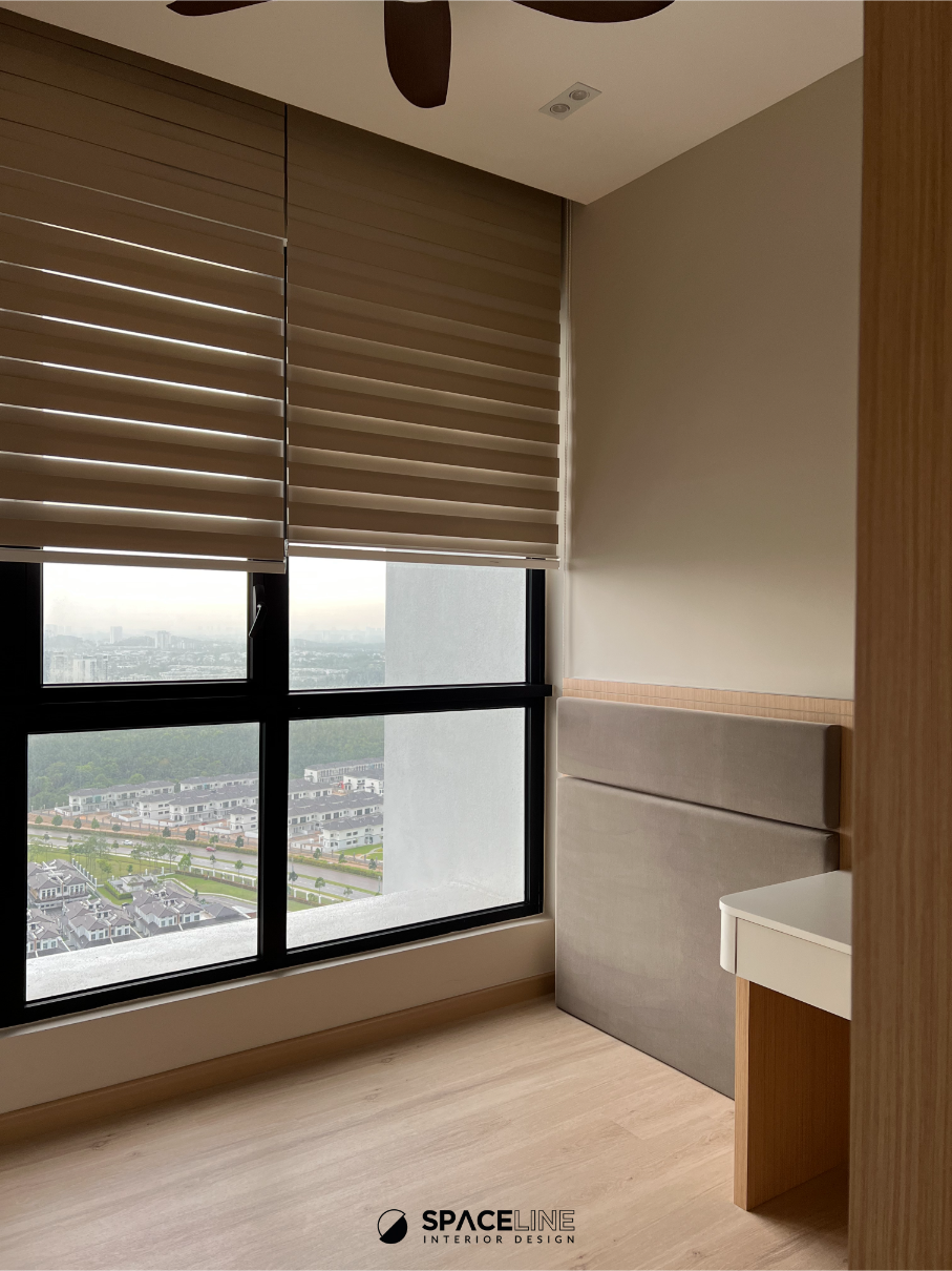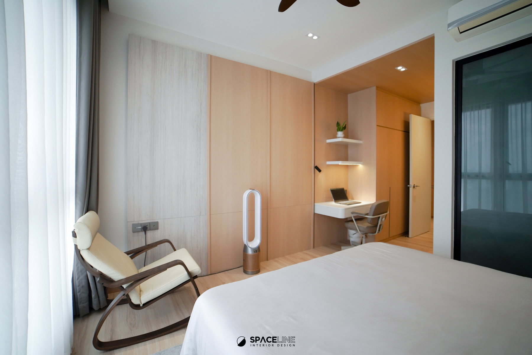 In the master bedroom, a see-through glass partition is a feature that allows natural light to effortlessly enlighten the bathroom. The full-height bedhead with an attached side table in natural wood adds coziness. A pocket space for a piano caters to the owner’s personality, creating an escape room. Study tables—essential in every room—feature wood and grey tabletops that promote mental clarity. Maximizing every corner is evident through integrated shelving and pocket storage, with layered lighting (spotlights and task lights) offering perfect illumination for specific activities.