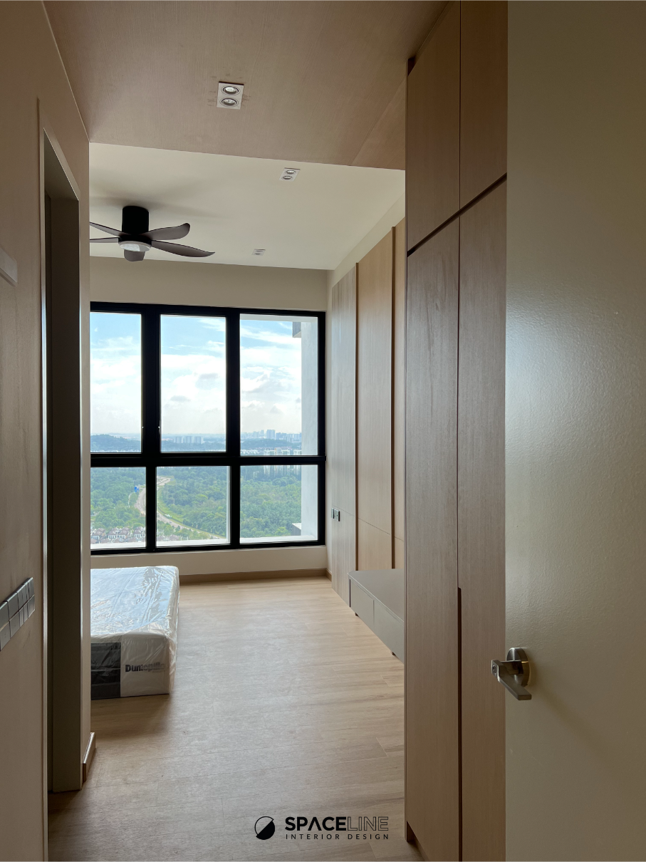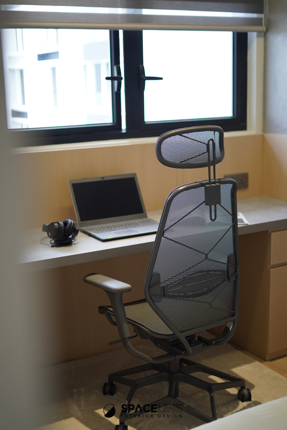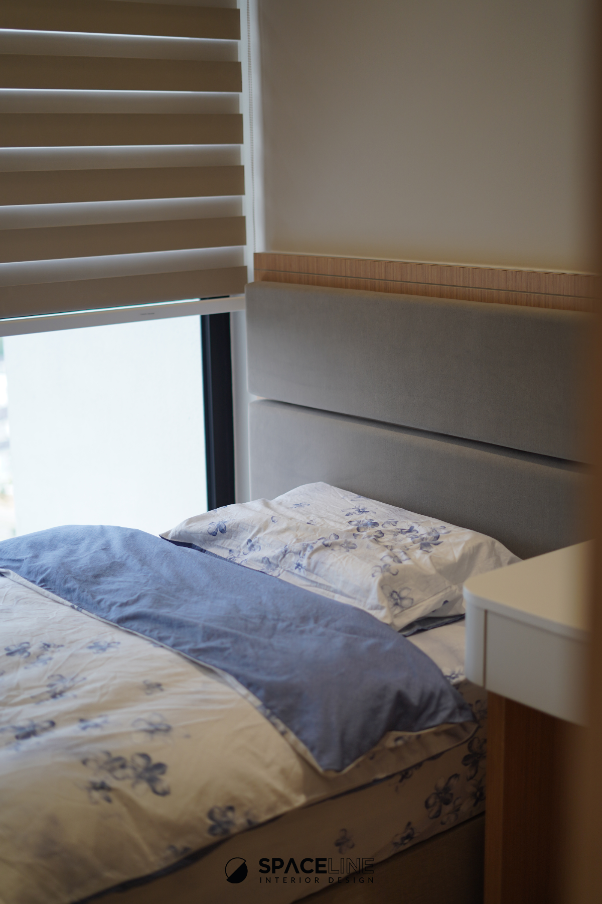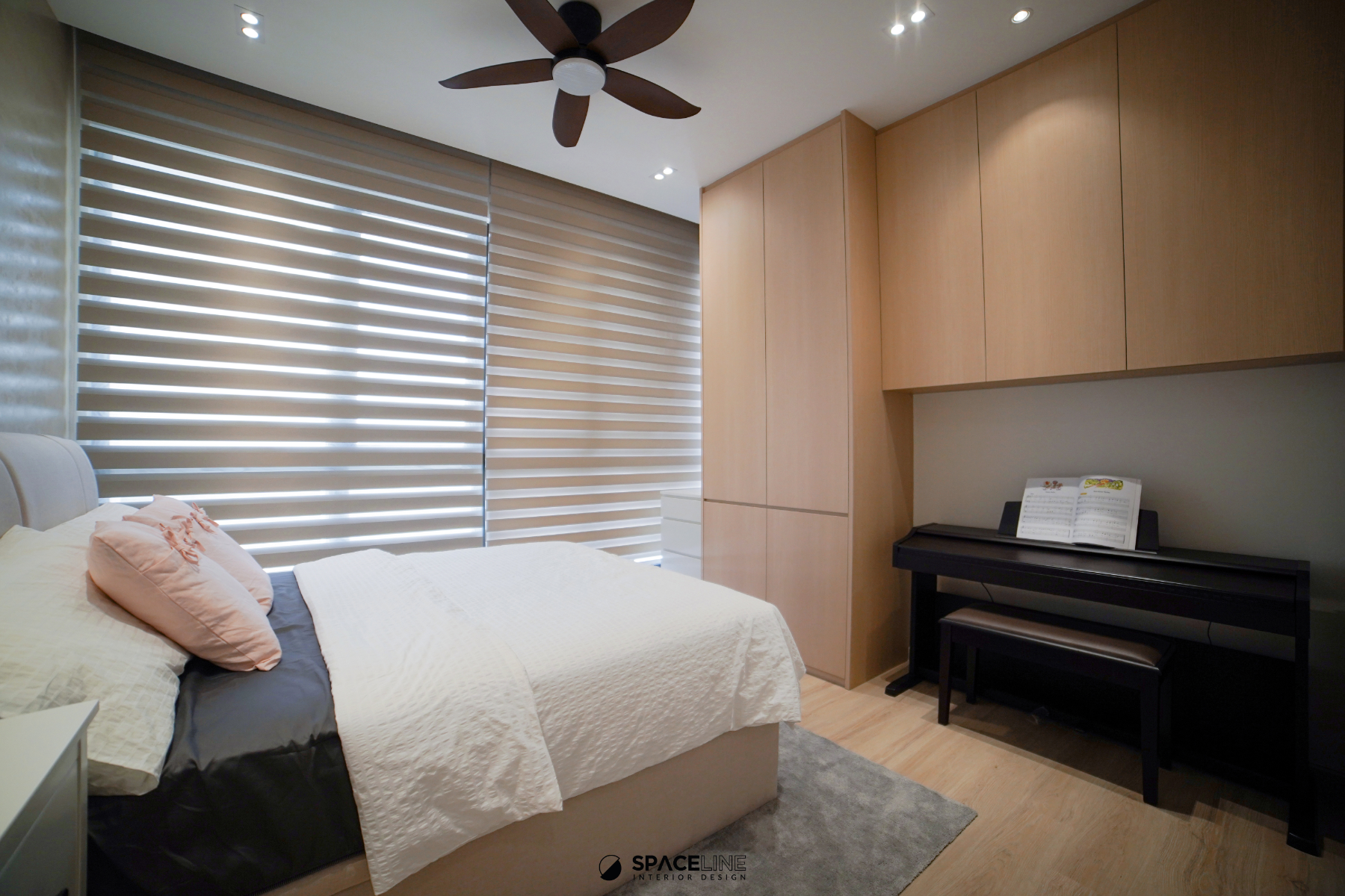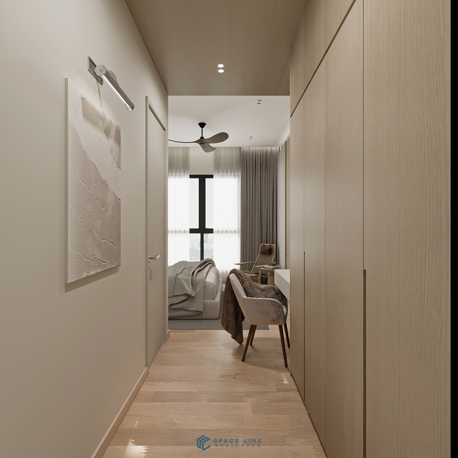 In the master bedroom, a see-through glass partition is a feature that allows natural light to effortlessly enlighten the bathroom. The full-height bedhead with an attached side table in natural wood adds coziness. A pocket space for a piano caters to the owner’s personality, creating an escape room. Study tables—essential in every room—feature wood and grey tabletops that promote mental clarity. Maximizing every corner is evident through integrated shelving and pocket storage, with layered lighting (spotlights and task lights) offering perfect illumination for specific activities.