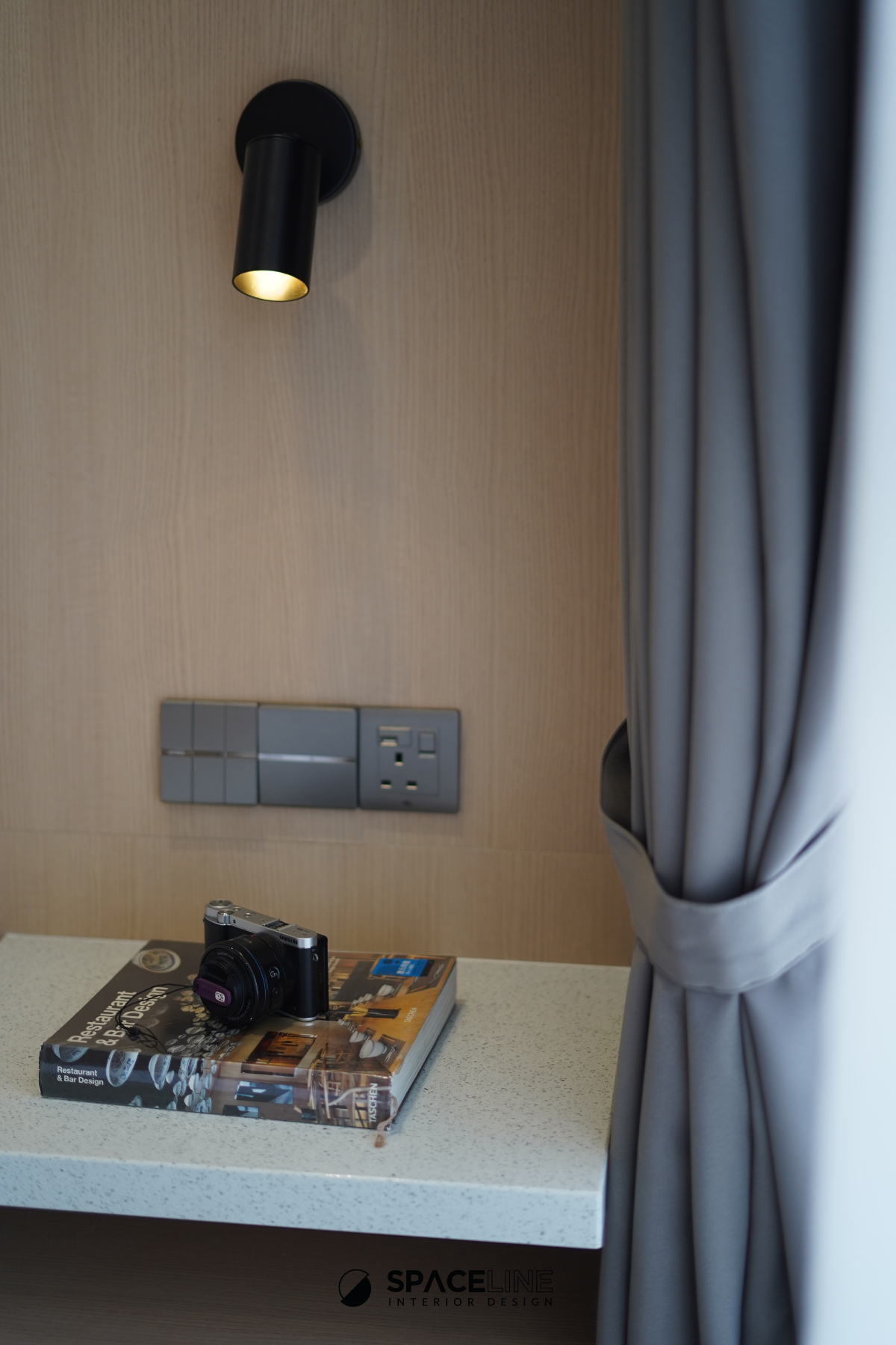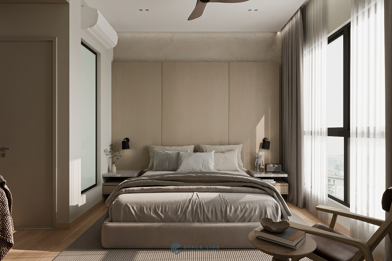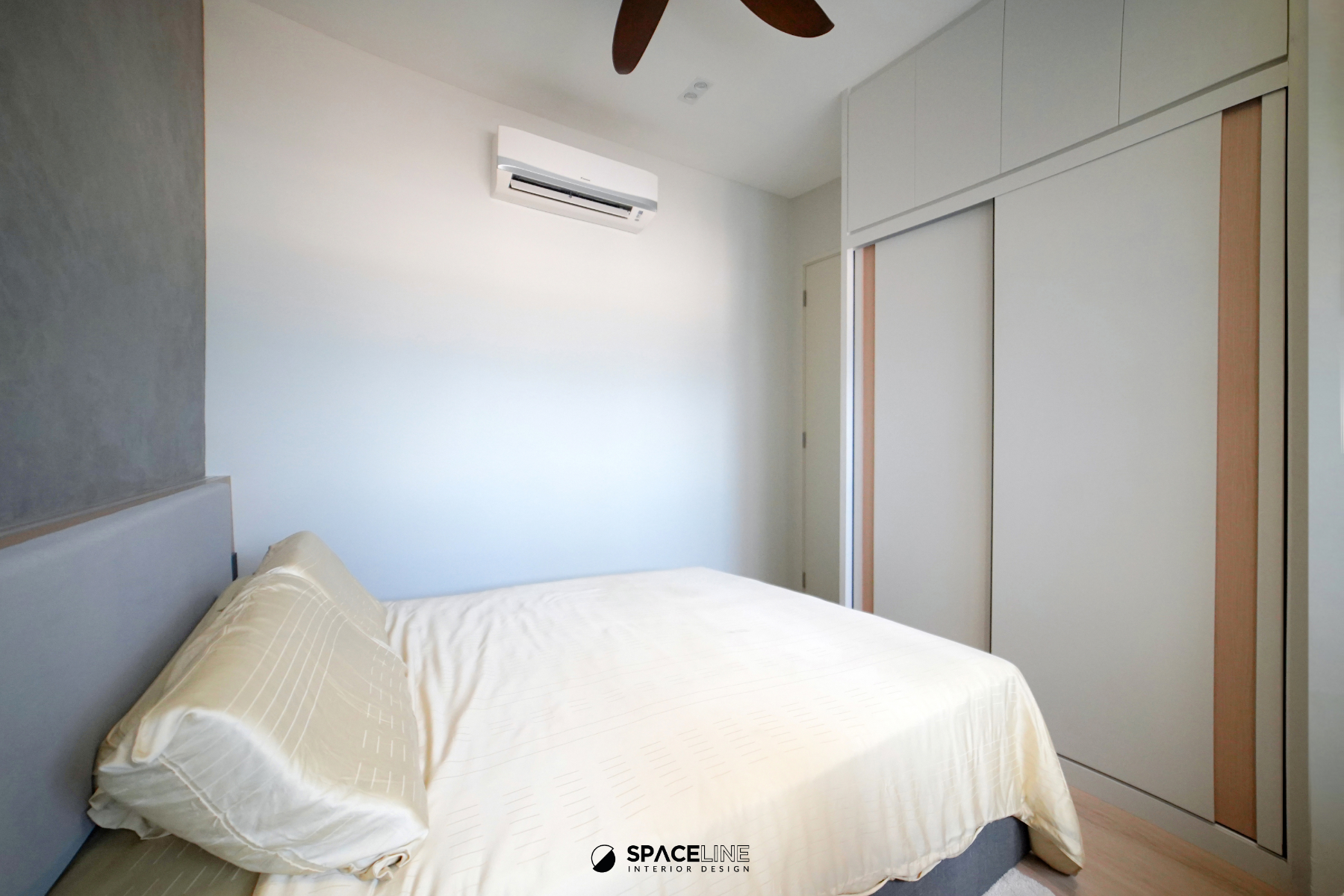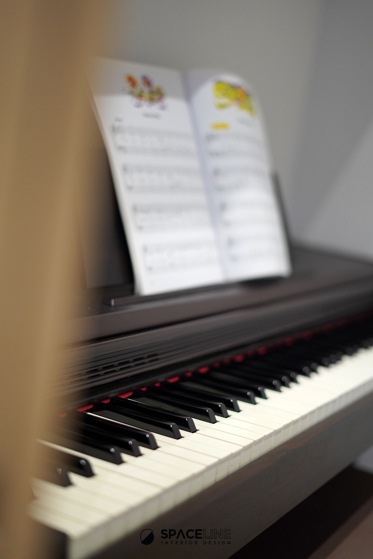 In the master bedroom, a see-through glass partition is a feature that allows natural light to effortlessly enlighten the bathroom. The full-height bedhead with an attached side table in natural wood adds coziness. A pocket space for a piano caters to the owner’s personality, creating an escape room. Study tables—essential in every room—feature wood and grey tabletops that promote mental clarity. Maximizing every corner is evident through integrated shelving and pocket storage, with layered lighting (spotlights and task lights) offering perfect illumination for specific activities.