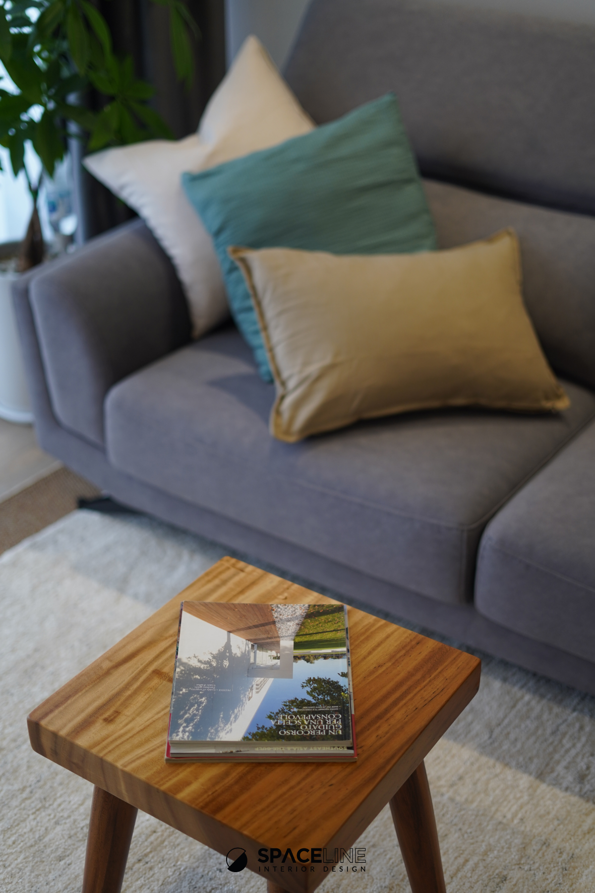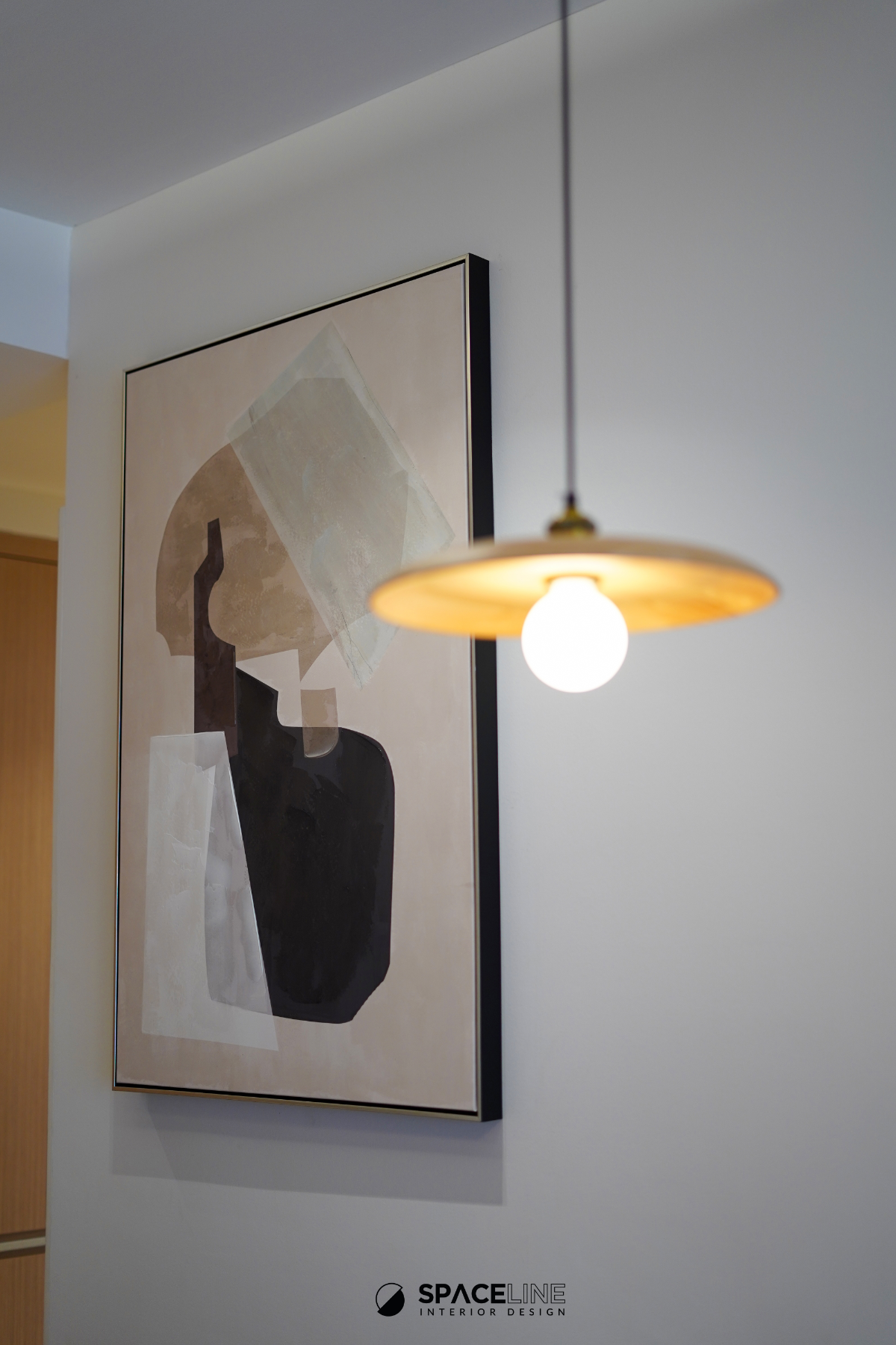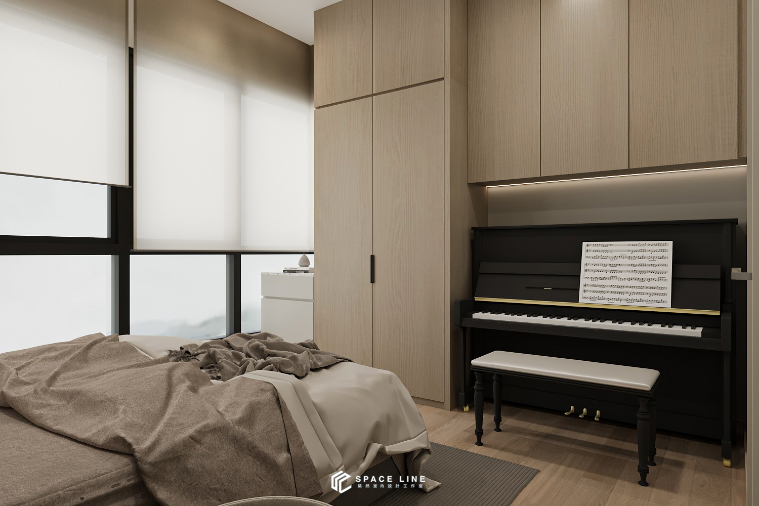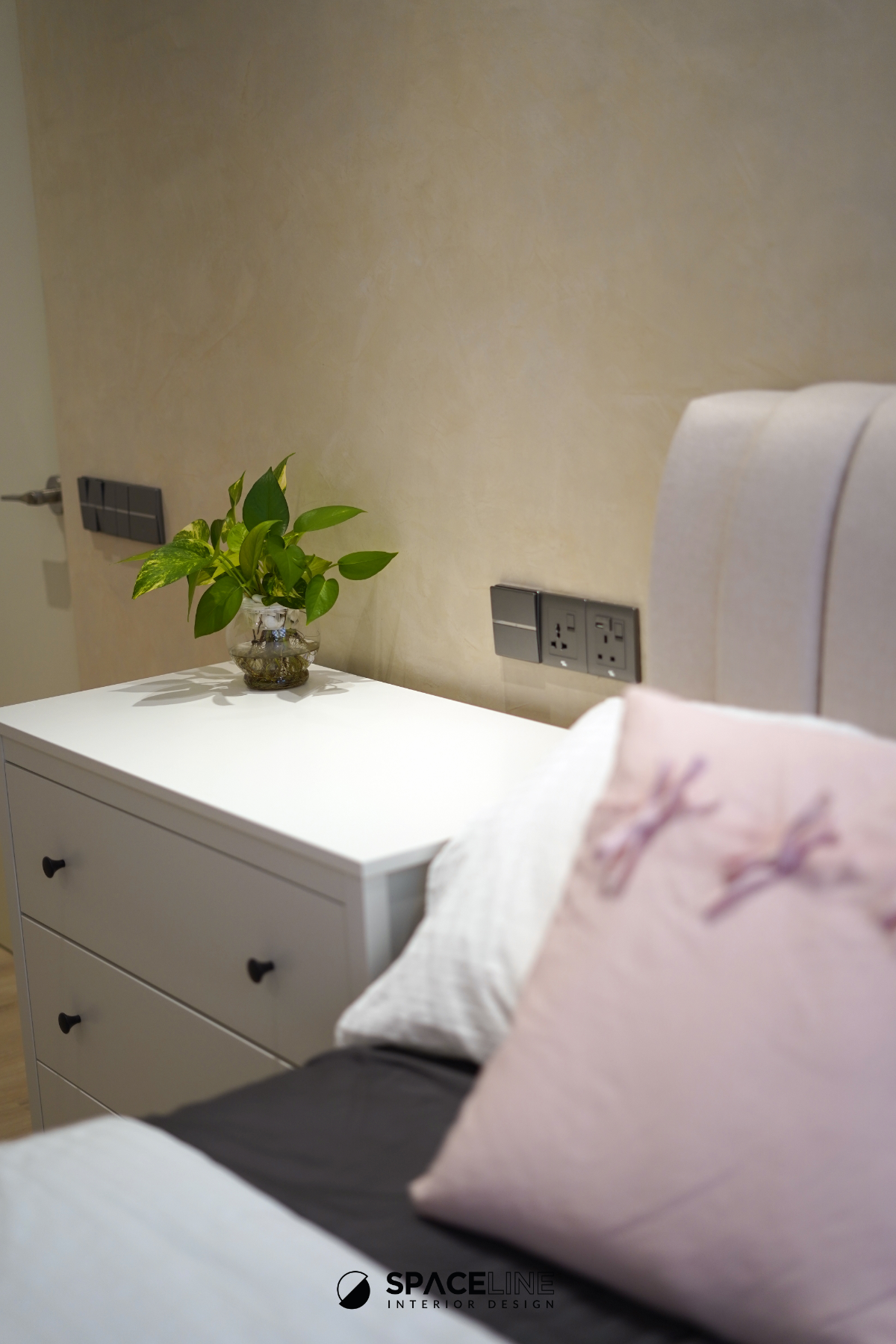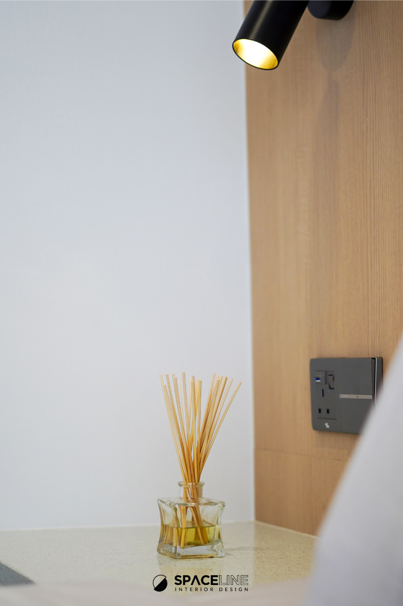 In the master bedroom, a see-through glass partition is a feature that allows natural light to effortlessly enlighten the bathroom. The full-height bedhead with an attached side table in natural wood adds coziness. A pocket space for a piano caters to the owner’s personality, creating an escape room. Study tables—essential in every room—feature wood and grey tabletops that promote mental clarity. Maximizing every corner is evident through integrated shelving and pocket storage, with layered lighting (spotlights and task lights) offering perfect illumination for specific activities.
