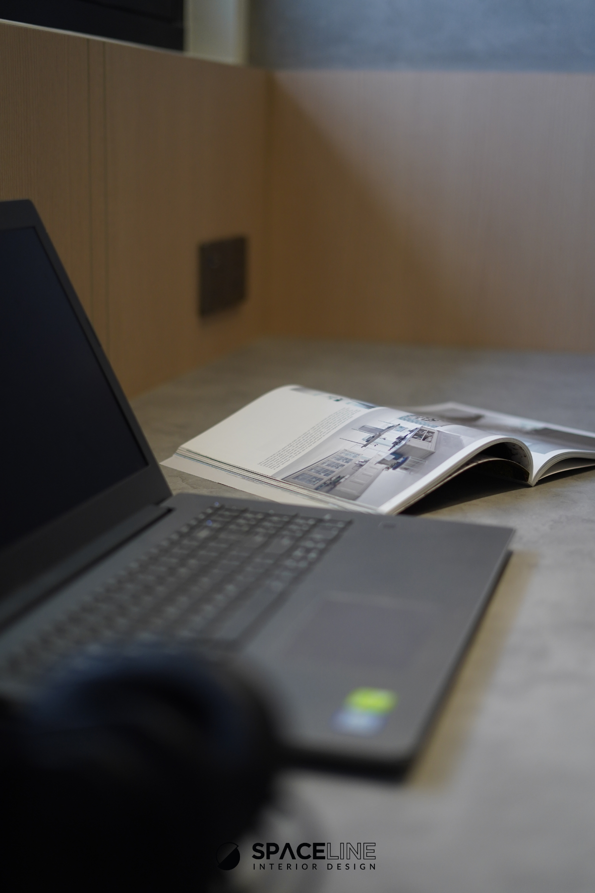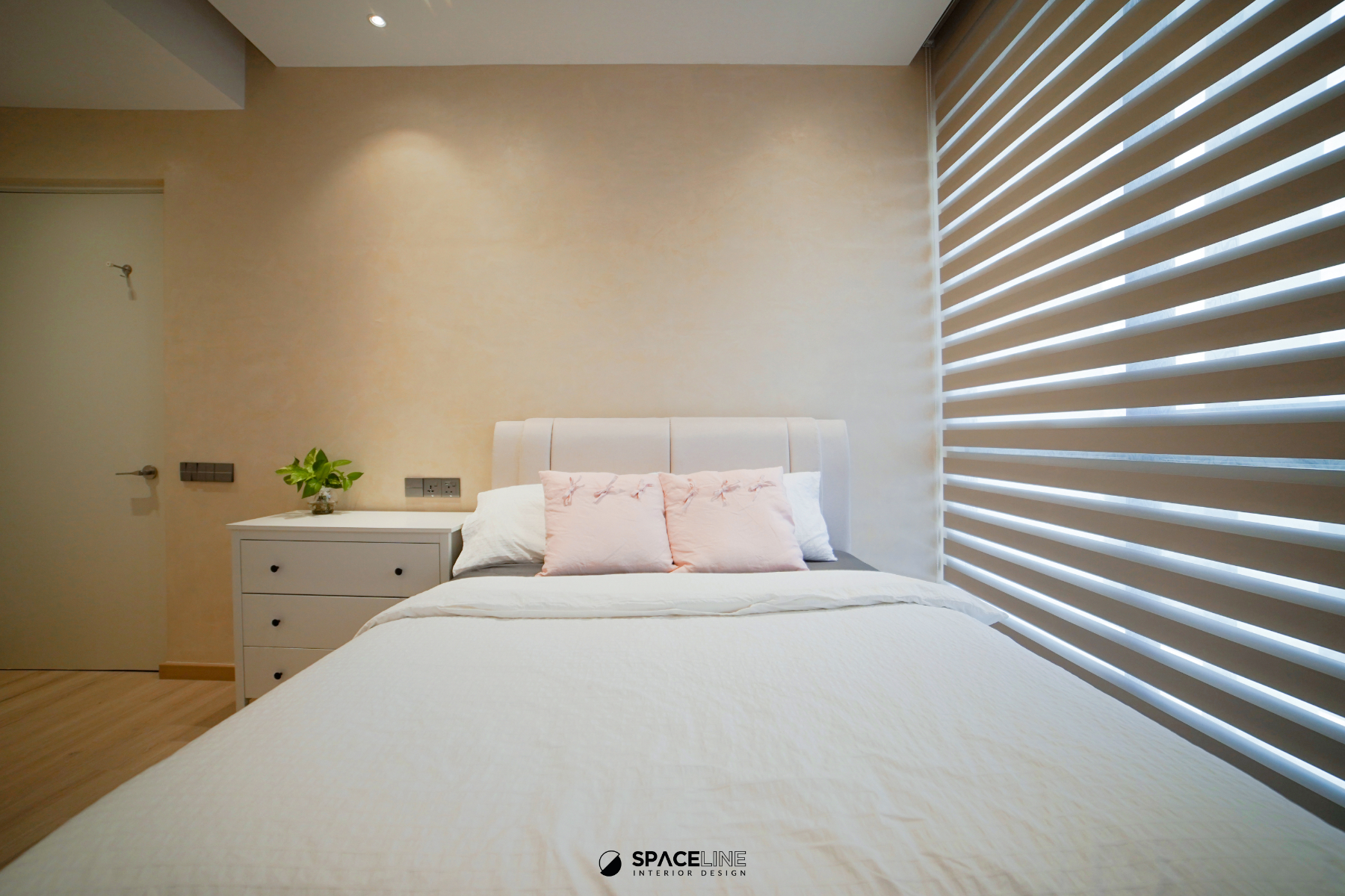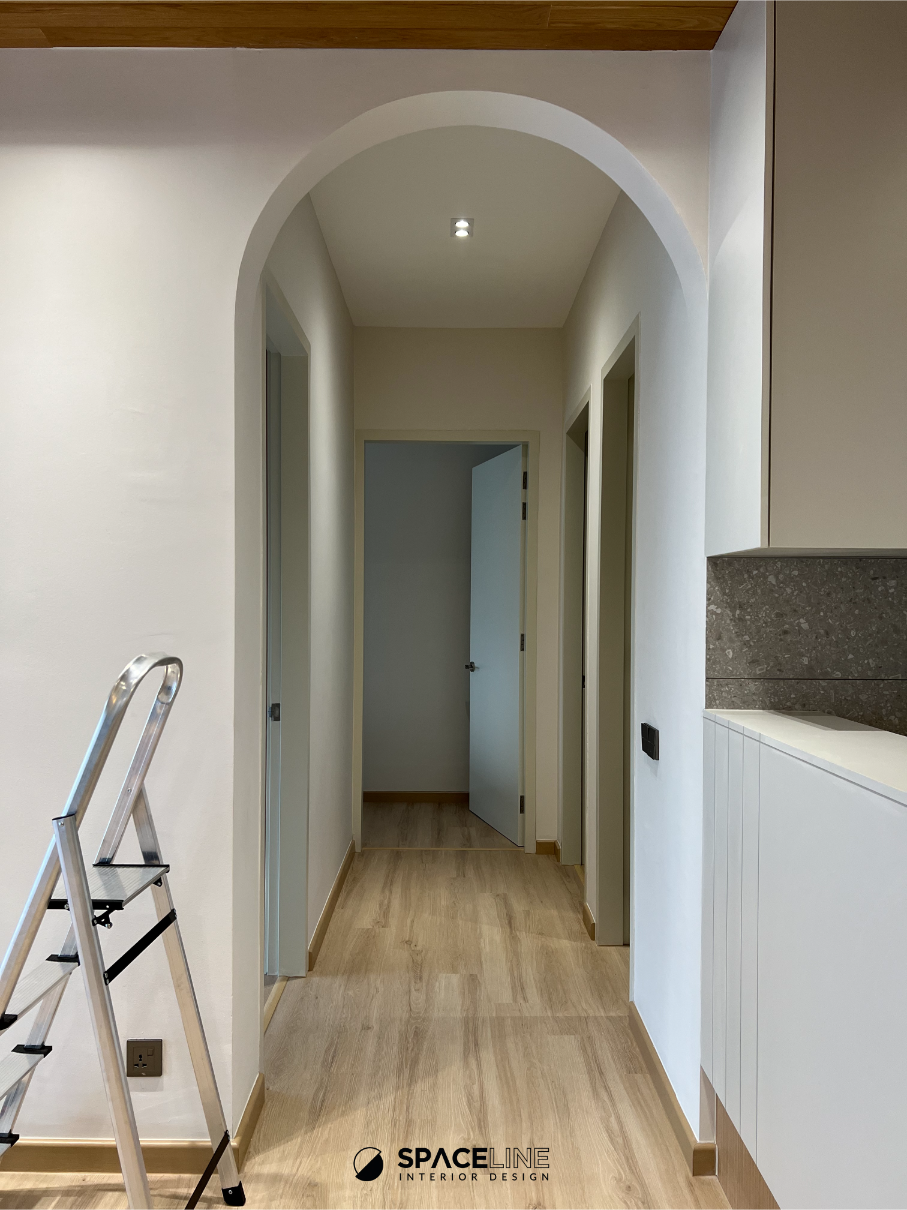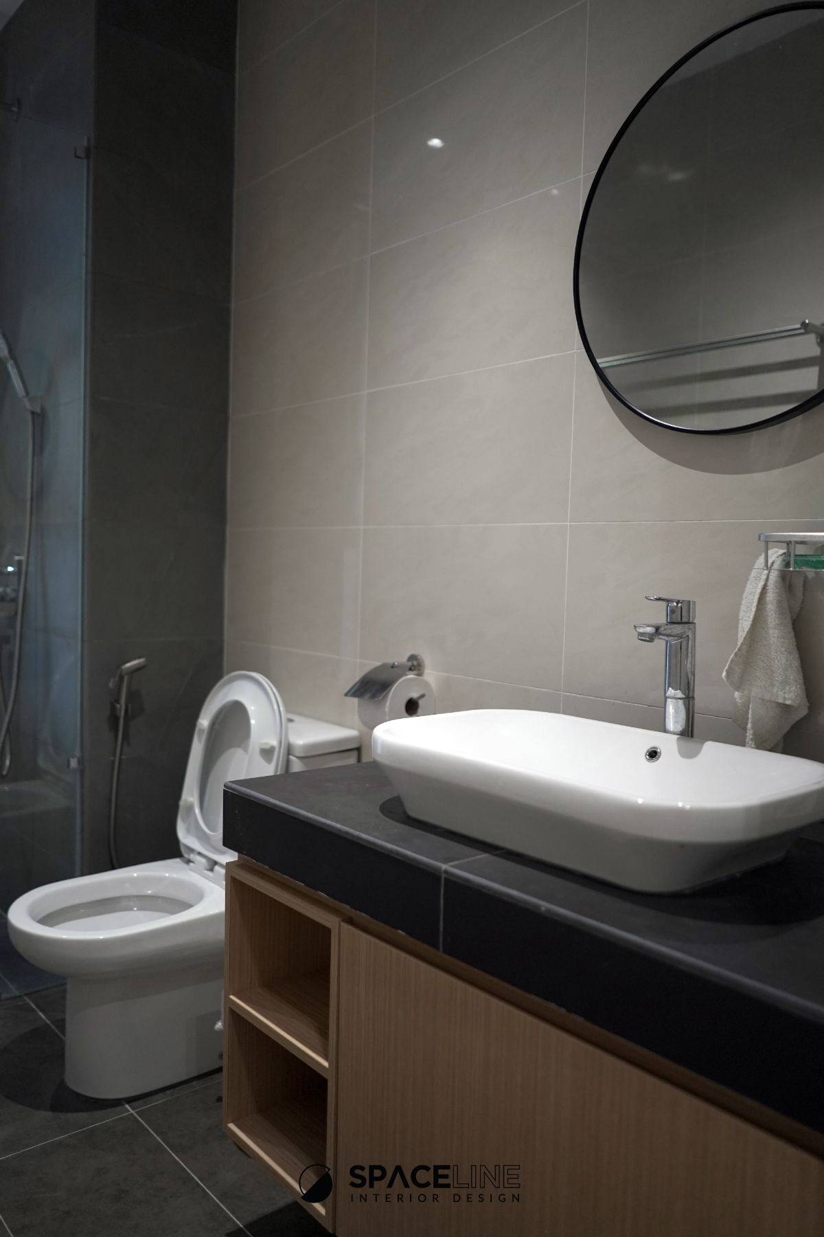 In the master bedroom, a see-through glass partition is a feature that allows natural light to effortlessly enlighten the bathroom. The full-height bedhead with an attached side table in natural wood adds coziness. A pocket space for a piano caters to the owner’s personality, creating an escape room. Study tables—essential in every room—feature wood and grey tabletops that promote mental clarity. Maximizing every corner is evident through integrated shelving and pocket storage, with layered lighting (spotlights and task lights) offering perfect illumination for specific activities.