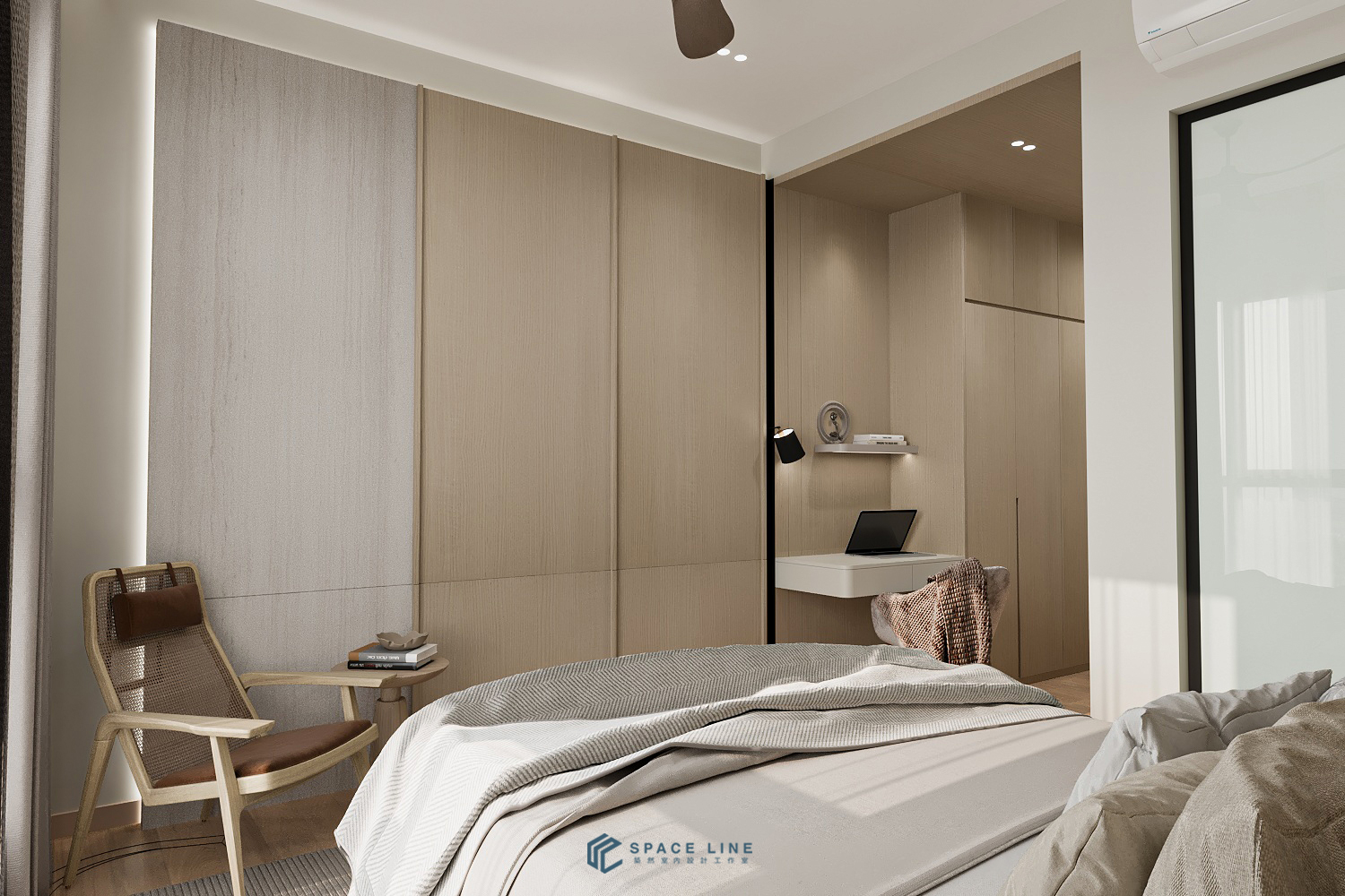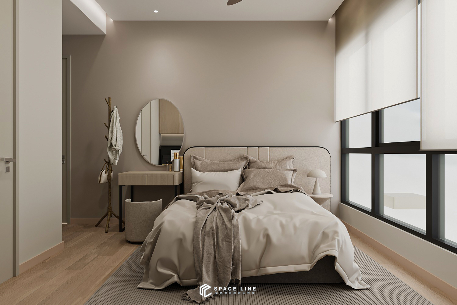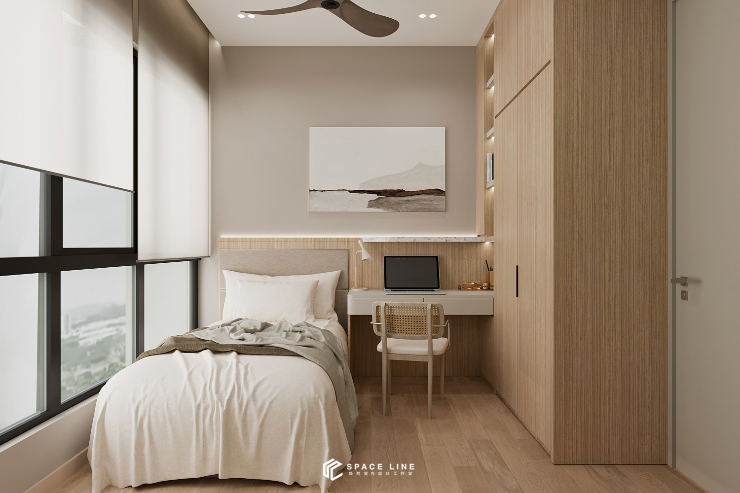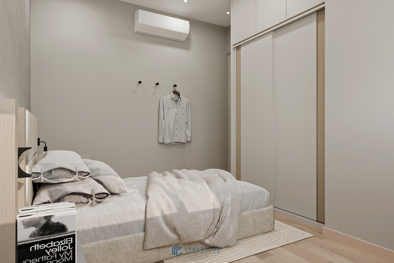 Consistency in the color tone is maintained across all bedroom interiors, focusing on simplicity and smart, space-saving layouts. Minimal furniture achieves a goal of no visual clutter, ensuring the spaces feel open, peaceful, and conducive to rest.