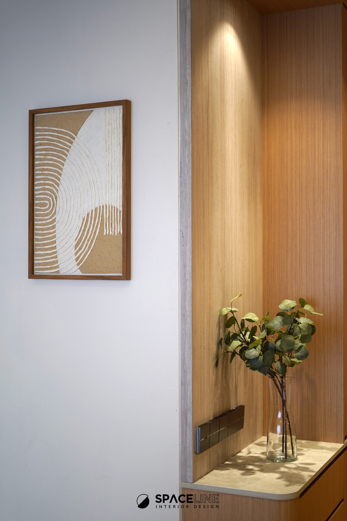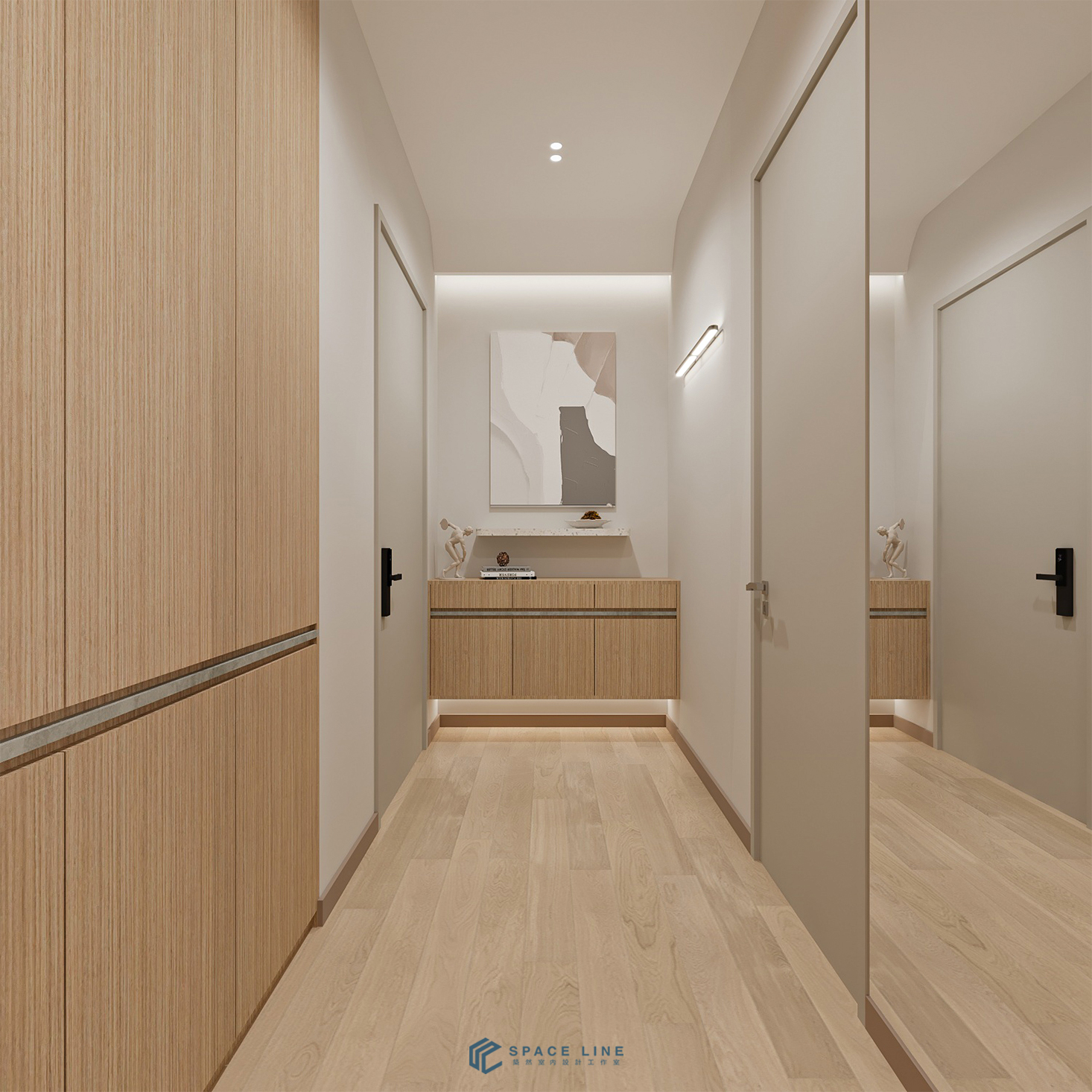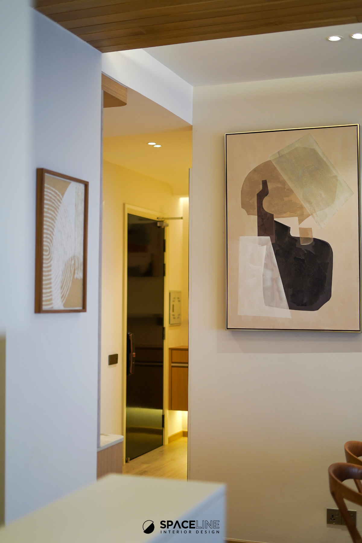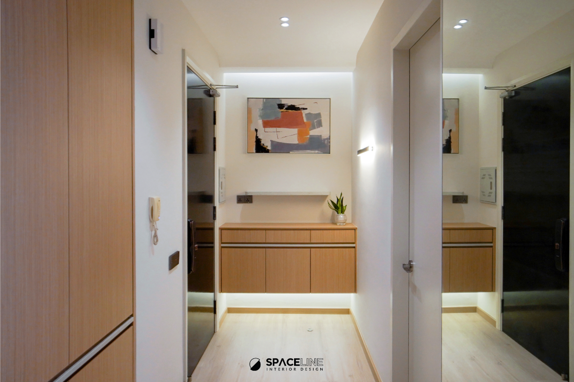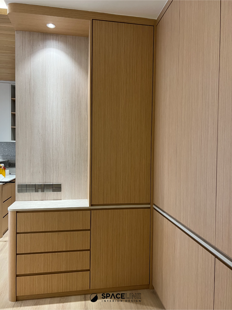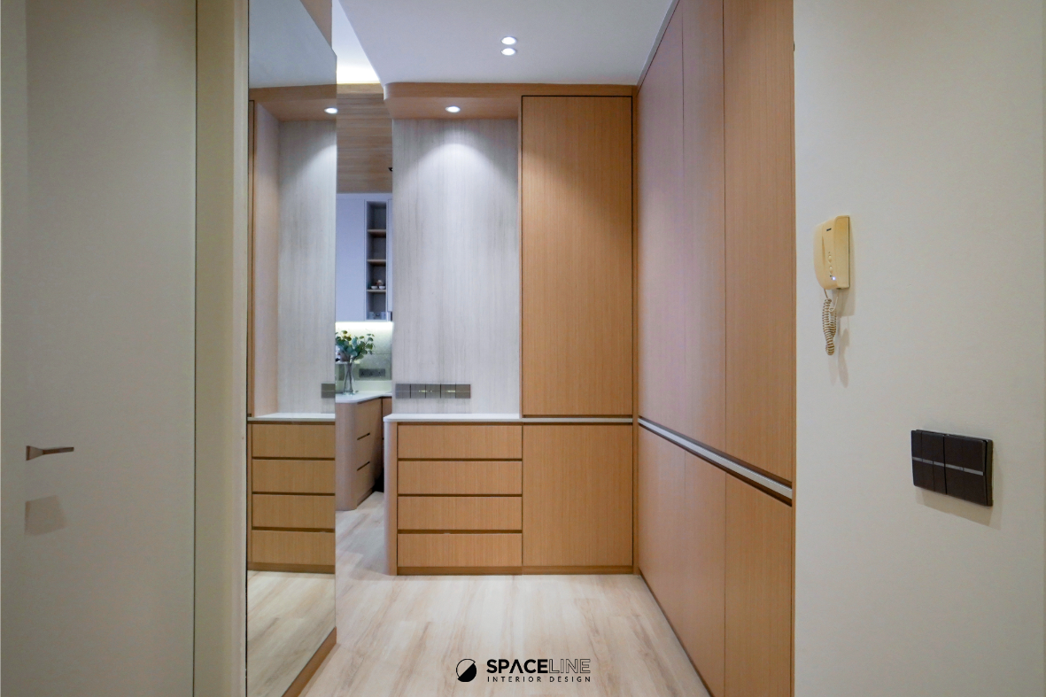 The apartment’s functional design begins at the foyer with a suspended shoe cabinet and subtle underneath LED lighting, maximizing the visual sense of airiness and practicality. A crucial element is the full-height storage cabinet that runs seamlessly along the wall, connecting the foyer to the kitchen and dining area. This provides ample, centralized storage, key for decluttering an apartment.