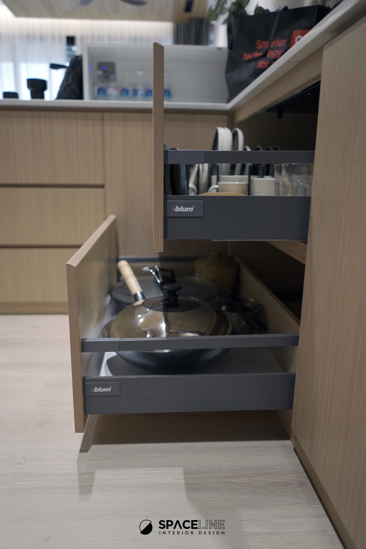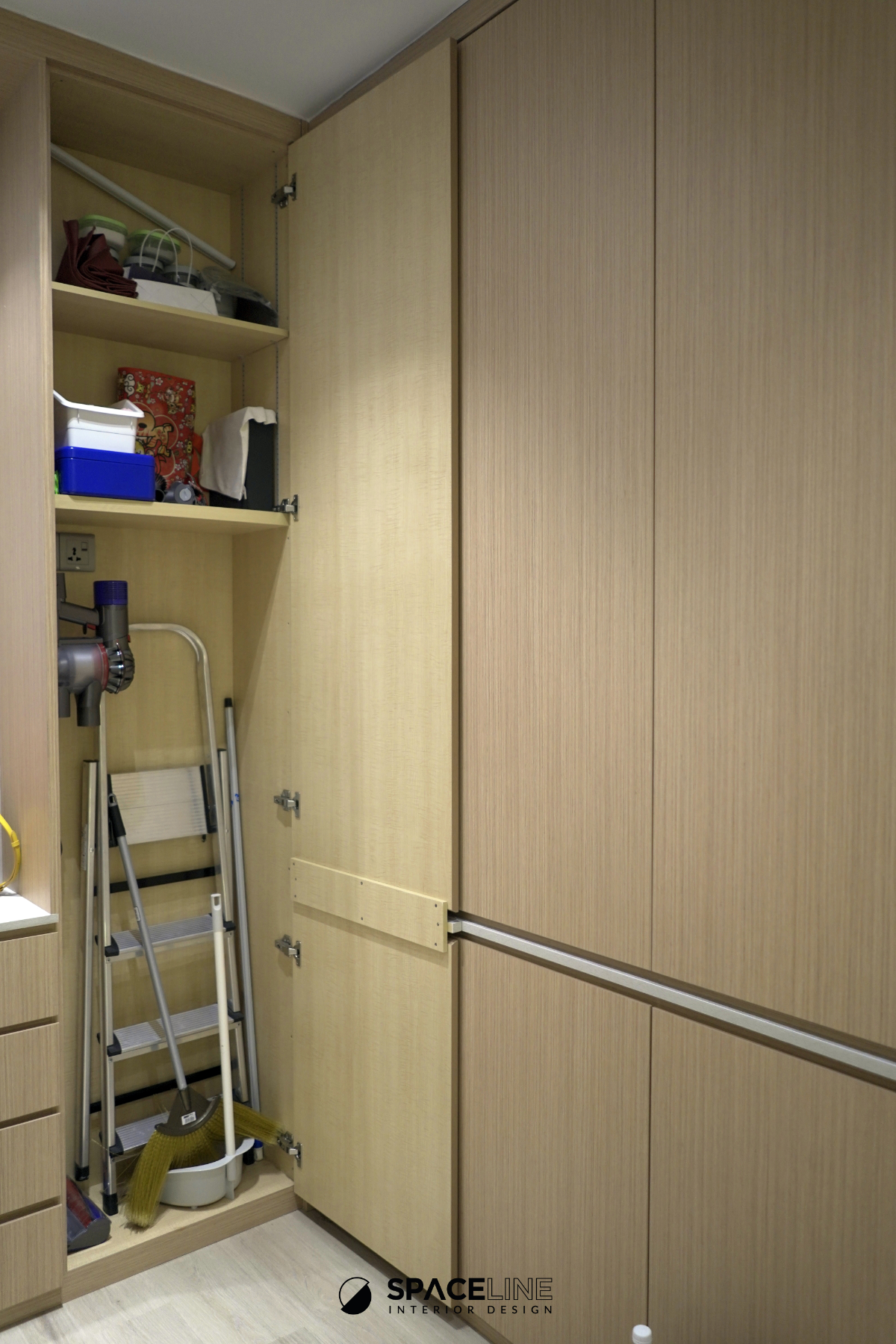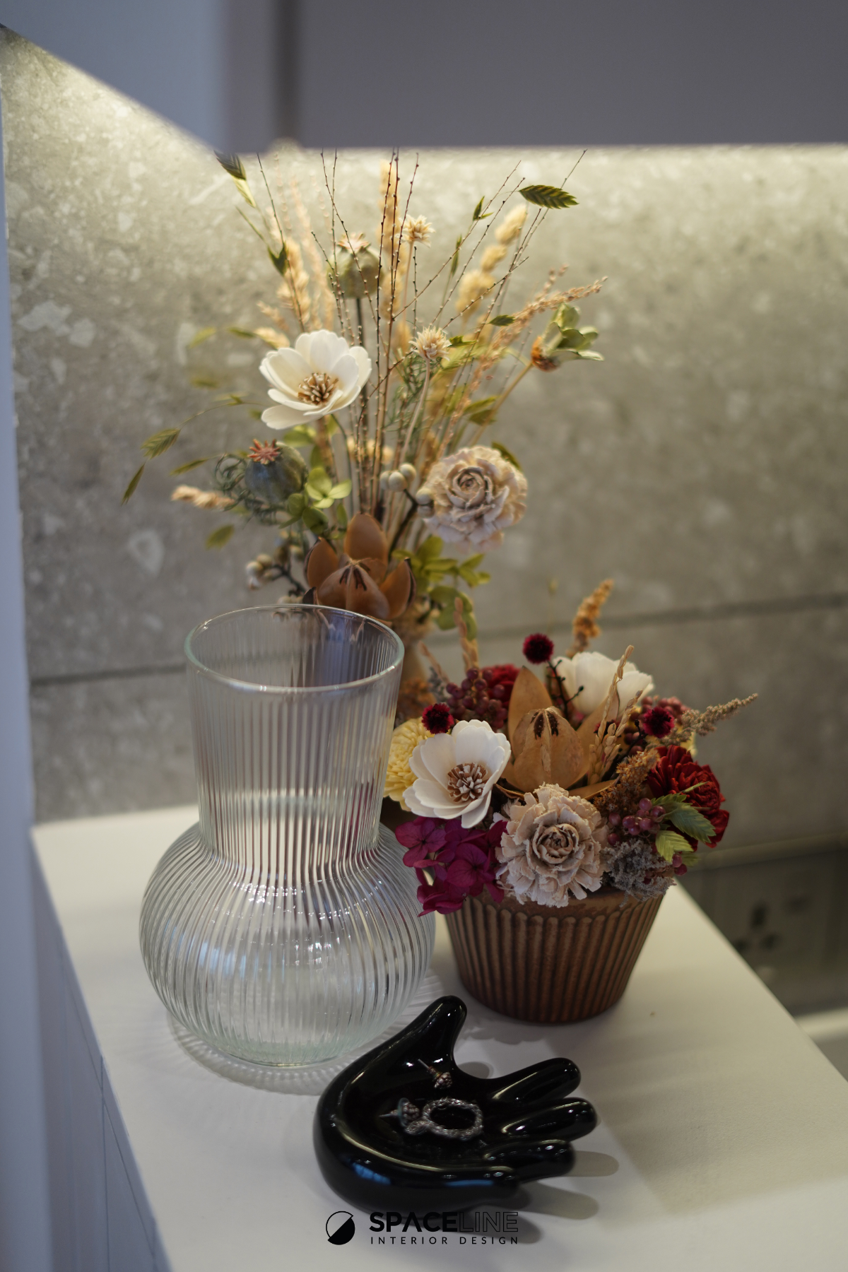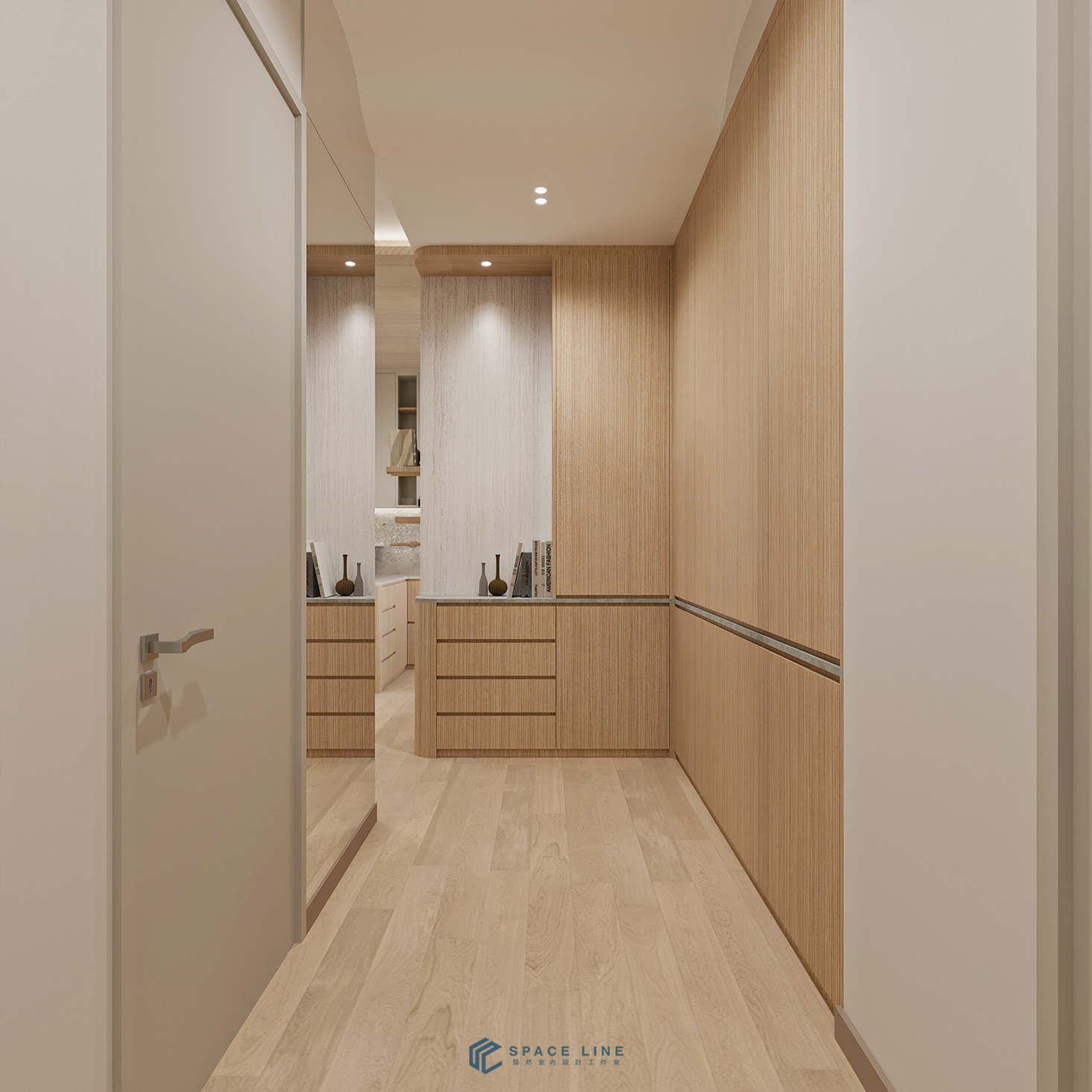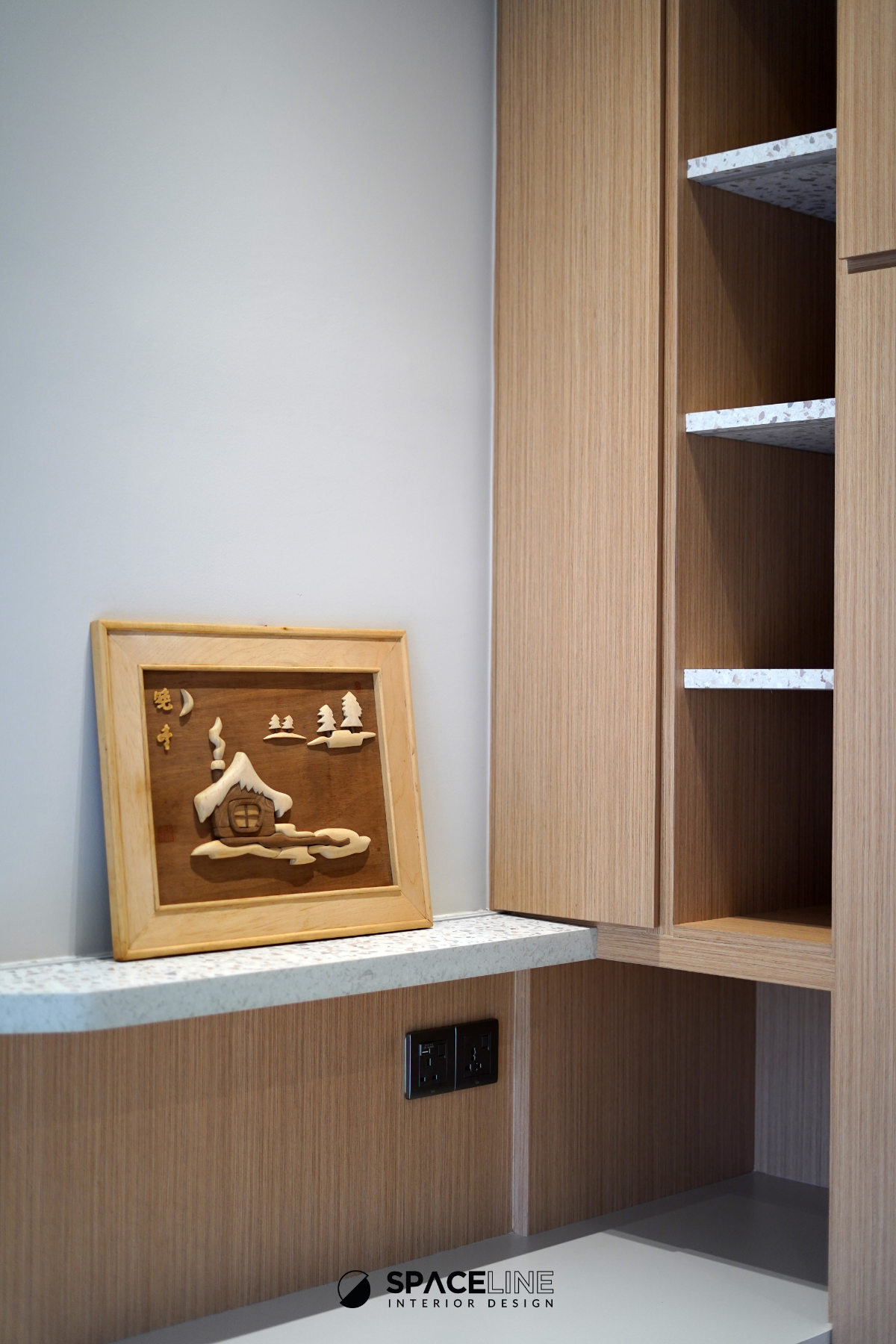 The apartment’s functional design begins at the foyer with a suspended shoe cabinet and subtle underneath LED lighting, maximizing the visual sense of airiness and practicality. A crucial element is the full-height storage cabinet that runs seamlessly along the wall, connecting the foyer to the kitchen and dining area. This provides ample, centralized storage, key for decluttering an apartment.