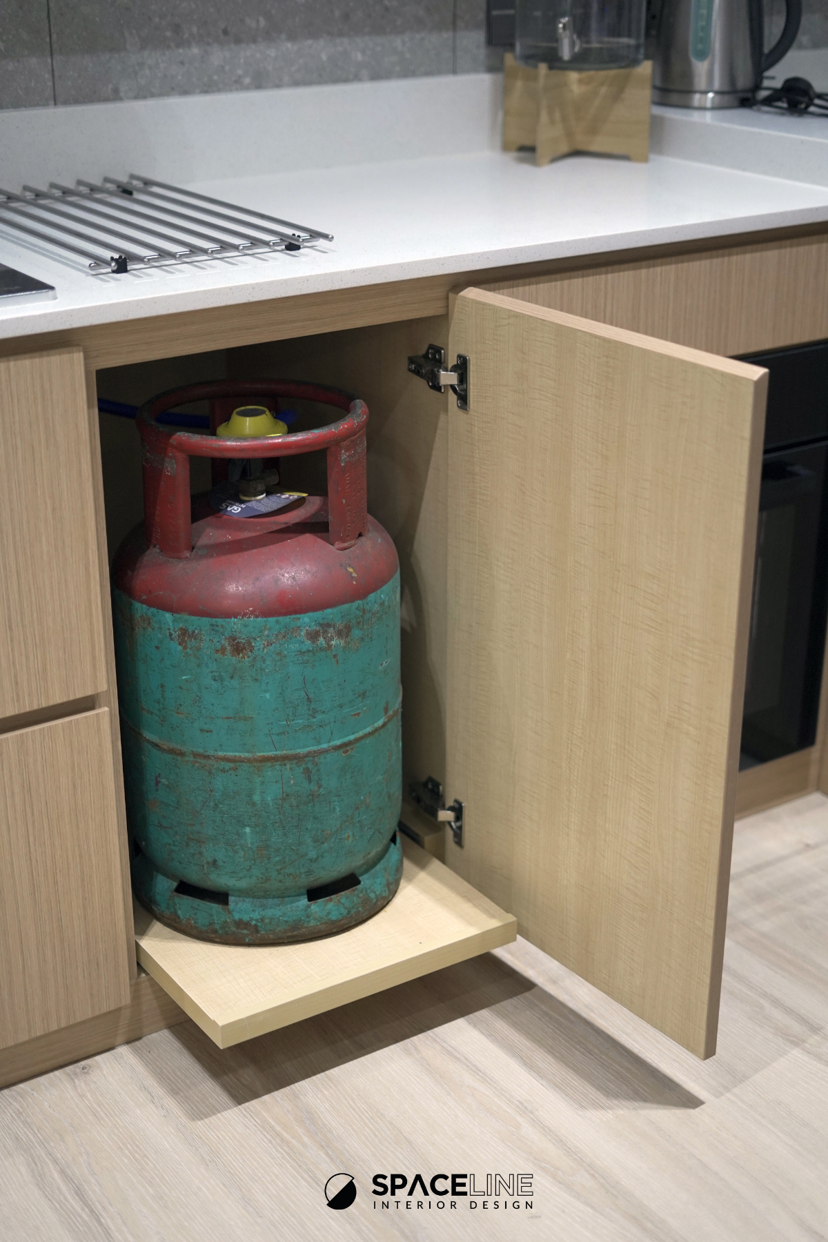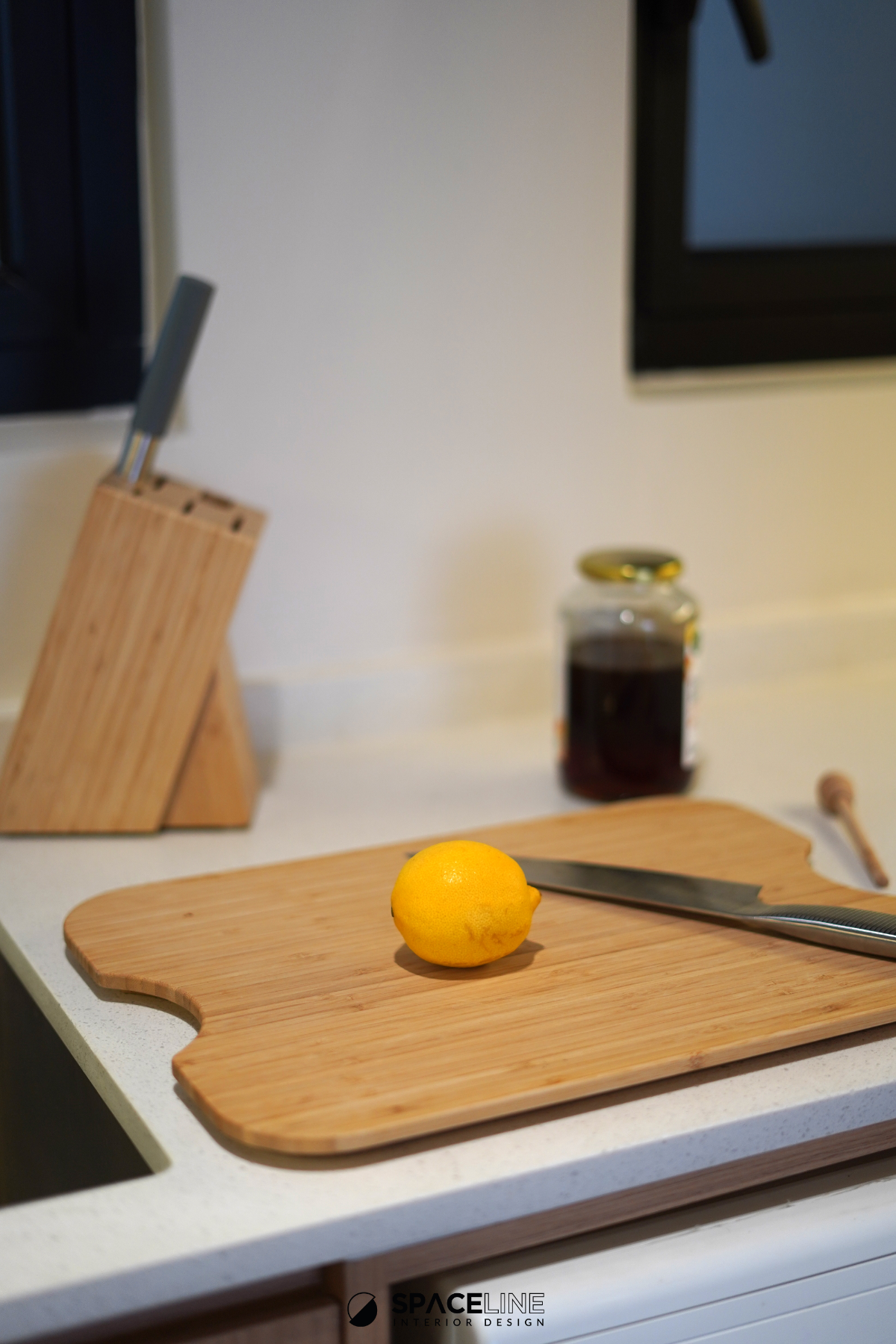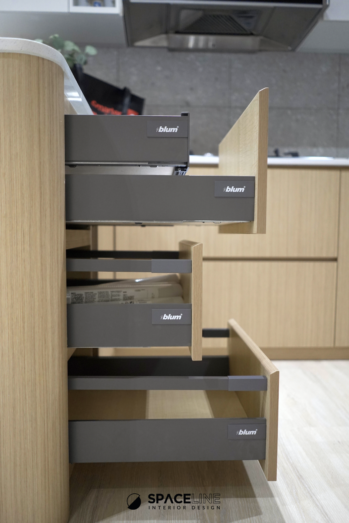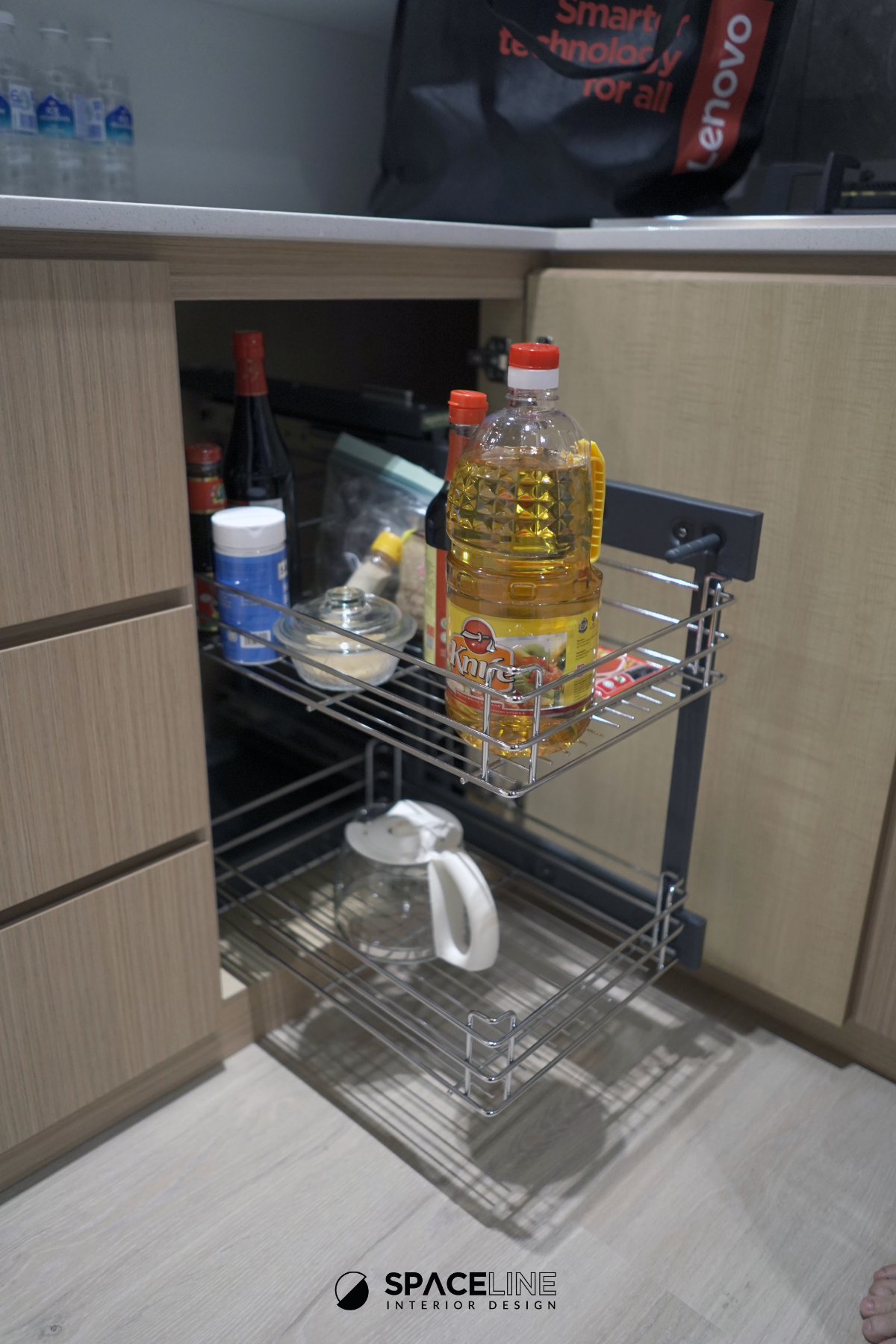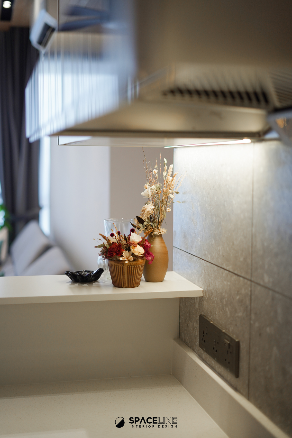 The apartment’s functional design begins at the foyer with a suspended shoe cabinet and subtle underneath LED lighting, maximizing the visual sense of airiness and practicality. A crucial element is the full-height storage cabinet that runs seamlessly along the wall, connecting the foyer to the kitchen and dining area. This provides ample, centralized storage, key for decluttering an apartment.