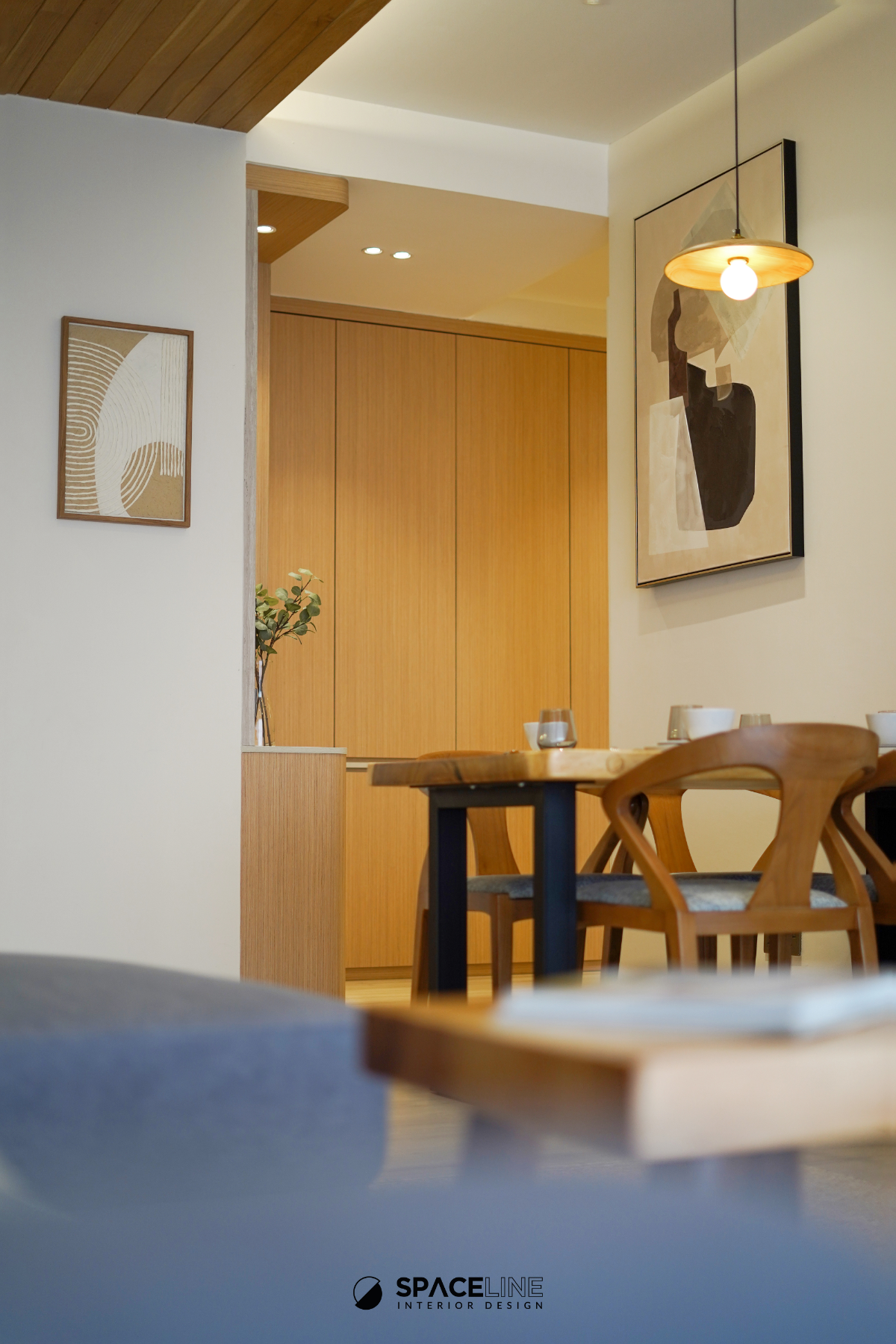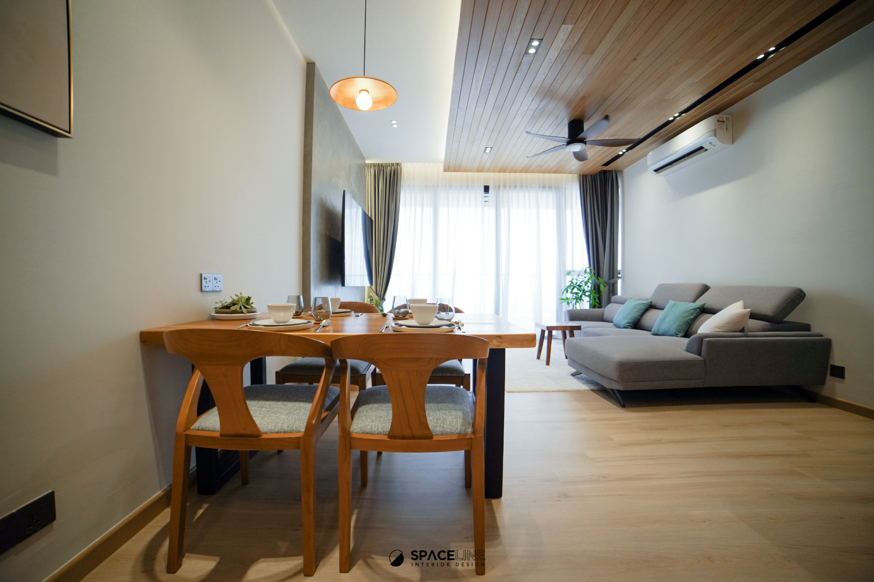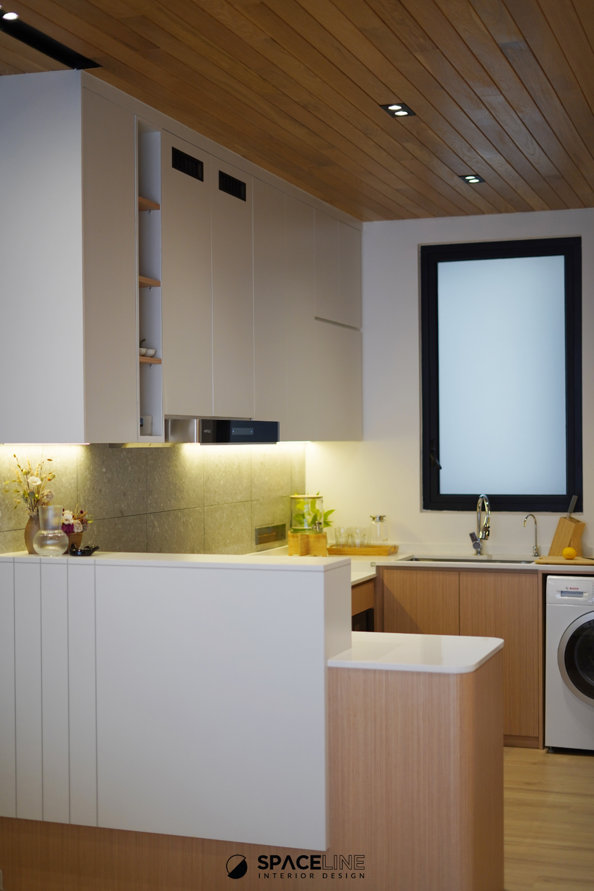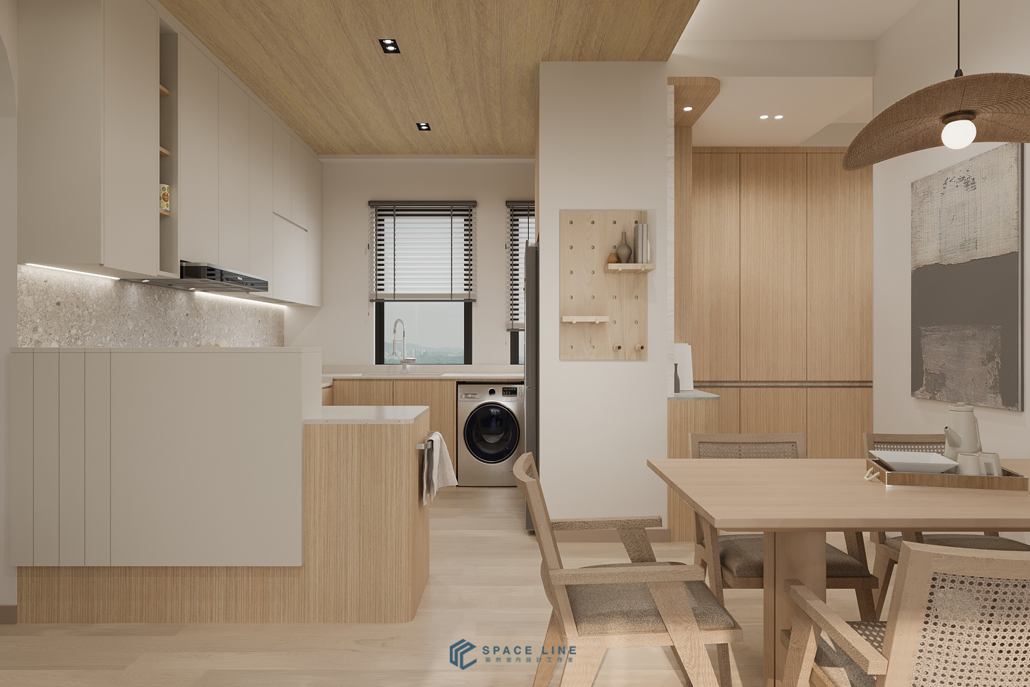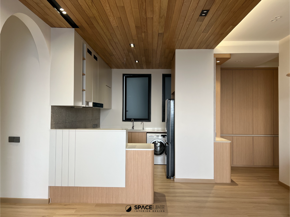 In the kitchen and dining area, a distinctive wood-finished ceiling creates a sense of warmth and continuity, laying across the space from the kitchen to the living room. The kitchen is strategically curated for efficient workflow, featuring a bar counter, a large countertop integrated with a washing machine compartment, and a full-height fridge cabinet. The light cream and wood color combination, contrasted by a grey tile backsplash, maintains a balanced aesthetic. A well-proportioned dining table is centrally located, acting as a soft separator between the kitchen and living areas, allowing continuous open communication between all zones.