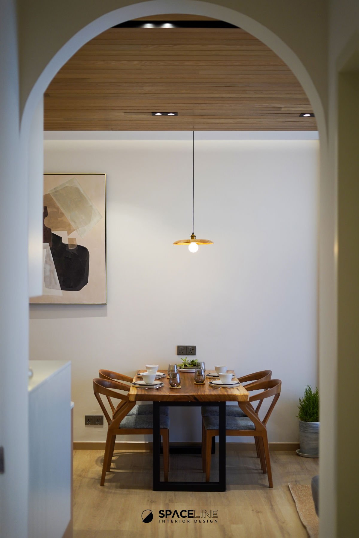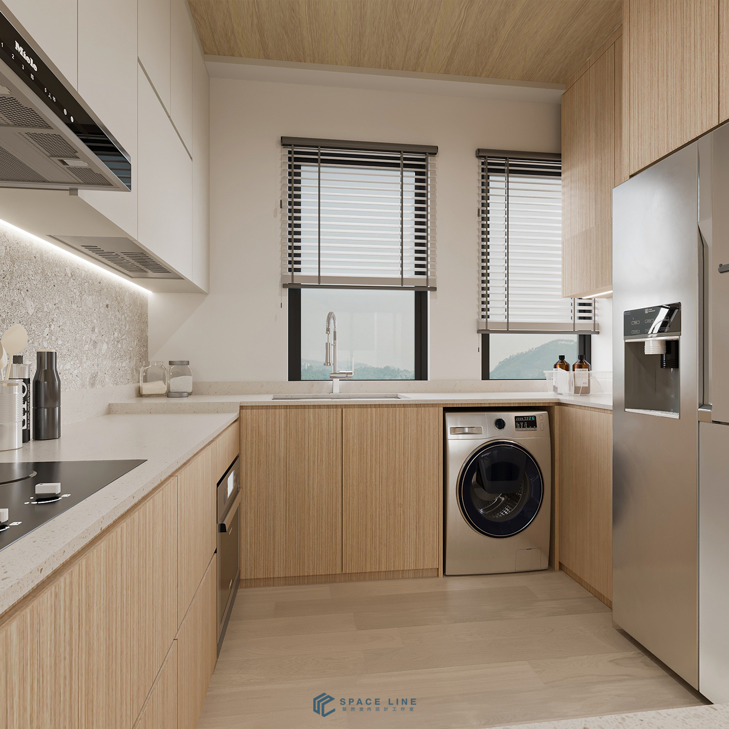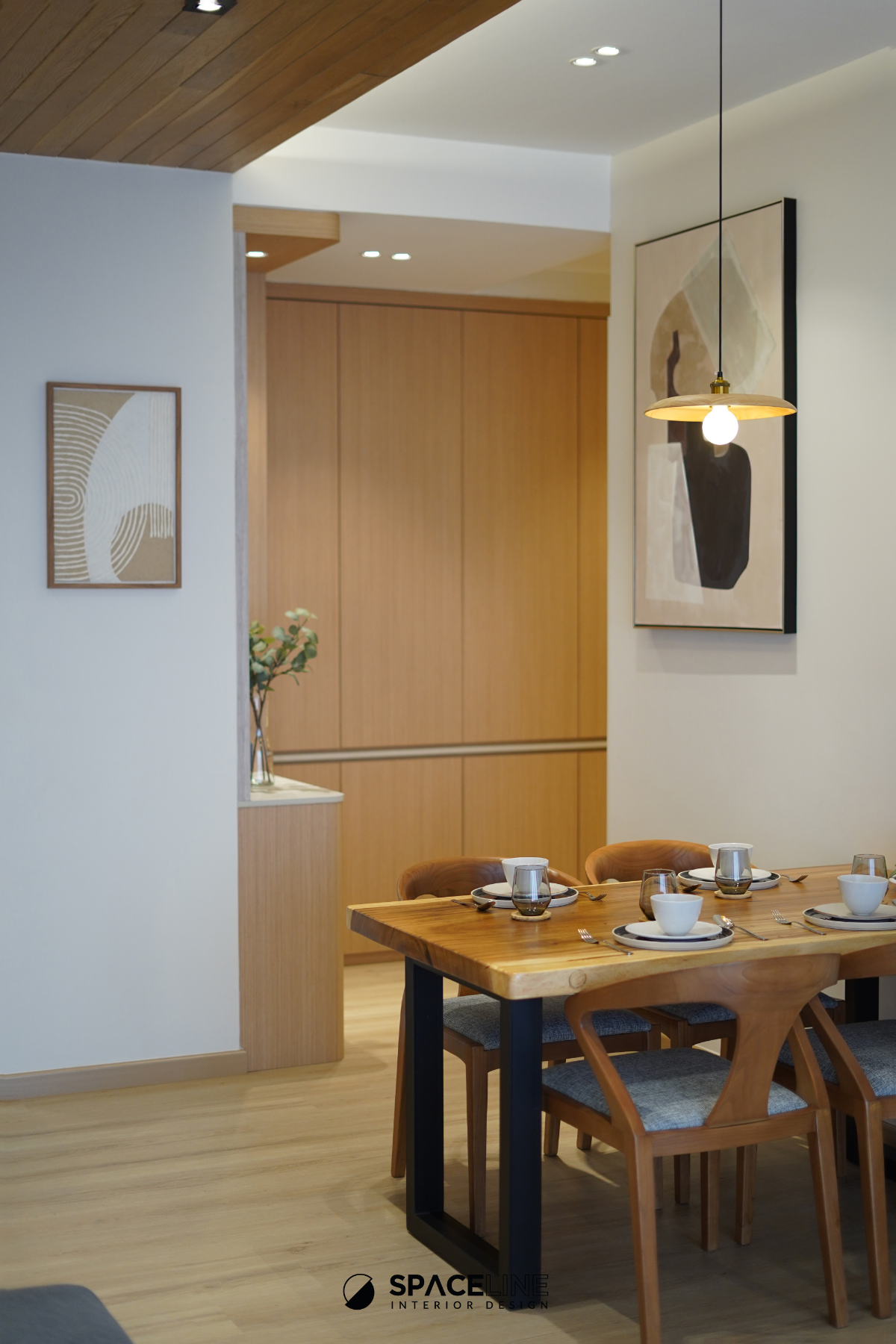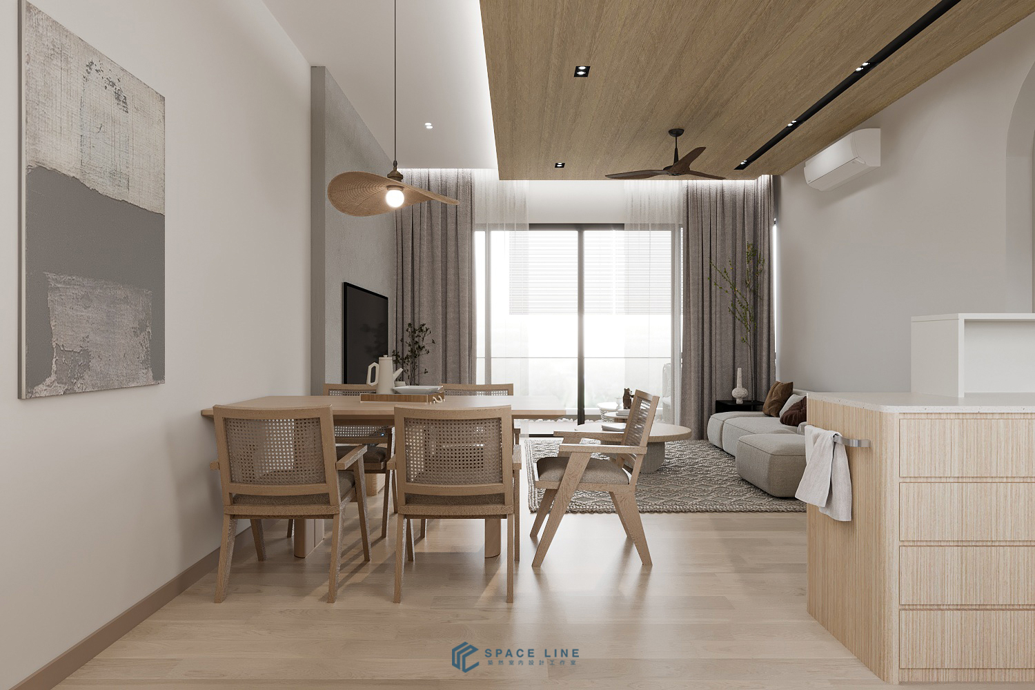 In the kitchen and dining area, a distinctive wood-finished ceiling creates a sense of warmth and continuity, laying across the space from the kitchen to the living room. The kitchen is strategically curated for efficient workflow, featuring a bar counter, a large countertop integrated with a washing machine compartment, and a full-height fridge cabinet. The light cream and wood color combination, contrasted by a grey tile backsplash, maintains a balanced aesthetic. A well-proportioned dining table is centrally located, acting as a soft separator between the kitchen and living areas, allowing continuous open communication between all zones.