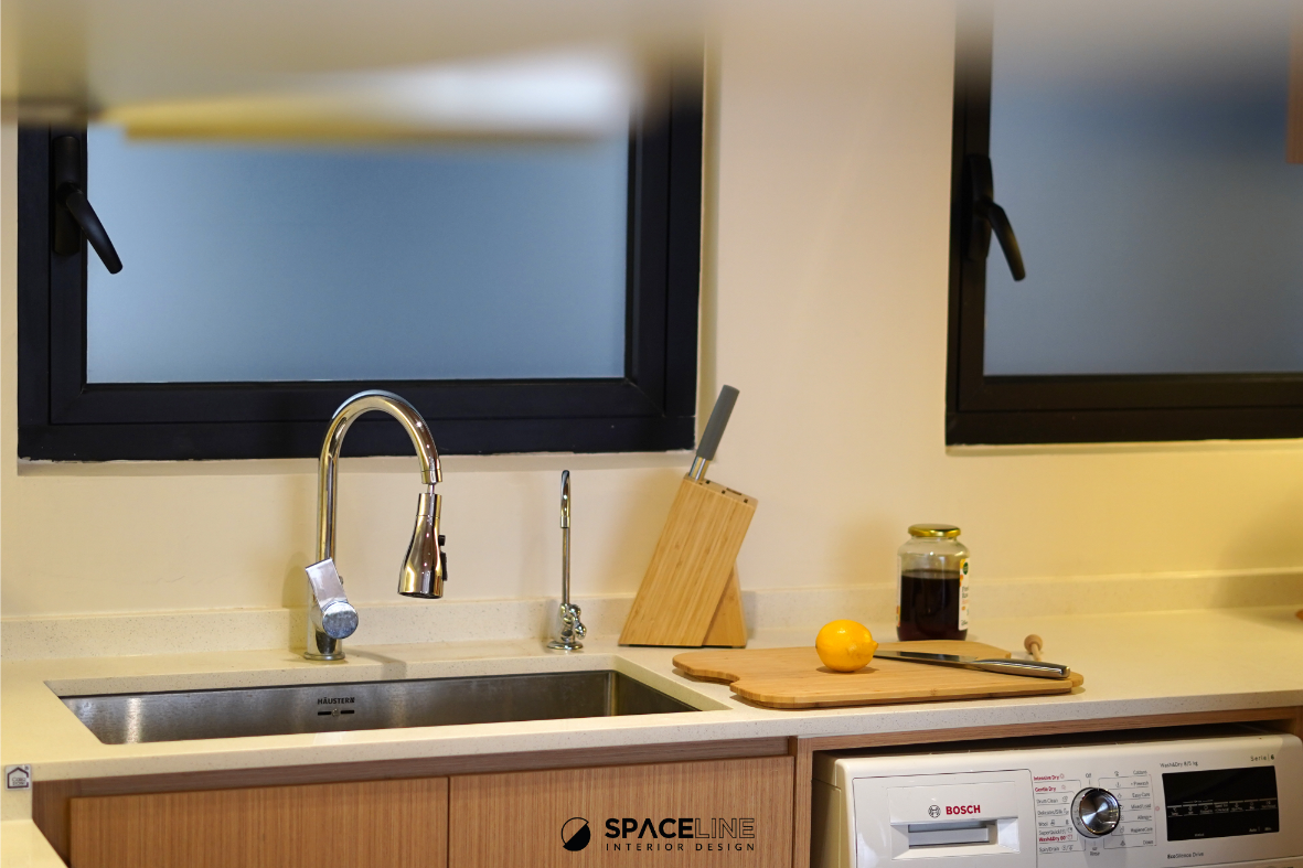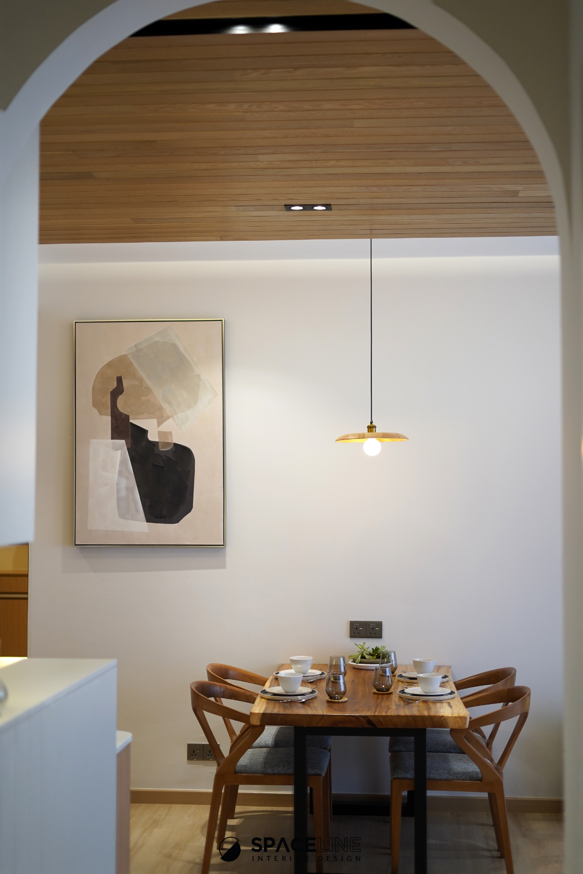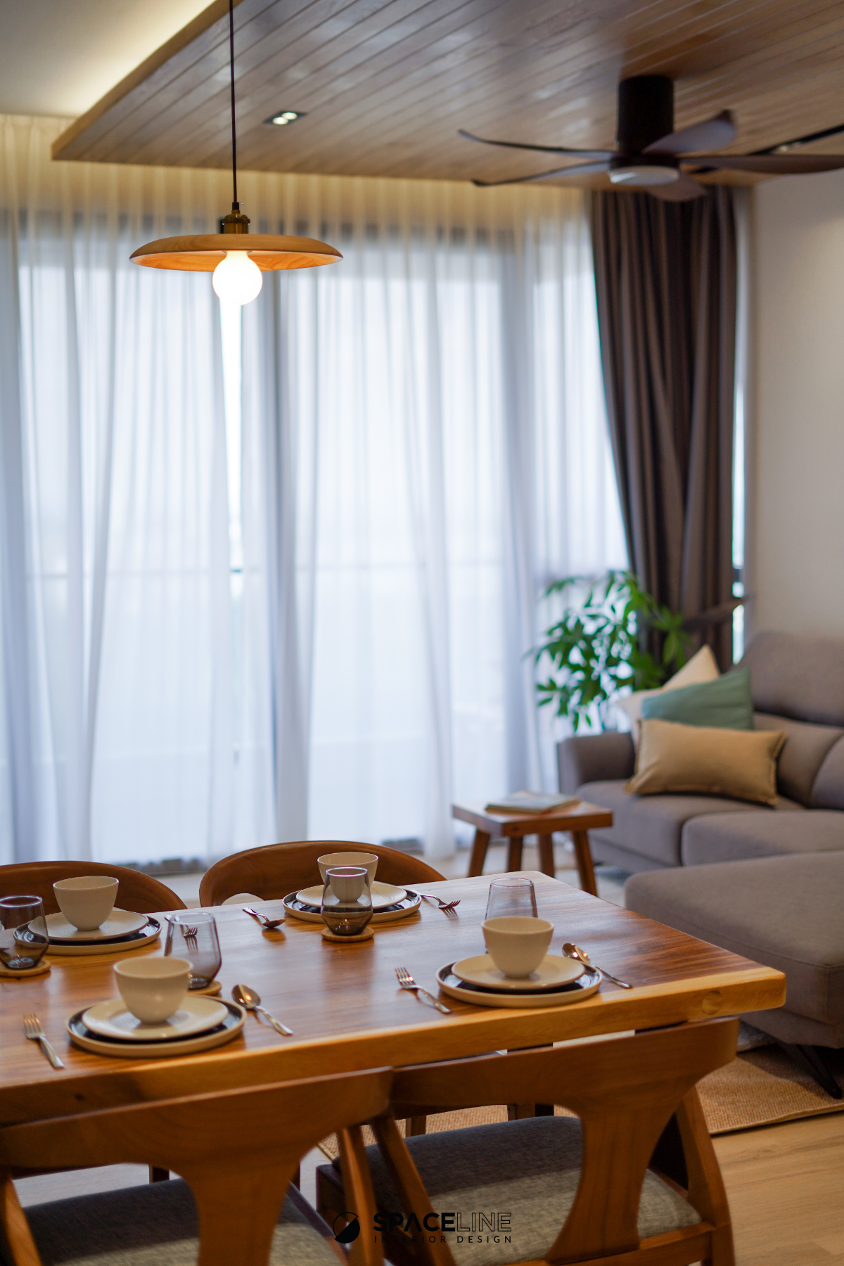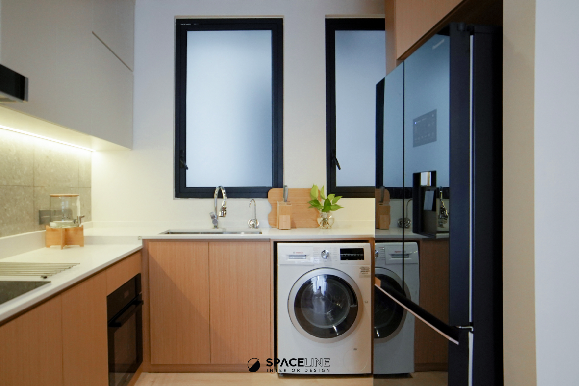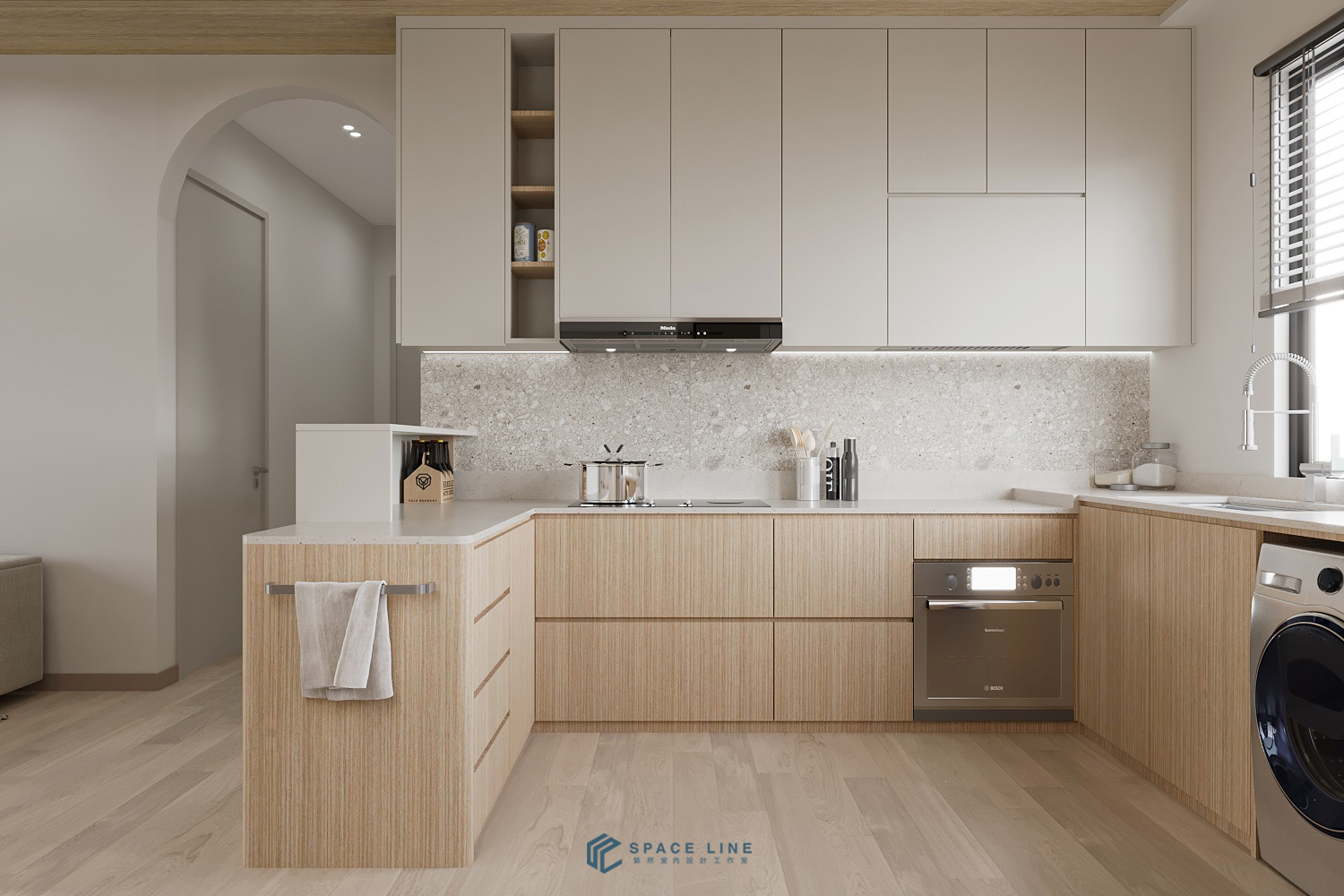 In the kitchen and dining area, a distinctive wood-finished ceiling creates a sense of warmth and continuity, laying across the space from the kitchen to the living room. The kitchen is strategically curated for efficient workflow, featuring a bar counter, a large countertop integrated with a washing machine compartment, and a full-height fridge cabinet. The light cream and wood color combination, contrasted by a grey tile backsplash, maintains a balanced aesthetic. A well-proportioned dining table is centrally located, acting as a soft separator between the kitchen and living areas, allowing continuous open communication between all zones.