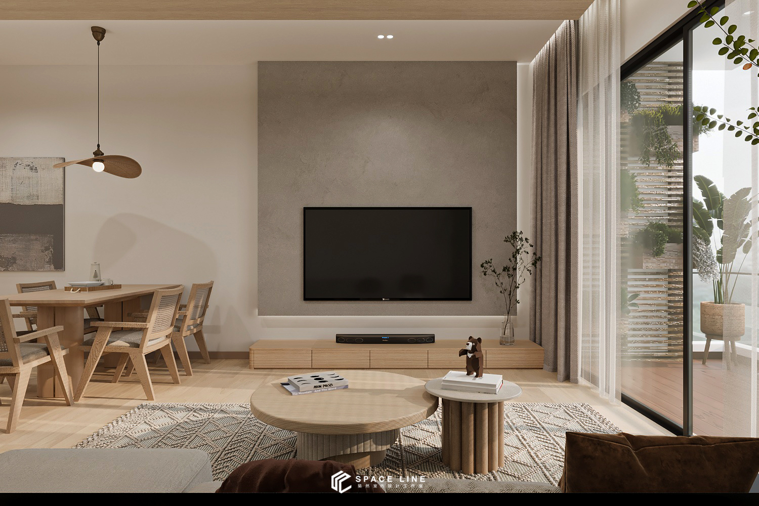 The living space is anchored by a grounded console and a hanging TV feature wall, both enhanced with LED strips for a lively, cozy feel. The feature wall uses a grey concrete texture that harmonizes with the SPC flooring, softening the visual aesthetic. Green plants and drapery white curtains contribute to a sense of inviting freshness, creating a space that encourages relaxation.