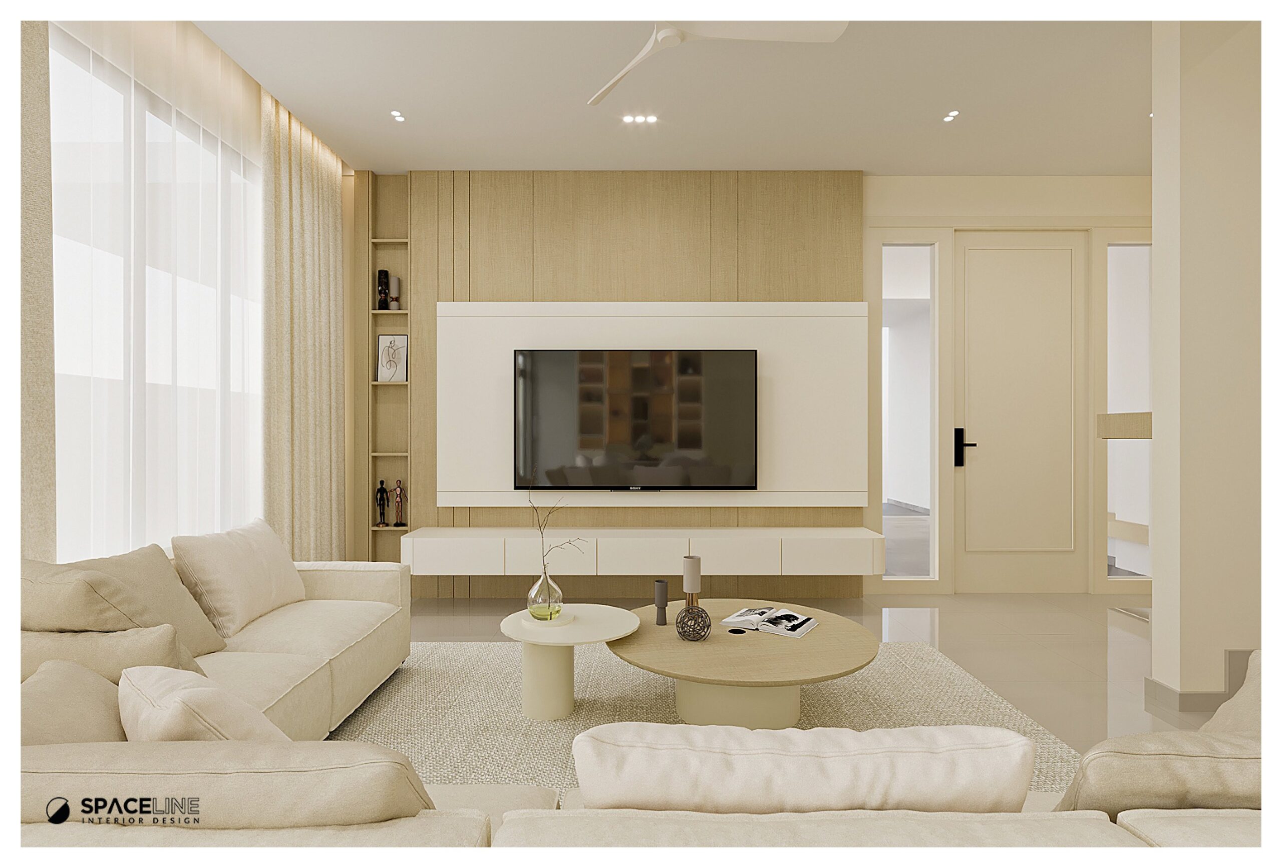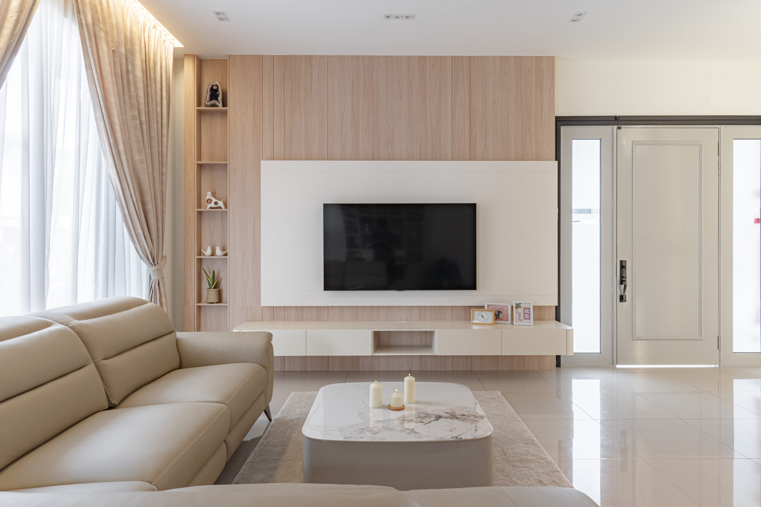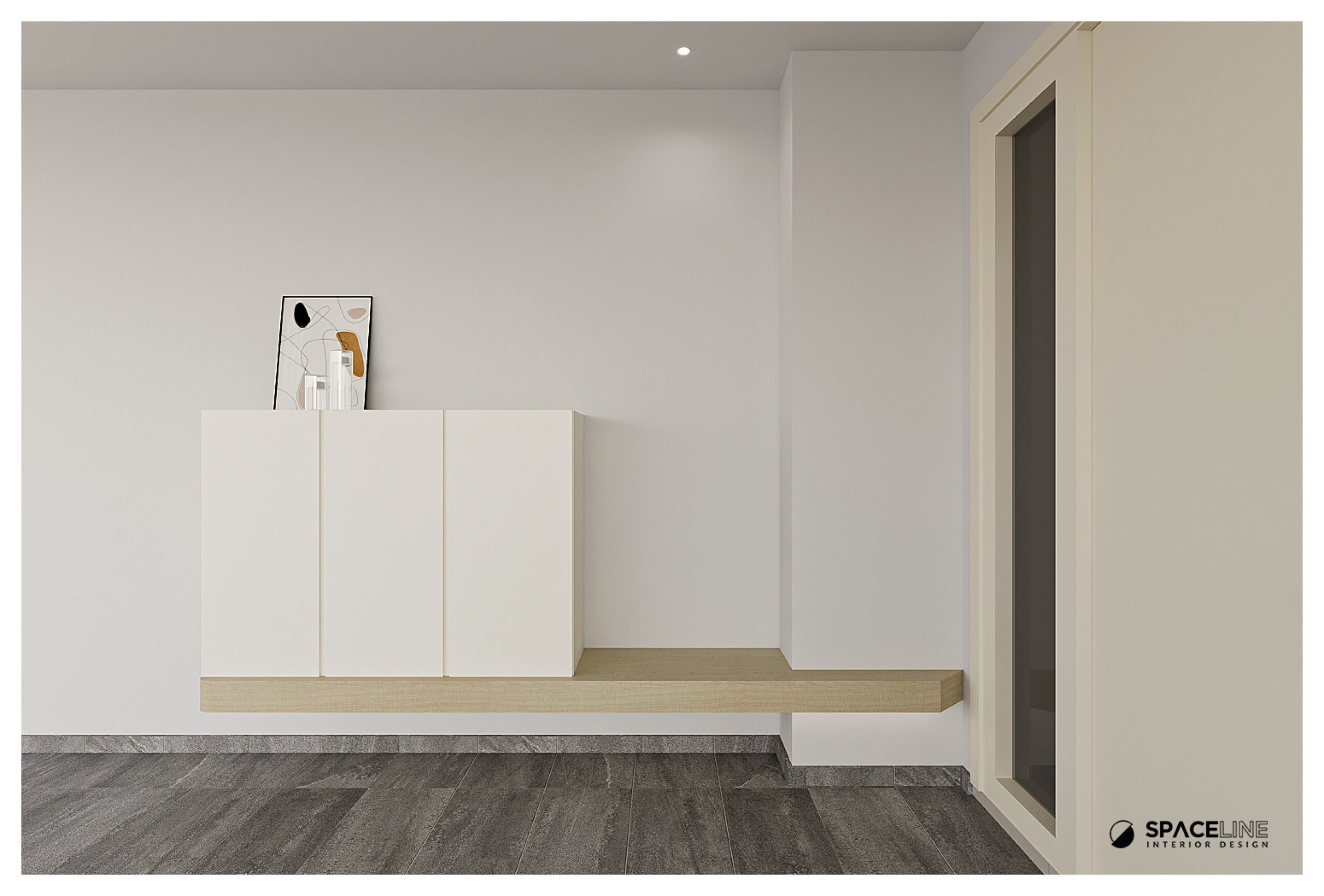 In the foyer, consistent tones across walls and cabinetry immediately elevate the sense of welcoming. This leads seamlessly into the living space, where a plush, low-profile sofa ensures the seating zone is both cozy and elegant. The combination of natural wood and matte cream creates visual depth and space flexibility. Functionality is integrated into the design via the suspended TV console and feature wall, which includes a subtle pocket shelving unit on the left to add purpose without compromising the clean aesthetic.
