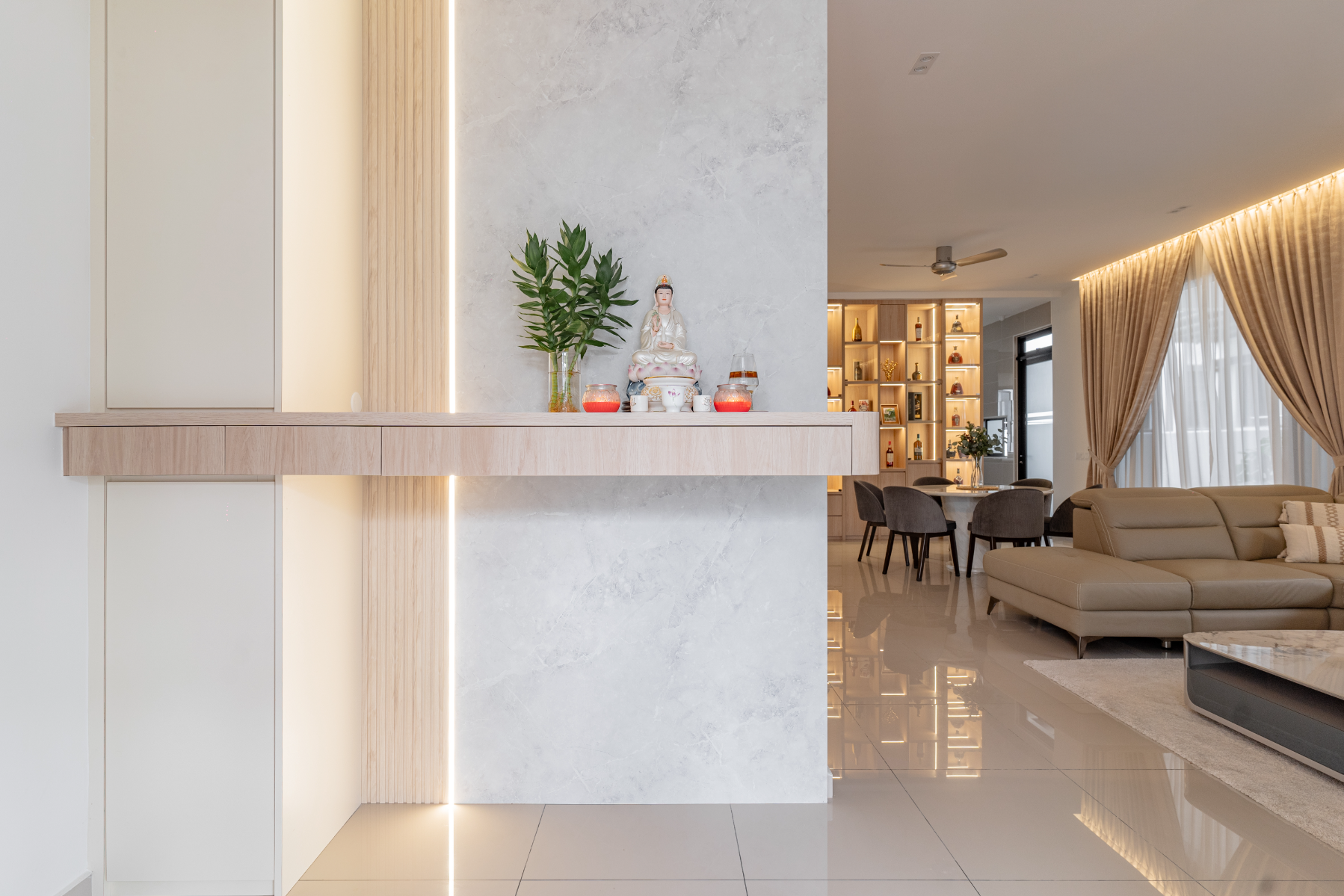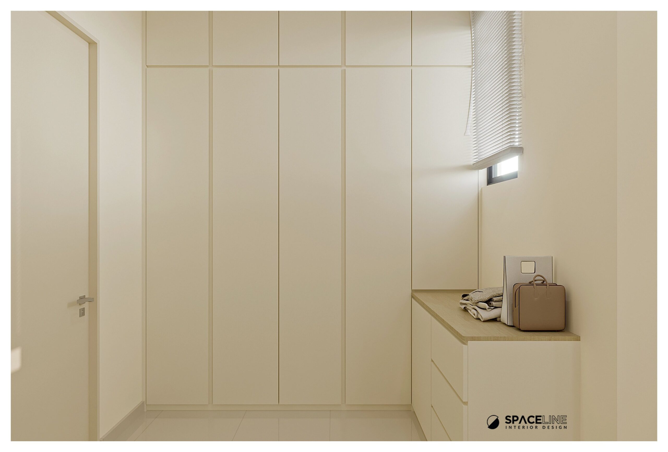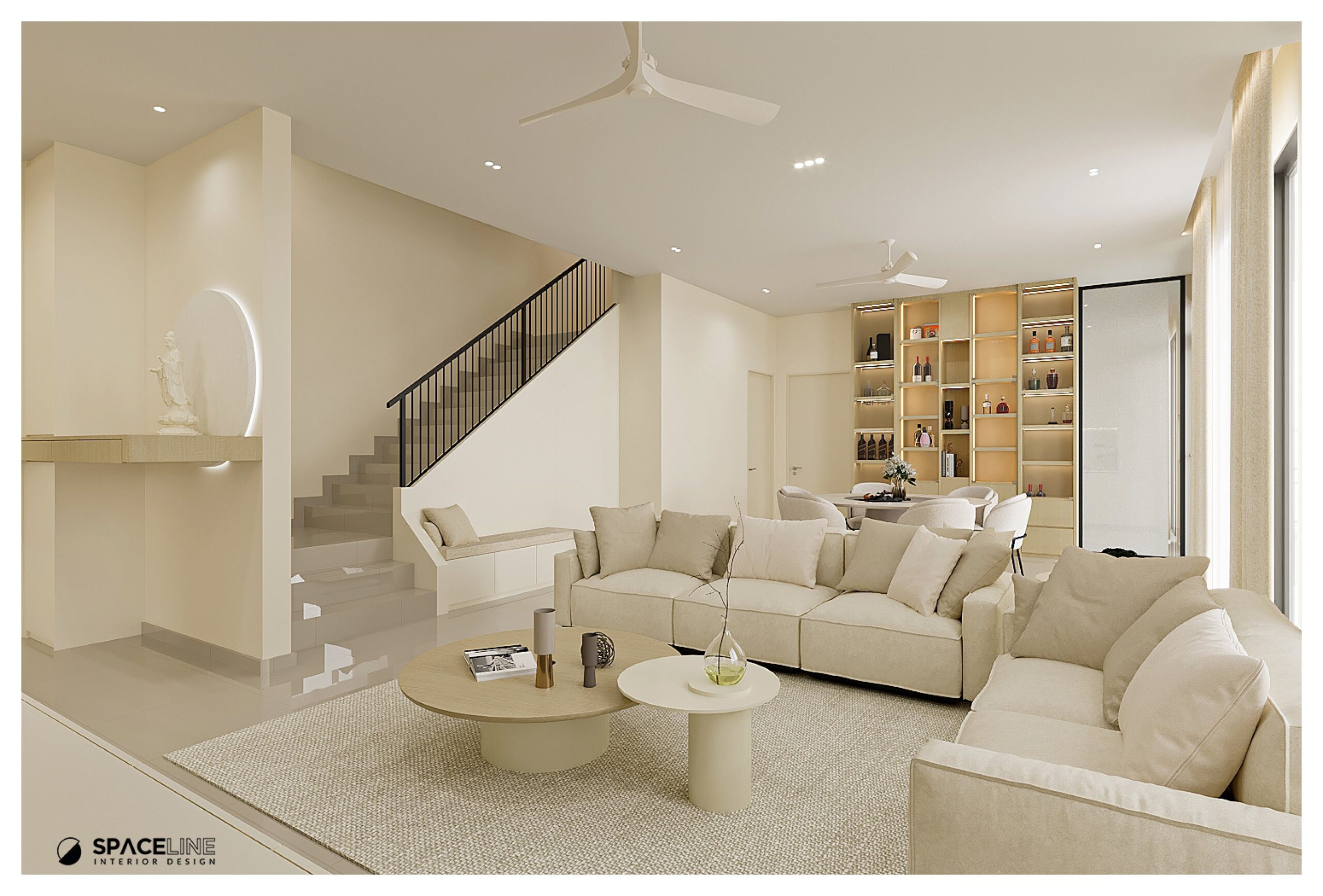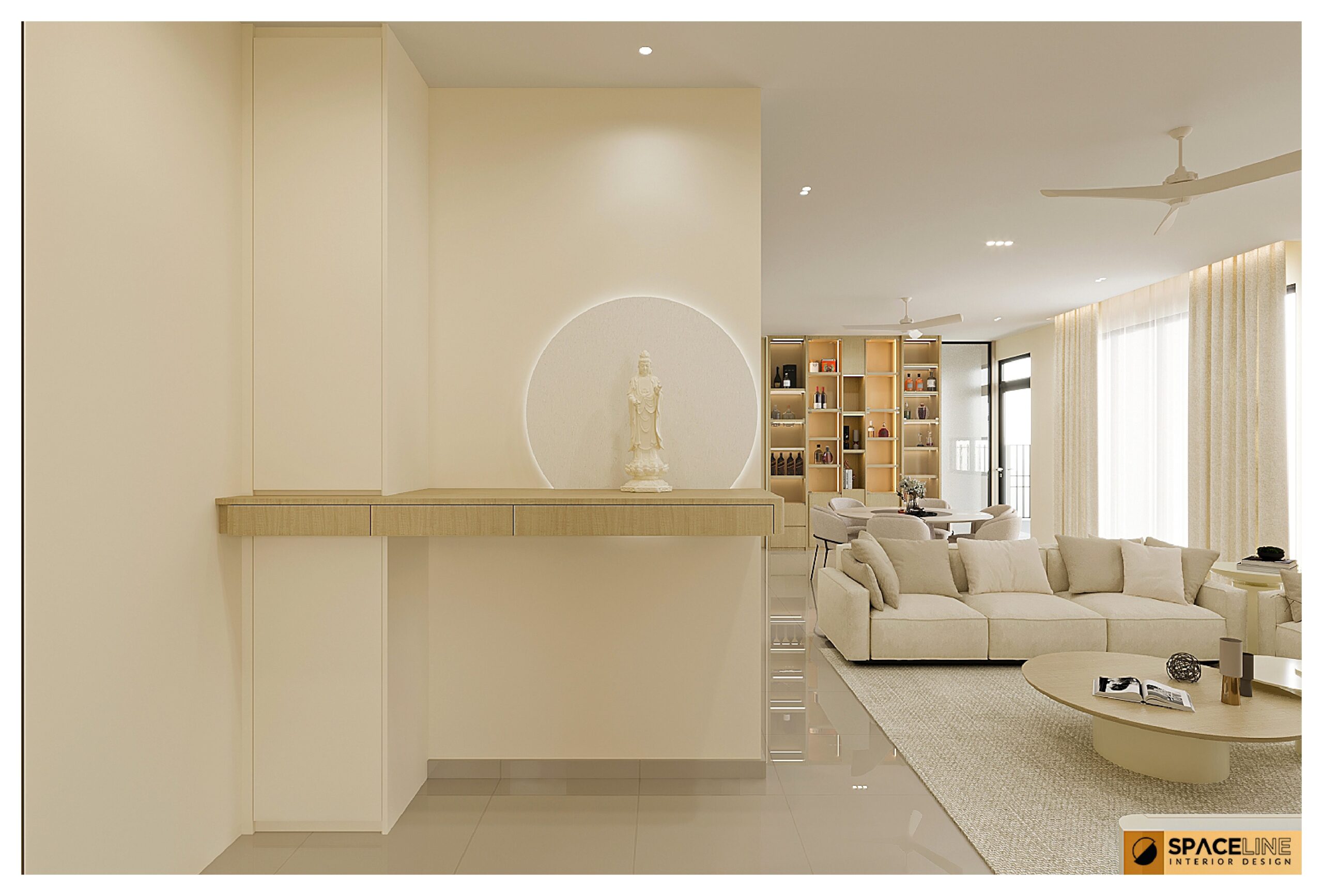 In the foyer, consistent tones across walls and cabinetry immediately elevate the sense of welcoming. This leads seamlessly into the living space, where a plush, low-profile sofa ensures the seating zone is both cozy and elegant. The combination of natural wood and matte cream creates visual depth and space flexibility. Functionality is integrated into the design via the suspended TV console and feature wall, which includes a subtle pocket shelving unit on the left to add purpose without compromising the clean aesthetic.