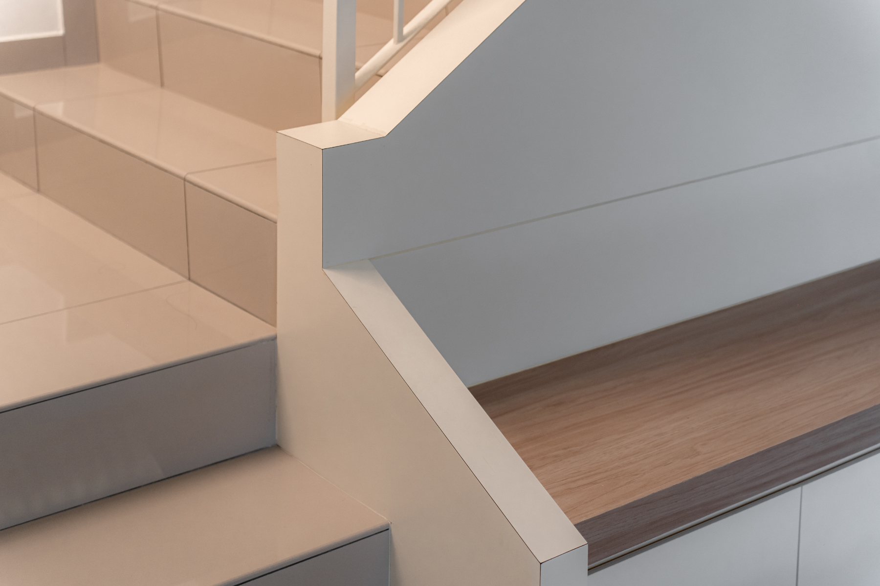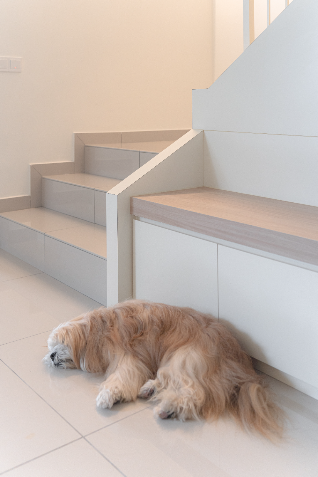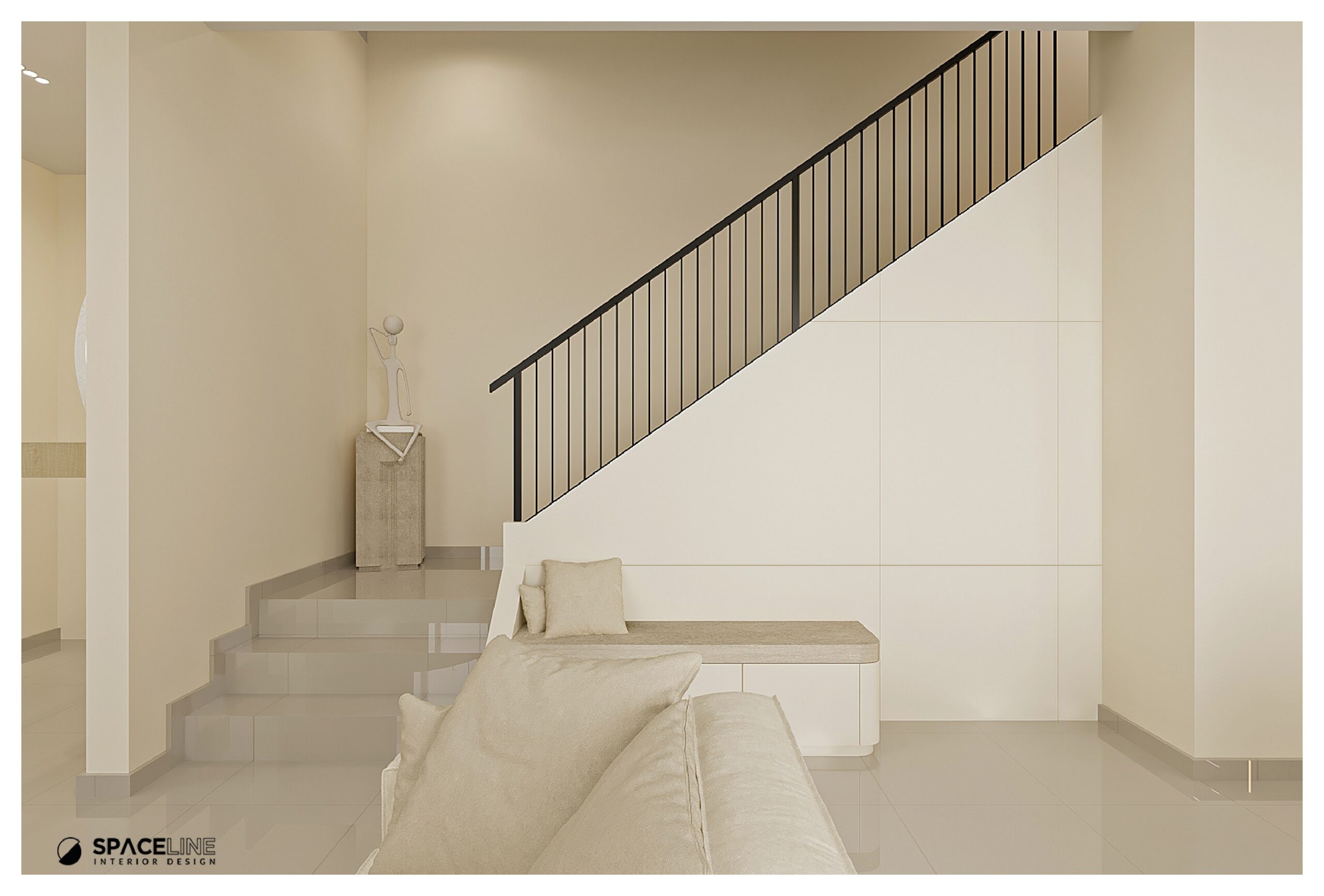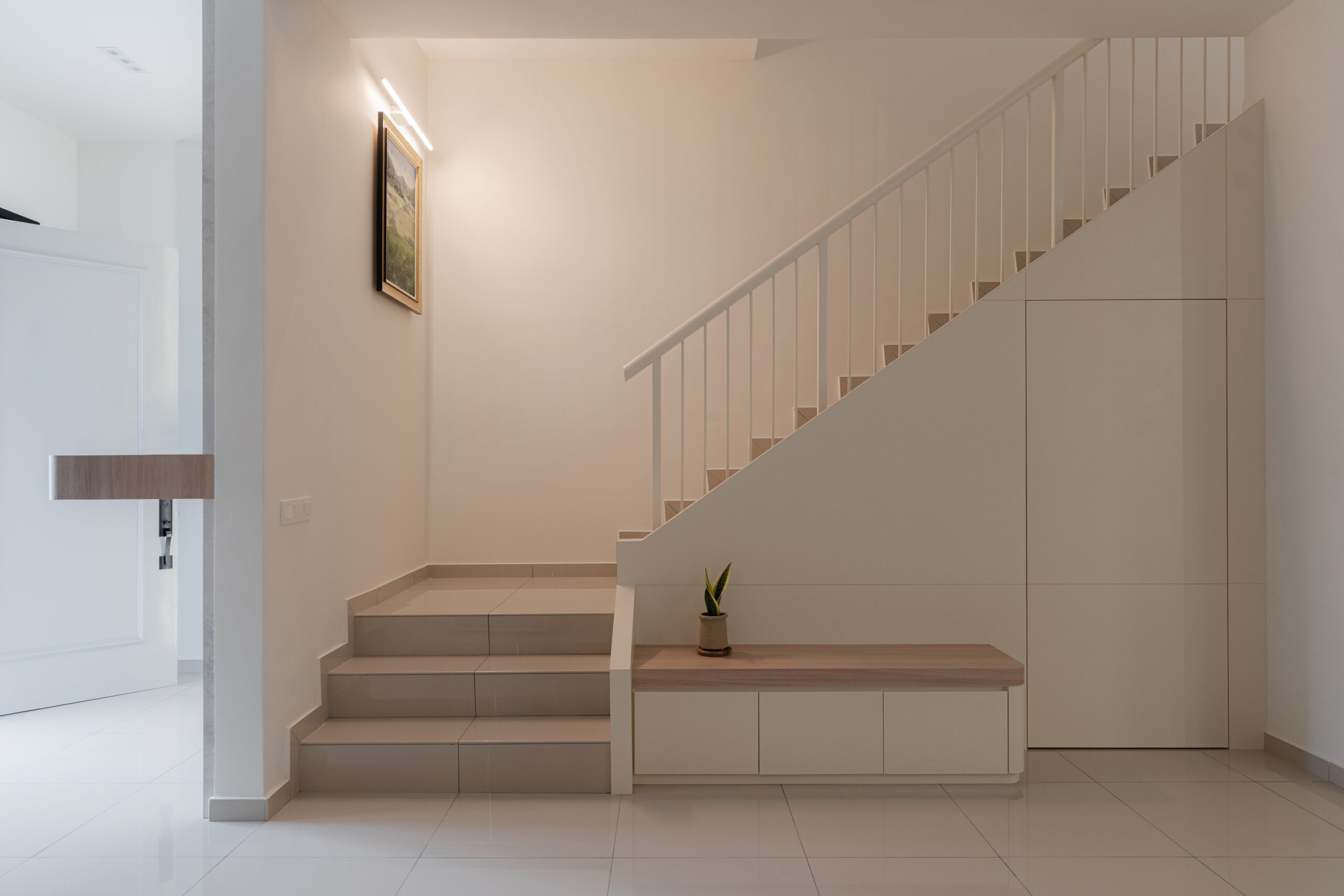 Thoughtful space optimization is also implemented below the staircase area, where a custom-built storage unit with integrated bench seating transforms the void into a purposeful, functional space for daily use and additional storage.