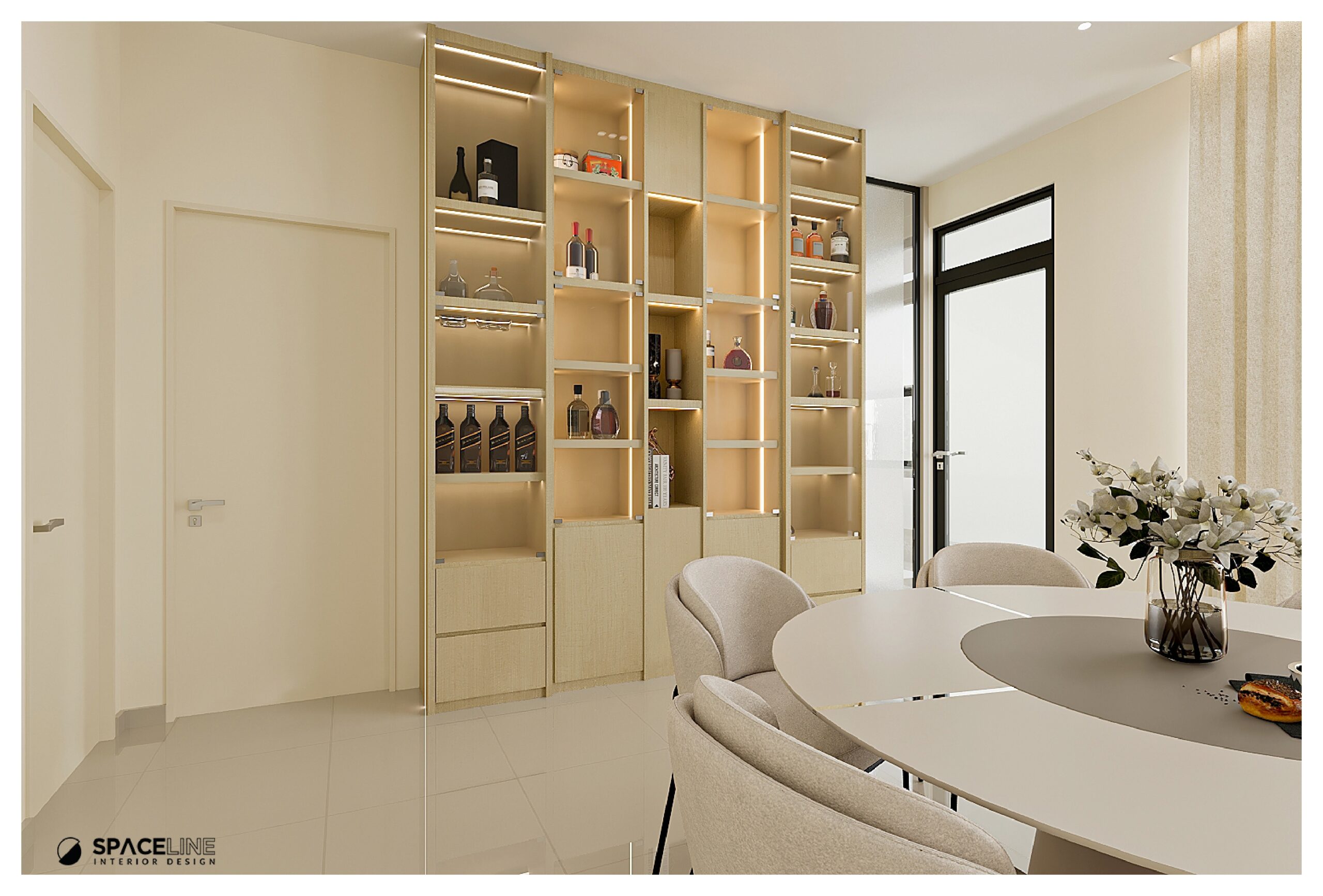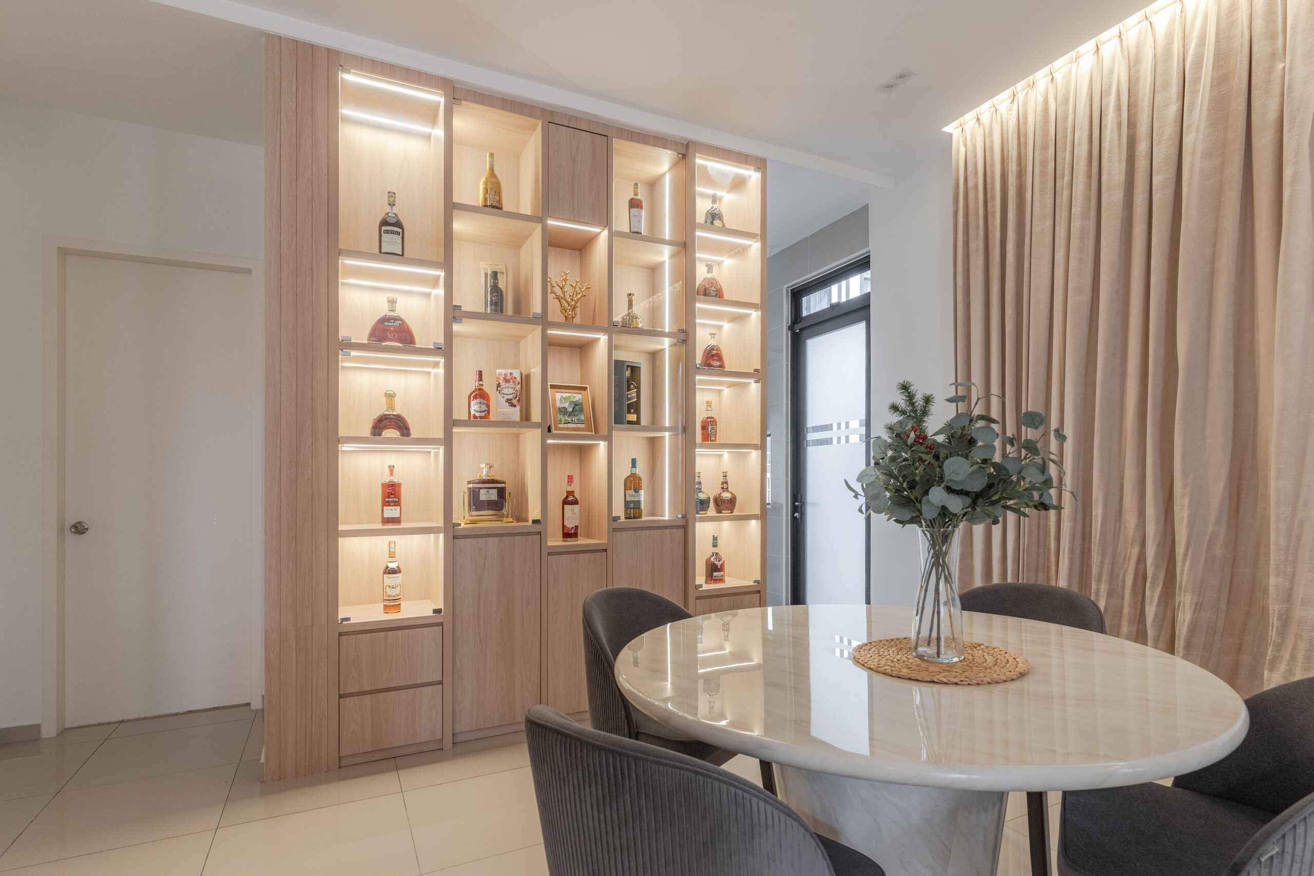The dining area is expertly optimized for space and aesthetics. A round dining table maximizes usable area, perfectly complementing the full-height wine display rack. This vertical display offers an illusion of increased ceiling height and airiness, with built-in LED strips illuminating the collection to enhance the visual appeal of the dining space.