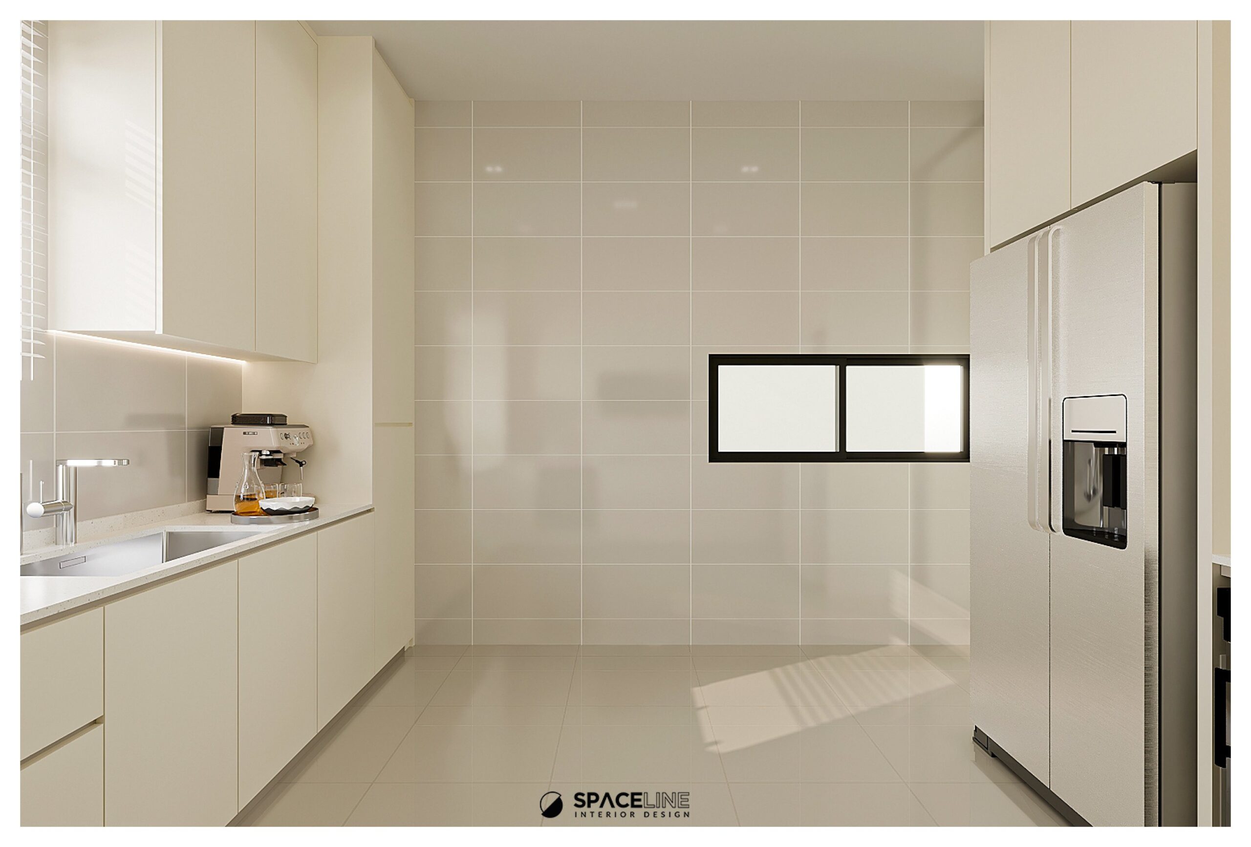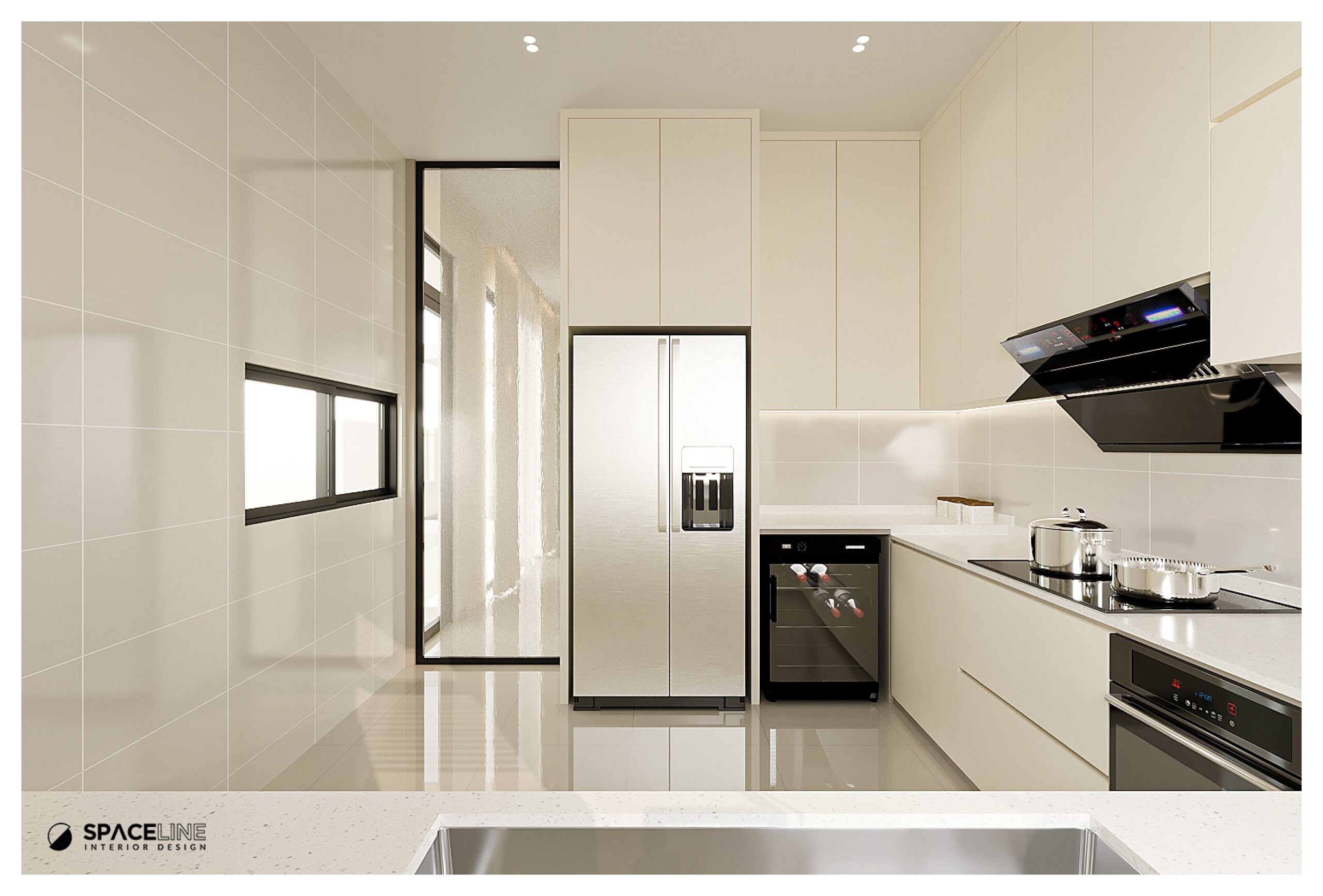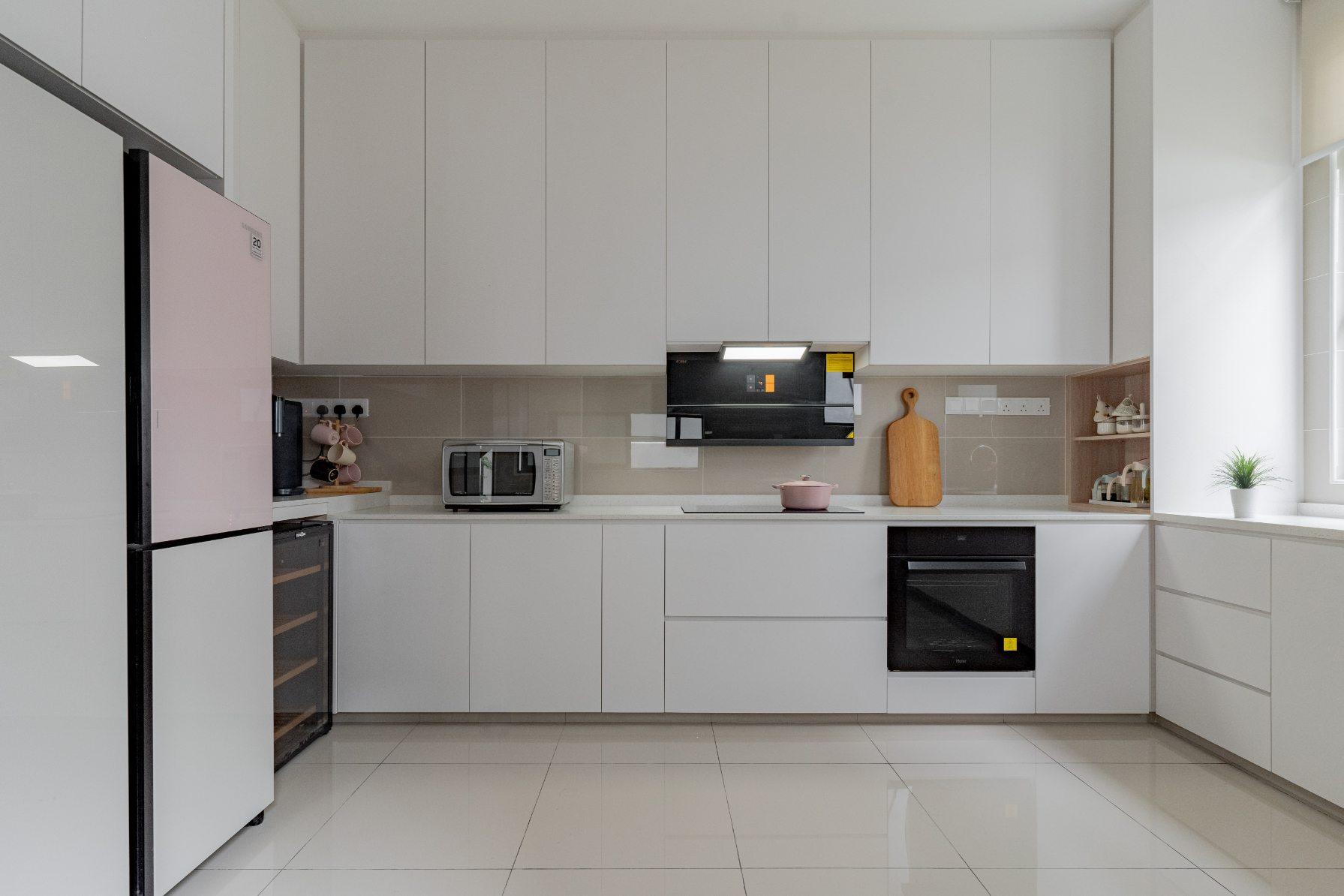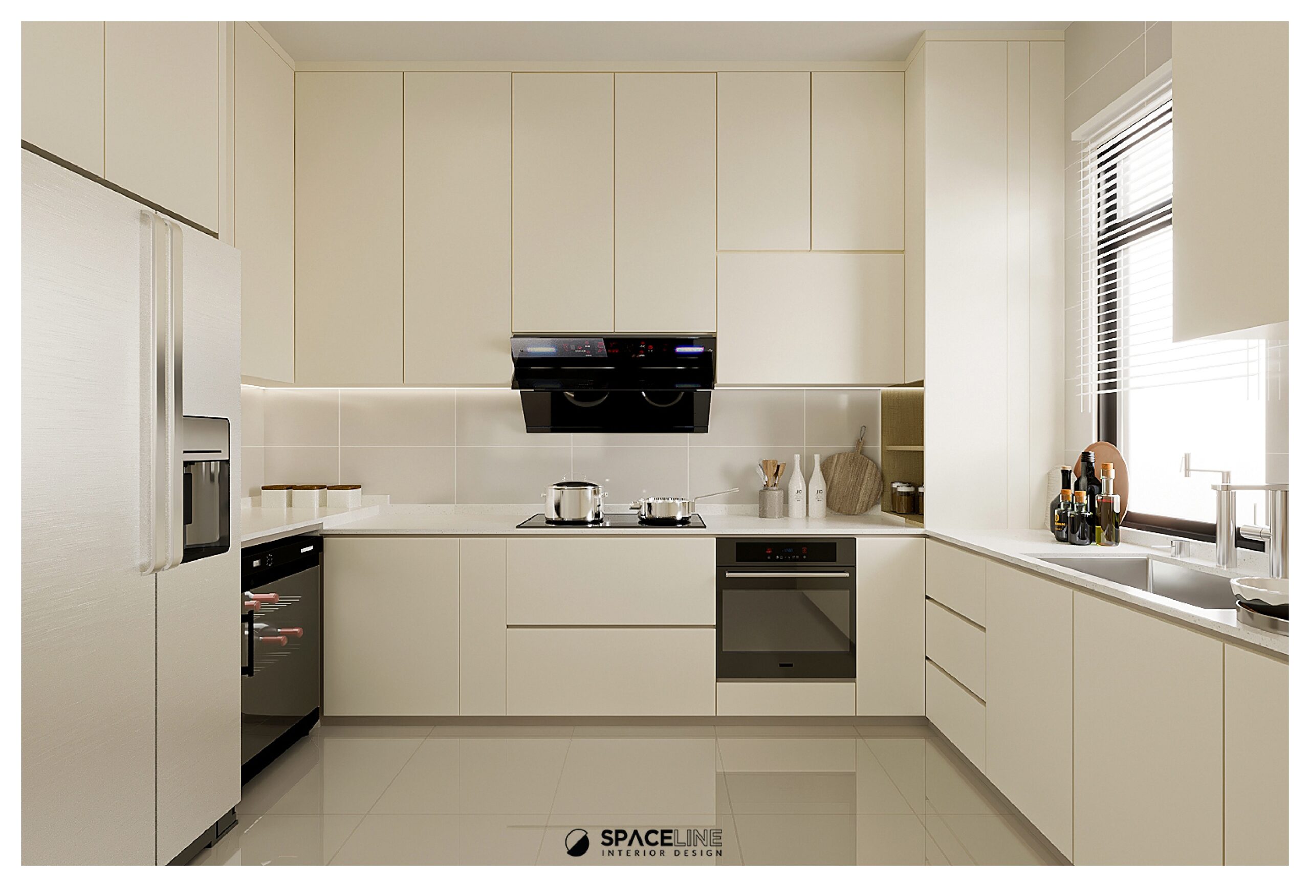 The kitchen is designed as a highly efficient and visually pleasing workspace. Light cream color is used as the main tone for the cabinetry, subtly highlighting the modern and minimalist look. The space is fully equipped with basic cooking tools, a mini wine chiller, and ample storage. A large window is essential here, providing excellent ventilation and naturally illuminating the space, which is crucial for efficient food preparation.