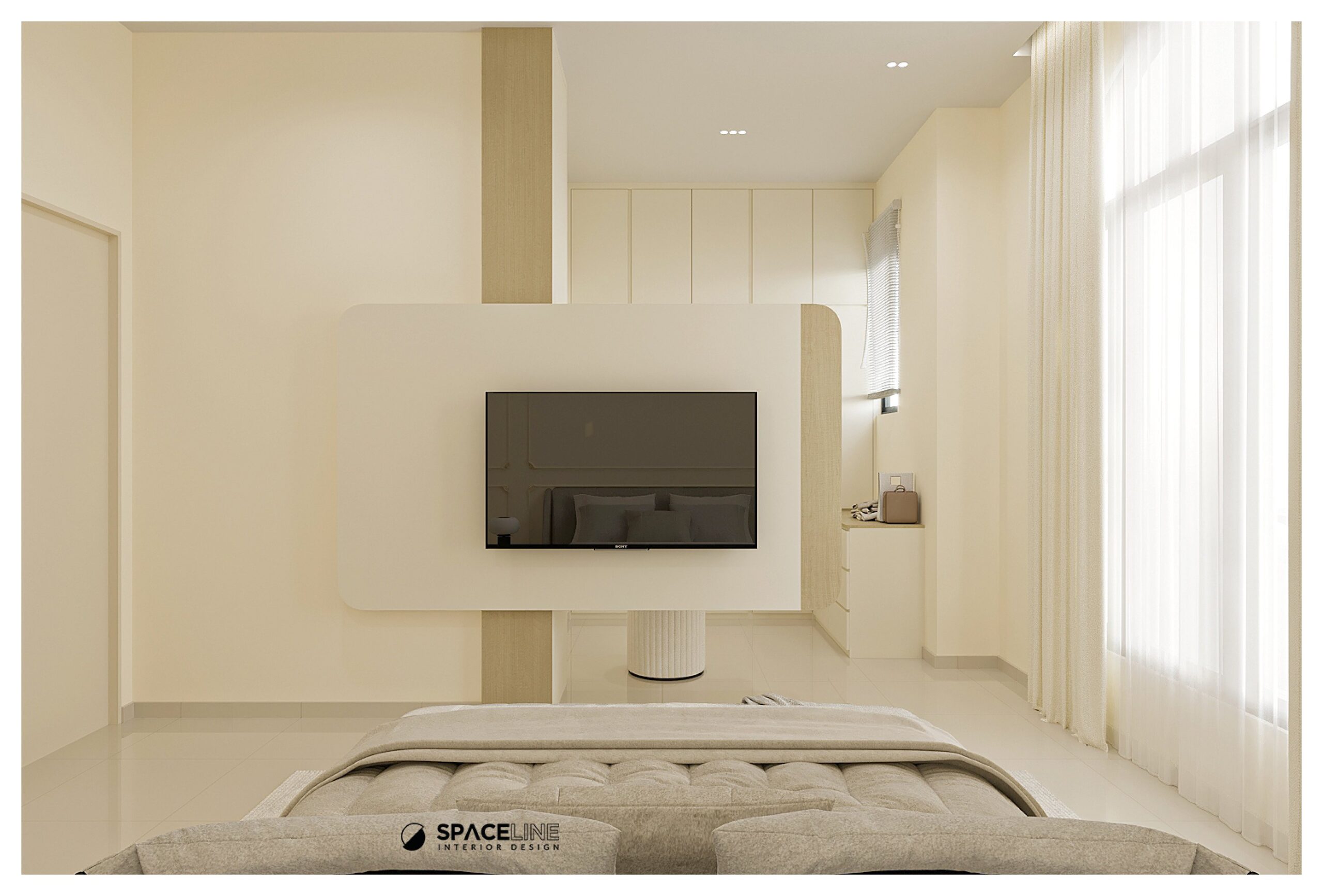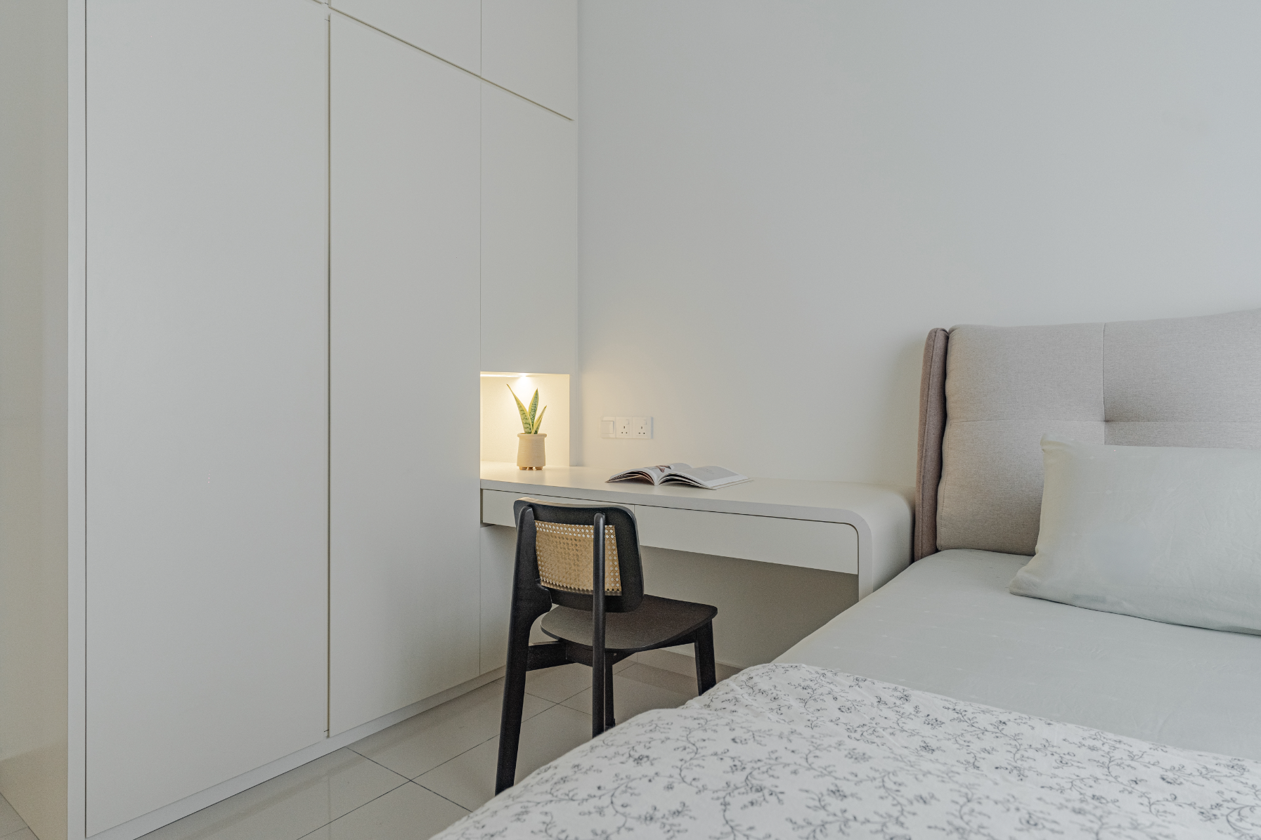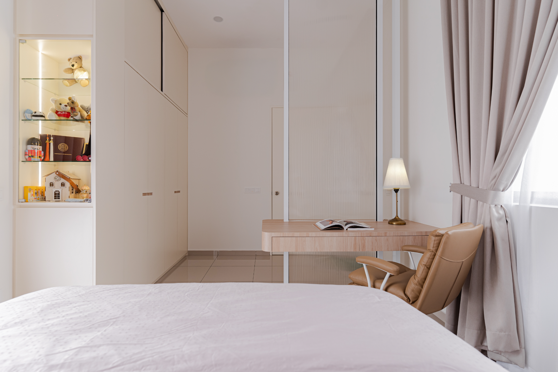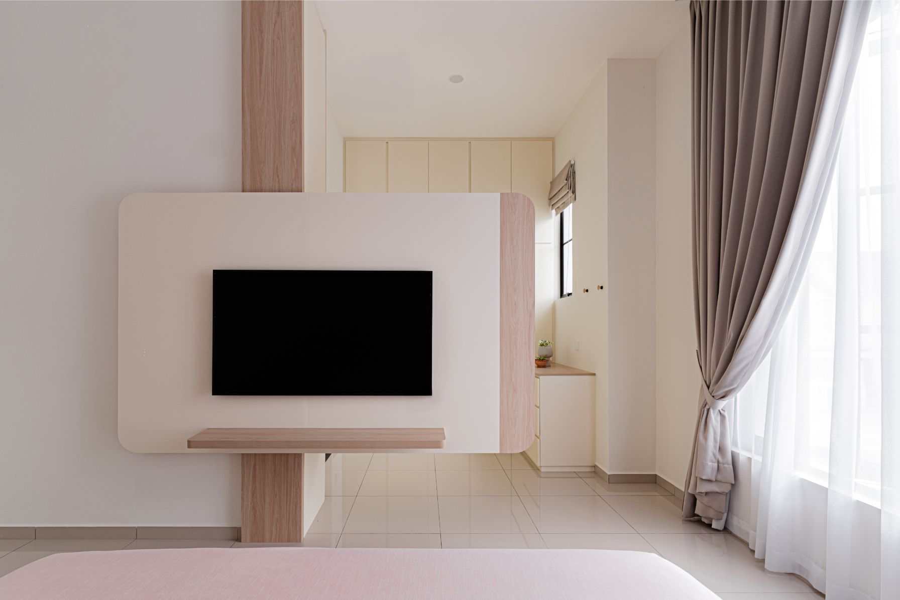 The master bedroom embodies minimal elements to define a space of calm and warmth. A key functional design is the attached TV panel to the existing wall, which cleverly acts as a multifunctional separator between the sleeping area, the wardrobe, and the bathroom. A full-height wardrobe, side cabinet, and dresser are strategically placed within a triangular anchor point from the bathroom, ensuring natural circulation and preventing overcrowding. A corner shelf at the dresser area fits perfectly, supporting practicality while maintaining the room’s spacious feel.