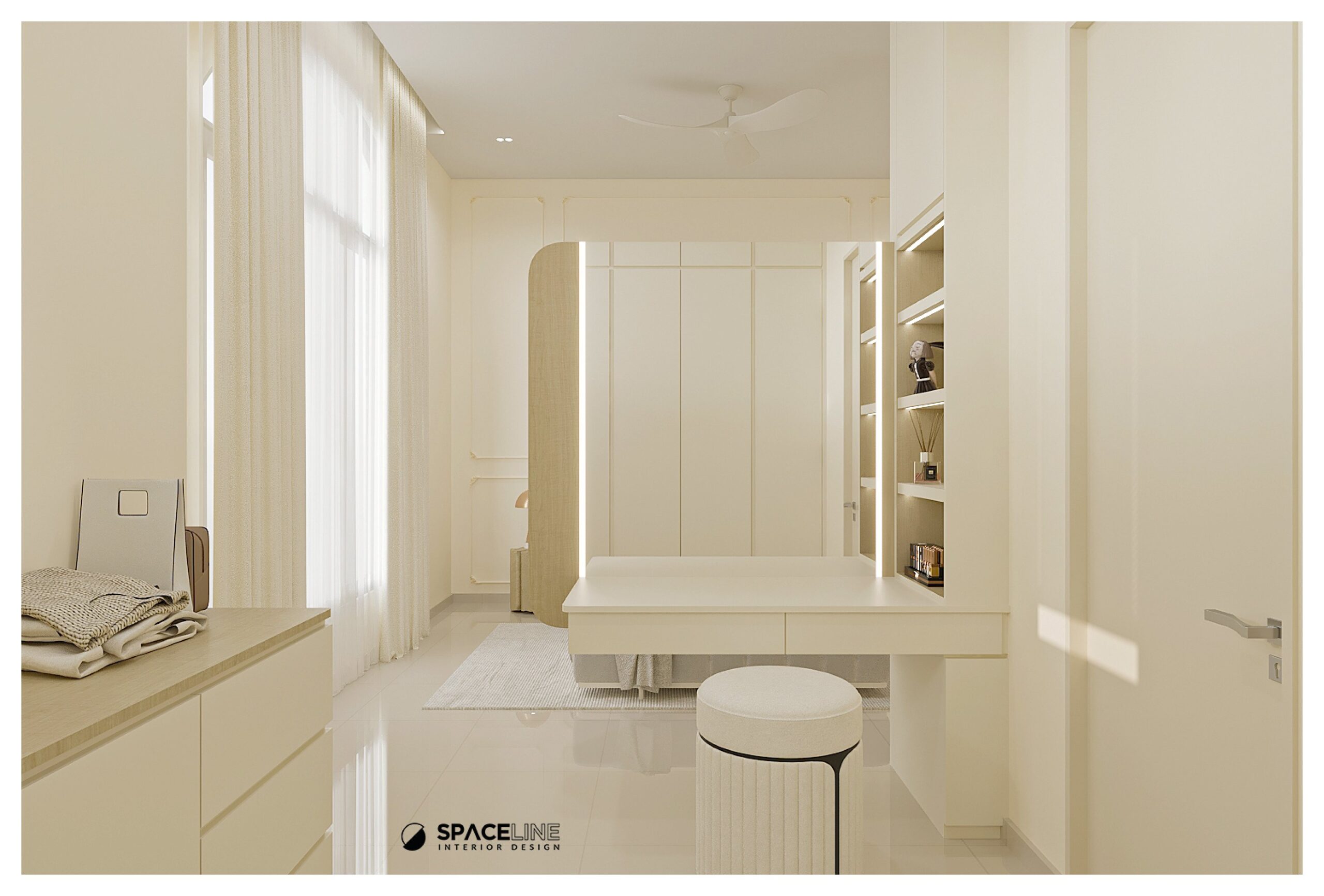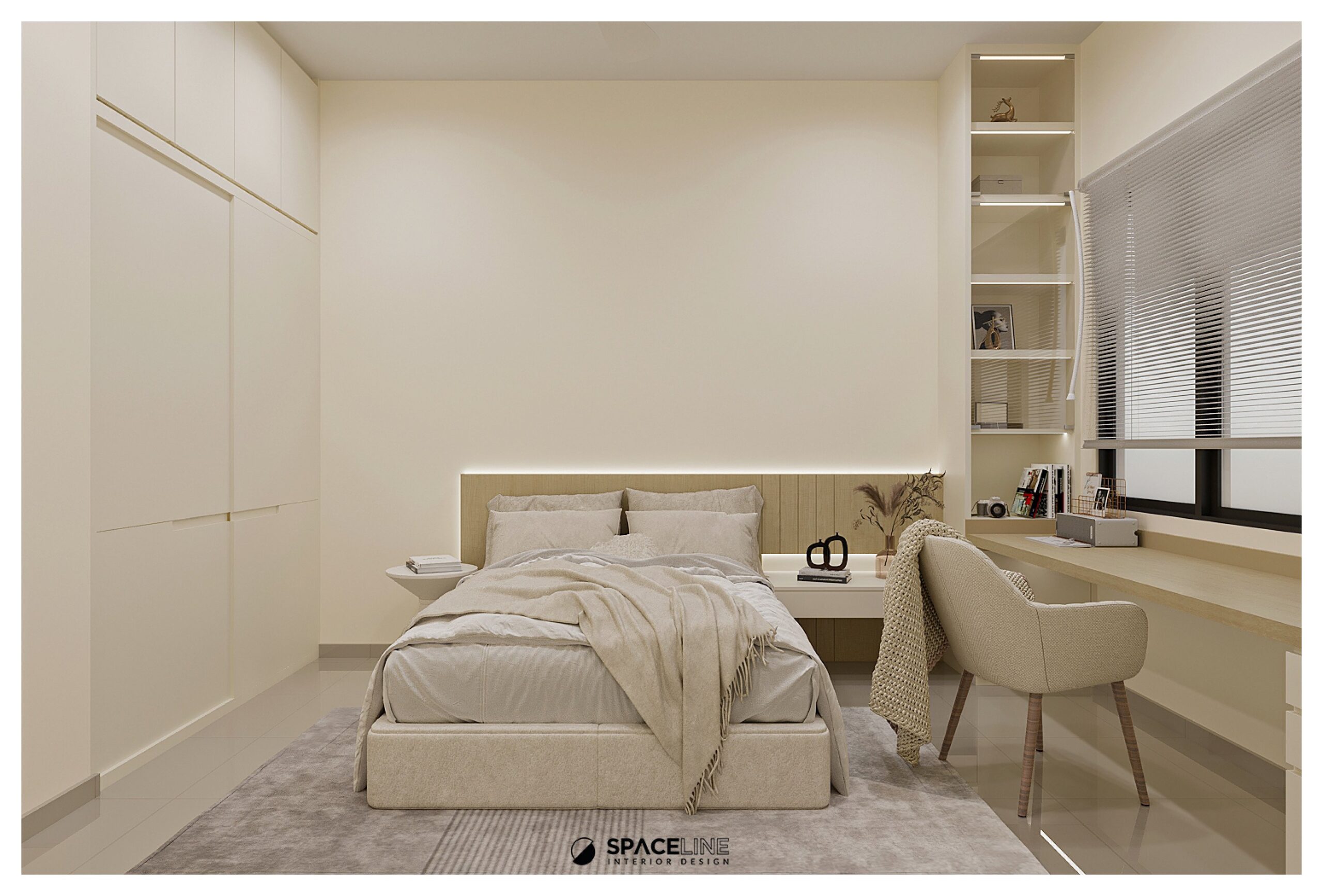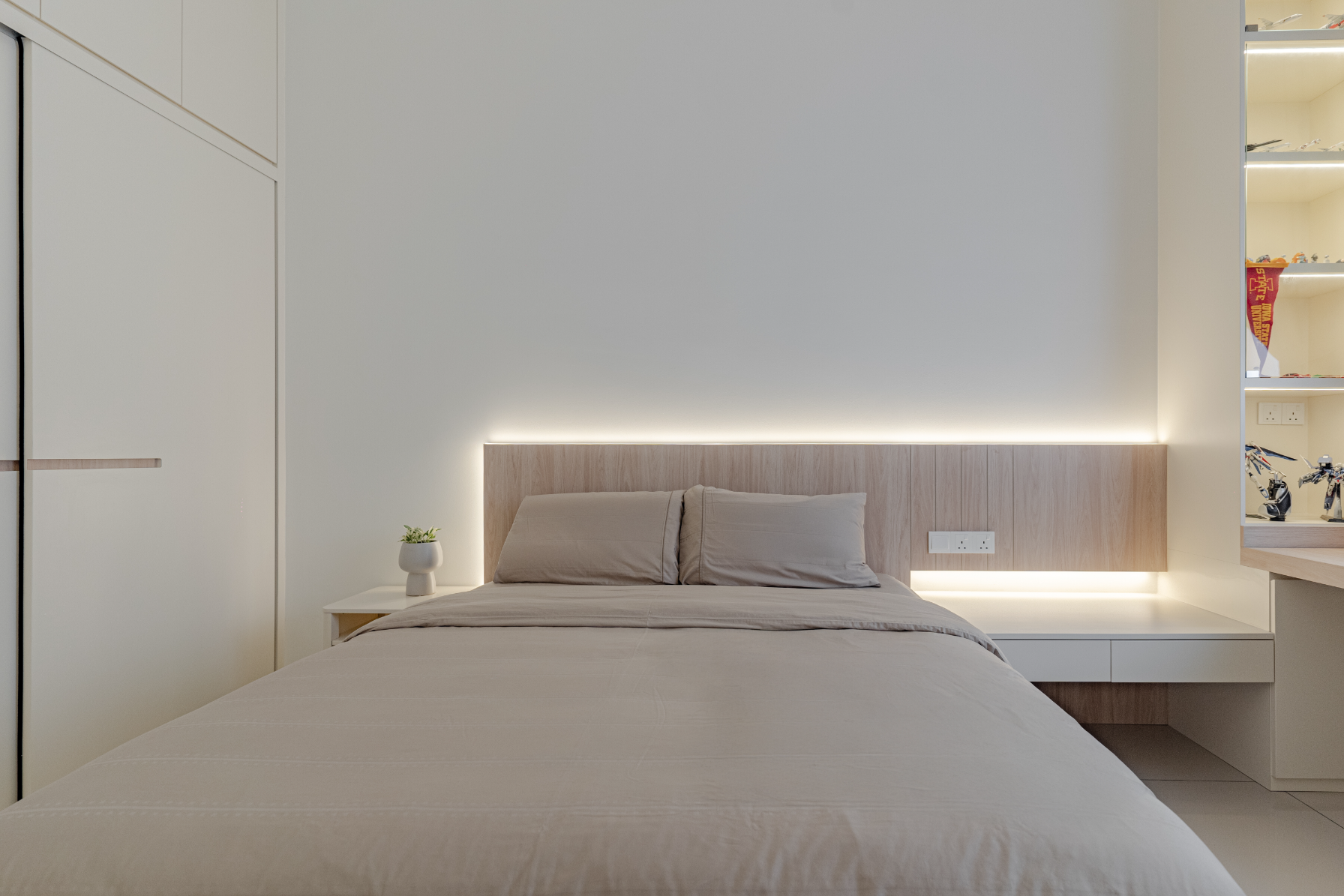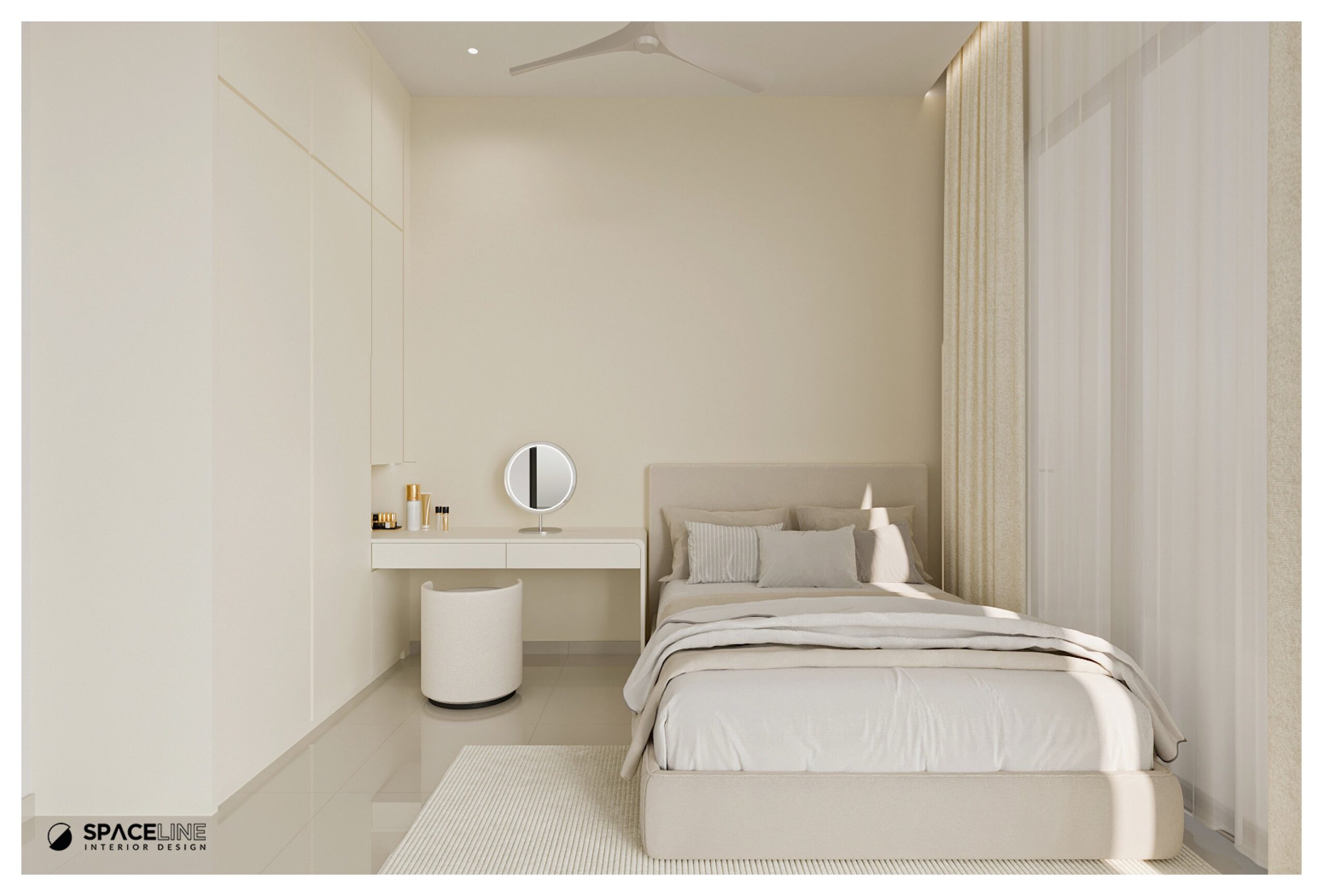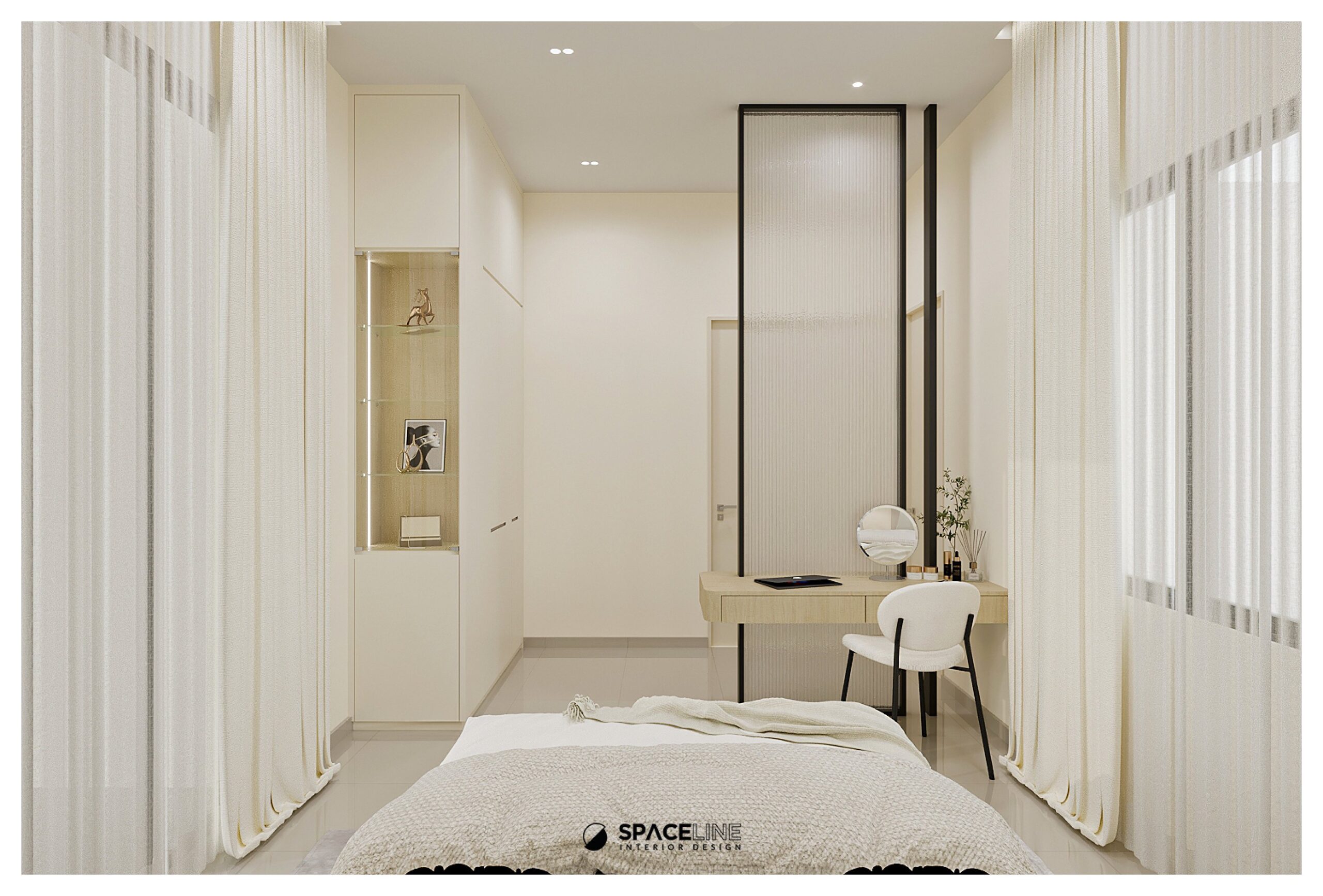 The master bedroom embodies minimal elements to define a space of calm and warmth. A key functional design is the attached TV panel to the existing wall, which cleverly acts as a multifunctional separator between the sleeping area, the wardrobe, and the bathroom. A full-height wardrobe, side cabinet, and dresser are strategically placed within a triangular anchor point from the bathroom, ensuring natural circulation and preventing overcrowding. A corner shelf at the dresser area fits perfectly, supporting practicality while maintaining the room’s spacious feel.