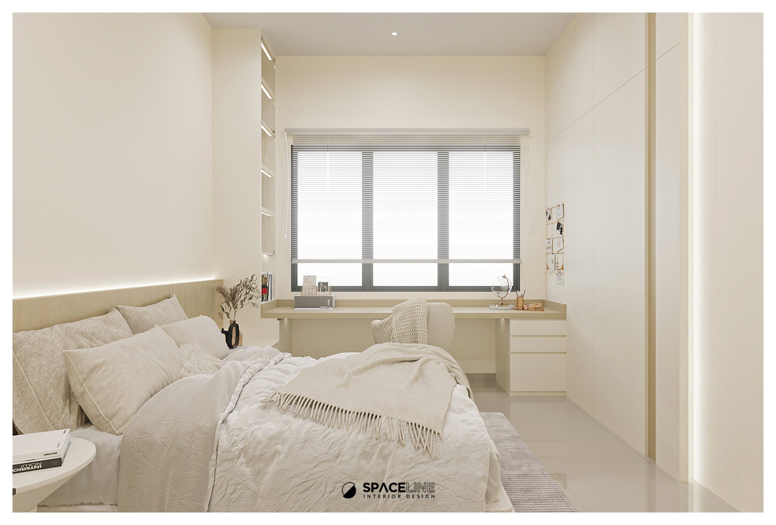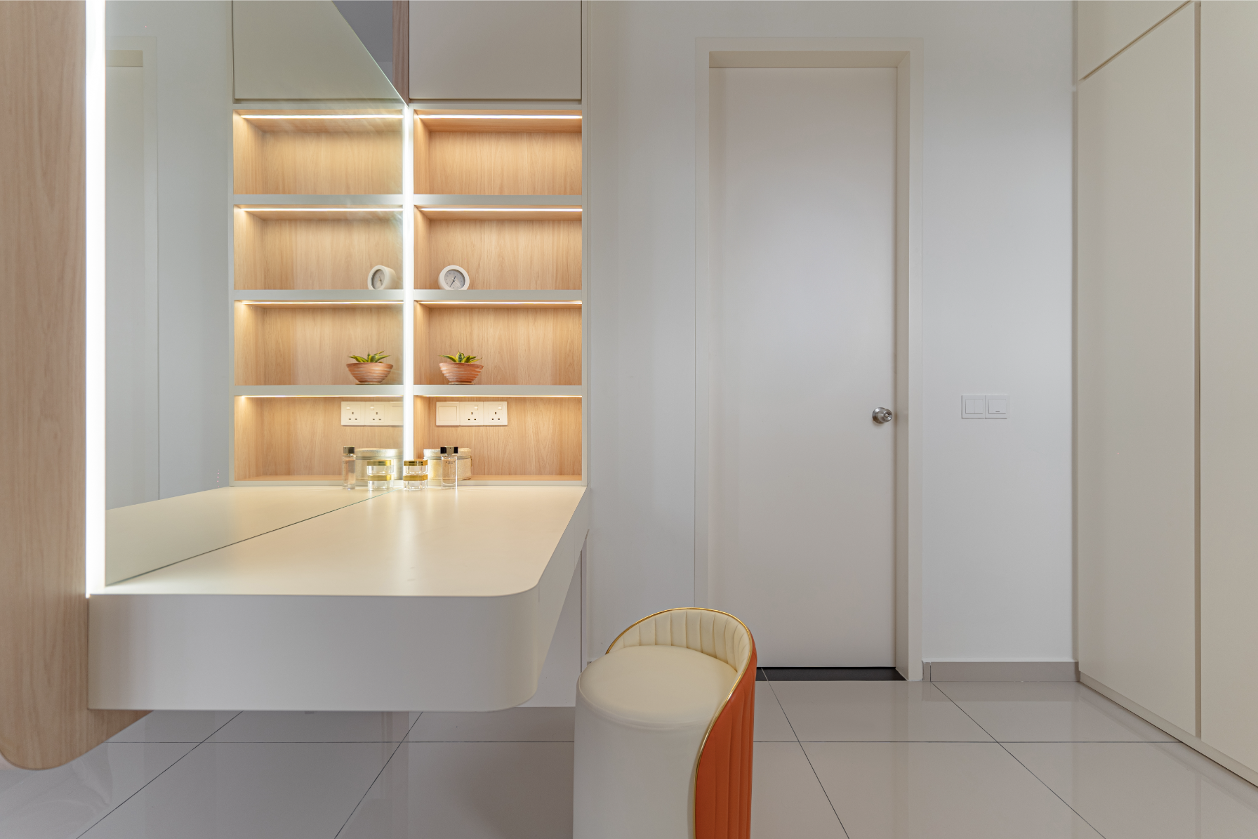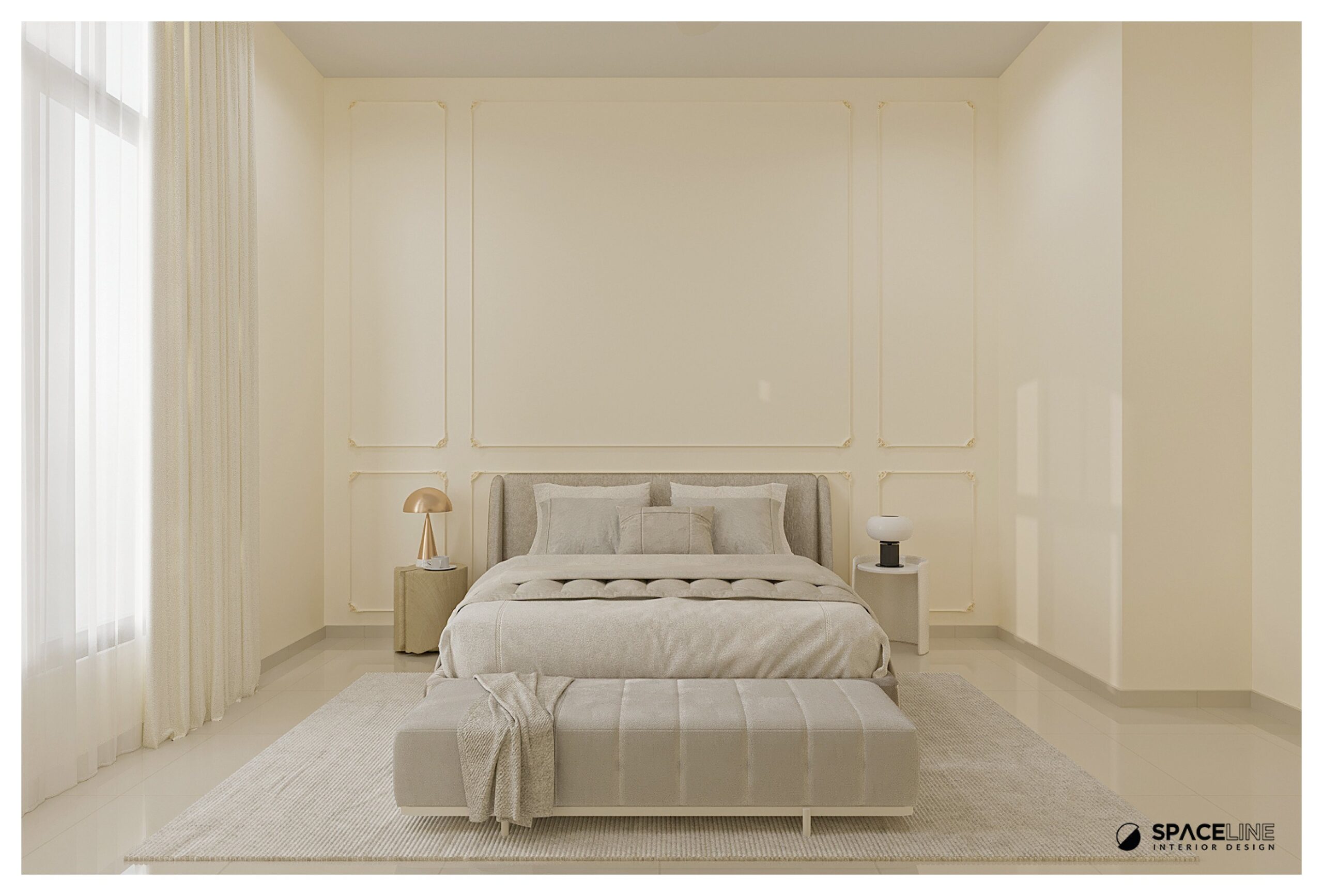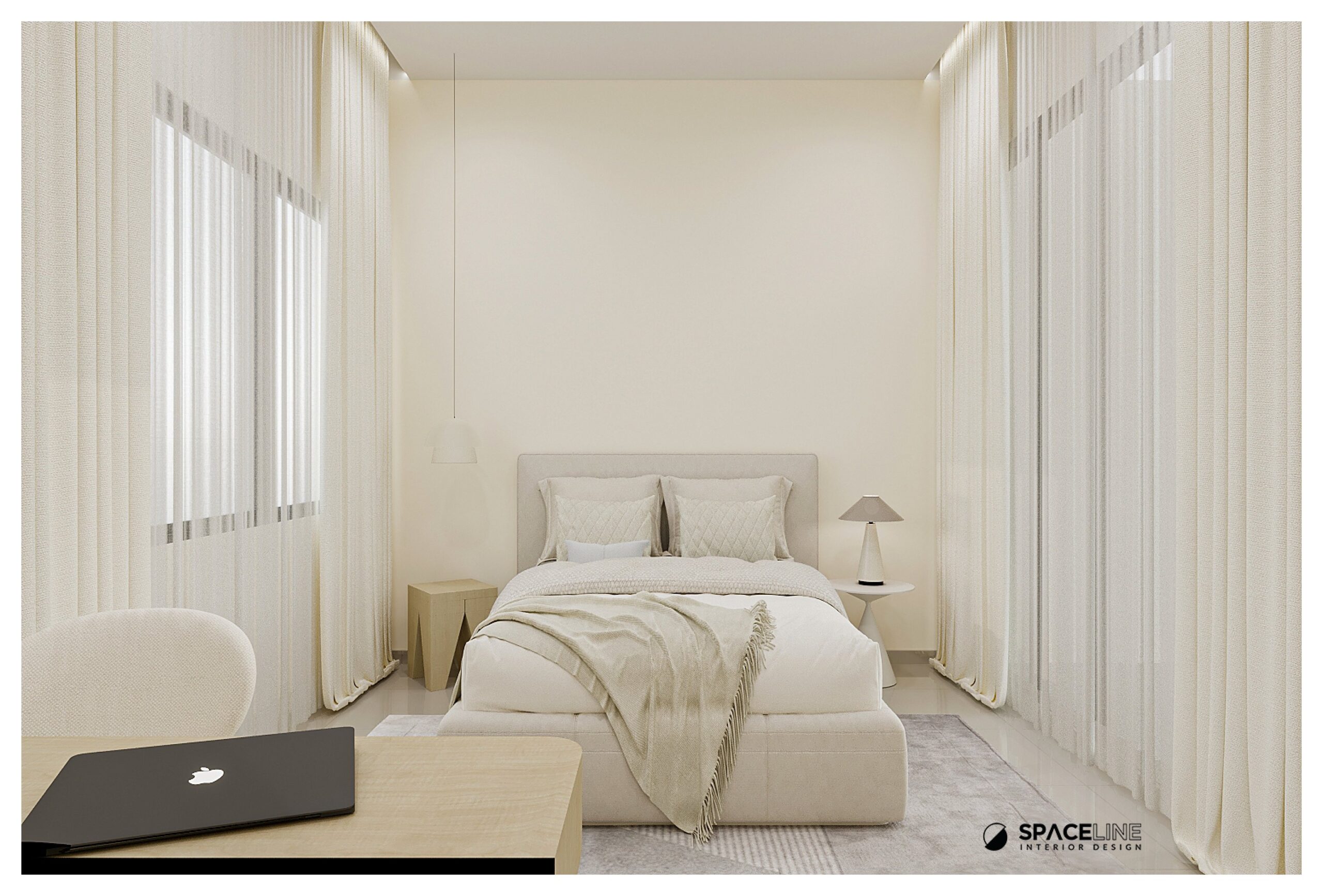The master bedroom embodies minimal elements to define a space of calm and warmth. A key functional design is the attached TV panel to the existing wall, which cleverly acts as a multifunctional separator between the sleeping area, the wardrobe, and the bathroom. A full-height wardrobe, side cabinet, and dresser are strategically placed within a triangular anchor point from the bathroom, ensuring natural circulation and preventing overcrowding. A corner shelf at the dresser area fits perfectly, supporting practicality while maintaining the room’s spacious feel.