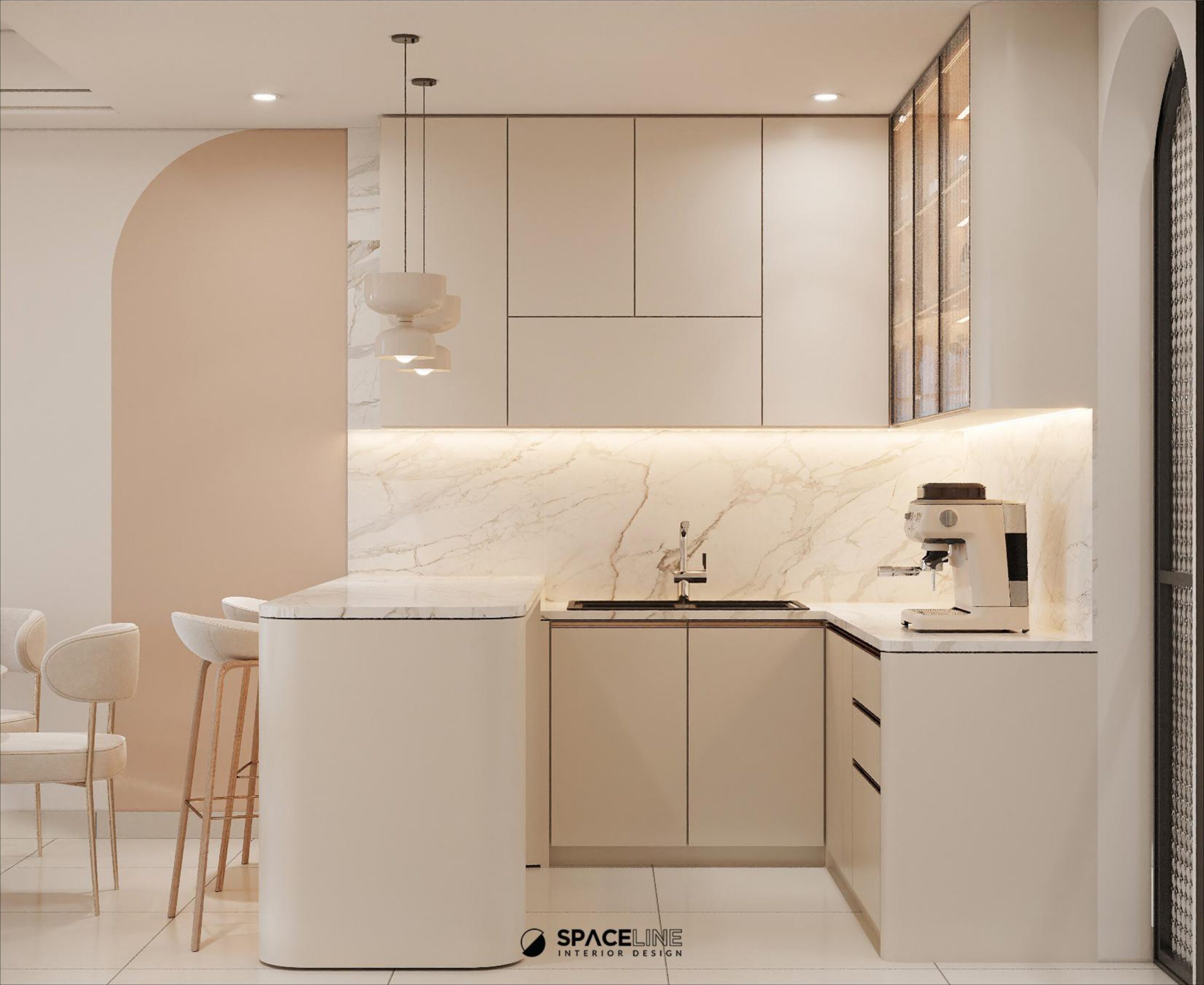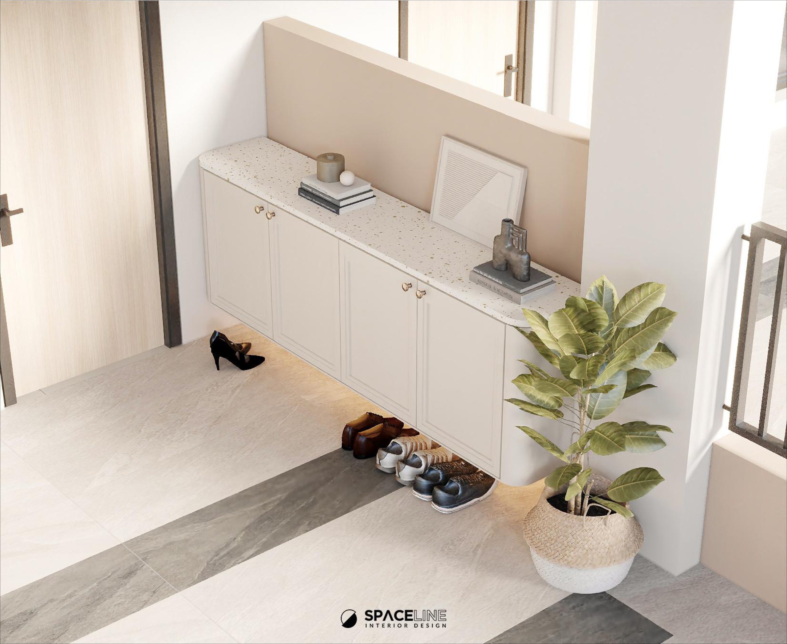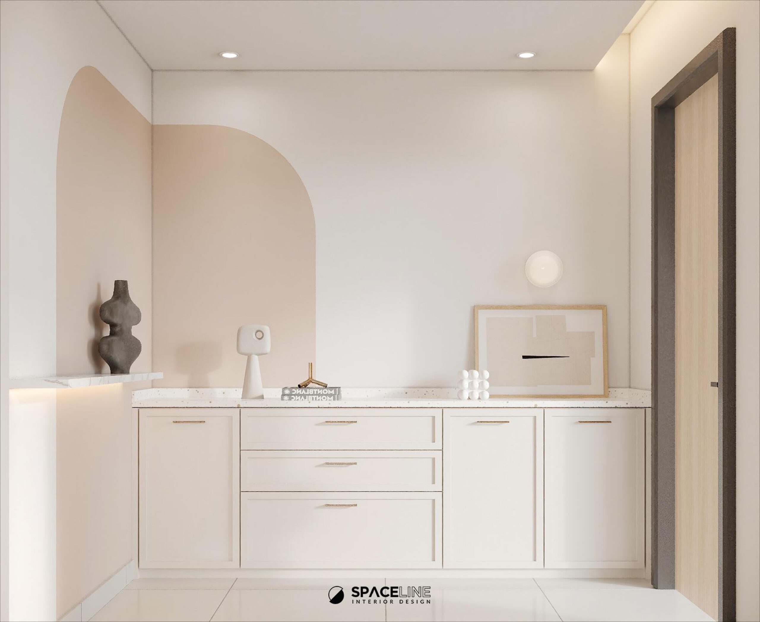 The entrance immediately greets visitors with a soft atmosphere, featuring a hanging minimal shoe cabinet integrated with LED strips underneath to enhance cleanliness and organization. The continuation of this storage is framed by a semi-arch wall paint feature, using off-white and soft brown cream tones to create a welcoming and inviting experience.