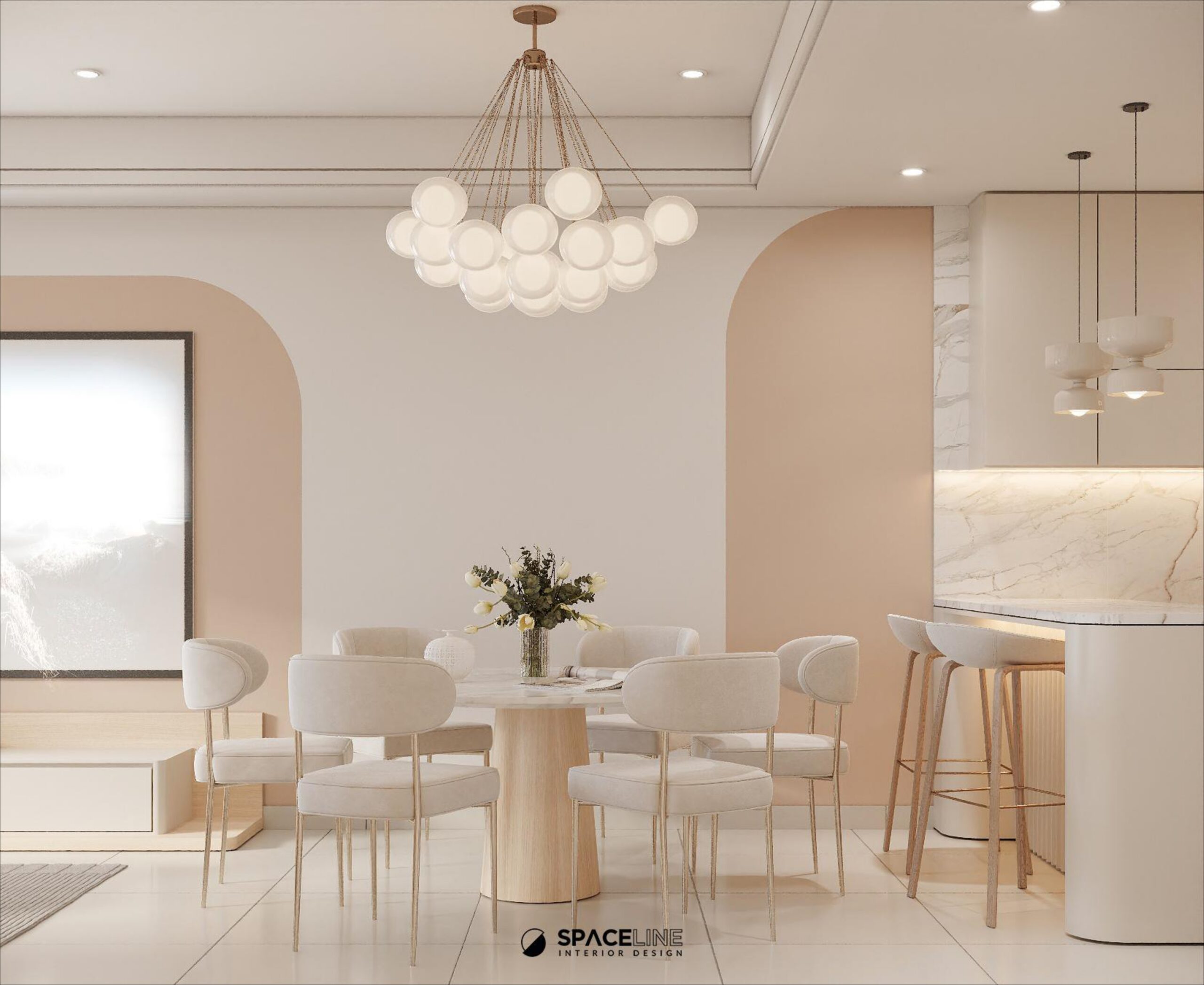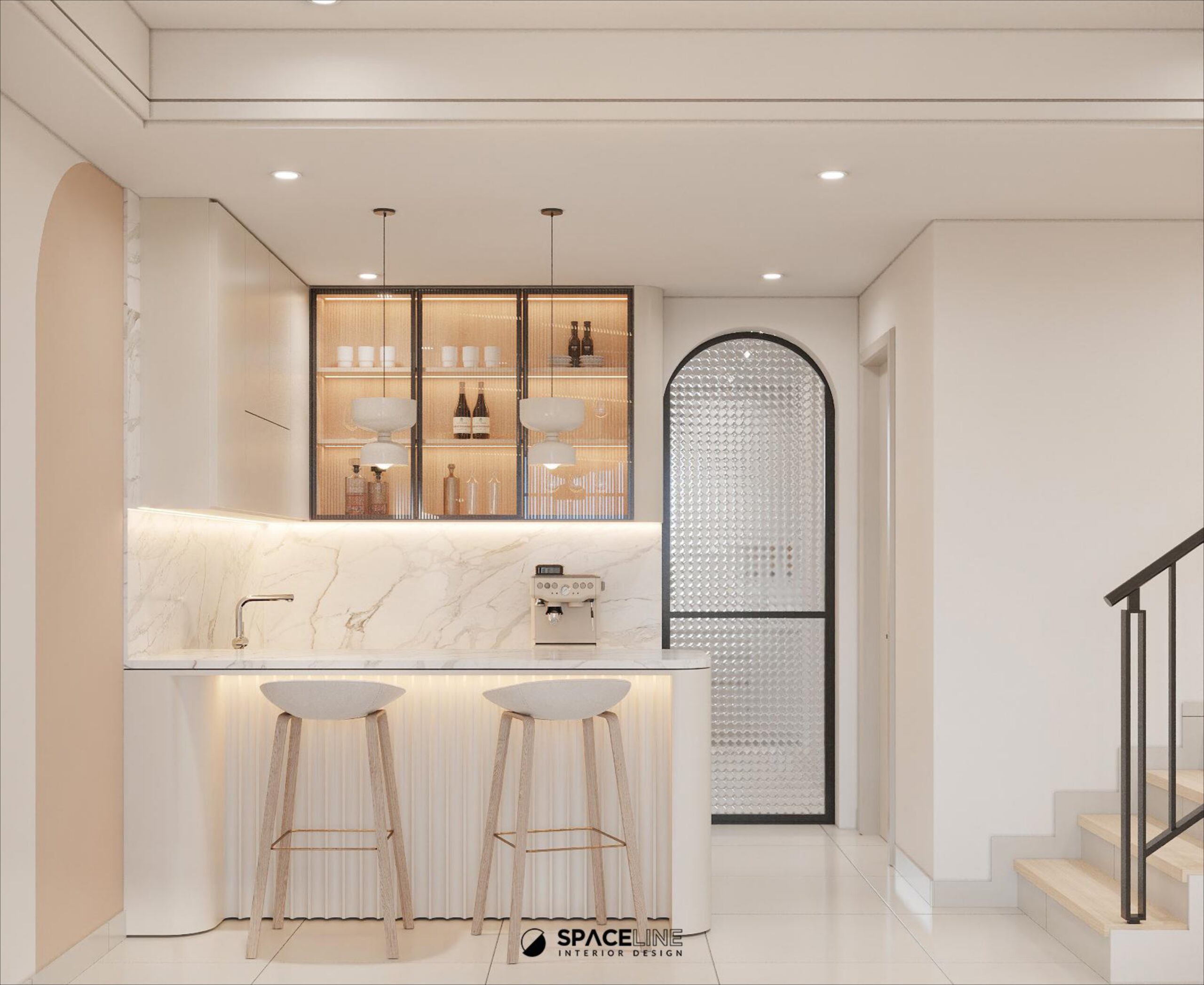 In the dry kitchen, white marble dominates the backsplash and tabletop, integrating an elegant mood. LED strips are integrated to ensure a shadow-free prep area, and glass door shelves are softly lit to enhance display aesthetics. The bottom and top cabinets in a soft brown color promote a bright ambiance and reduce visual weight. A bar counter with a dedicated leg space is provided for comfort and friendly daily usage.