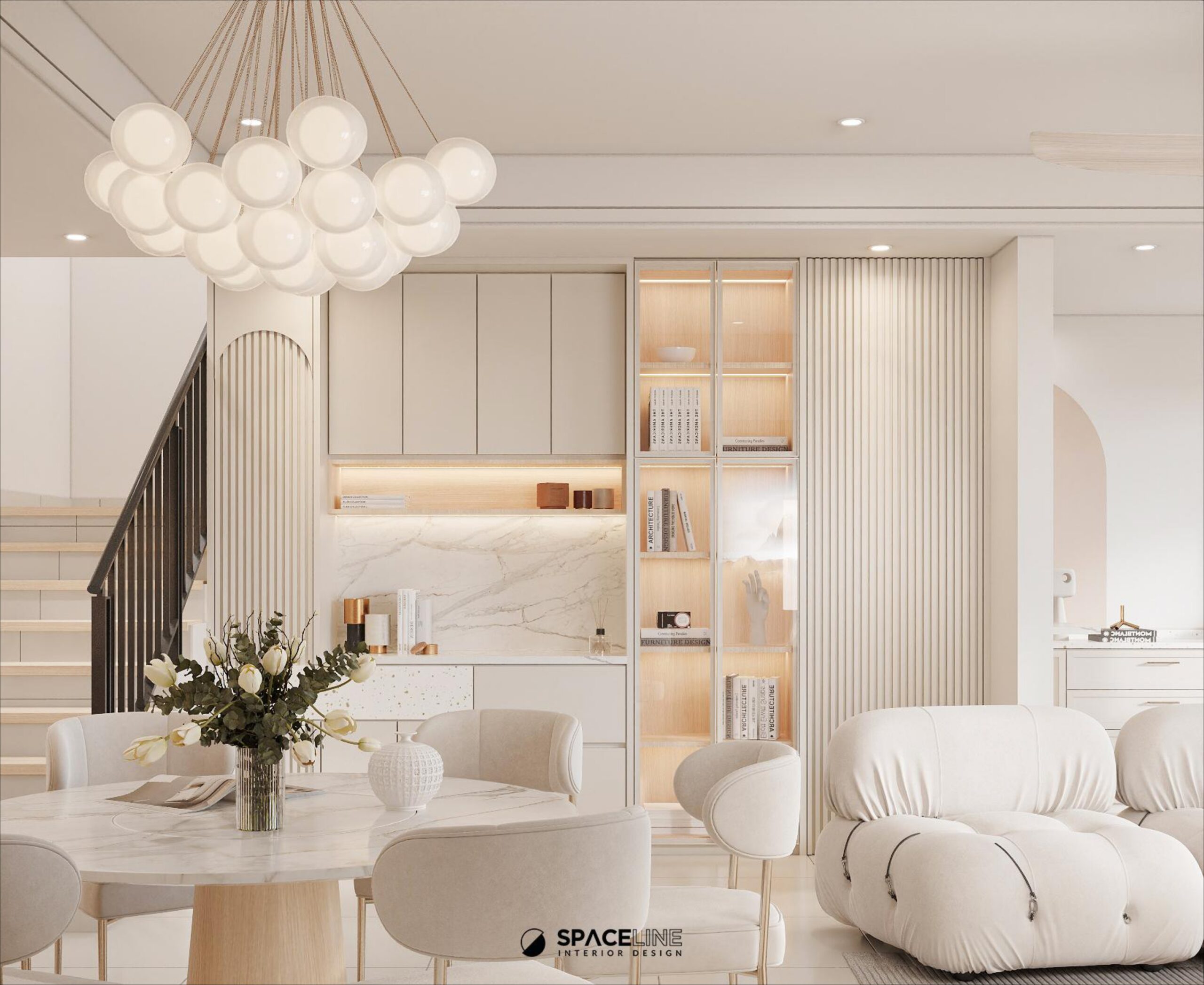 The circle dining table acts as a central focal point between the living and dry kitchen. The gold legs and soft beige fabric seater blend elegantly with the dramatic pendant light. Opposite the dining table is a display sanctuary: an under-stairs display storage and a hidden door to the store room. This display cabinet features open and closed storage, with LED strips along the shelving to create a captivating ‘gallery-look’ vibe. The hidden door is seamlessly disguised by a fluted panel in a soft solid color, providing harmonious material contrast.