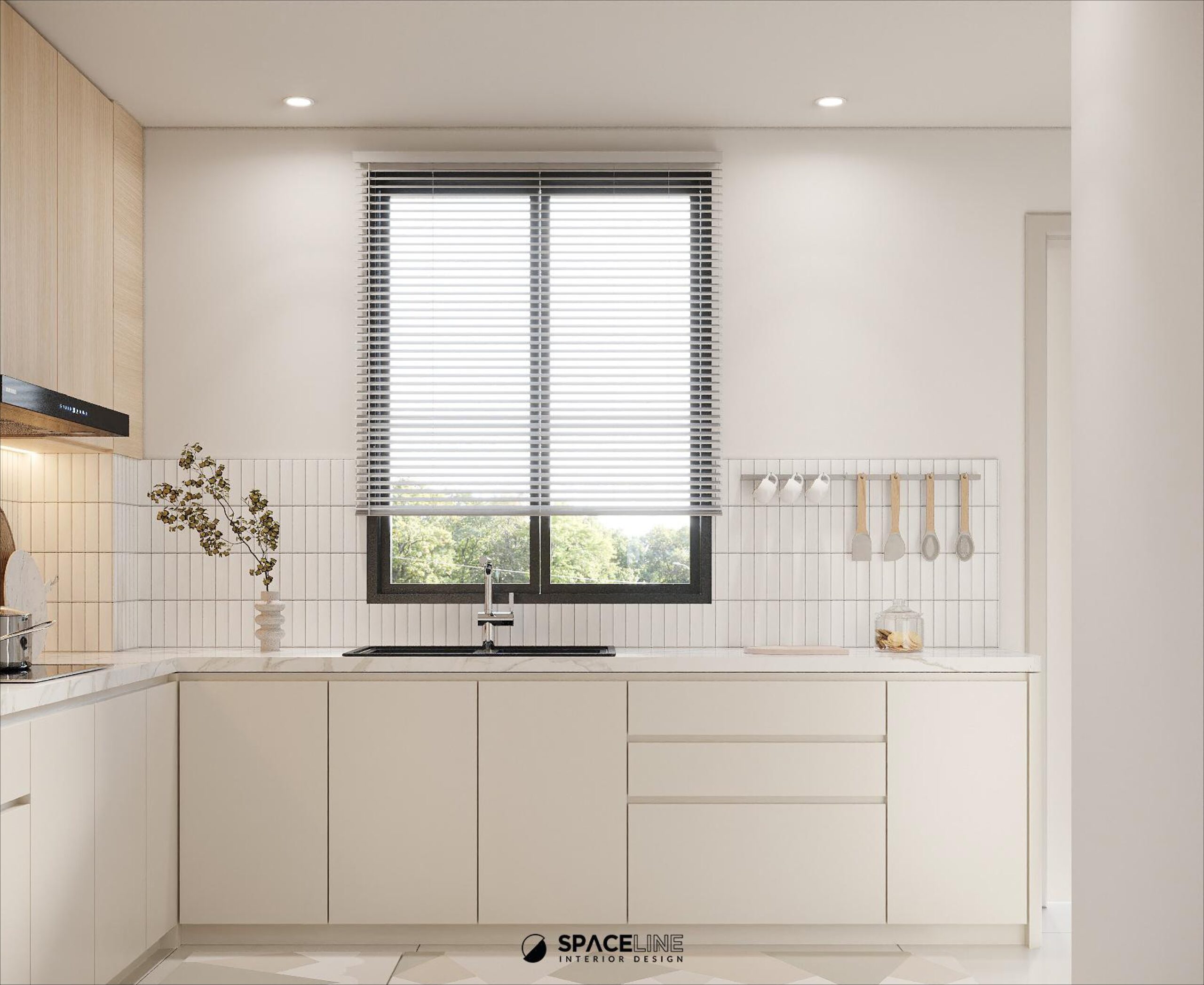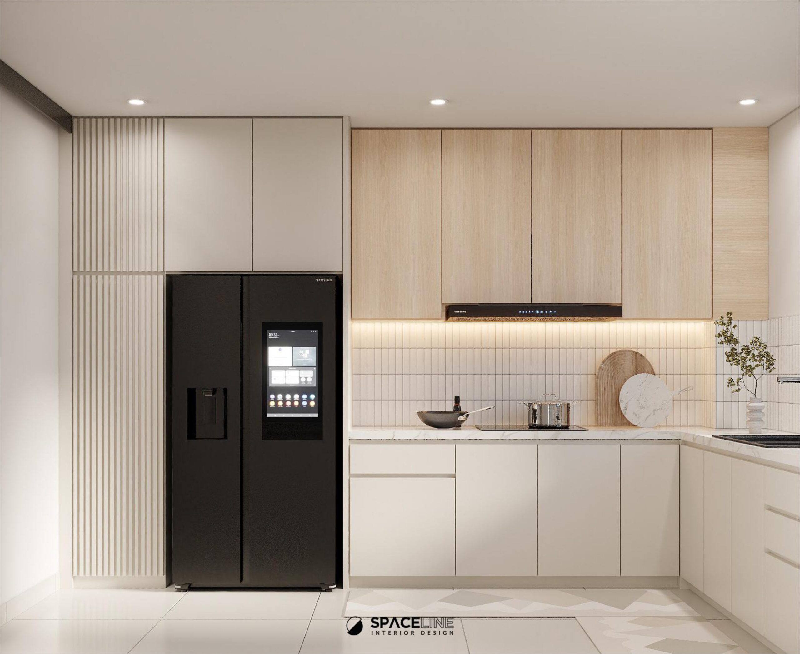 The calm and inviting color scheme is maintained in the wet kitchen. A key design detail is the fluted cabinet door on the tall unit fridge, which creates rhythm and a subtle contrast to the space. The durable tabletop is elegantly combined with white subway tiles for the backsplash, enhancing the visual experience. The placement of the sink near the large window is optimized to provide good air ventilation and natural daylight.