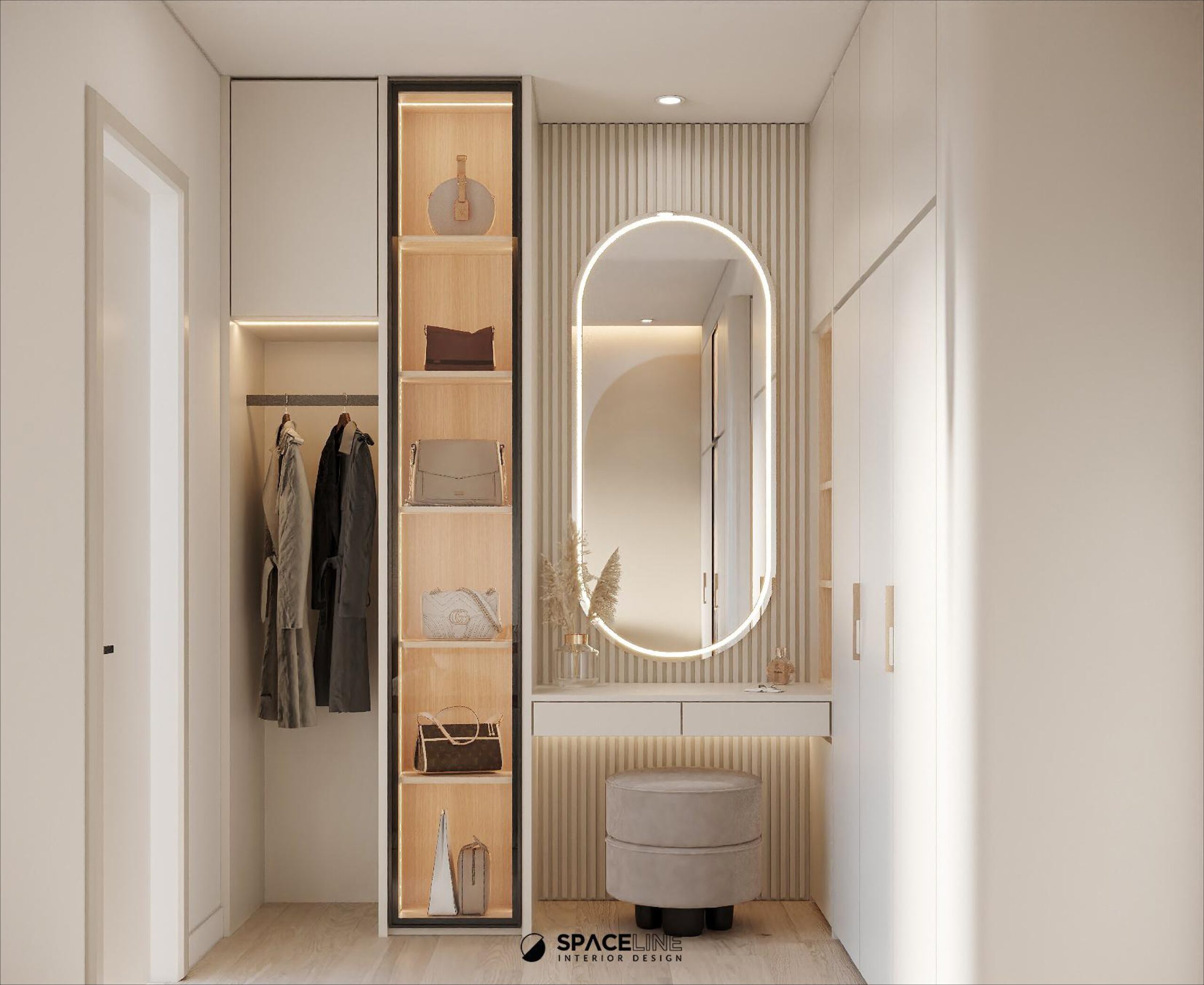 Moving to the master bedroom, the semi-arch wall paint motif is reapplied to the bedhead as a sophisticated feature wall. A beige cream bed maintains the minimal and airy intention. The dressing area is a dedicated personal retreat, featuring a floating vanity table with hand-less drawers for clean lines. A modern round bench in soft velvet fabric adds a touch of luxury. A tall, open shelving unit with backlighting improves the visual presentation of accessories. The highlight is the backlit oval mirror, which creates a halo effect and offers a spa-like atmosphere.