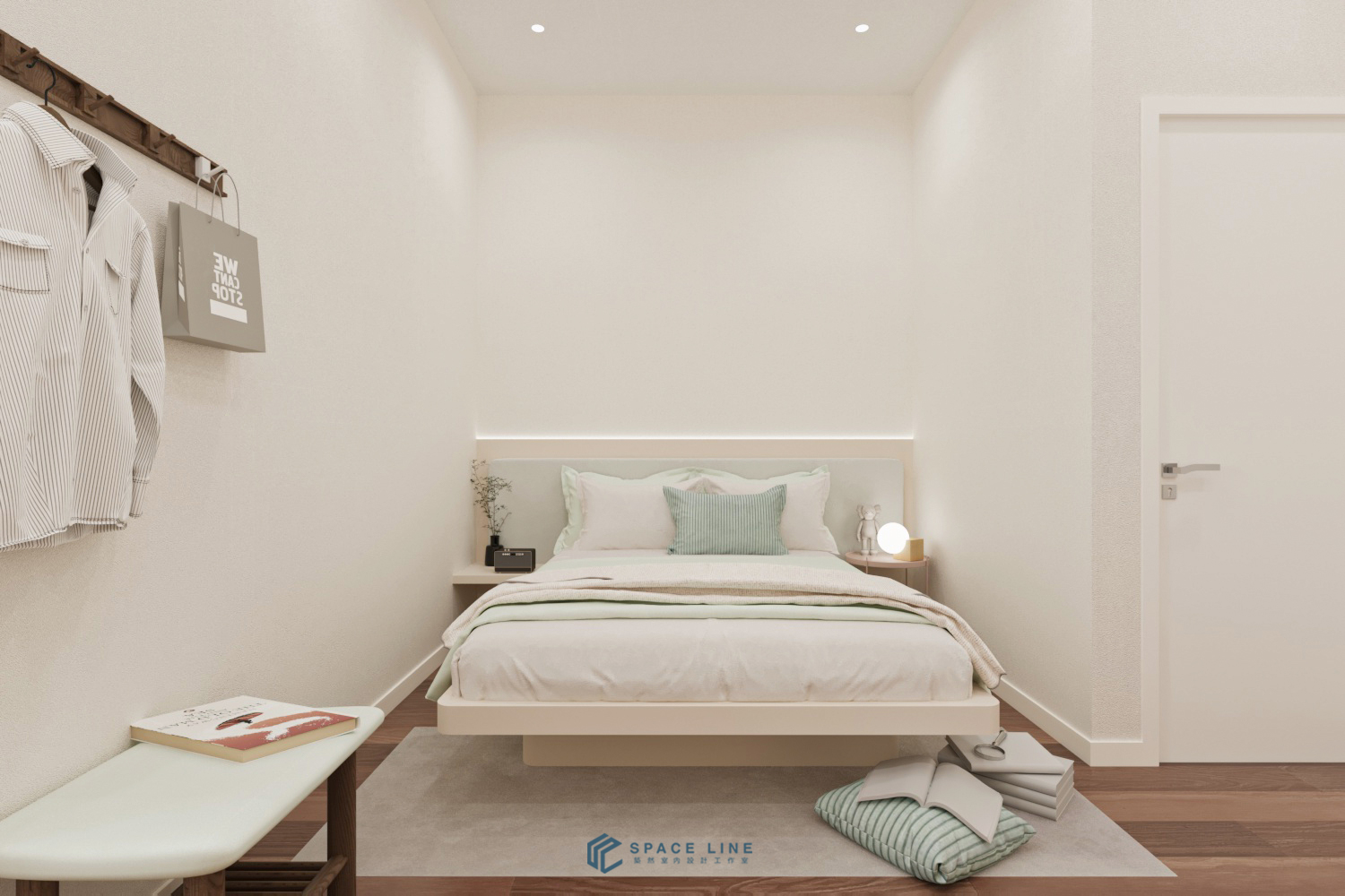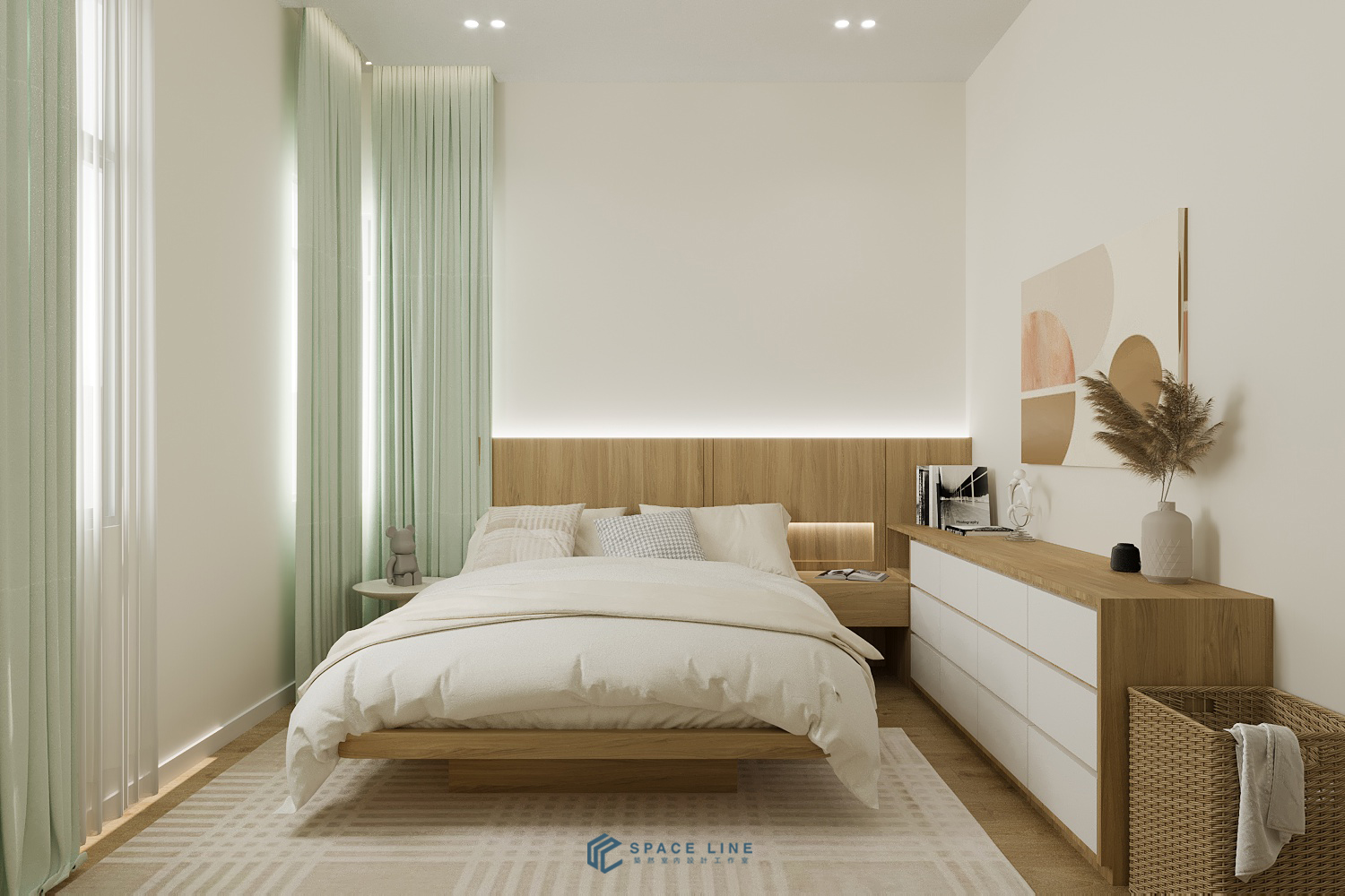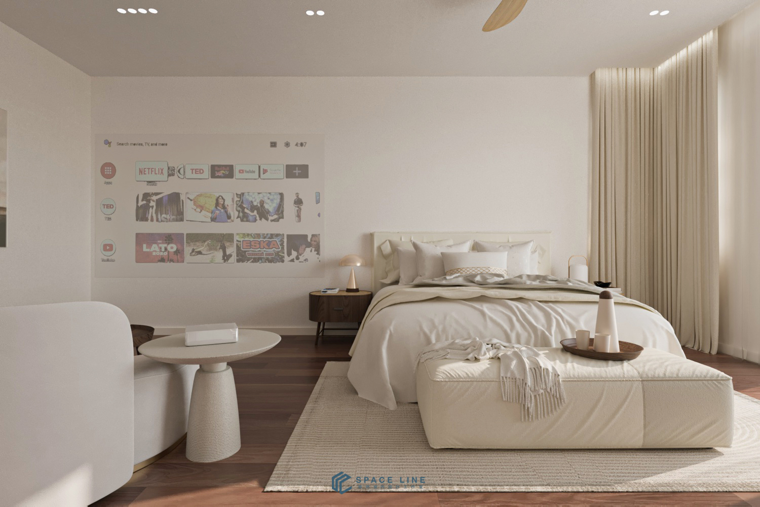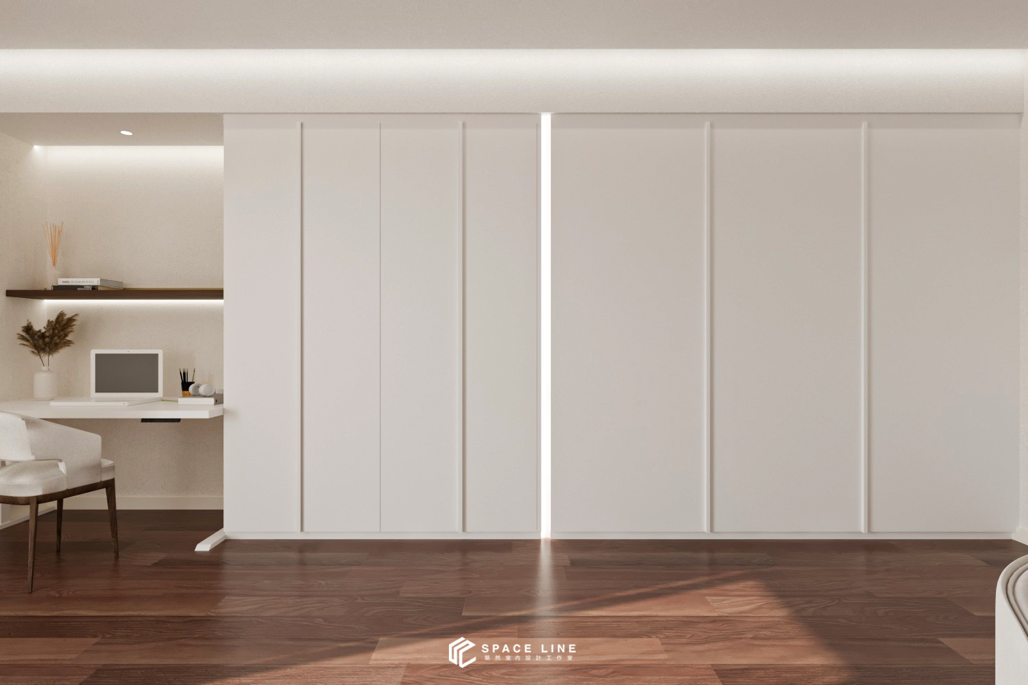 Finally, the master bedroom’s feature wall is the centerpiece of the walk-in wardrobe area. Its design is a study in simplicity and texture, proving that a simple aesthetic can be incredibly rich and layered. The subtle details are what make this space truly unique.