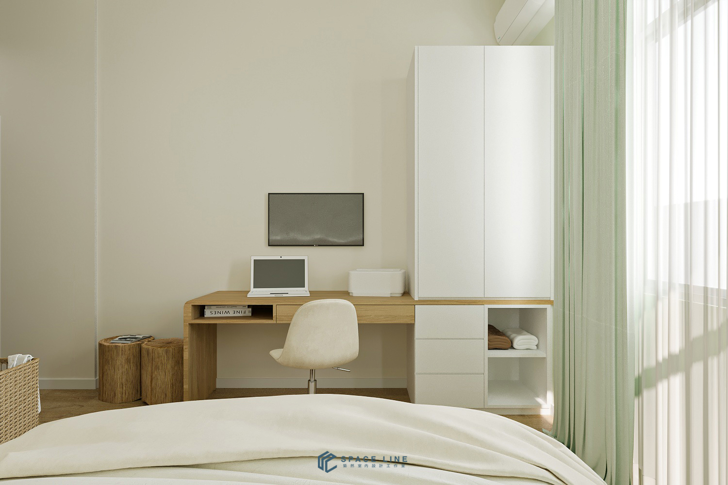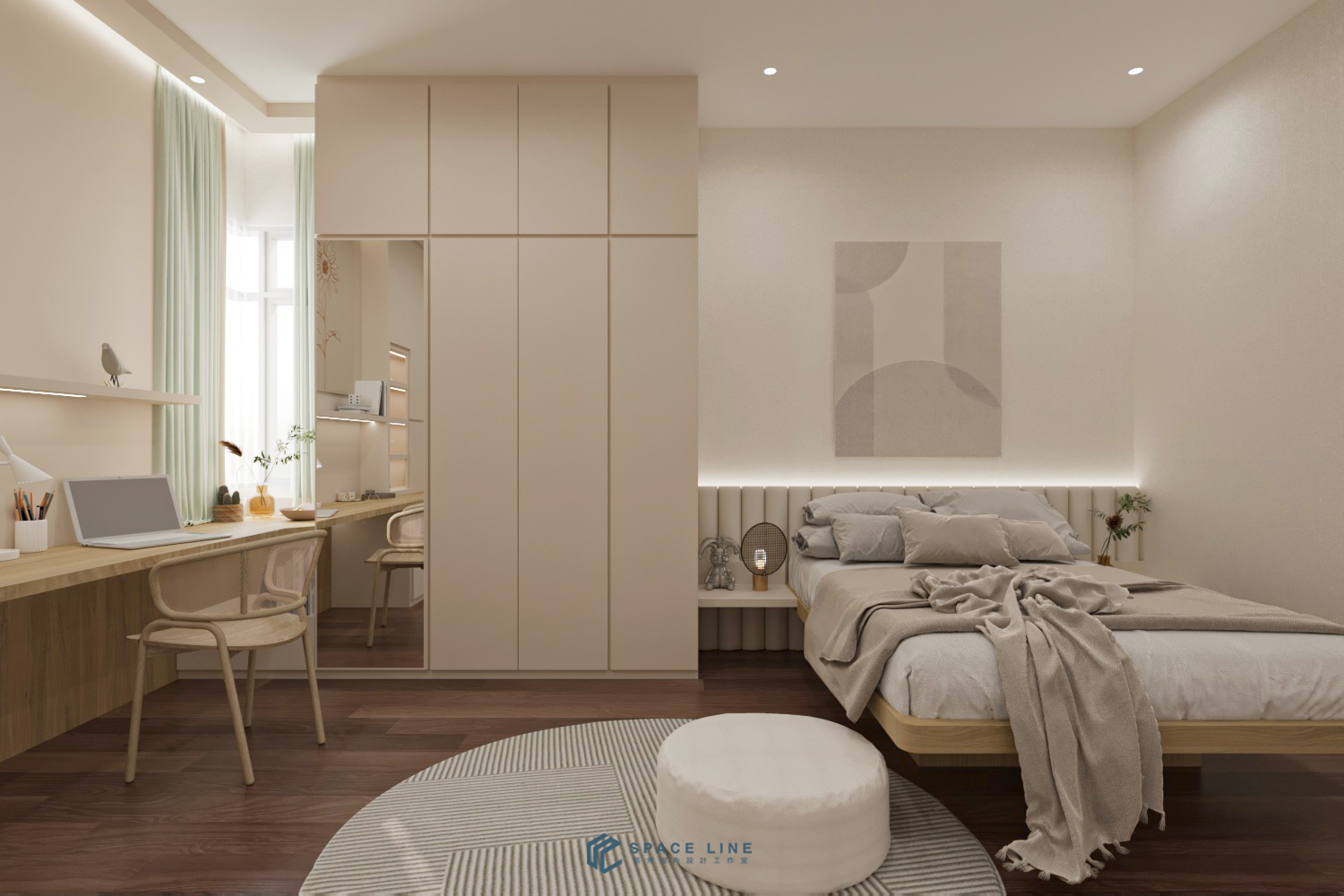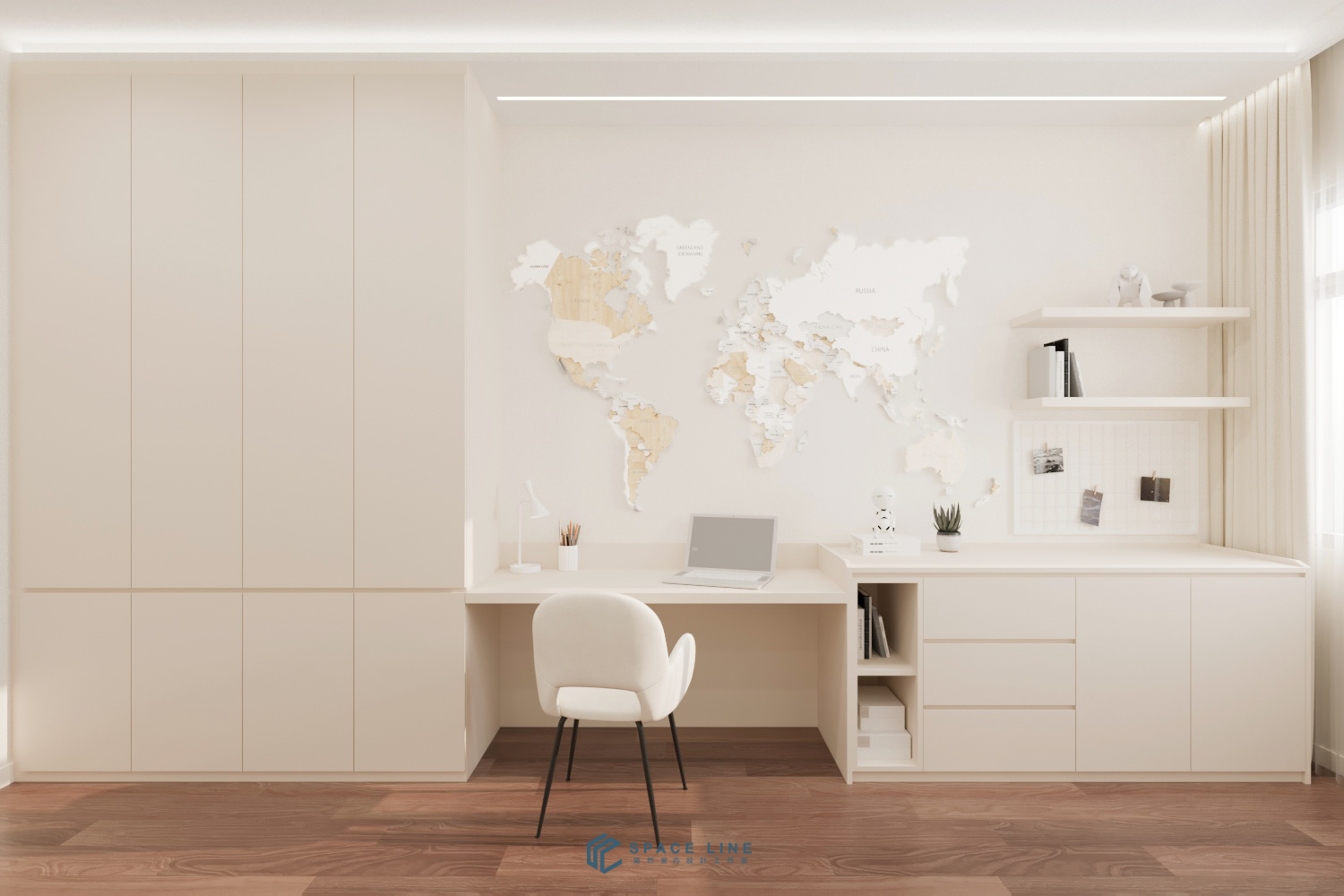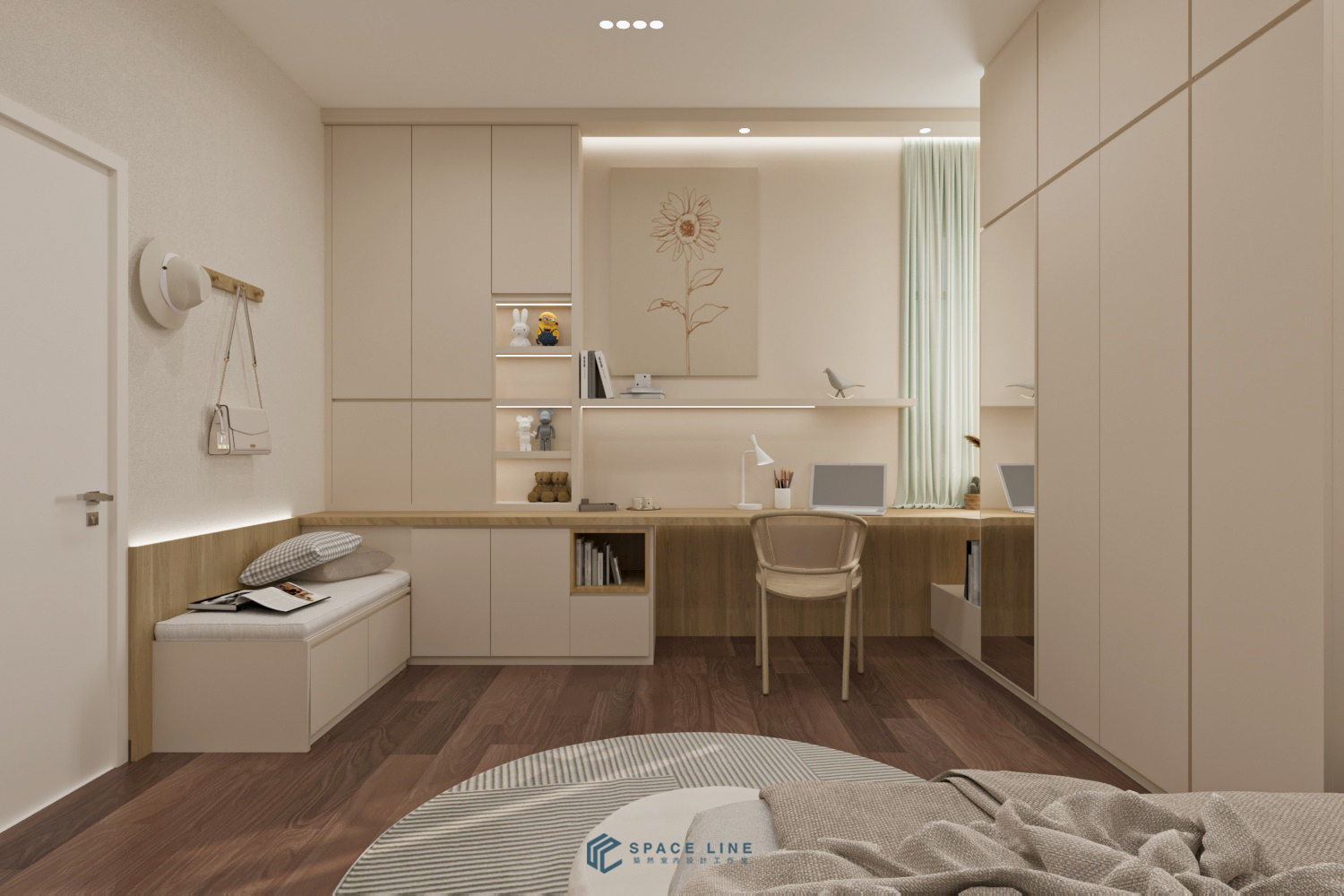 For the parents’ room, we designed a space that is both versatile and functional. The layout expertly integrates areas for watching TV, a home office, and ample storage, all without sacrificing the room’s serene atmosphere. This meticulous planning ensures the space remains tidy and serves multiple purposes seamlessly.