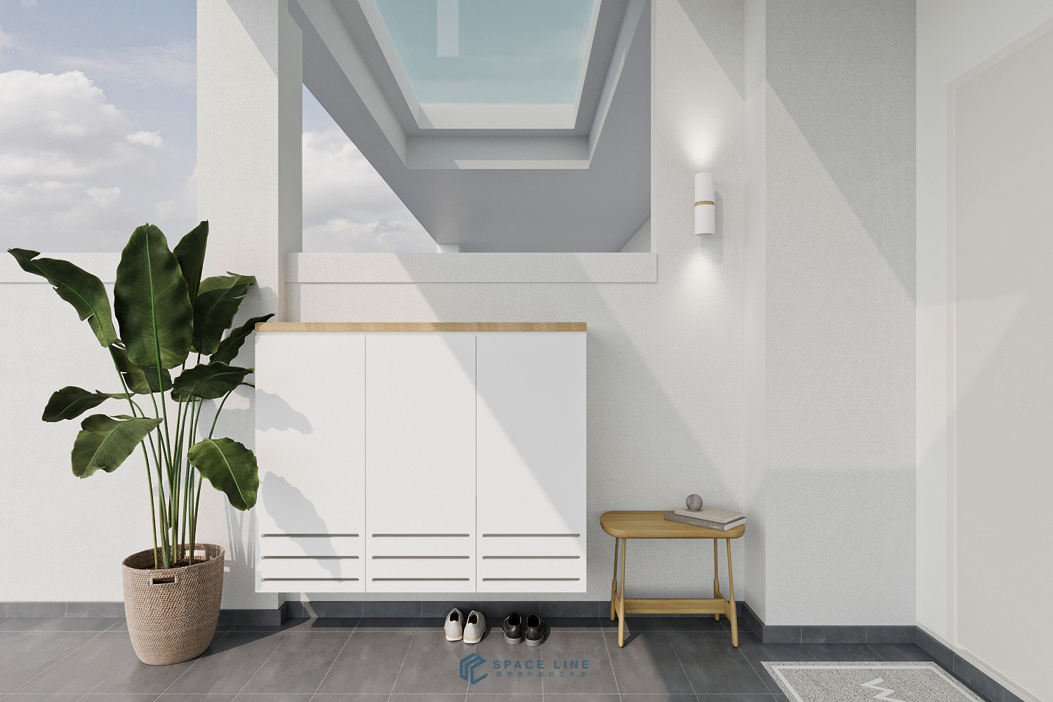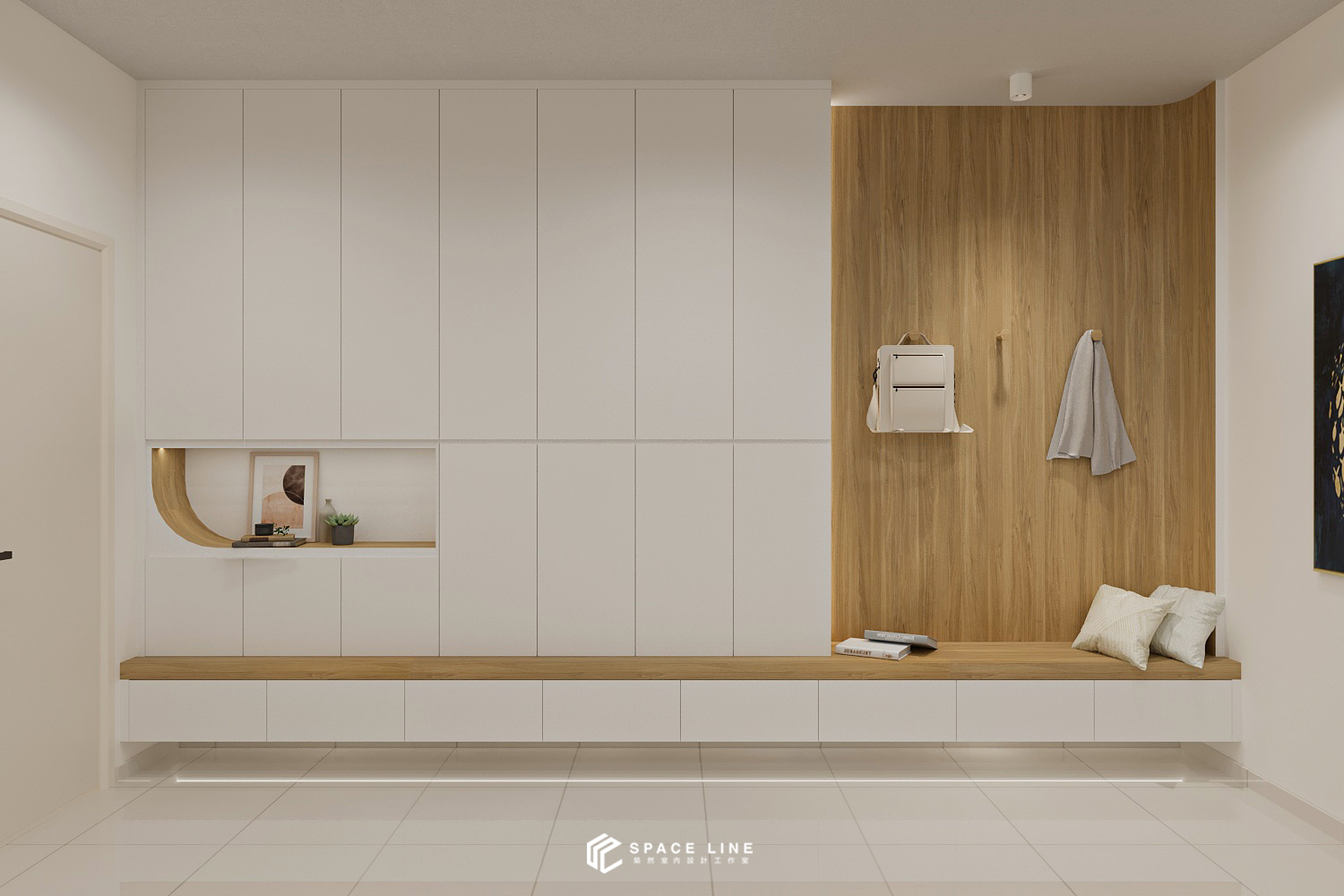 For a foyer larger than a typical unit, the key was smart organization. We consolidated all the essential functions on the left side of the entrance, creating a dedicated area for shoe changing, hanging coats, and storage. This streamlined approach maximizes the sense of space, making the foyer feel both grand and welcoming. The clever use of wood and white proportions ensures the area feels expansive and uncluttered.
