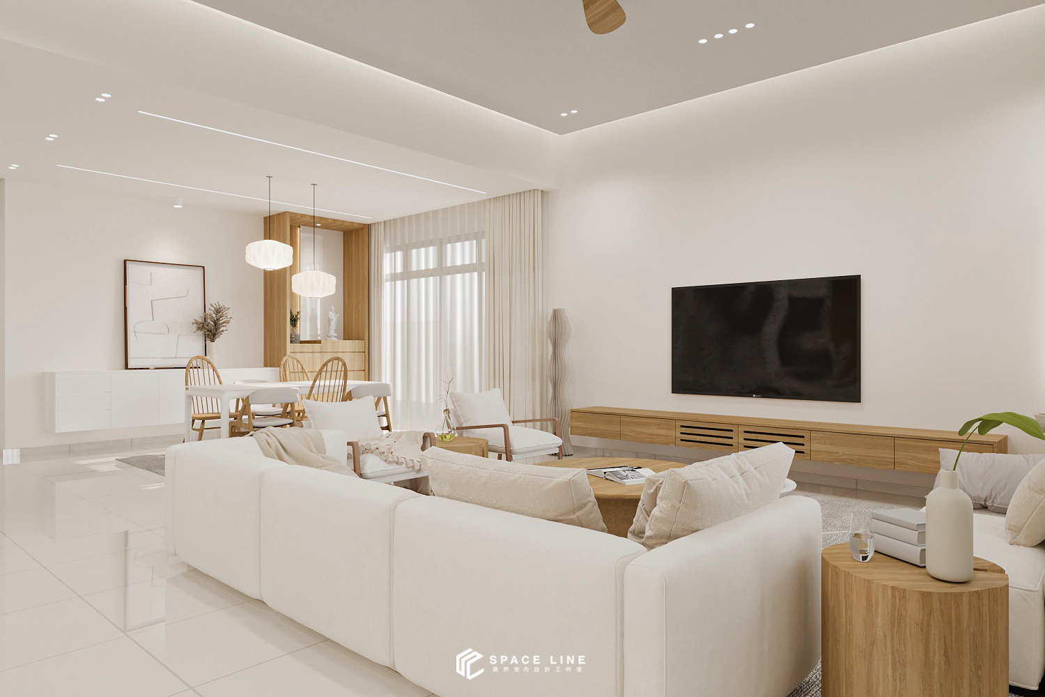 In the main living area, we intentionally opted against a traditional feature wall. Instead, we used plaster design to define different zones, allowing for a greater proportion of white space. This creates a fluid and effortless sense of flow throughout the room, celebrating a clean, uninterrupted aesthetic.