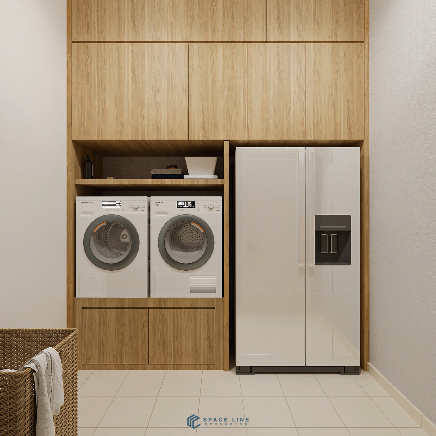 The kitchen was designed to feel as light and airy as possible, a necessity for a smaller space. We focused on a balanced color palette and opted for suspended cabinetry to avoid a heavy, crowded feel. We also made sure to plan for a dedicated laundry room, a must-have for any modern home. While it’s tucked away, we paid close attention to every detail of its storage and workflow. We also elevated the washer and dryer, a simple design choice that proves incredibly practical by saving your back and making laundry a breeze.
