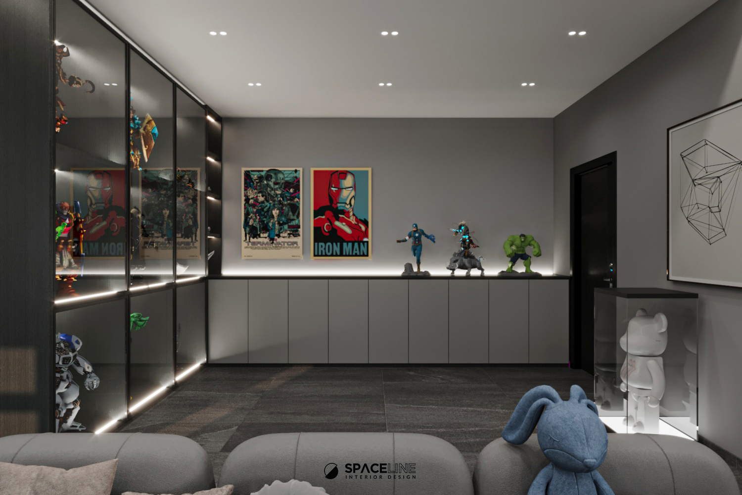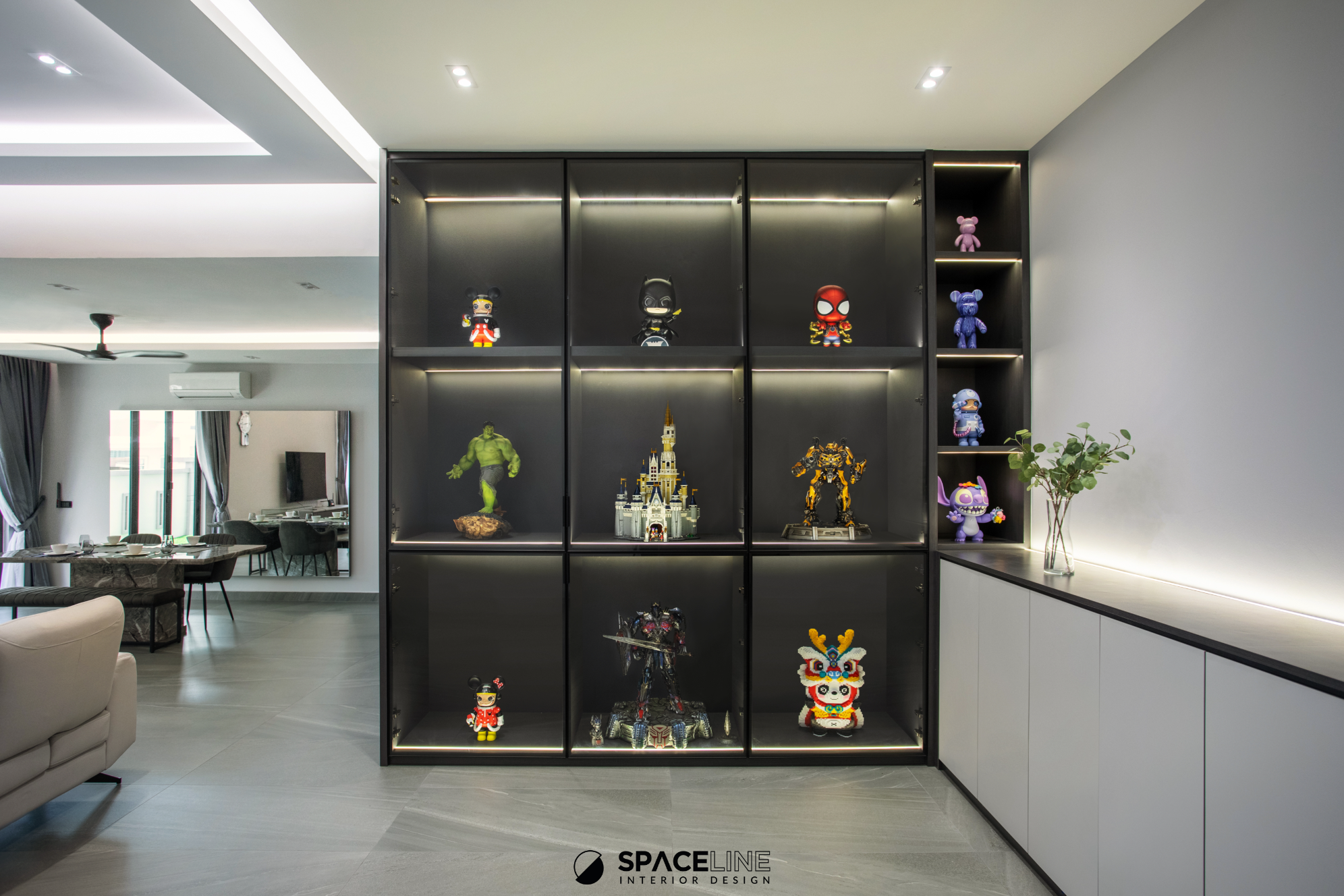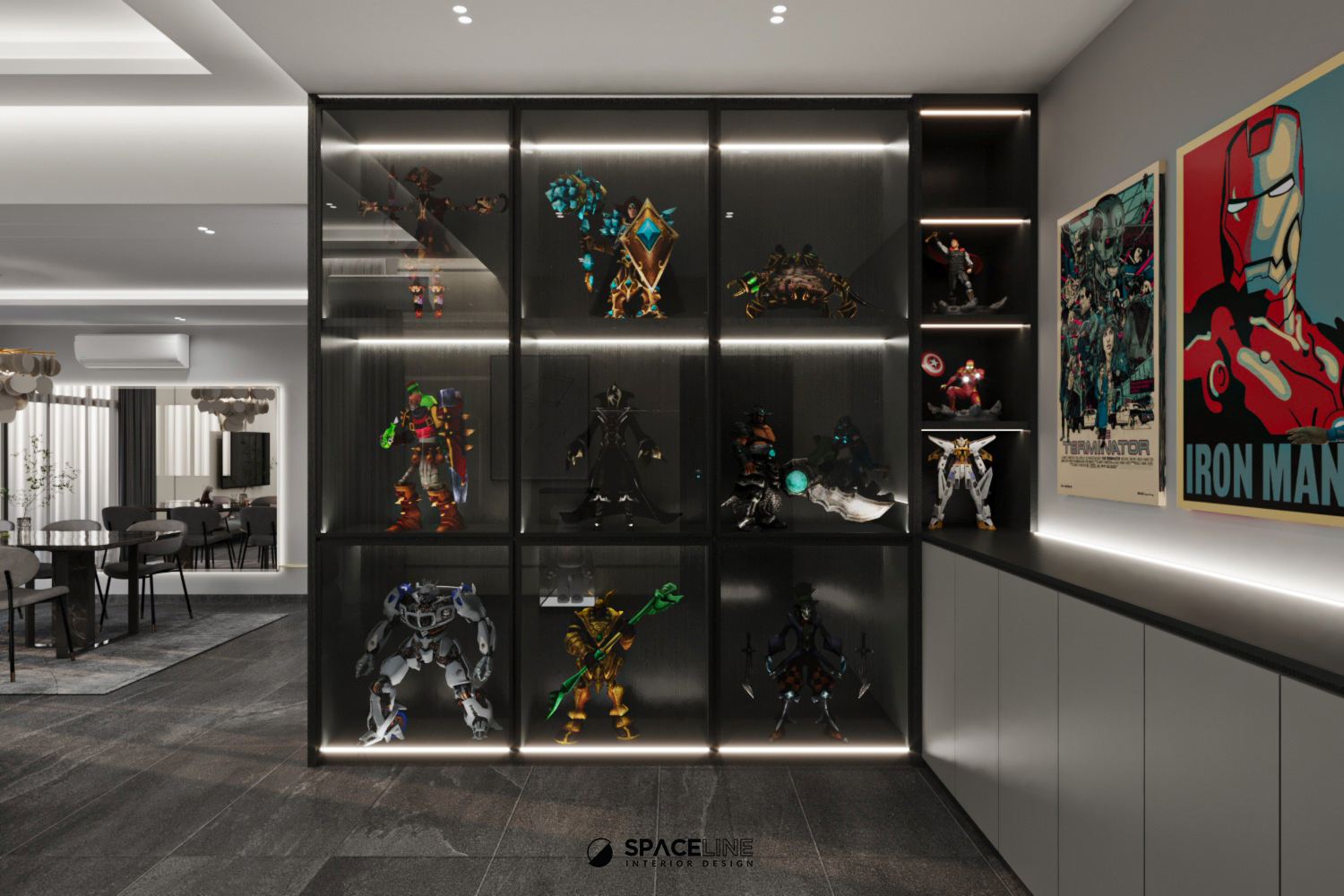 The moment one enters the house, the journey of surprise begins. The custom-made display cabinet becomes the immediate focal point, transforming the owner’s hobby collections—from iconic pop culture figures to intricate models—into an exhibition-style gallery wall. The dark tone and matte finishes of the cabinet, integrated with subtle lighting, exude sophistication and personal touch. This dark, dramatic element immediately captivates, while the open-plan transition between the foyer and living area promotes visual openness, clearly demarcating the functional zones.
