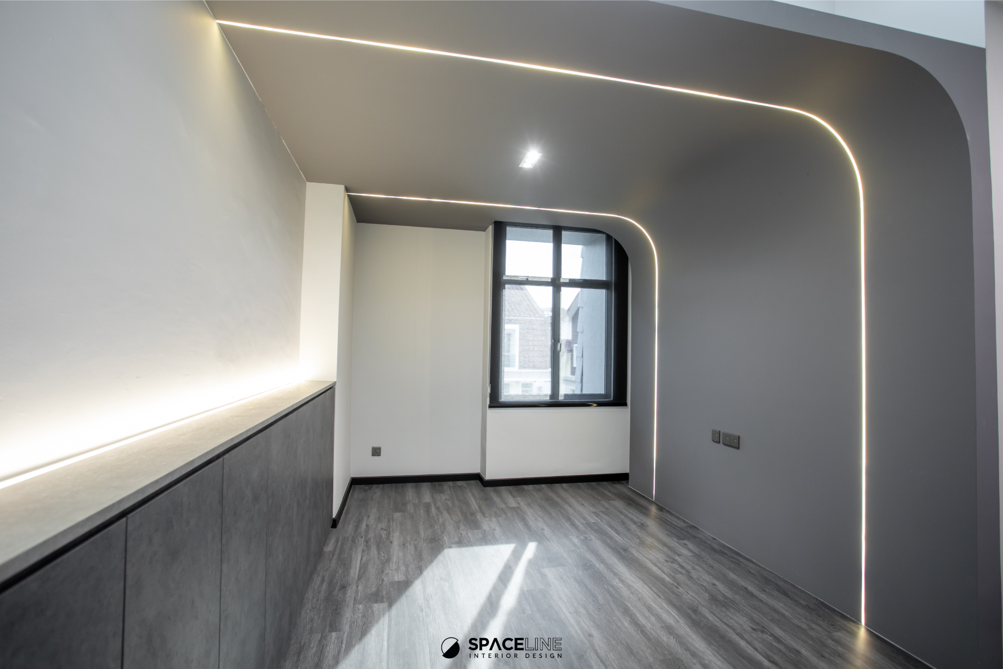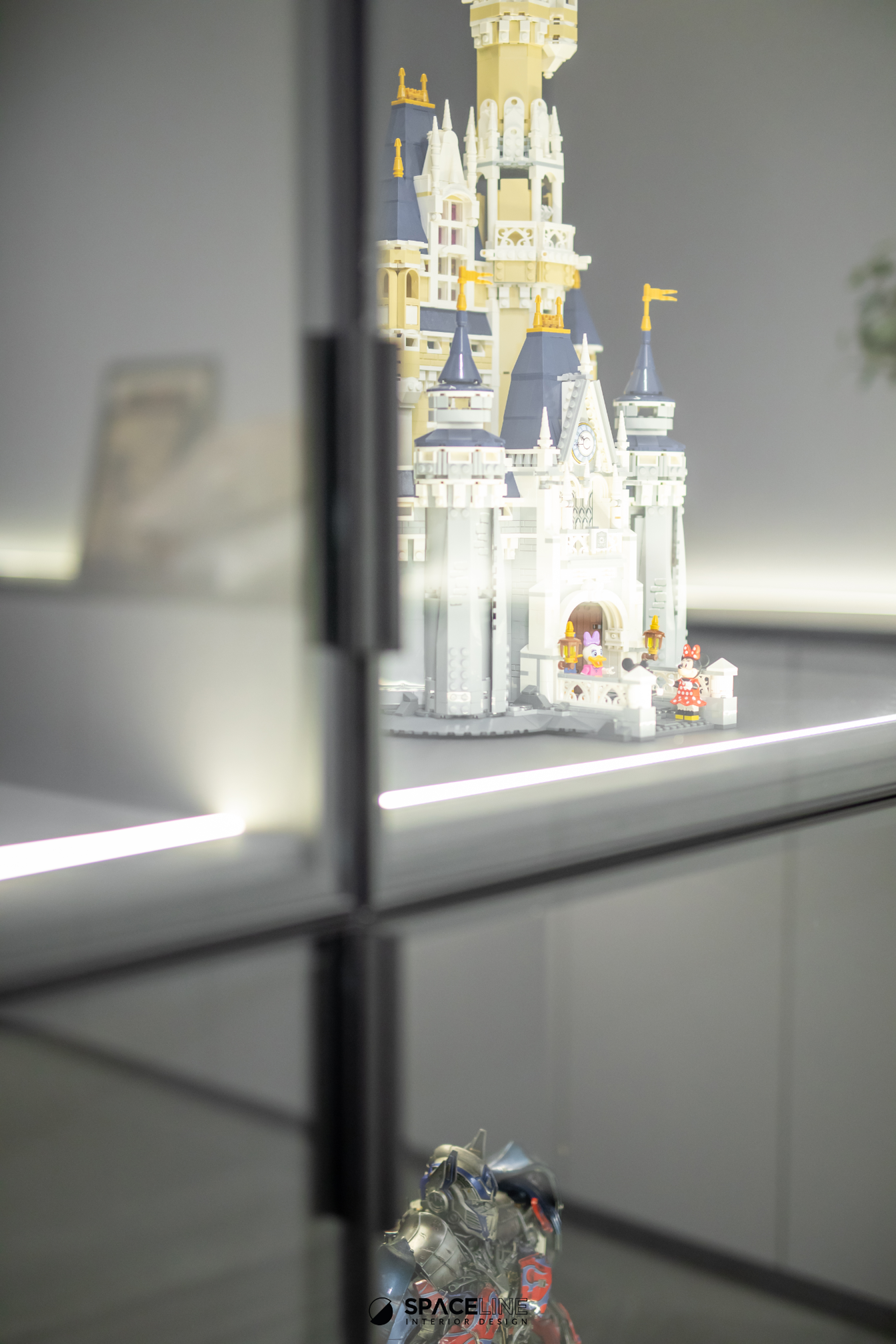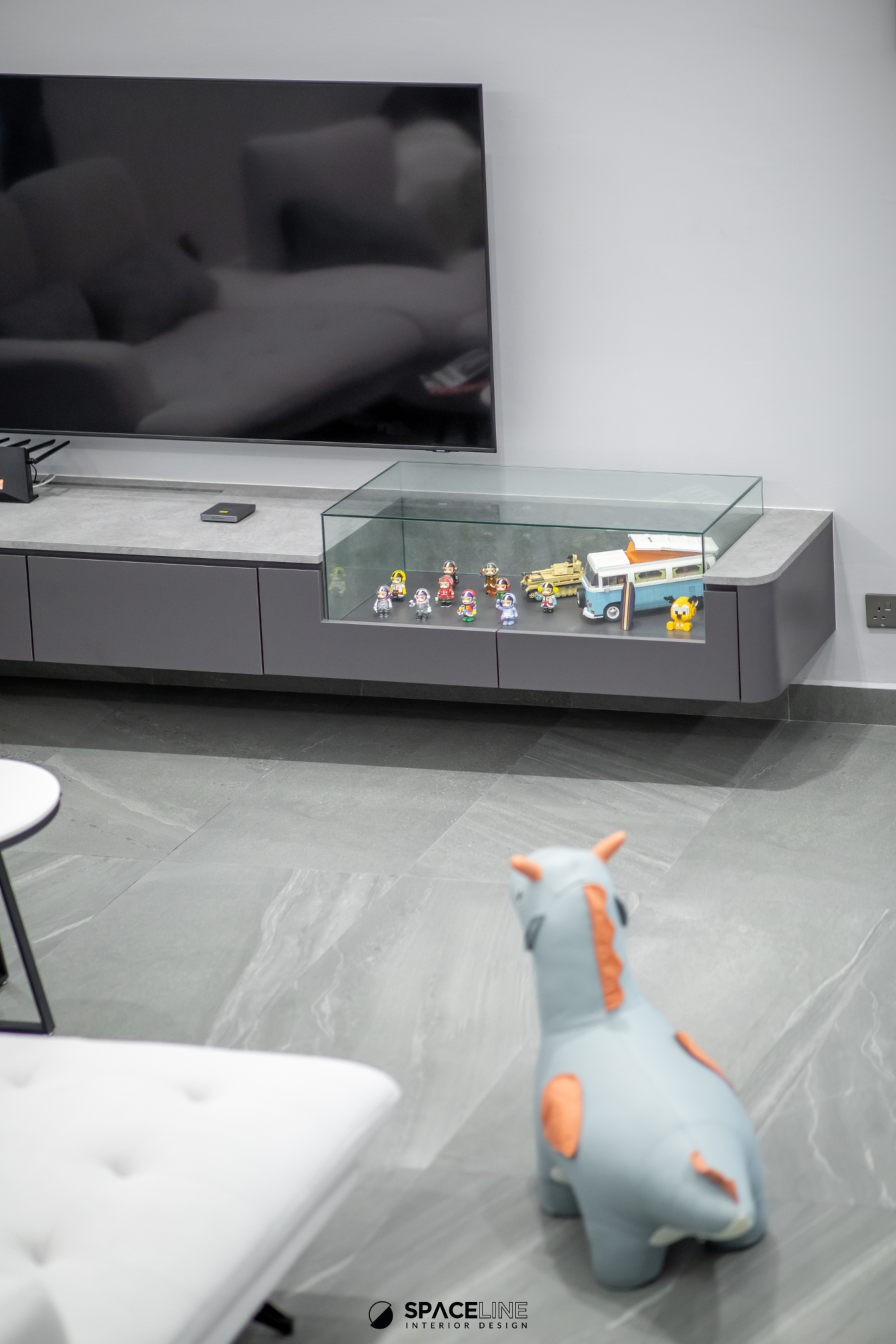The moment one enters the house, the journey of surprise begins. The custom-made display cabinet becomes the immediate focal point, transforming the owner’s hobby collections—from iconic pop culture figures to intricate models—into an exhibition-style gallery wall. The dark tone and matte finishes of the cabinet, integrated with subtle lighting, exude sophistication and personal touch. This dark, dramatic element immediately captivates, while the open-plan transition between the foyer and living area promotes visual openness, clearly demarcating the functional zones.