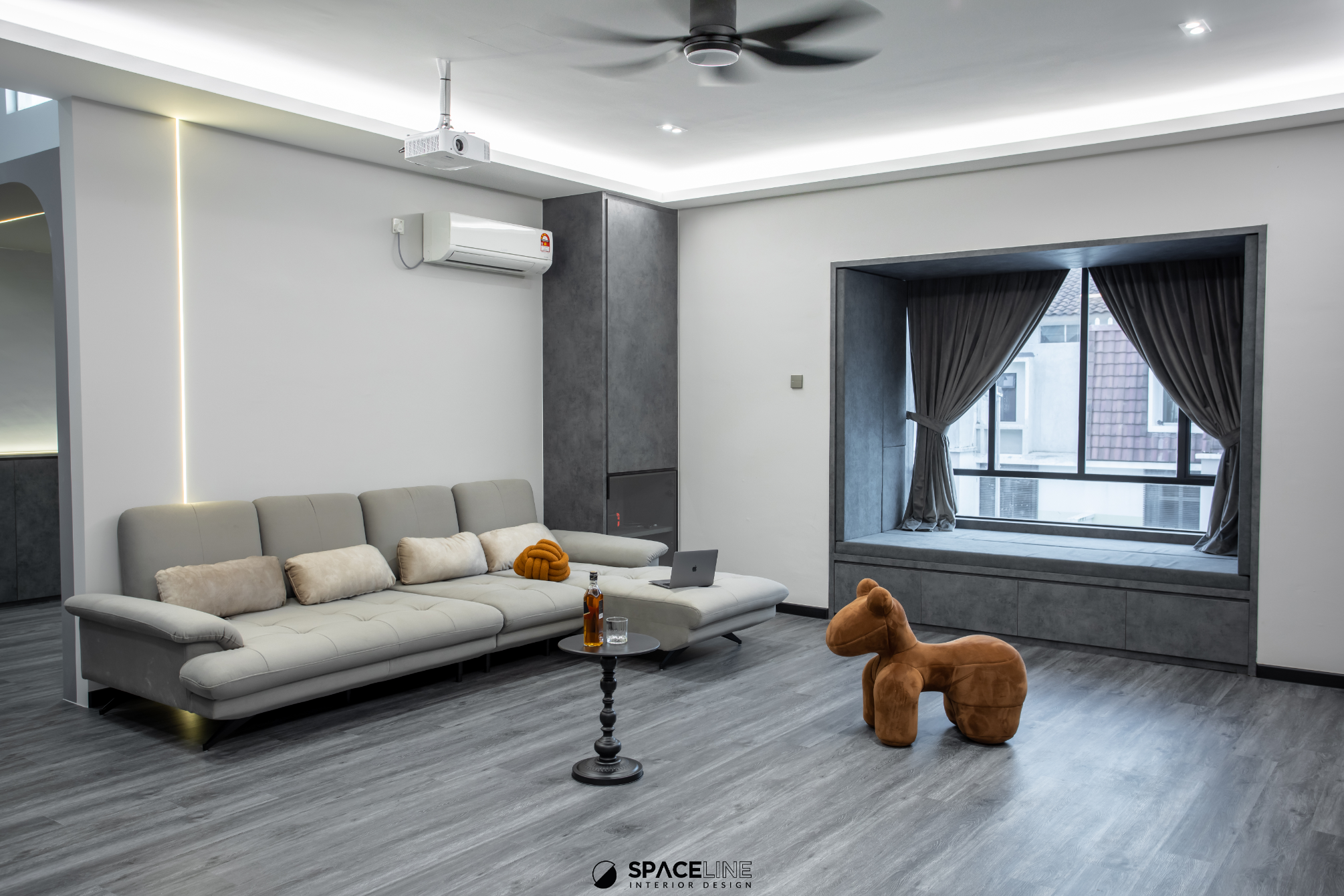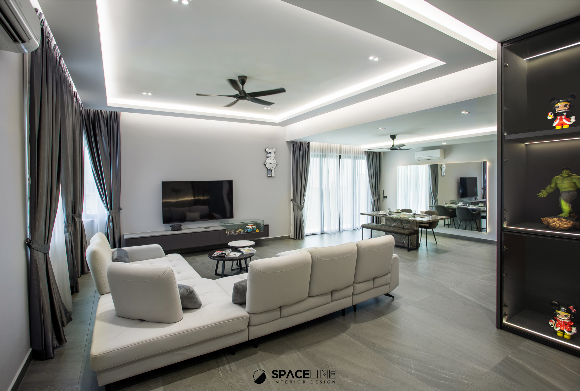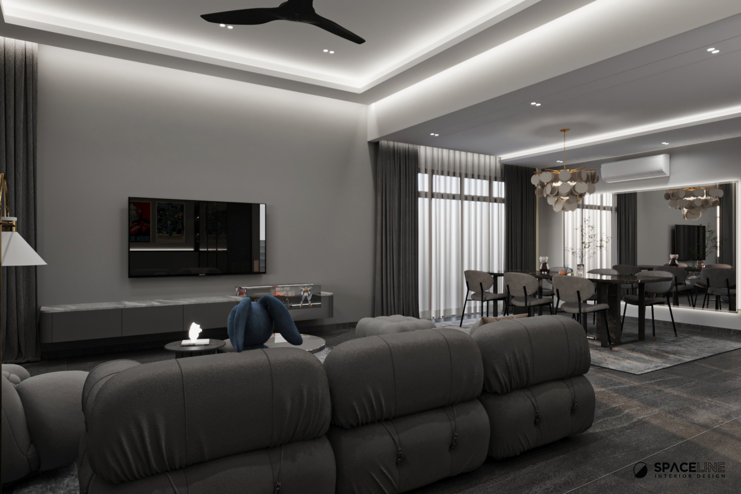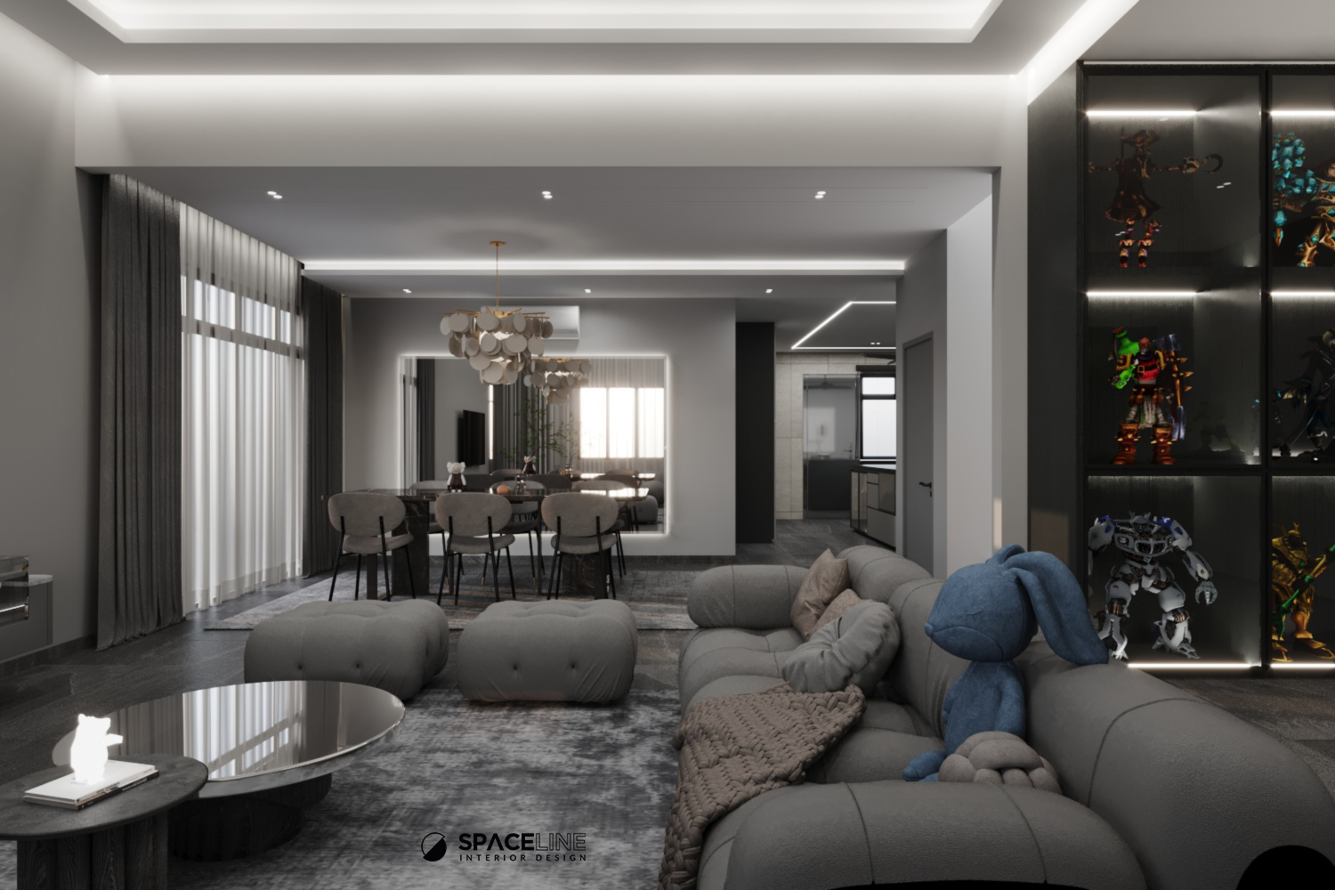 The main social spaces are dominated by a neutral gray palette featuring soft tones of white, stone gray, and charcoal, creating a cool and calming mood perfect for both relaxing and entertaining. A cohesive tonal consistency across the furniture, flooring, curtains, and ceiling creates the illusion of a wider, expansive, and unified space. Cove lighting frames are used to add dimension and provide ambient brightness, reinforcing the modern aesthetic.