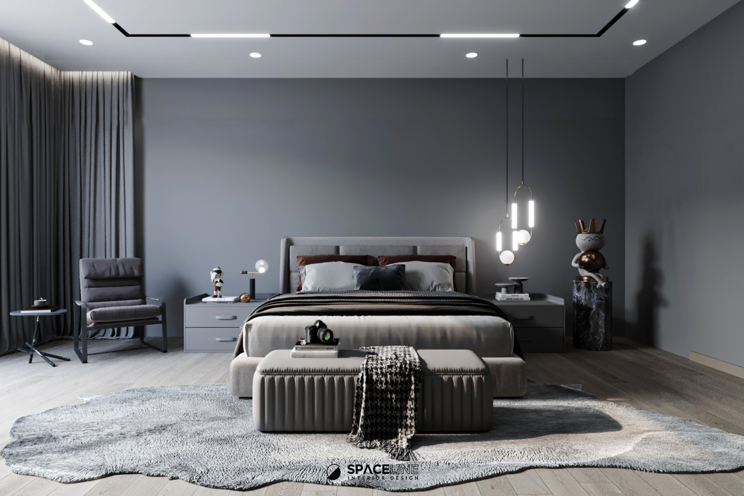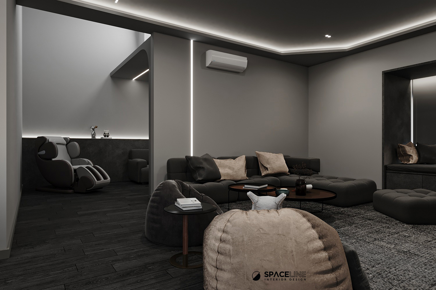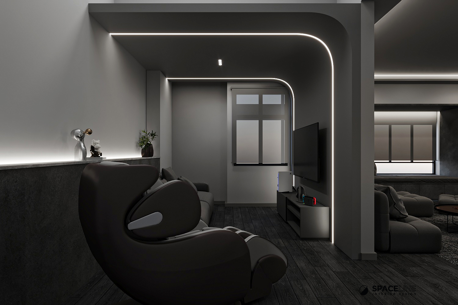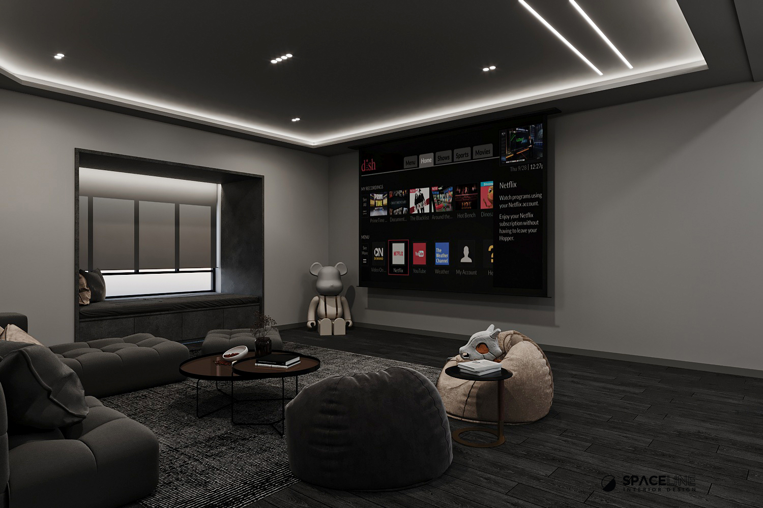 The main social spaces are dominated by a neutral gray palette featuring soft tones of white, stone gray, and charcoal, creating a cool and calming mood perfect for both relaxing and entertaining. A cohesive tonal consistency across the furniture, flooring, curtains, and ceiling creates the illusion of a wider, expansive, and unified space. Cove lighting frames are used to add dimension and provide ambient brightness, reinforcing the modern aesthetic.