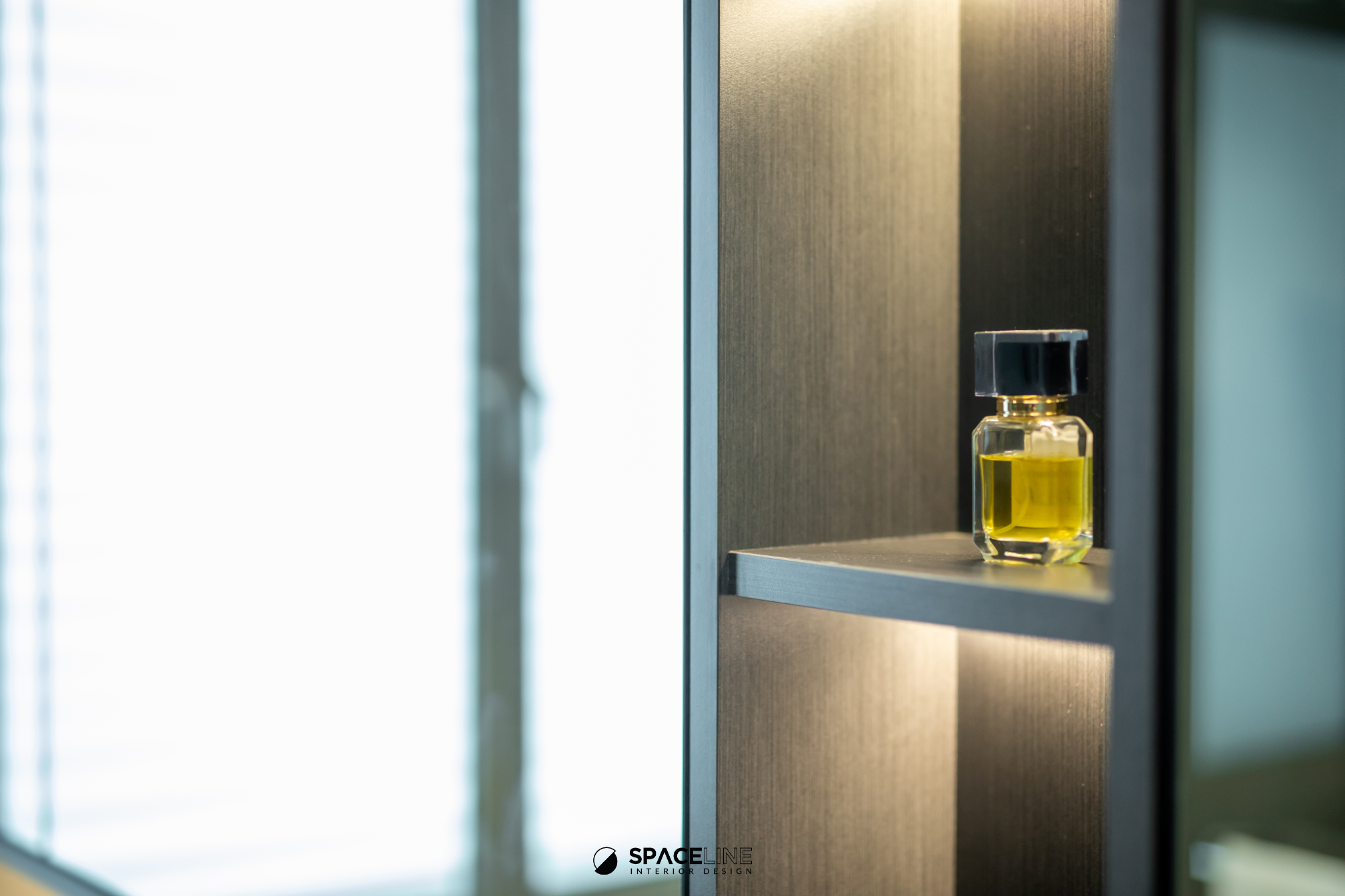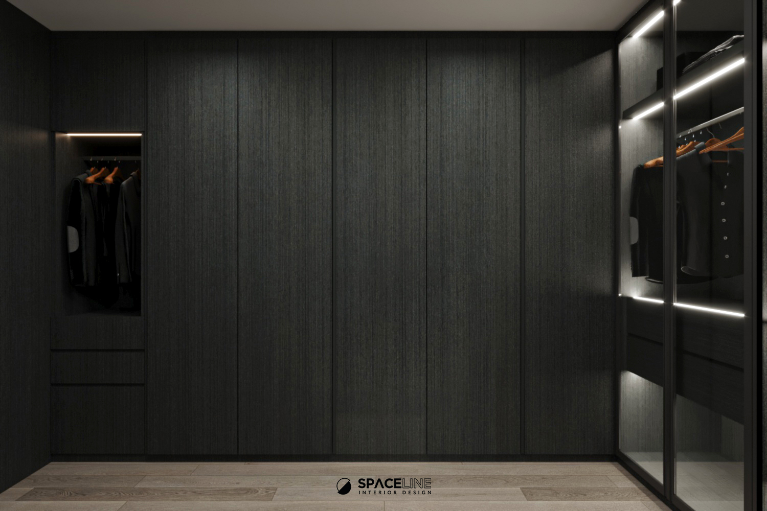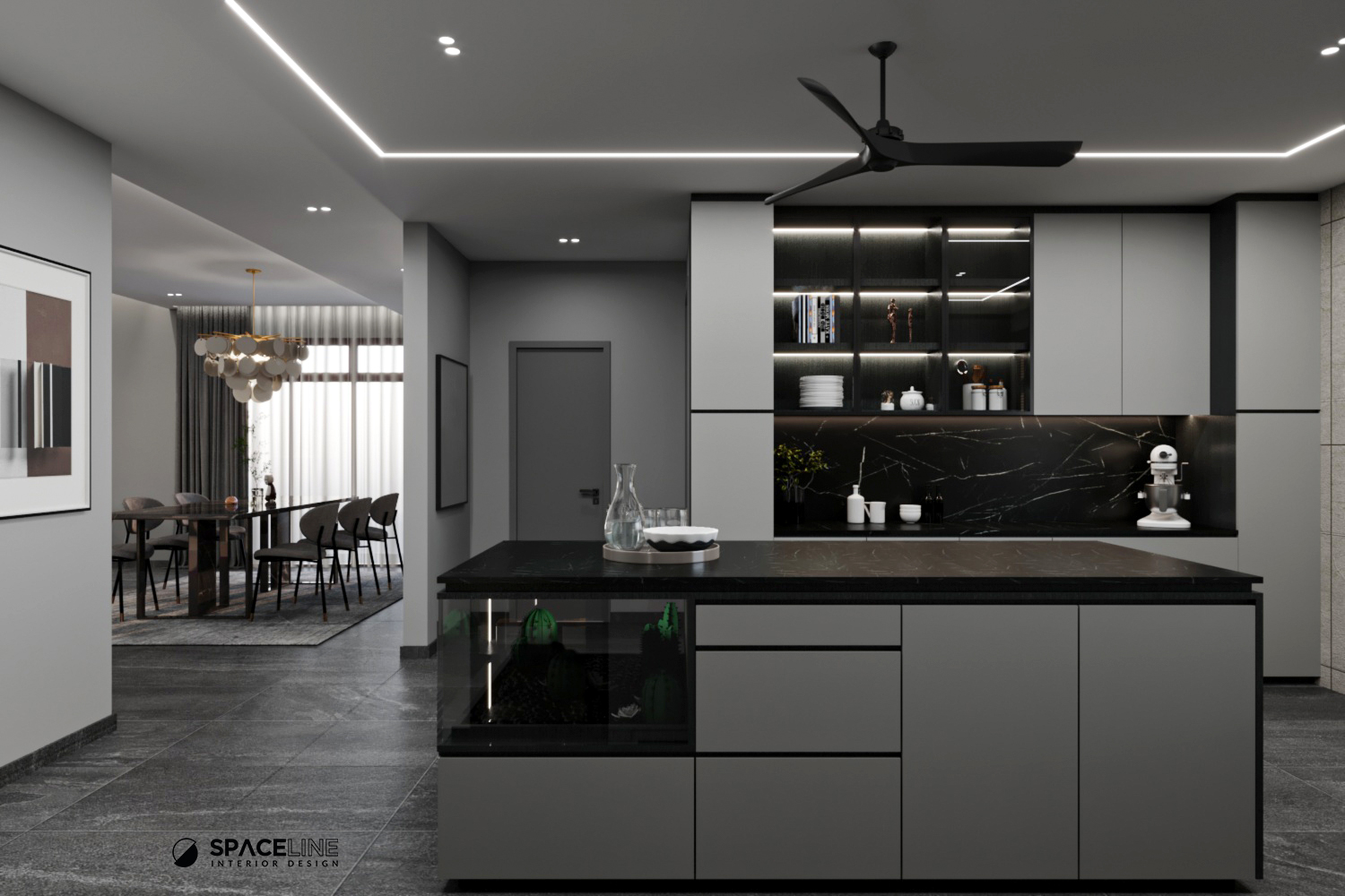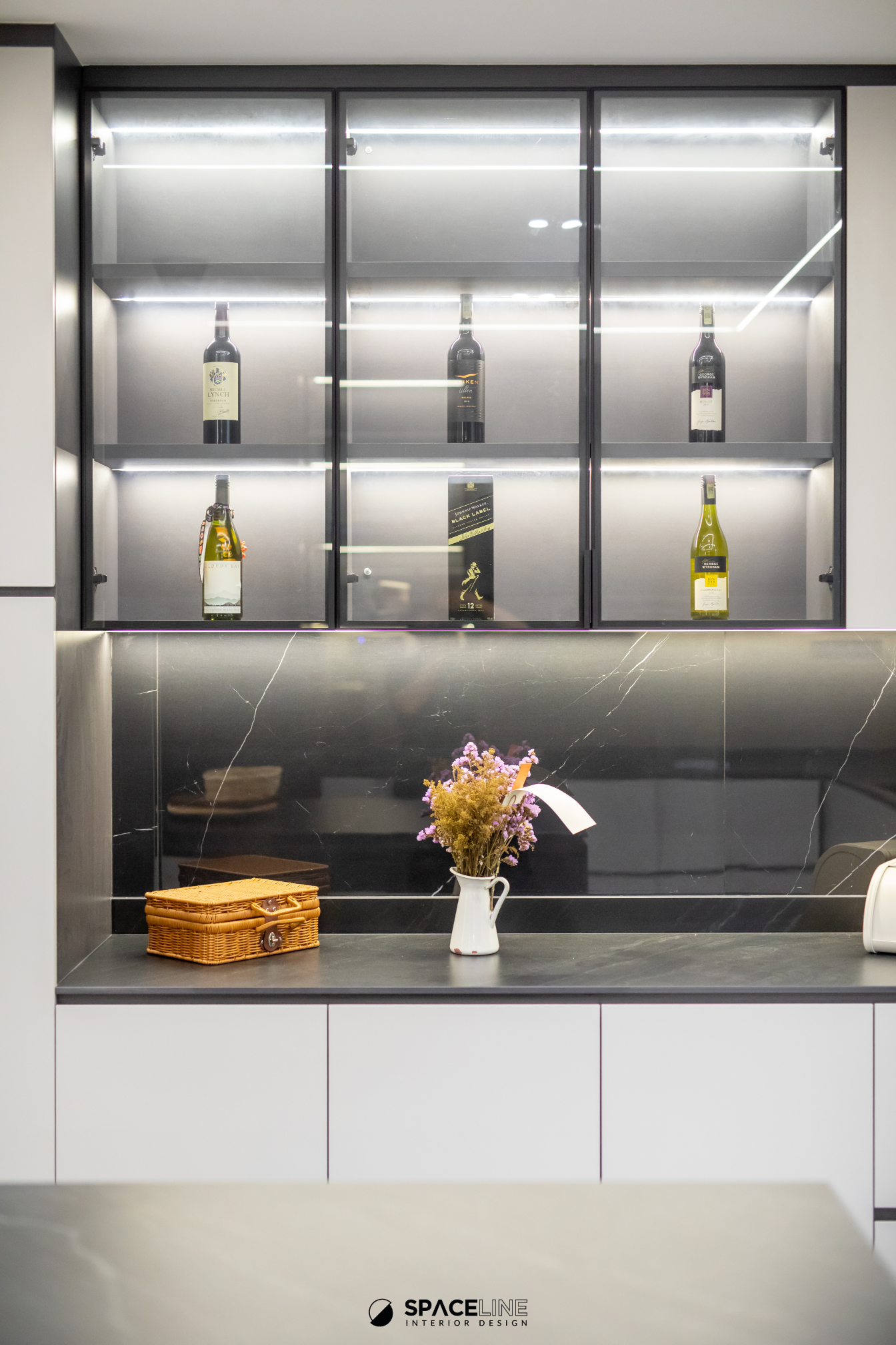 Maturity and comfort in daily living are reflected in the kitchen design, where the color selection holds to the same cohesive tonal strategy. A dark-shade island is centrally located to ease movement and act as an active transitional space for cooking preparation. A durable black sinter worktop was chosen for its elegance and ability to reflect personality. A brilliant recessed ceiling light serves as a practical yet minimalist centerpiece. A glass display cabinet equipped with LED lighting showcases the strength of restraint in design, where form meets function to visualize a timeless modern living experience.