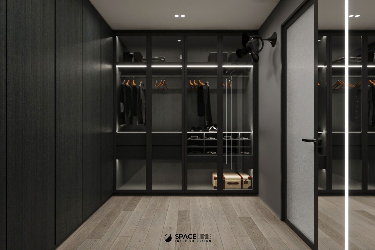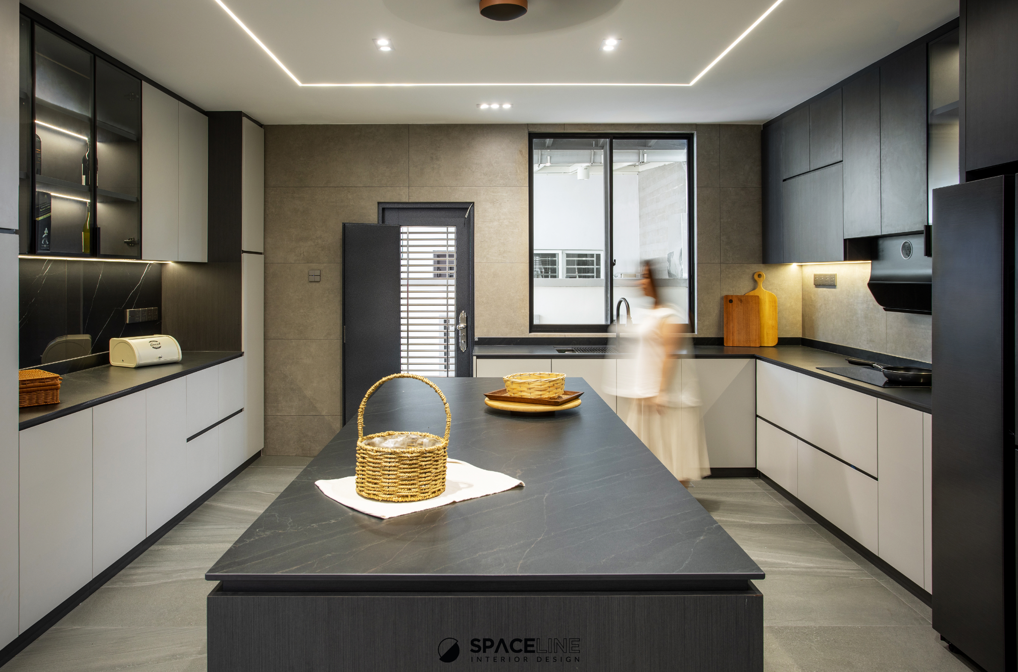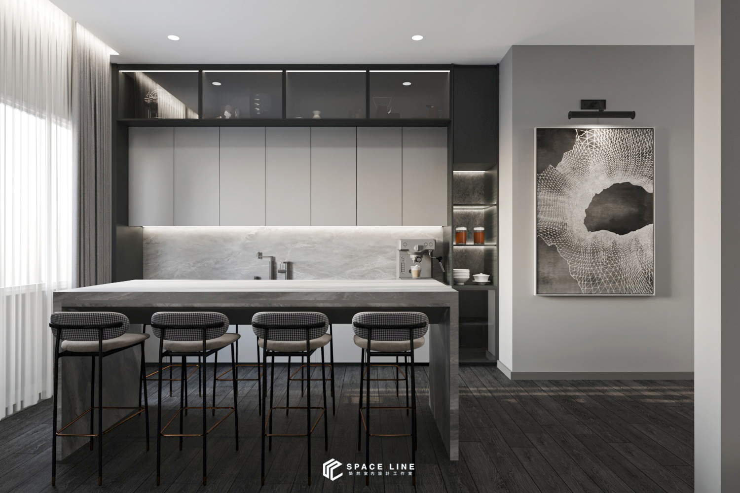 Maturity and comfort in daily living are reflected in the kitchen design, where the color selection holds to the same cohesive tonal strategy. A dark-shade island is centrally located to ease movement and act as an active transitional space for cooking preparation. A durable black sinter worktop was chosen for its elegance and ability to reflect personality. A brilliant recessed ceiling light serves as a practical yet minimalist centerpiece. A glass display cabinet equipped with LED lighting showcases the strength of restraint in design, where form meets function to visualize a timeless modern living experience.