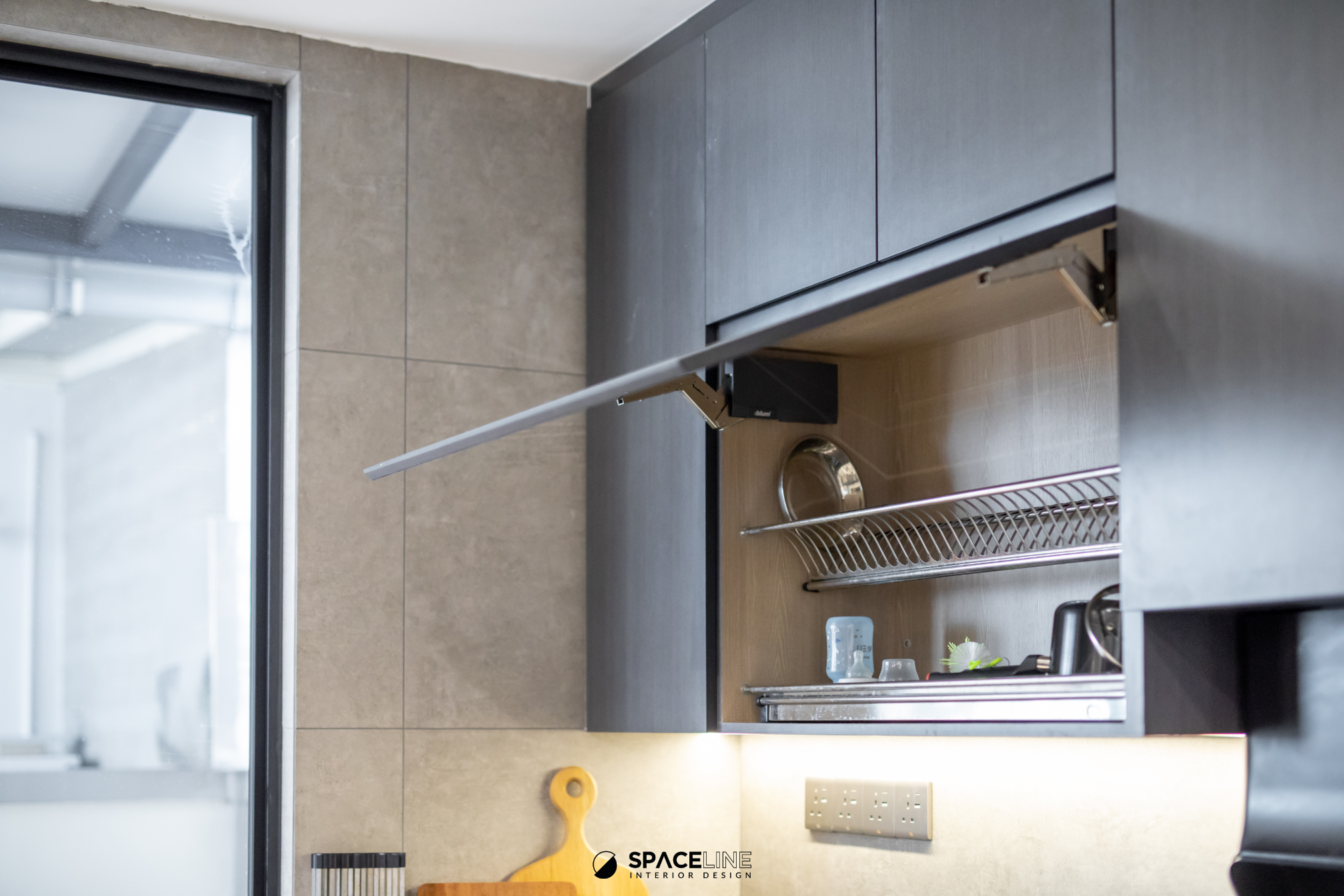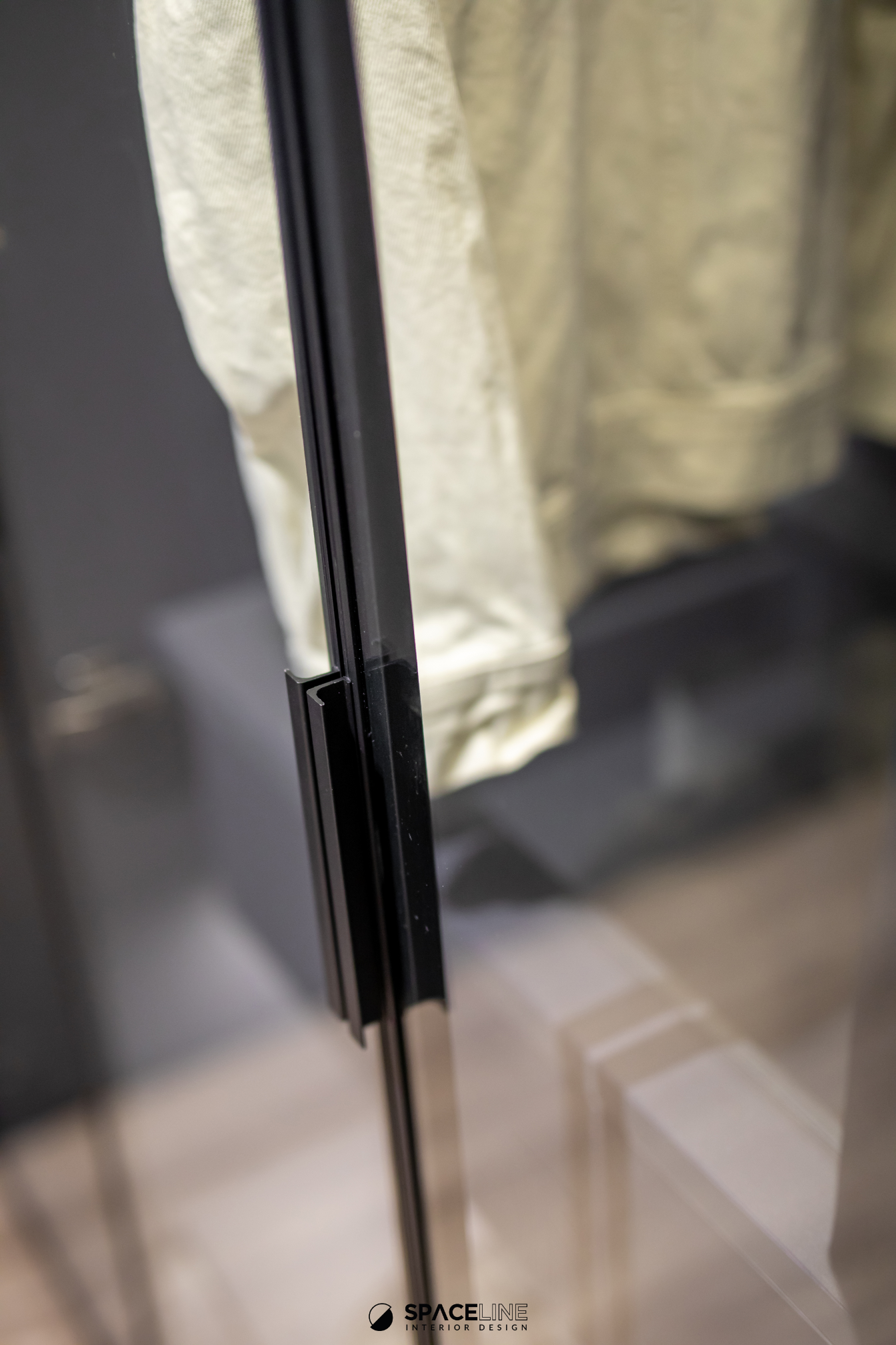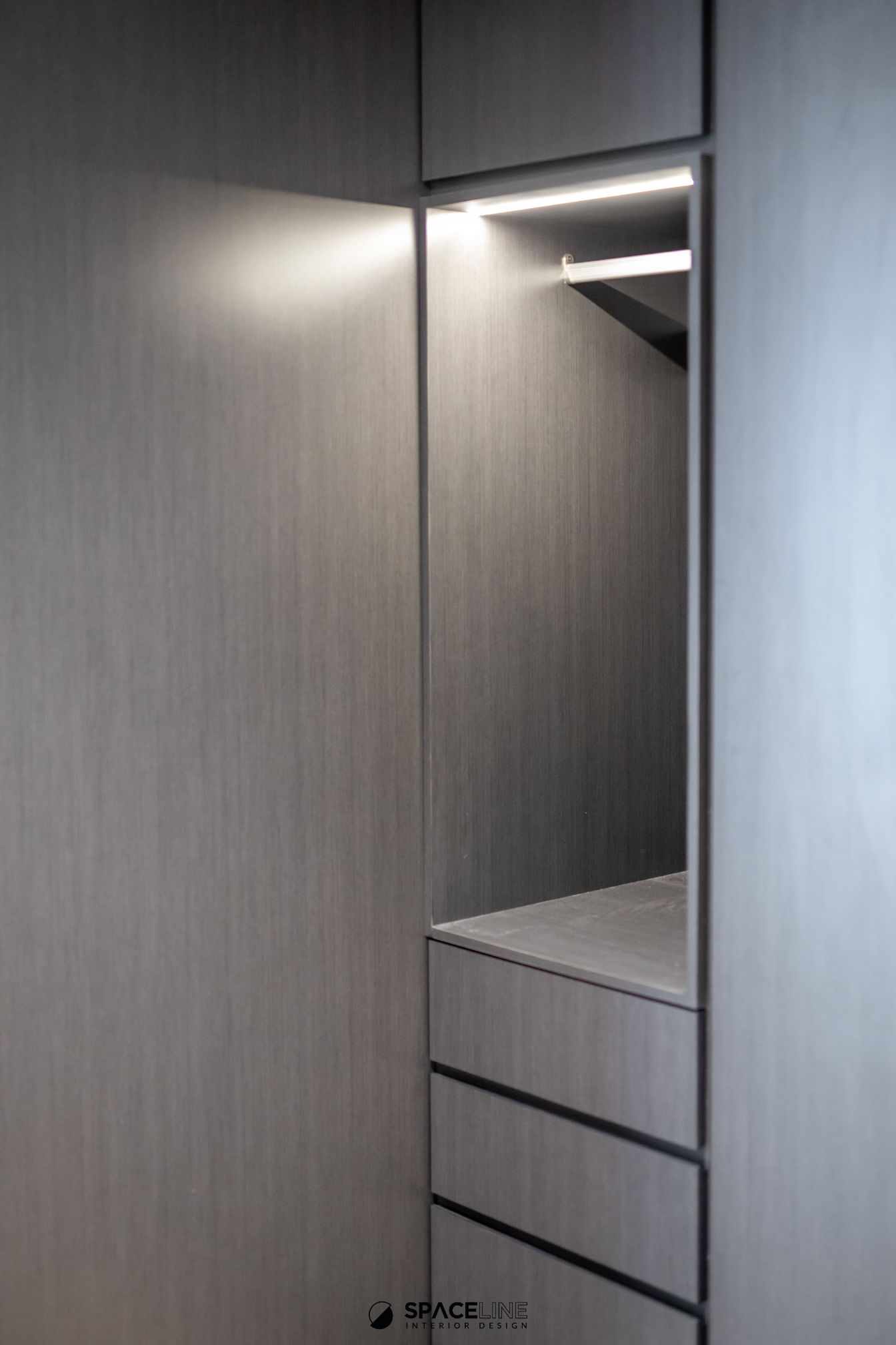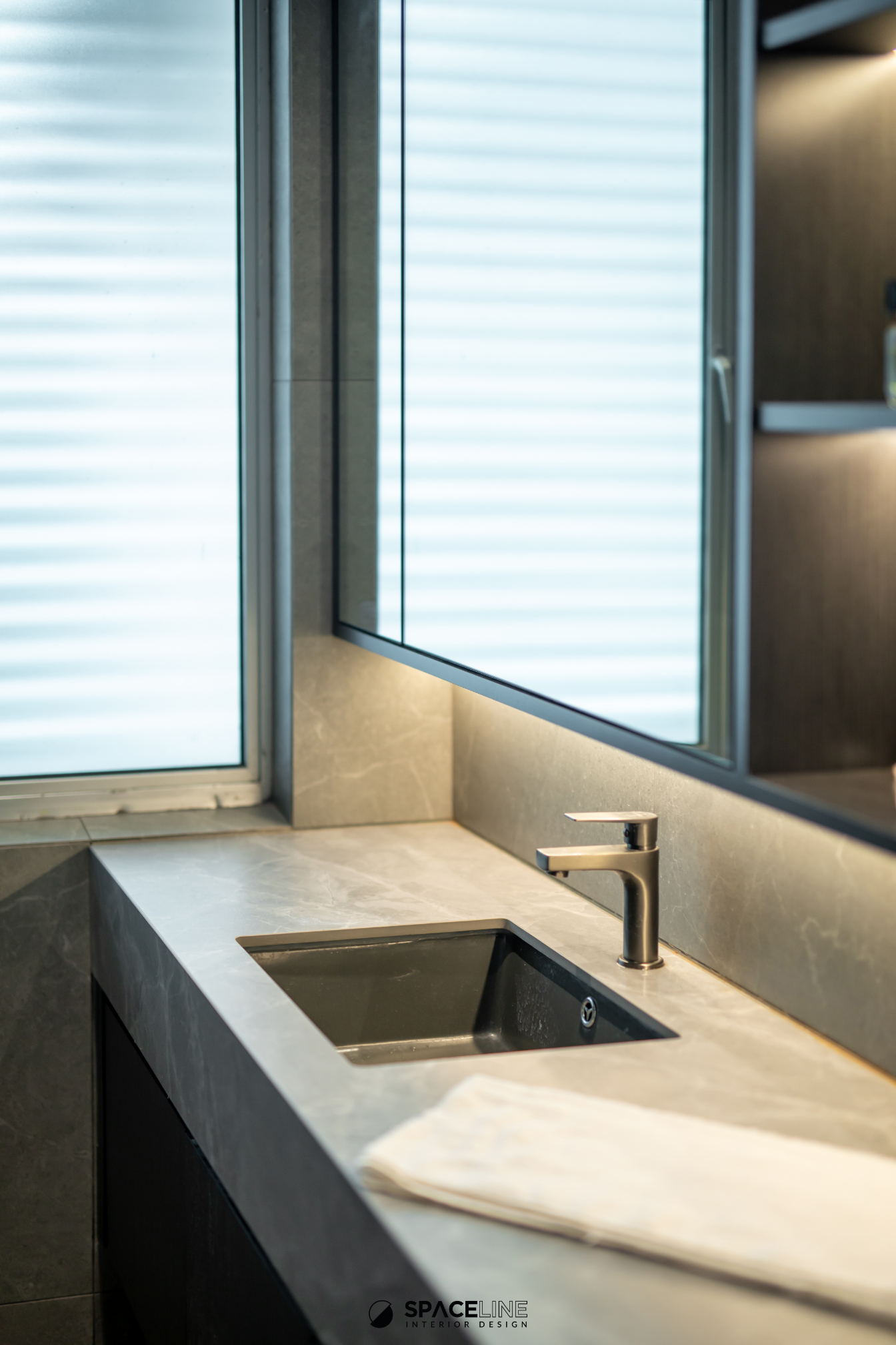 Maturity and comfort in daily living are reflected in the kitchen design, where the color selection holds to the same cohesive tonal strategy. A dark-shade island is centrally located to ease movement and act as an active transitional space for cooking preparation. A durable black sinter worktop was chosen for its elegance and ability to reflect personality. A brilliant recessed ceiling light serves as a practical yet minimalist centerpiece. A glass display cabinet equipped with LED lighting showcases the strength of restraint in design, where form meets function to visualize a timeless modern living experience.