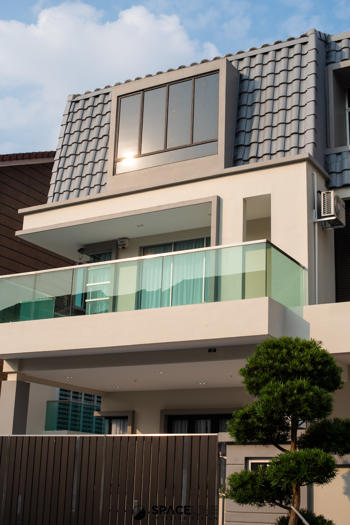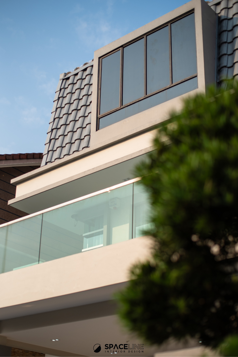 The home’s exterior façade speaks of modern minimalism, emphasizing symmetry, clean lines, and geometric proportions. The boxy balcony and recessed elements are evident in the volumetric simplicity of the structure. The use of glass railings contributes to an open-air aesthetic and improves visual continuity, significantly enhancing the curb appeal.