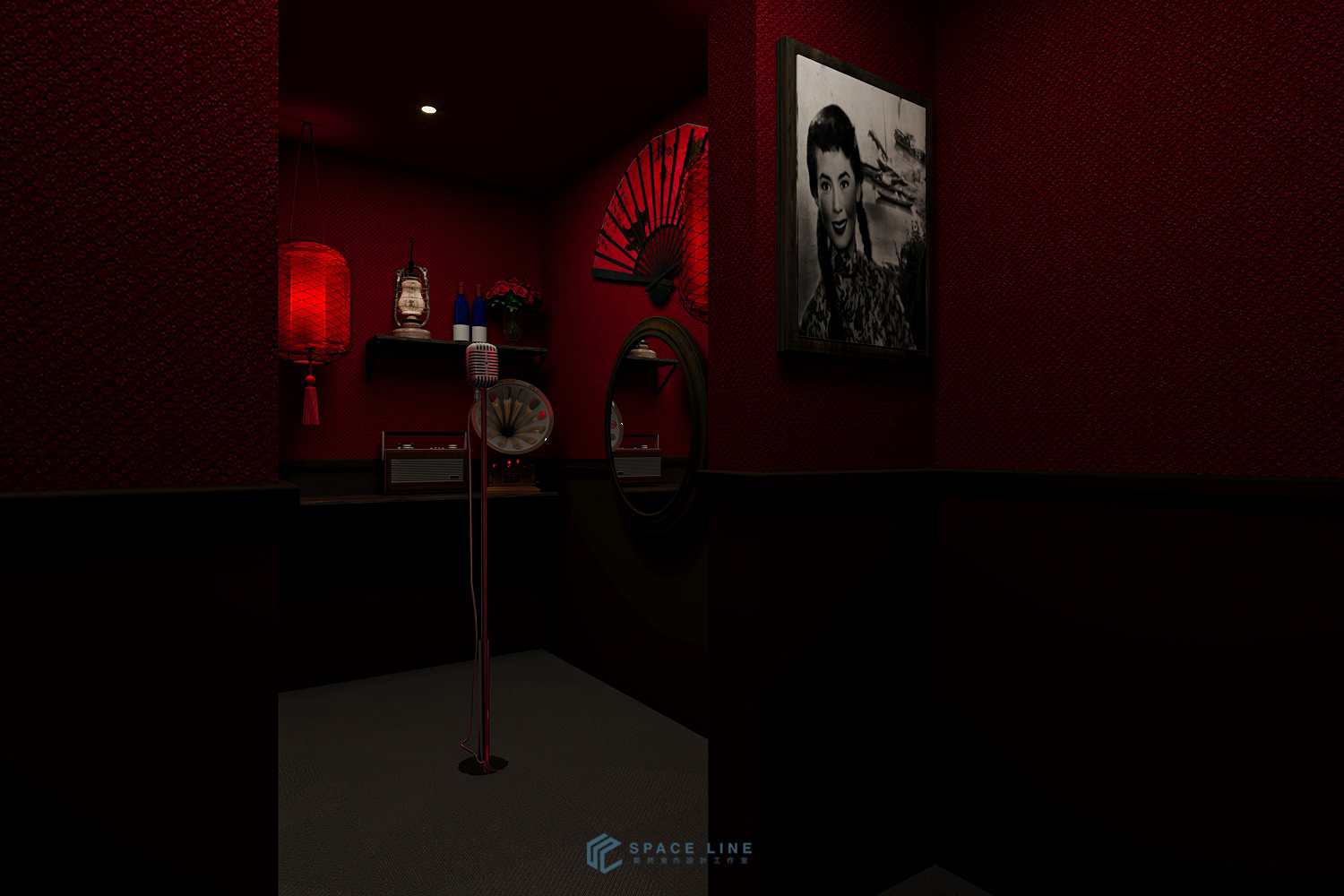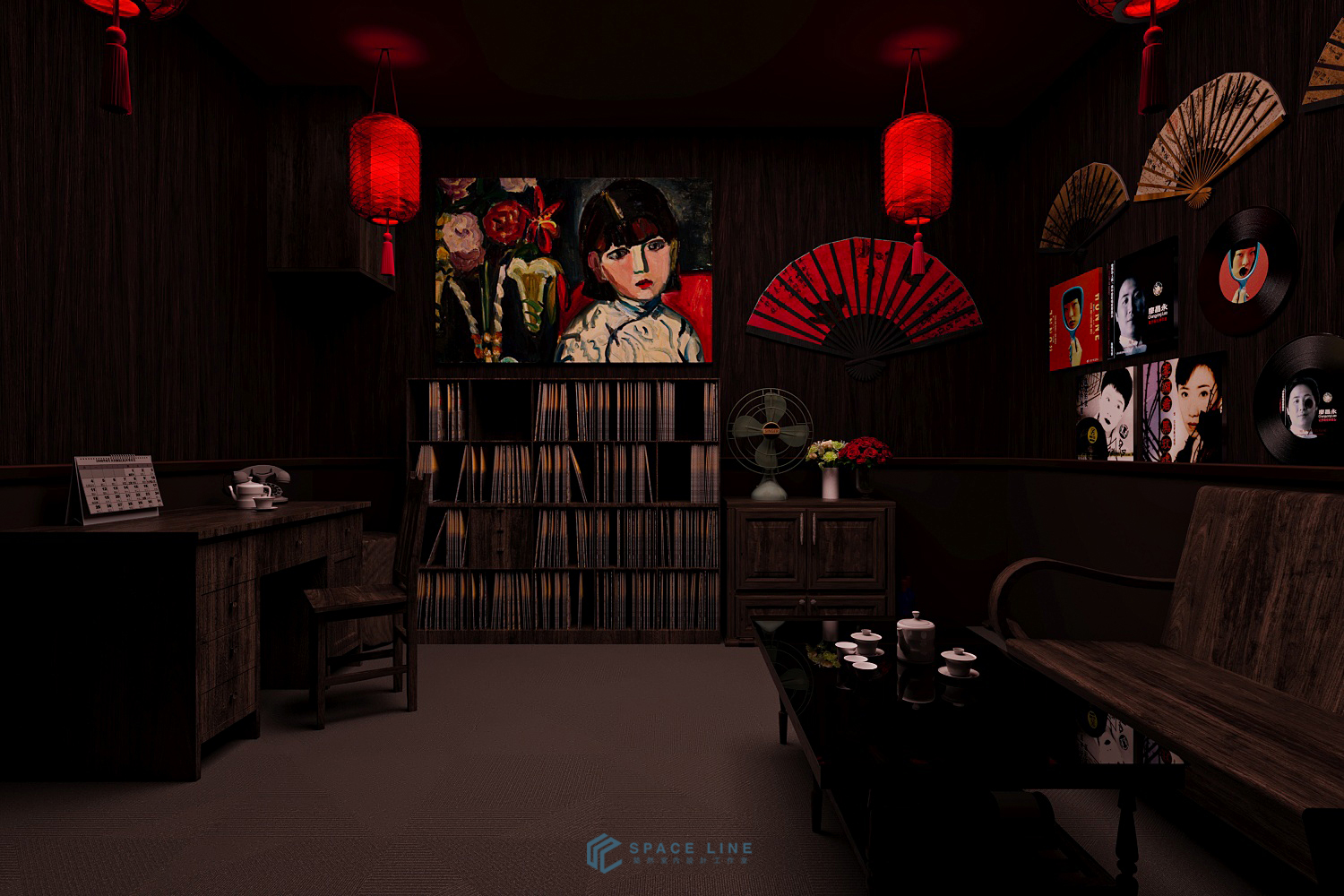 The design expertly transitions between highly specific, immersive zones, including a recording room, an oriental vintage room, and a dark alley. This variety is unified by the dramatic aesthetic.