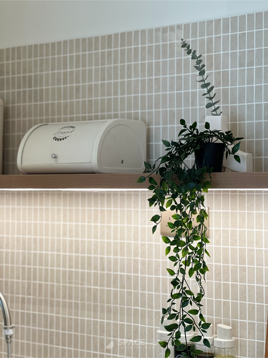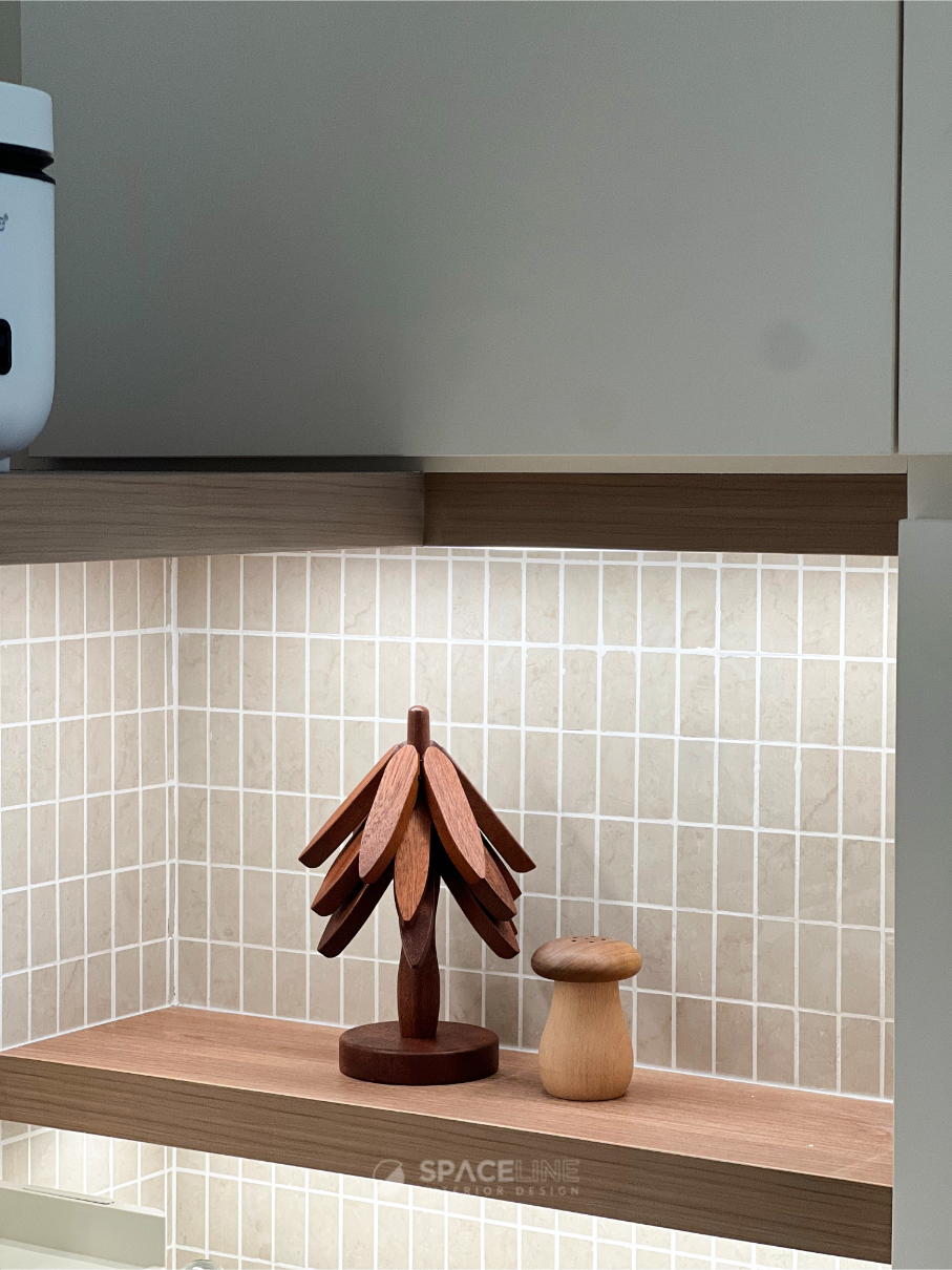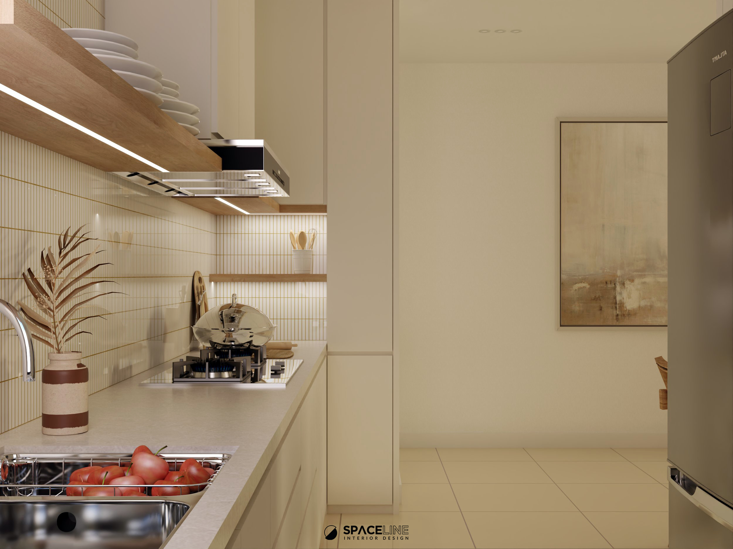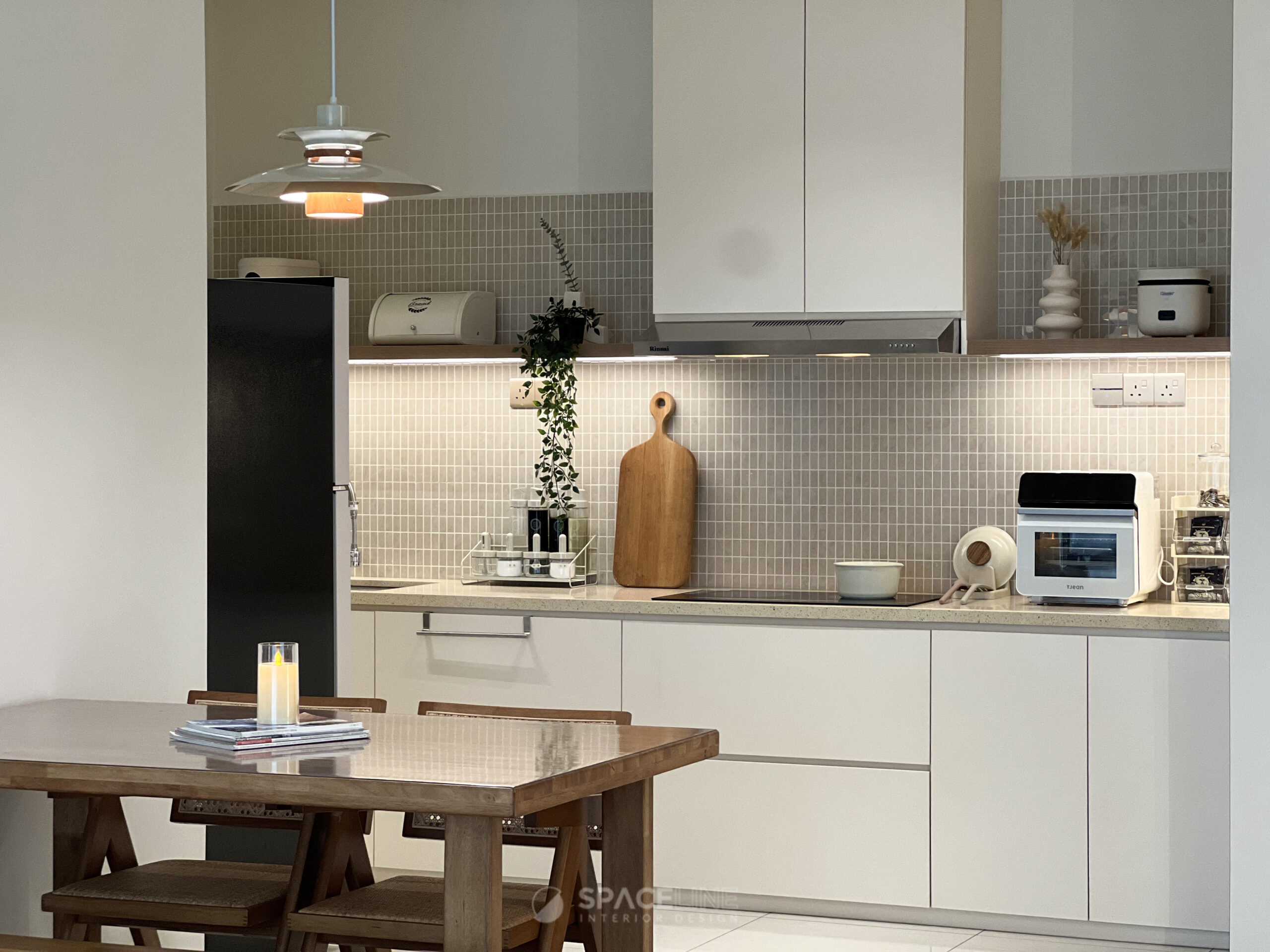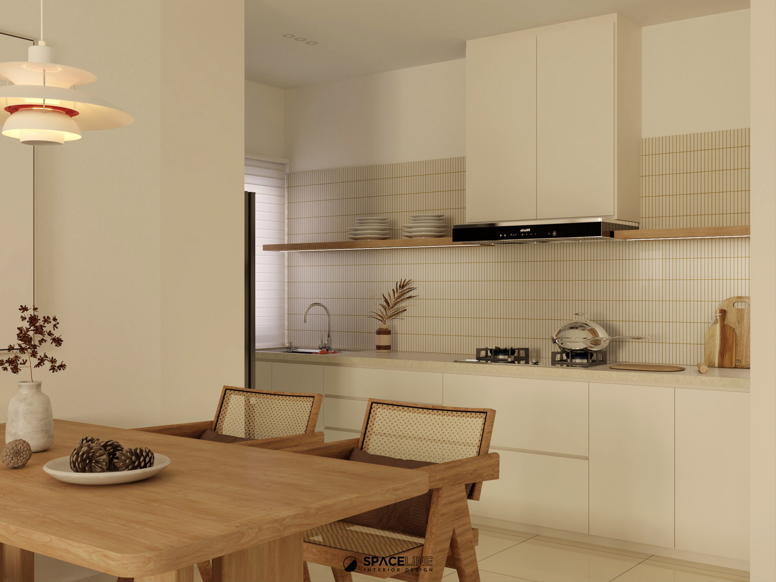 In the dining area, a four-seater dining table paired with a brown pendant light adds a warm, inviting feeling that complements the kitchen backsplash. The kitchen itself maintains a clean, neat appearance with solid cream-colored bottom cabinets and a quartz tabletop. The focal attraction is the light brown subway tiles used as a backsplash, which softens the kitchen environment to be calming and inviting. Sufficient storage and shelving are incorporated to keep cooking utensils organized and the workspace functional.