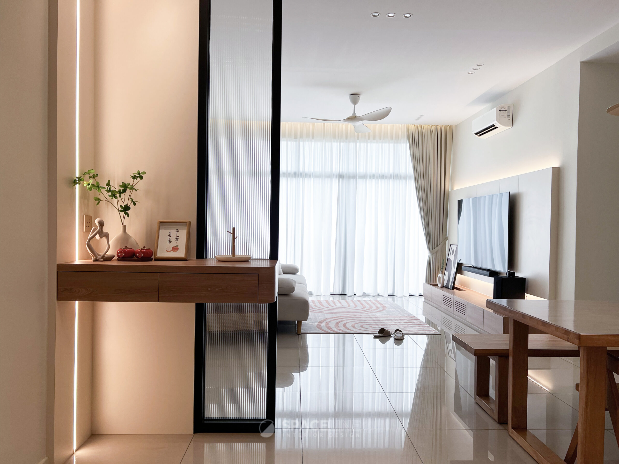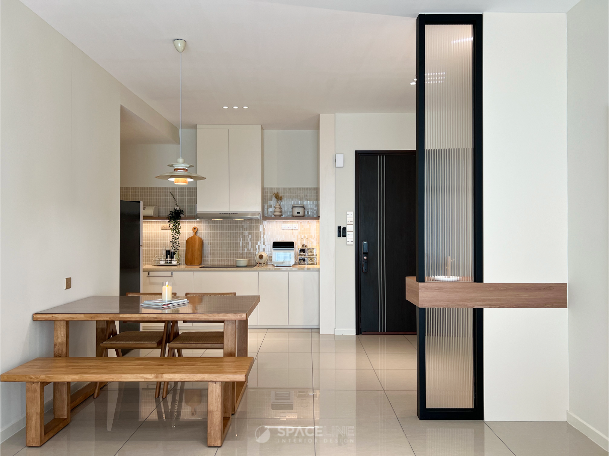 The entrance is marked by a minimal foyer cabinet strategically placed between the dining and living areas. This cabinet features hanging wood-colored drawers and a solid color back panel, perfect for key storage or display, and is illuminated by LED strips. A glass panel on the right side provides visual security toward the entrance and acts as a seamless spatial transition.
