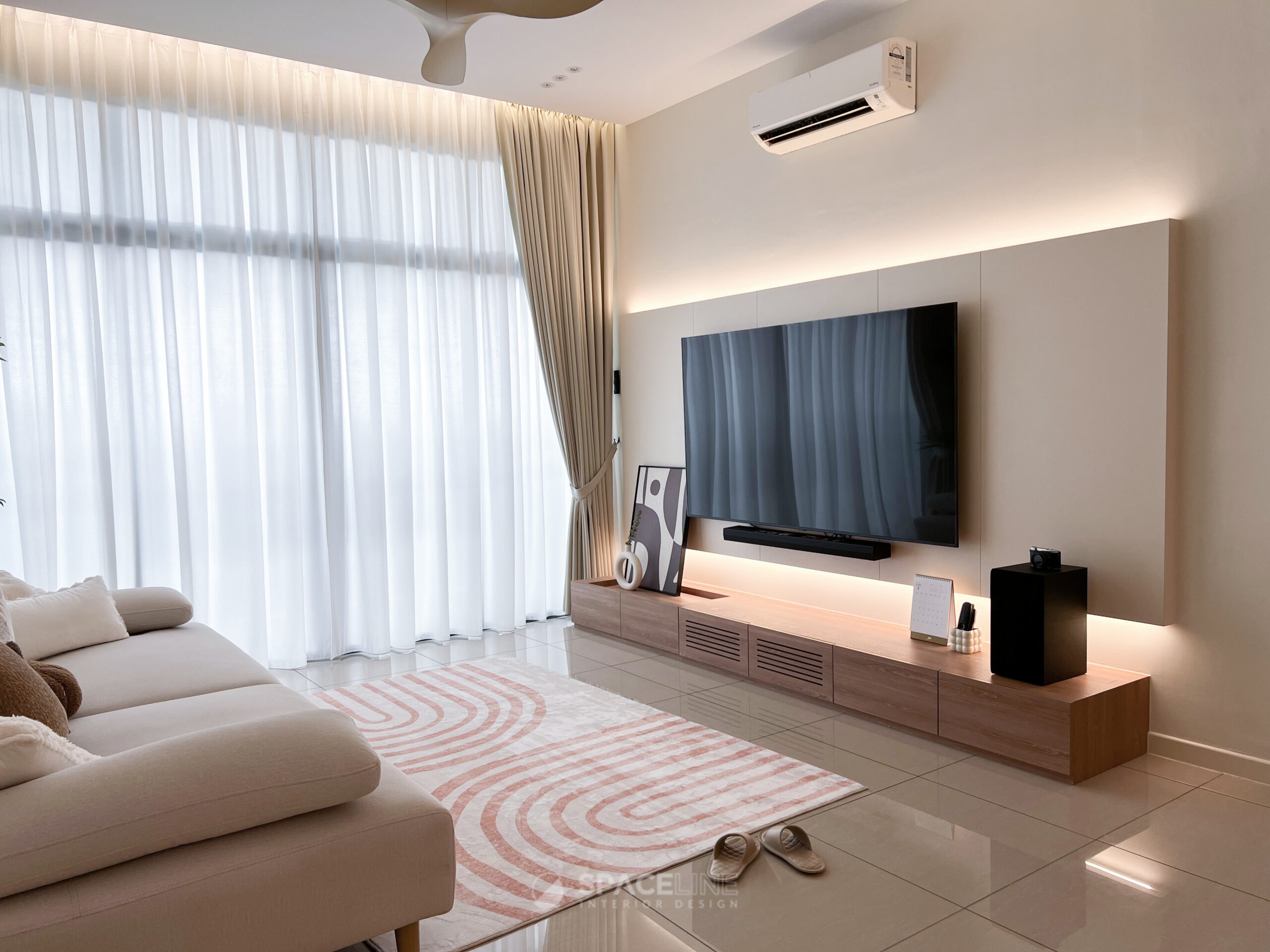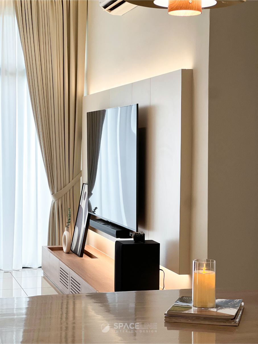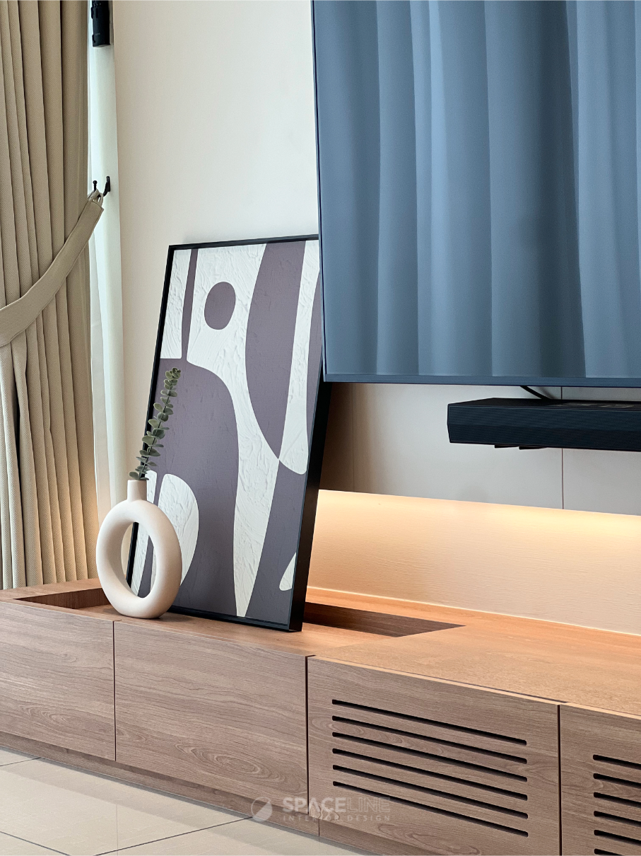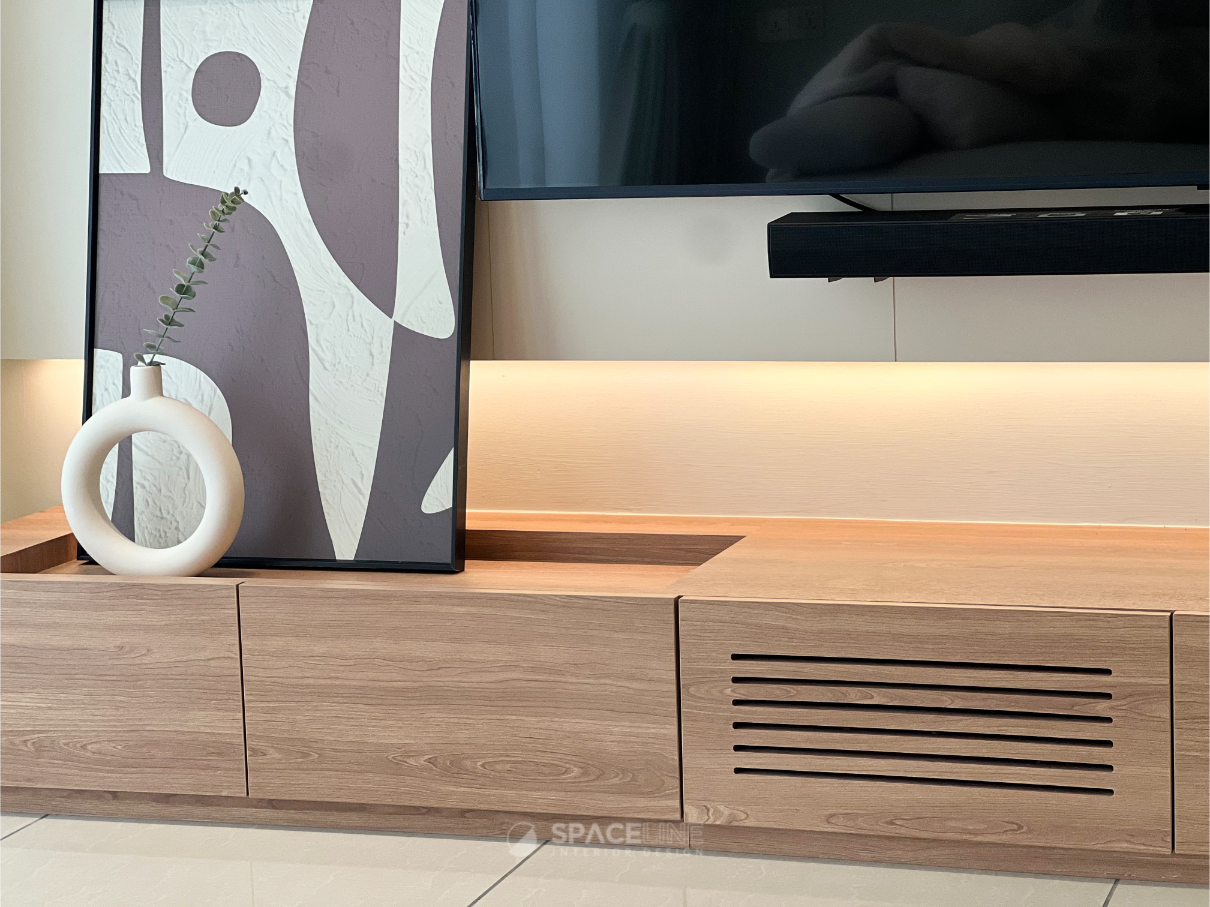The living area is completed with a grounded TV console and a hanging featured wall. LED strips on the featured wall create a modern, minimal feeling and improve visual clarity. A unique feature is the custom-built TV console, which includes a rectangular sunken platform on the top part, suitable for storing small items or decorations. A comfy sofa near the window area adds a cozy and personal touch, seamlessly fitting into the space.