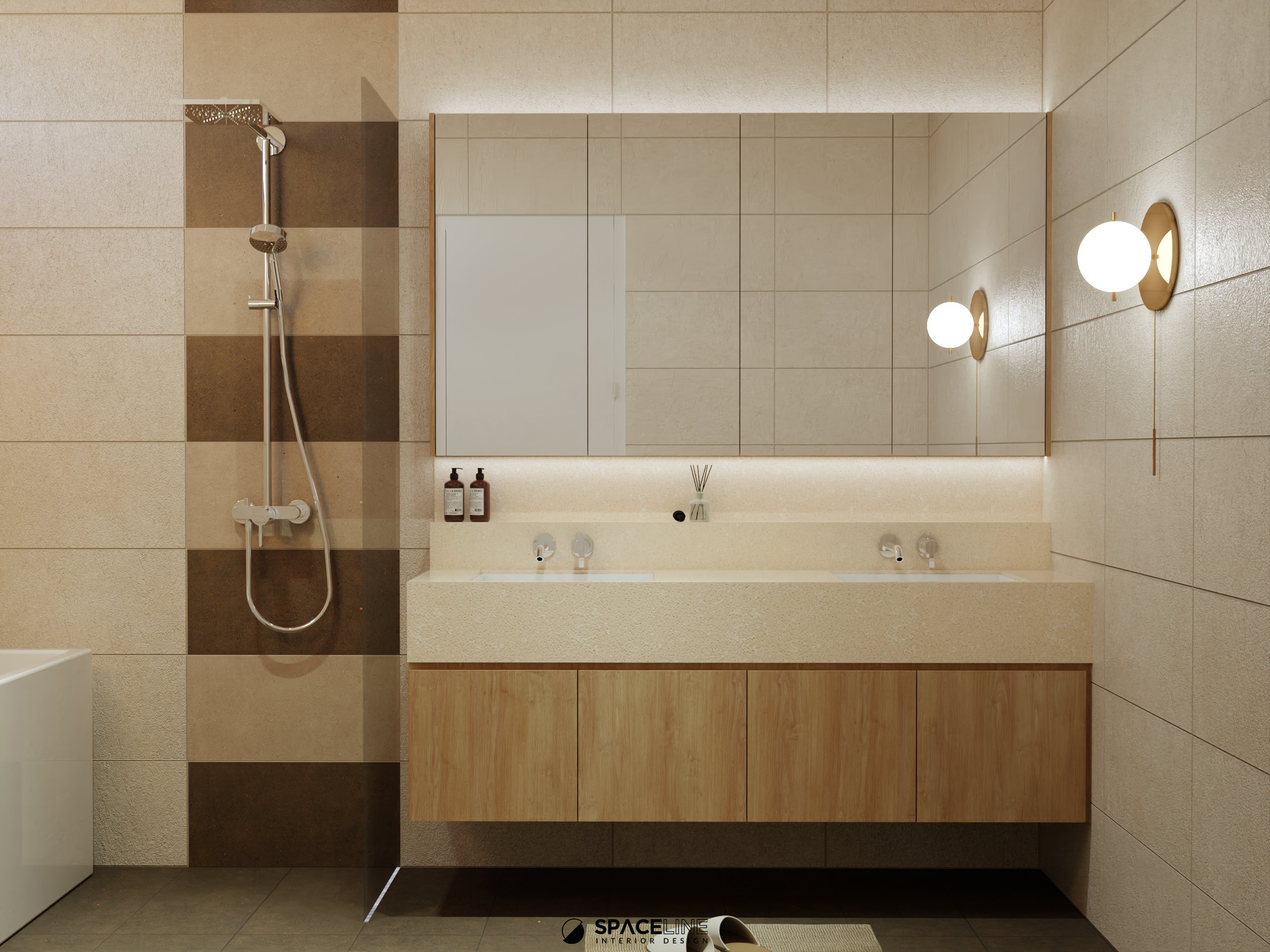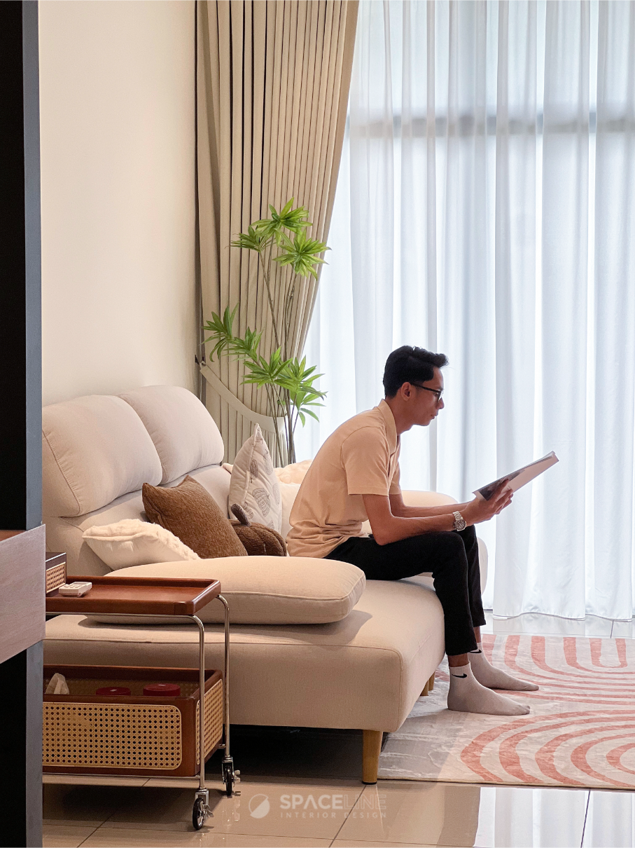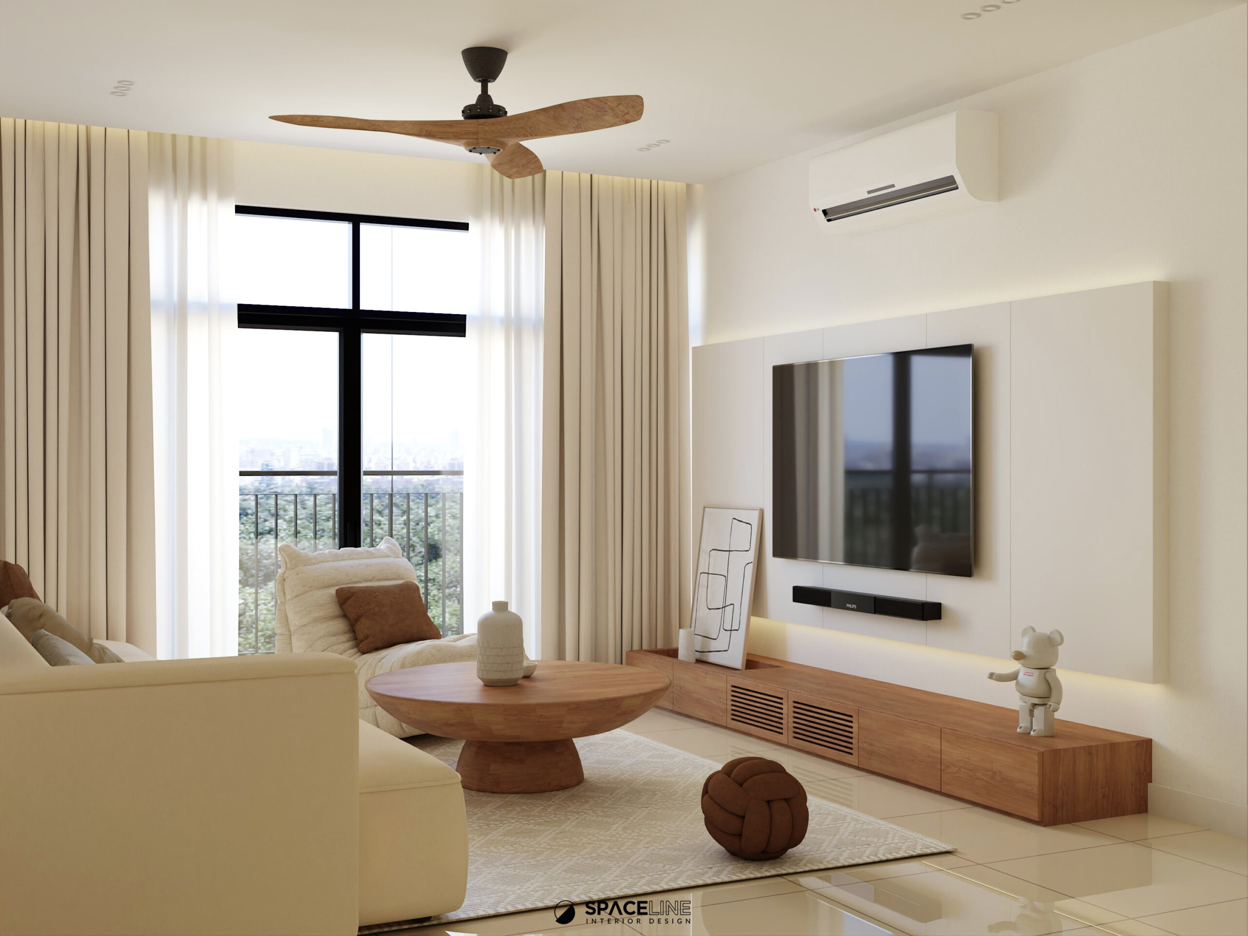 The living area is completed with a grounded TV console and a hanging featured wall. LED strips on the featured wall create a modern, minimal feeling and improve visual clarity. A unique feature is the custom-built TV console, which includes a rectangular sunken platform on the top part, suitable for storing small items or decorations. A comfy sofa near the window area adds a cozy and personal touch, seamlessly fitting into the space.