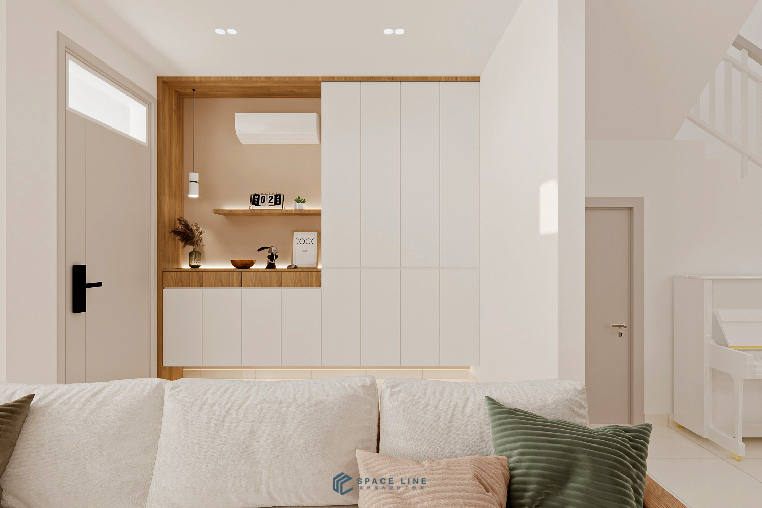 The white walls serve as the main background, ensuring a clean and neat aesthetic. The foyer cabinet, strategically placed at the entrance, exemplifies thoughtful space optimization, combining a closed shoe cabinet with open display sections. Visual enhancement is achieved through LED strips integrated into the display area and underneath the storage unit.