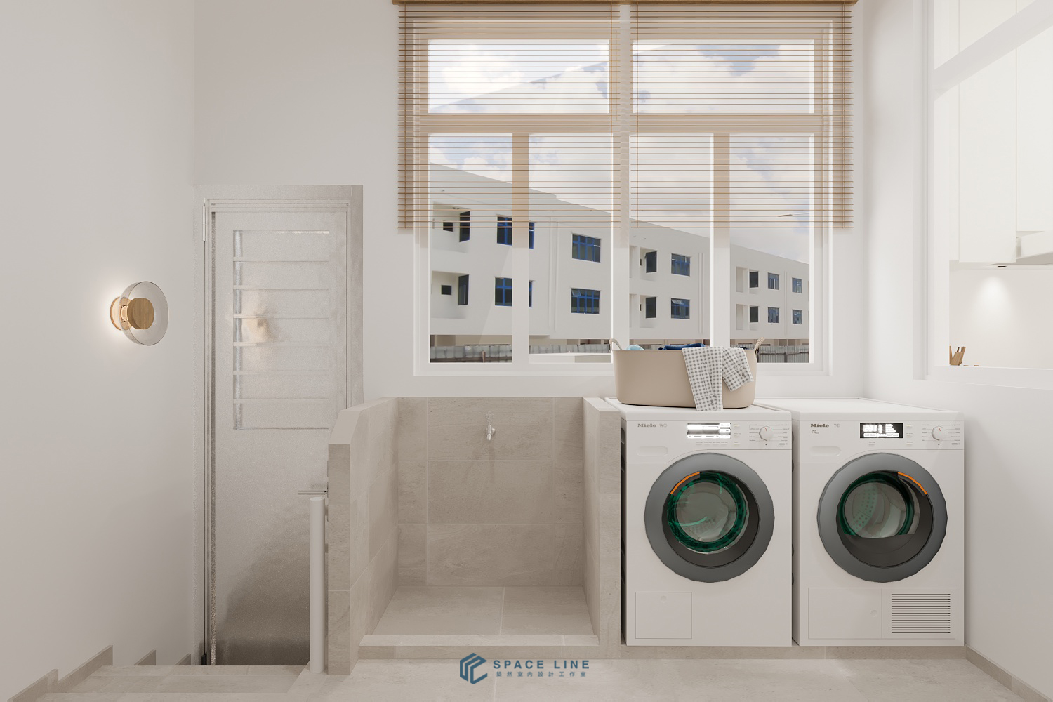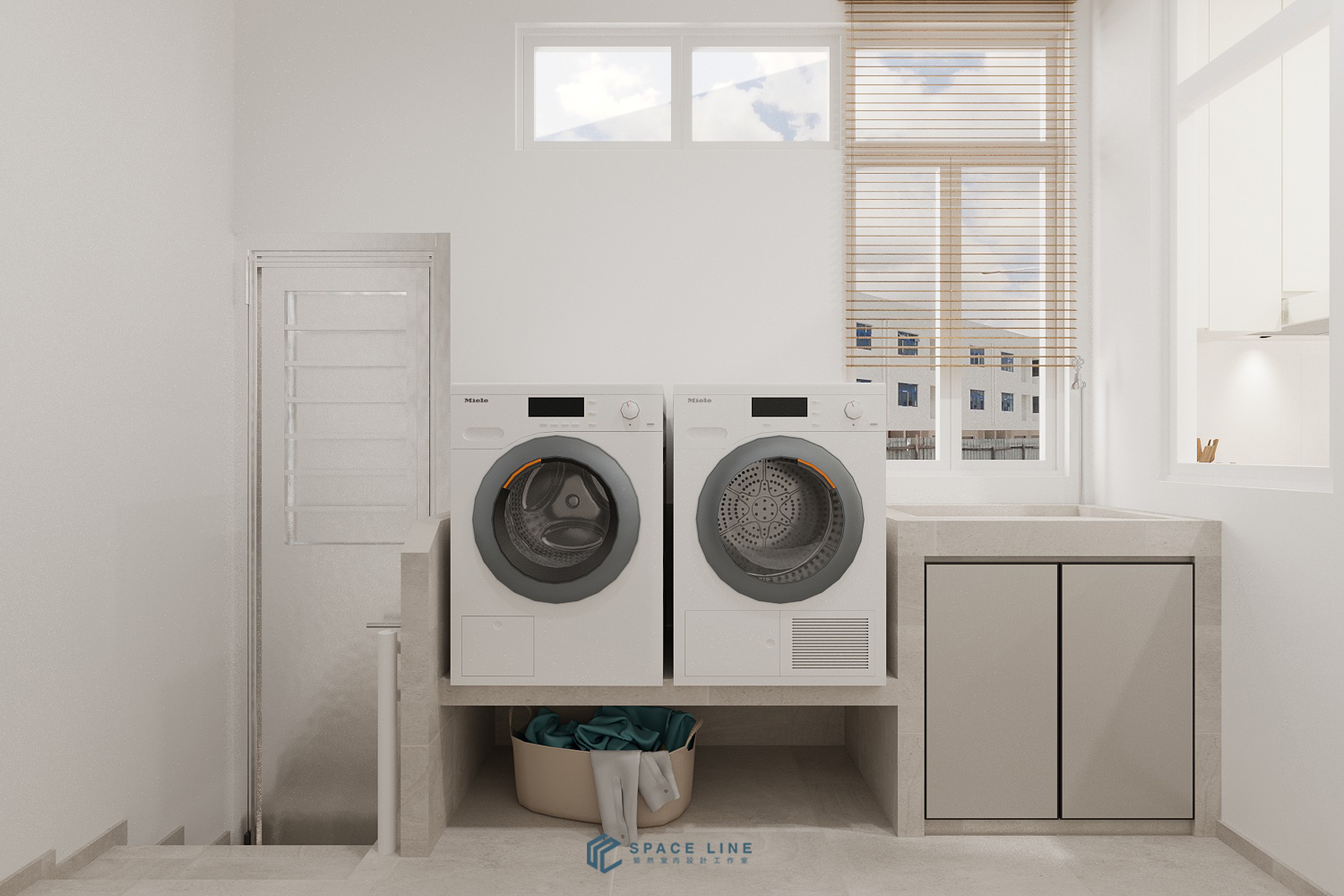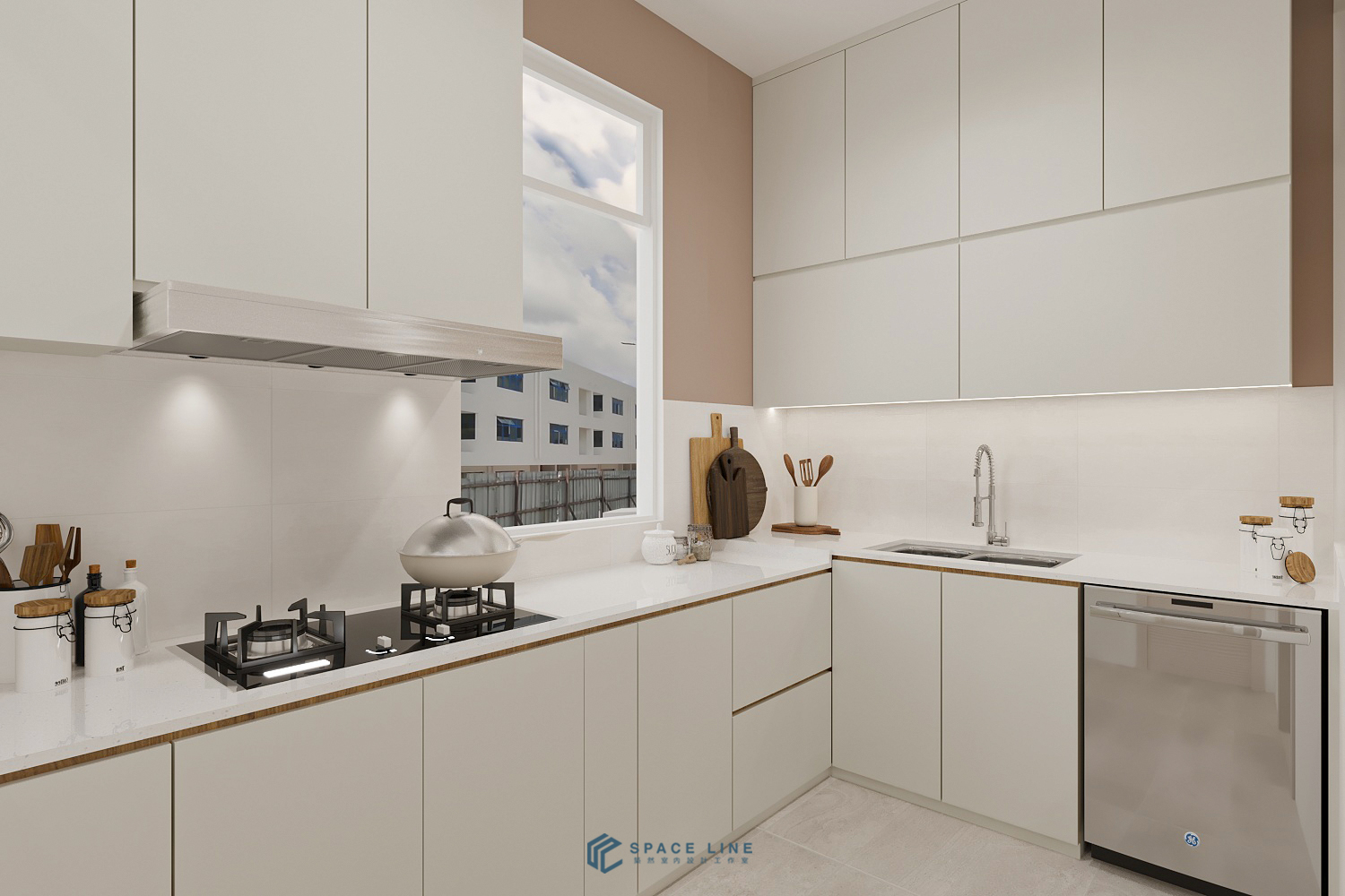 In the wet kitchen, a large window is maintained near the cooking area to ensure excellent air ventilation and natural light. Underneath LED strips on the top cabinet provide better task lighting during food preparation.